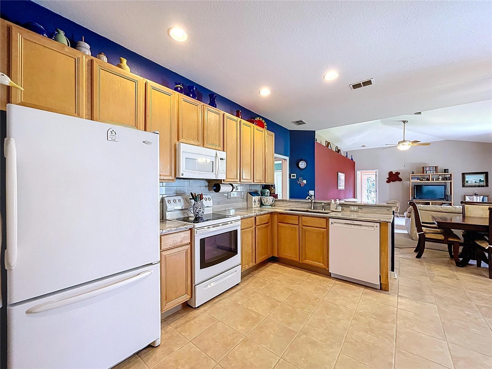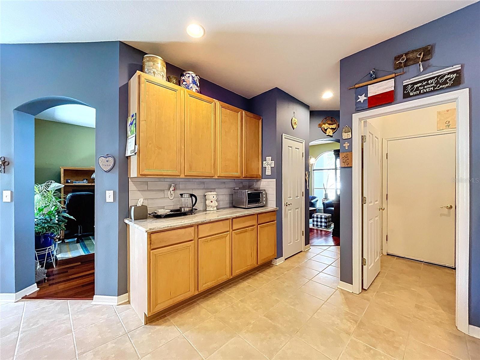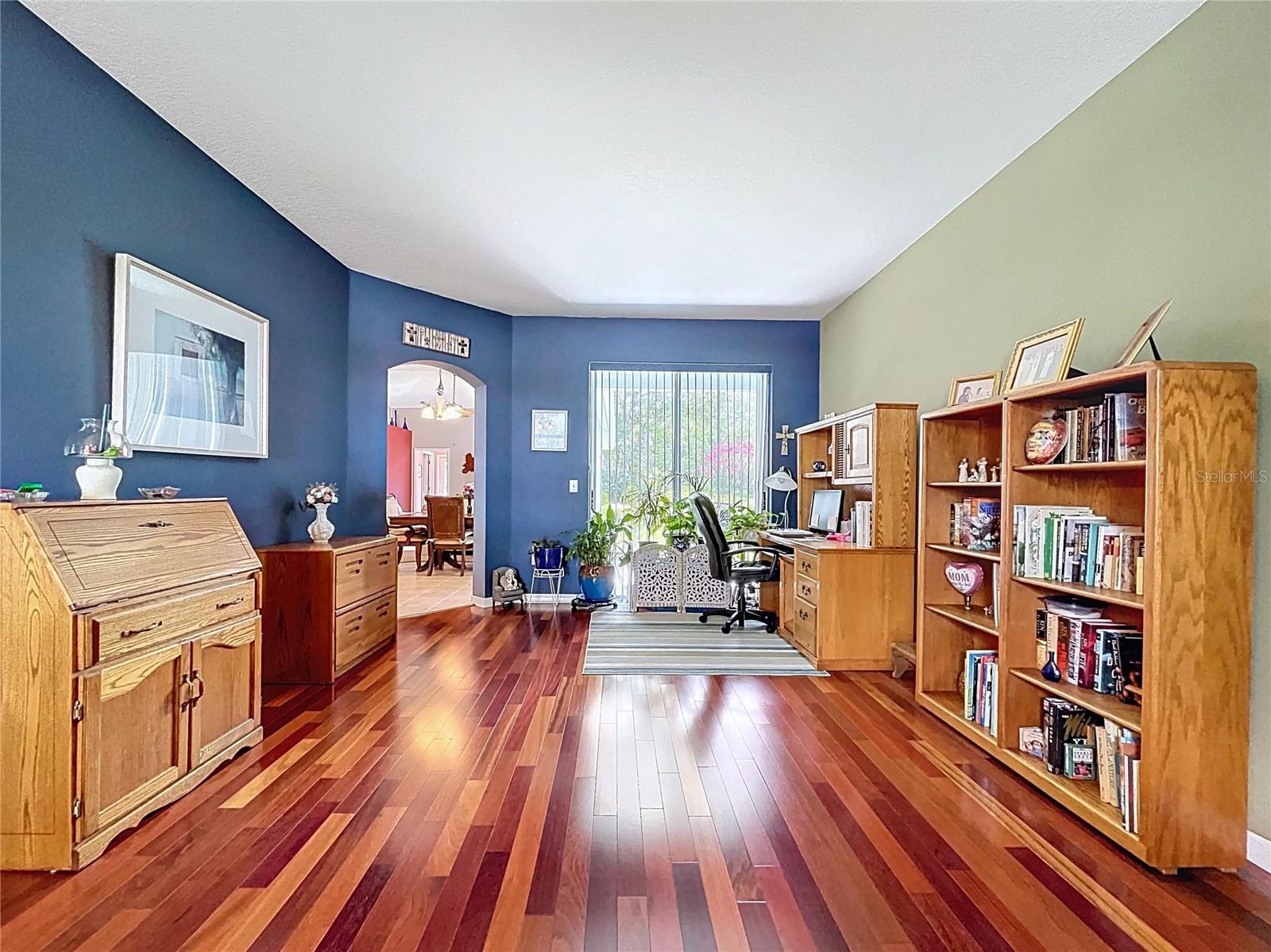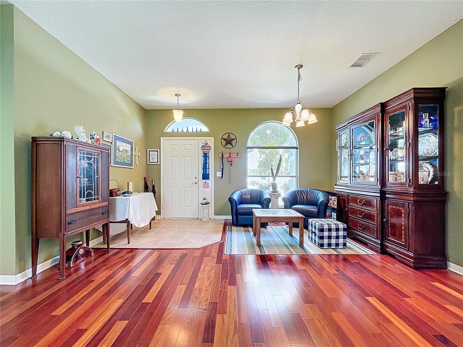GREAT LOCATION! Price just reduced on this 2222 Square Foot, 4 Bedroom 3 Bath that offers a popular 3-Way Split Floor Plan with the 4th Bedroom & 3rd Bath located at the back of the home with a separate entry creating a great In-Law Quarters or Teen Retreat. High ceilings & arched windows greet you as you enter the front door. The Formal Living & Dining Rooms have gleaming Brazilian Cherry Wood Flooring and sliding glass doors. Spacious Family Room has decorative plant shelf and in combination with the kitchen create a wonderful gathering area. The Kitchen has Premium Ocean Blue Granite, Coordinating Tile Backsplash and 42 inch cabinetry, In addition there is a pantry & breakfast serving bar. The Dinette offers an additional eating area located between the kitchen & family rooms. The Primary Suite has 2 walk-in closets, an ensuite bath with 2 vanities, private commode, separate shower & relaxing garden soaking tub. The other secondary bedrooms share a hall bath. Convenient Interior Laundry Room. Garage is OVERSIZED with 2.5 Car Spaces. Covered Lanai is great for Barbeques and Plenty of Privacy as the back yard has a conservation view. Please note that stained glass light fixture and Drapes in the Primary Bedroom do not stay. Ice-maker as-is. Water softener is a monthly rental and can only convey with a new buyer contract with company.