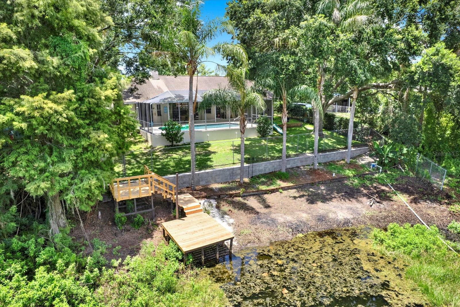 - Seller willing to assist with Buyers closing costs! - Welcome to your family's dream home! This move-in ready 3-bedroom, 2-bath home has everything you need for fun, comfort, and everyday convenience — including your very own pool and private dock on a canal that leads to both Lake Myrtle and Catfish Lake! Perfect for fishing, boating, or just enjoying time together outdoors — and best of all, no HOA or CDD fees! Inside, you'll love the open concept, split-bedroom floor plan, designed to give everyone their own space while still keeping things connected. Beautiful laminate flooring runs throughout the home — no carpet, so it’s easy to keep clean! As soon as you walk in, you'll be welcomed by a bright and sunny view straight out to the sparkling pool and peaceful canal. Natural light fills the home, especially with like new skylights. The kitchen is ideal for busy mornings and family dinners, featuring a large breakfast bar, beautiful white cabinetry, stainless steel appliances, a stylish backsplash, and a cozy breakfast nook perfect for casual meals. The spacious owner’s suite is a true retreat with two walk-in closets, private access to the lanai, and a luxurious en-suite bathroom with dual vanities, soaking tub, and separate shower. You'll also love the pool bath with direct outdoor access — great for keeping wet feet out of the house during pool days and BBQs! The covered lanai offers plenty of space to relax or entertain, with ceiling fans, built-in speakers, an outdoor bar area, and it's even pre-plumbed for a sink. Other thoughtful features include, like new tankless water heater and A/C system, walk-in closets in secondary bedrooms, double-sided wood-burning fireplace (enjoy it from both the living room and the owner's suite!), indoor laundry room with washer and dryer, workbench located in garage, pull-down attic stairs for extra storage, rain gutters and irrigation system that draws from the canal (helping reduce your water bills!), newly refinished dock, lush landscaping for curb appeal, added privacy with a Pasco County easement next door – giving you more space between neighbors! All of this is conveniently located near top-rated schools, major roads, and some of the best shopping, dining, and entertainment options in the area. This home truly has it all — come see it for yourself and imagine the memories you’ll make here!