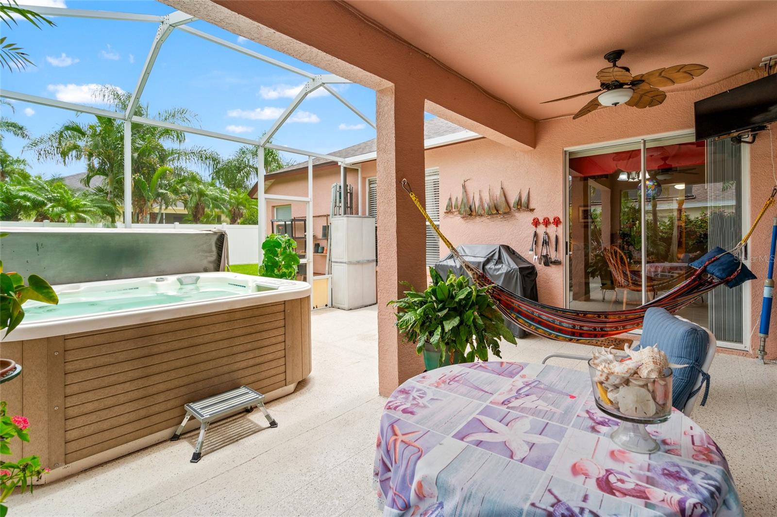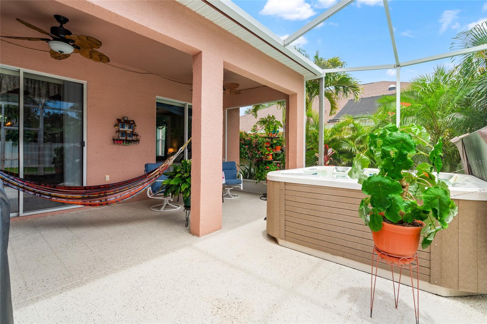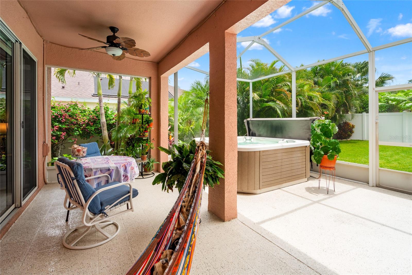 Welcome to your dream retreat in a beautiful gated community! This spacious 4-bedroom, 3-bath home offers a thoughtfully designed split-bedroom layout and a welcoming open-concept family room and kitchen—perfect for gatherings and everyday living. The kitchen boasts abundant cabinetry, a gas range, a breakfast bar, and a sunny dinette area with sliding glass doors opening to the covered lanai. The luxurious primary suite features double closets, an en suite bath with a garden tub, a separate shower, and dual vanity areas for added convenience. Step directly from the suite to the lanai and unwind in your private spa—an ideal spot to soak away the day. Two additional bedrooms and a full bath are tucked away on one side of the home, while a fourth bedroom and another full bath at the rear offer privacy and access to the fully fenced backyard. Framed by lush, resort-style landscaping, this home brings a vacation vibe to everyday life. Community amenities are just moments away, offering a vibrant and active lifestyle. Don’t miss this opportunity—make this inviting residence your new home today.