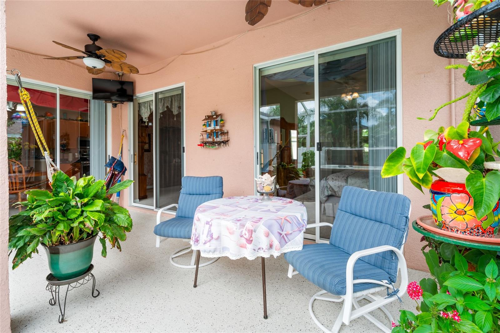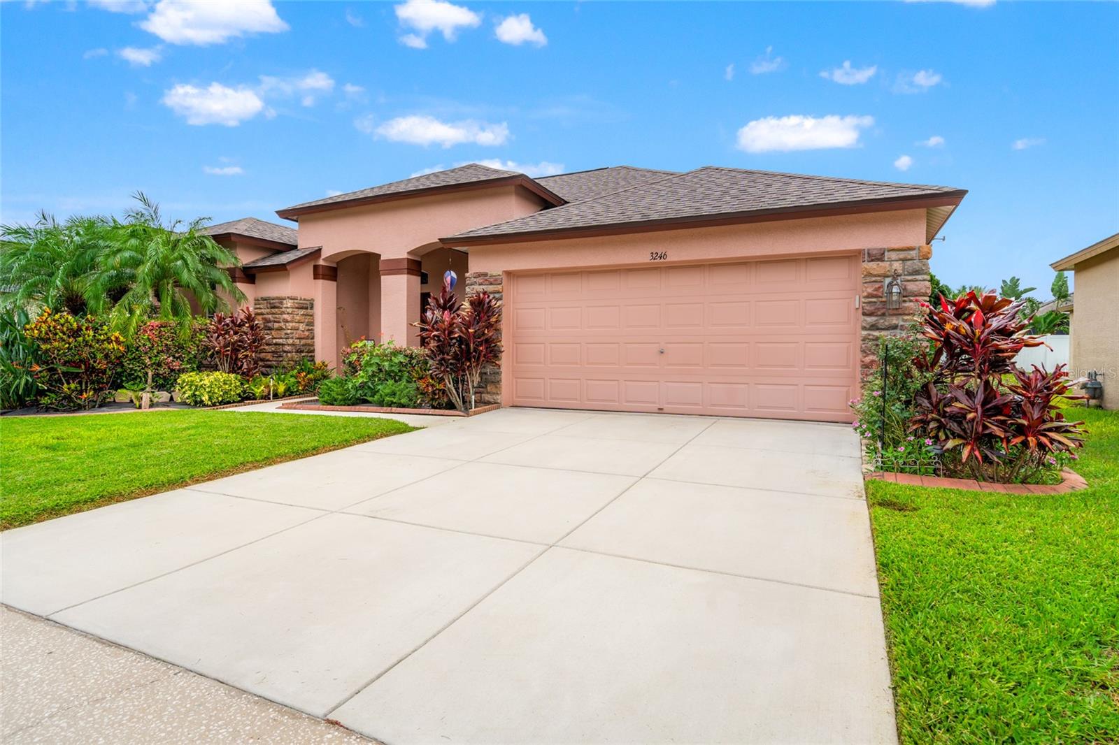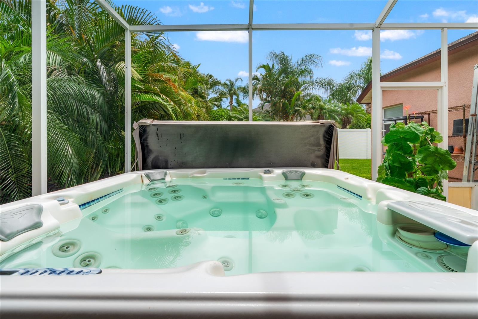 Welcome to your dream retreat in a beautiful gated community! This spacious 4-bedroom, 3-bath home offers a thoughtfully designed split-bedroom layout and a welcoming open-concept family room and kitchen—perfect for gatherings and everyday living. The kitchen boasts abundant cabinetry, a gas range, a breakfast bar, and a sunny dinette area with sliding glass doors opening to the covered lanai. The luxurious primary suite features double closets, an en suite bath with a garden tub, a separate shower, and dual vanity areas for added convenience. Step directly from the suite to the lanai and unwind in your private spa—an ideal spot to soak away the day. Two additional bedrooms and a full bath are tucked away on one side of the home, while a fourth bedroom and another full bath at the rear offer privacy and access to the fully fenced backyard. Framed by lush, resort-style landscaping, this home brings a vacation vibe to everyday life. Community amenities are just moments away, offering a vibrant and active lifestyle. Don’t miss this opportunity—make this inviting residence your new home today.