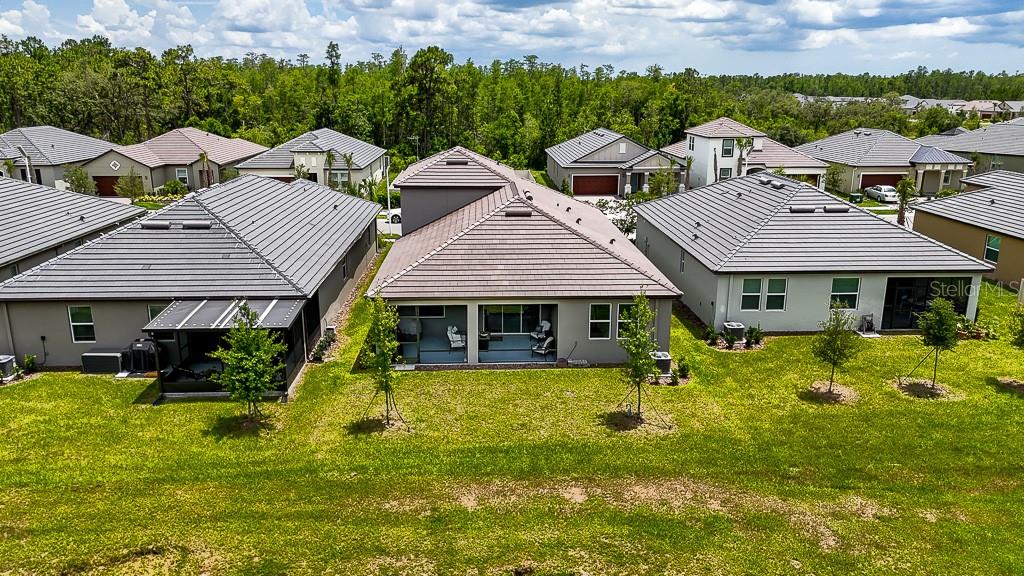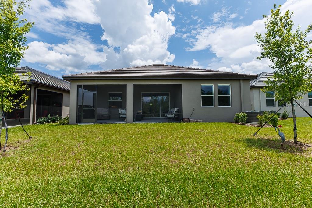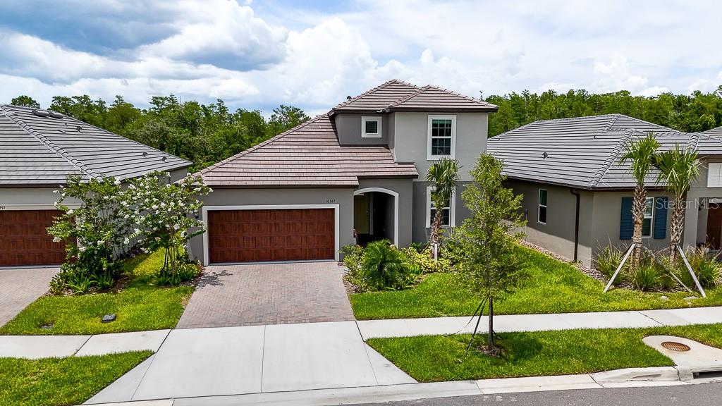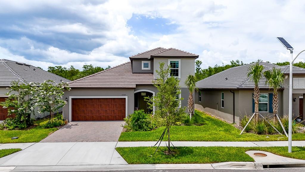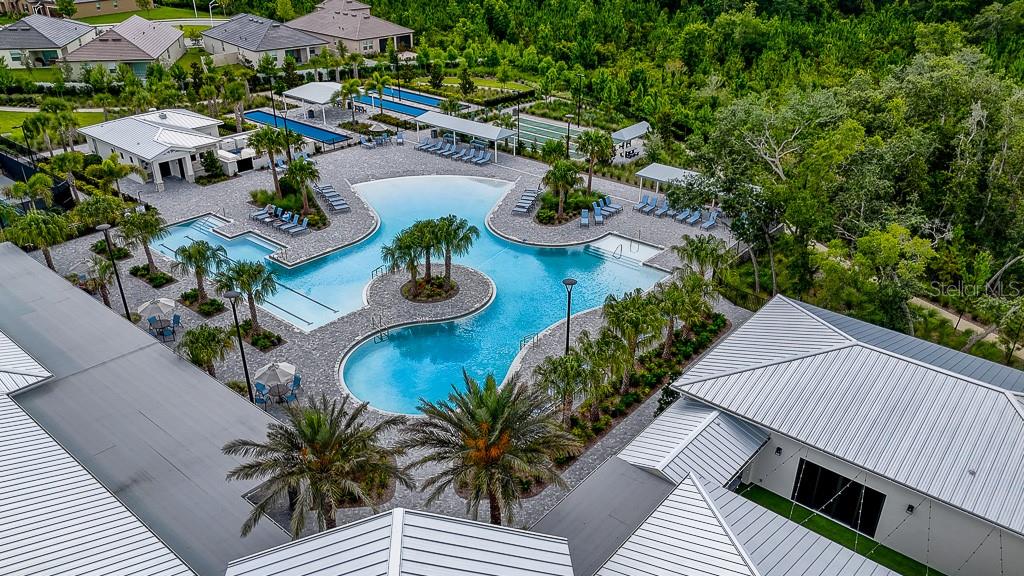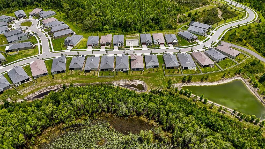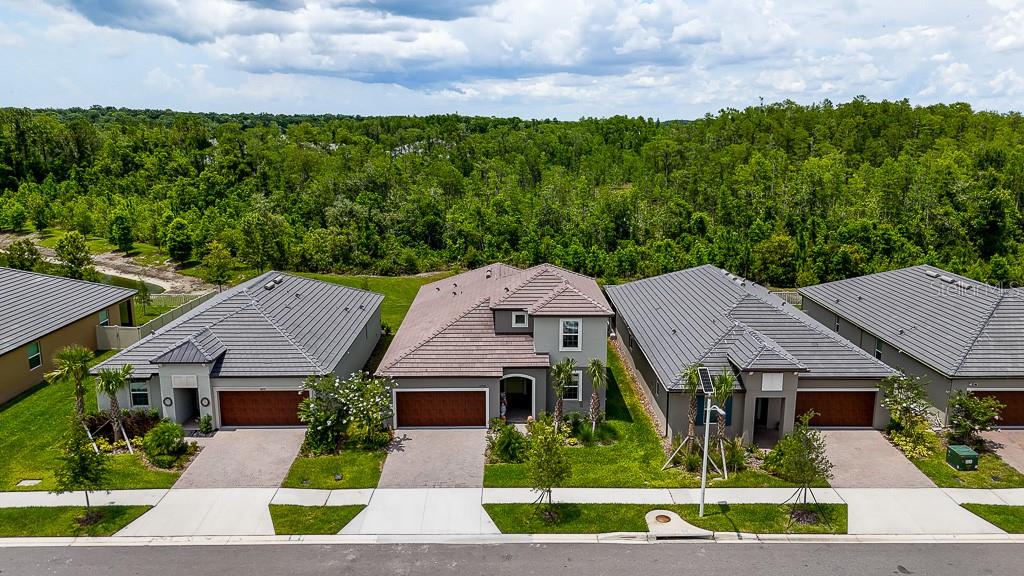 Closer to the Fun in Phase One! Better Than New w/Over $36,000 in Upgrades this home has 2,366 sq. ft. home offering a triple split plan w/3 bedrooms & 3 full bathrooms, bonus rooms on 1st and 2nd floor, and 3-car tandem garage. Over $36,000 in owner upgrades make this home truly better than new! Exterior highlights include no rear neighbors, home backs up to CDD owned wooded land & ponds, paver driveway, wood look garage door, tile roof, designer accents & trim, designer landscaping, covered paver entryway w/can lighting, 19x14 rear screened in patio w/side privacy & fan prewire, fences are allowed. Interior highlights include double pane impact windows, crown molding in the main living areas & owner’s suite, & lots of stone look plank tile! The owner added the following items since building: automated blackout shades in owner’s retreat, family room, & breakfast nook windows; whole house water softener; & alarm system. Newly built Lennar homes no longer include cabinets in the laundry room or crown molding downstairs. Kitchen highlights include island w/sink, lots of storage, & power; closet pantry for added convenience & storage; staggered 42” upper cabinets w/undercabinet lighting; quartz countertops; brushed nickel pulls; can lighting; crown molding; eating area large enough for a grand table so the flex space can be dedicated to another purpose. The owner added the following items since building: kitchen backsplash, BRAND NEW FULL SUITE OF KITCHENAID APPLIANCES! Livingroom highlights include can lighting, crown molding, ceiling fan, & sliders to huge rear patio & great views of the ponds & wooded area. The owner added the following items since building: four Surround sound speakers in ceiling in livingroom: Origin Acoustics Director D65 speakers are fully pivoting 2-way speakers; & additional can lighting. Owner’s retreat highlights include crown molding, can lighting, ceiling fan, & great views of the ponds & wooded area. The owner added the following items since building: additional can lighting. The bathroom highlights include large walk-in closet, quartz countertops w/dual sinks, sitting vanity, & walk in shower w/seating, a niche, brushed nickel pulls, & glass doors. Downstairs layout has foyer, welcome home center/desk, 3 car tandem garage, owner’s Suite, livingroom, bedroom 2, full guest bathroom, interior laundry room, kitchen, dining area in kitchen, office/Den/Dining Area/Flex Room, & 19x14 rear screened in patio w/side privacy & fan prewire. Upstairs layout has bedroom 3, 19x14 loft (flex space), & full bathroom. Community clubhouse highlights include an awe inspiring impact to the appearance of the neighborhood; covered portico drop off area; amazing resort style pool area w/beach style entry area, lap lanes, plenty of deck space & chairs, covered areas to avoid sun exposure; 2 full restaurant/bars – one inside & one overlooking the pool area; billiards room w/television; aerobics/fitness mirrored studio w/various equipment; huge fitness room w/advanced workout equipment; card/gaming room w/library; huge event hall w/stage; business workstations w/computers & a printer; shuffleboard; pickleball; & bocce ball. Additionally, the neighborhood is golf cart friendly & has lots of walking trails & other highlights such as plans for a future lagoon! Fees includes lawn, bushes and tree maintenance, common area maintenance, irrigation, mulch yearly, 2 GB internet, clubhouse/pool maintenance, and exterior home painting!