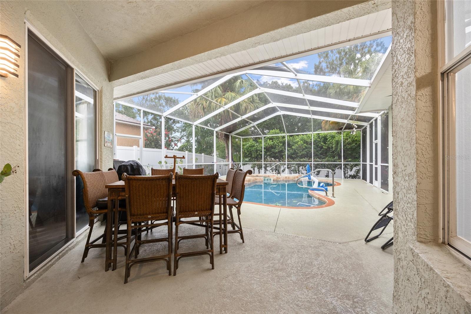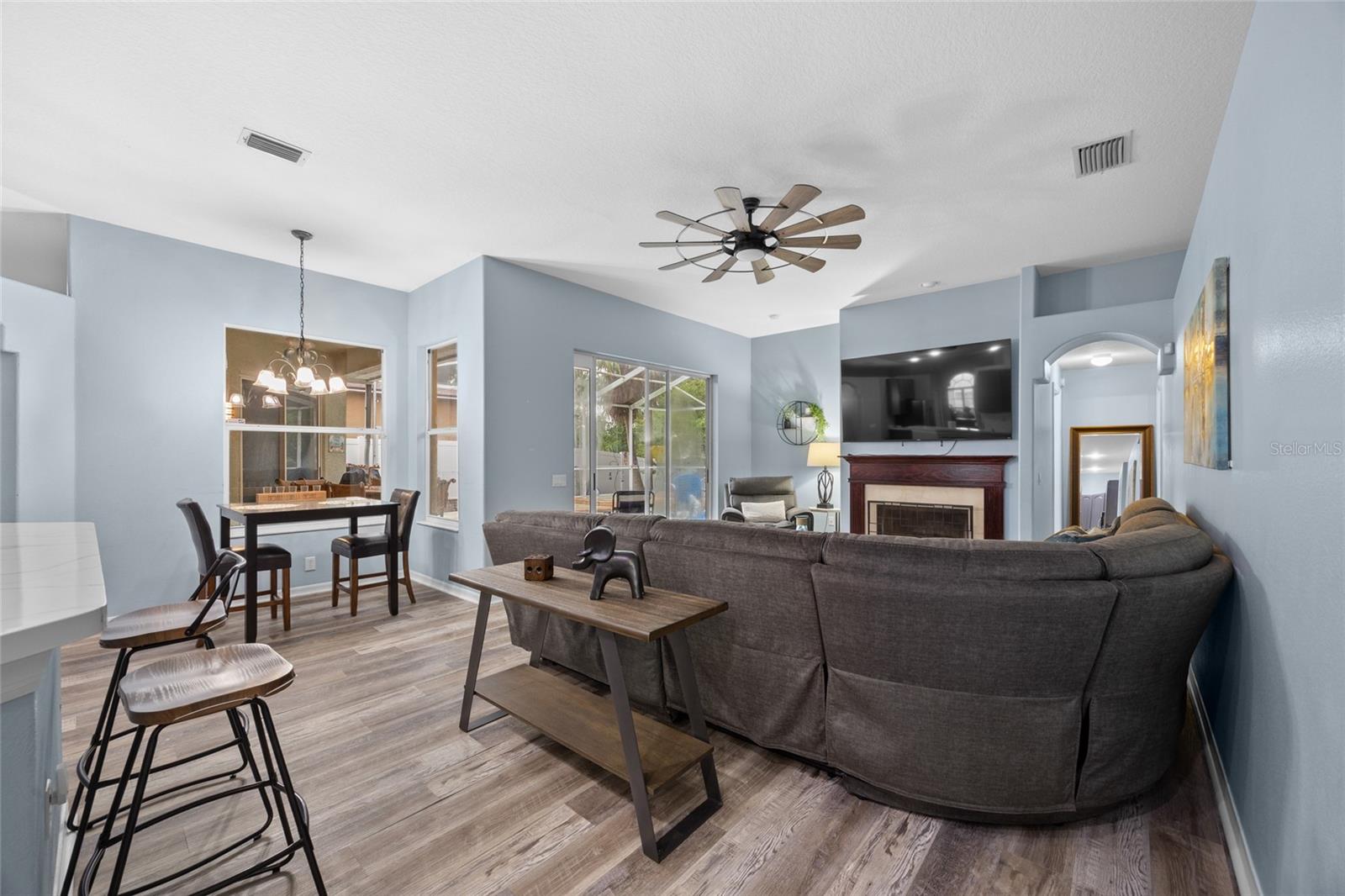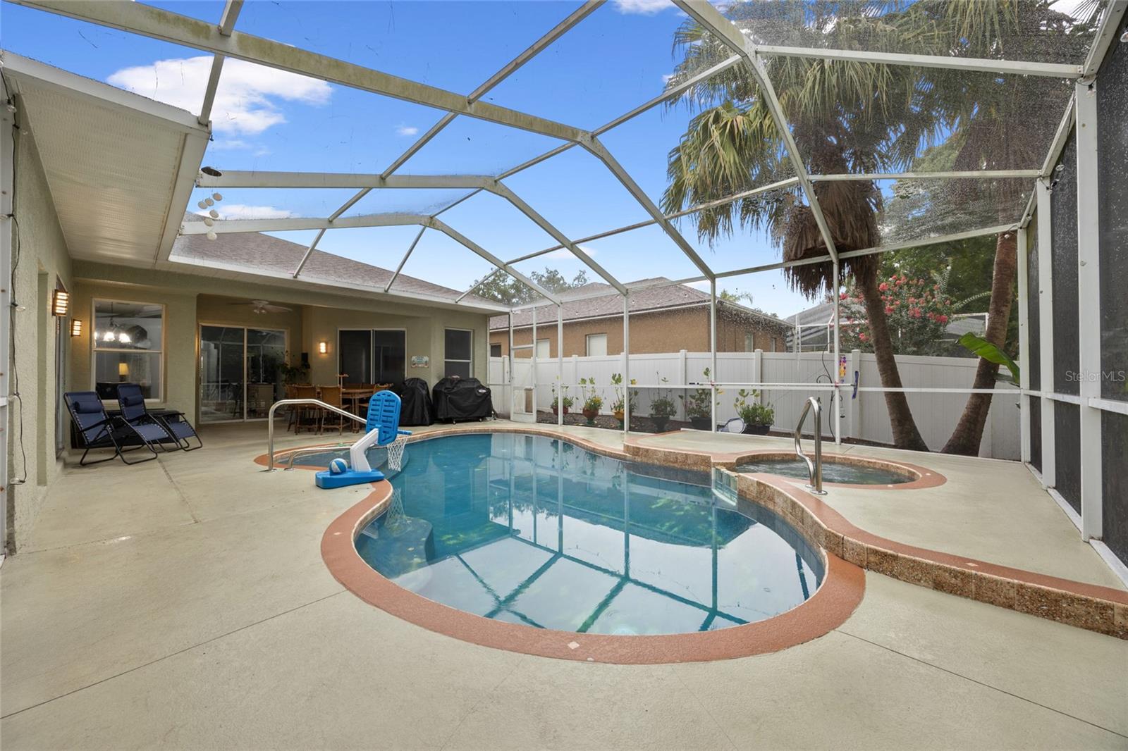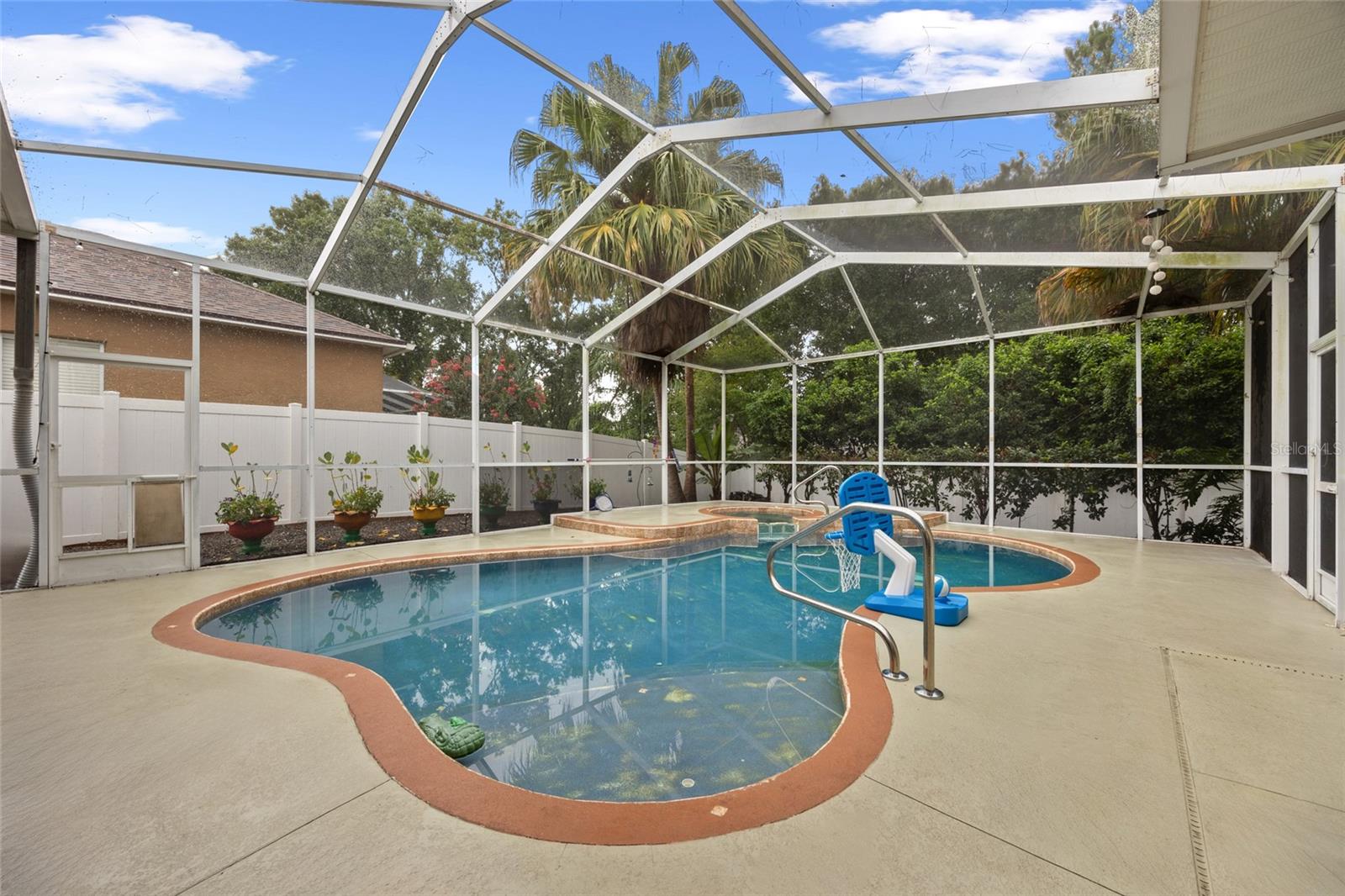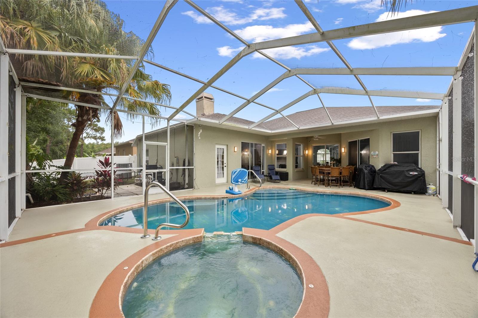 This beautifully maintained 4-bedroom, 3-bathroom pool home offers a desirable split bedroom floor plan, combining privacy and functionality. The spacious layout includes a 2-car garage and a heated pool with an attached Jacuzzi, perfect for relaxing or entertaining. Numerous recent upgrades enhance the home’s value and efficiency, including a new roof (2022), new A/C system (2023), new pool pump (2024), and a newly screened pool enclosure (2023). Inside, the home features vinyl flooring throughout, ZERO carpet, creating a clean, modern aesthetic and easy maintenance. The completely renovated kitchen is a chef’s dream, boasting a farmhouse sink, new garbage disposal, and updated cabinetry and finishes. The master suite is a true retreat, offering an adjoining office/den, dual walk-in closets, and a luxurious en-suite bath with dual vanities, a soaking tub, and a separate shower. A wood-burning fireplace adds warmth and charm to the living area, with the chimney professionally serviced in 2024. Three sliding glass doors lead out to the screened pool area, promoting seamless indoor-outdoor living. A full bathroom with pool access adds to the home’s practical layout. This move-in-ready home is a rare find, combining thoughtful upgrades, tasteful renovations, and the perfect Florida lifestyle. Come see this Stagecoach Village gem before it's too late.