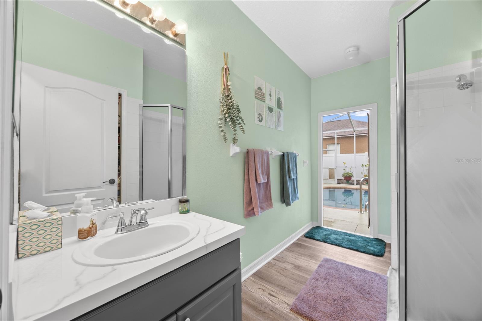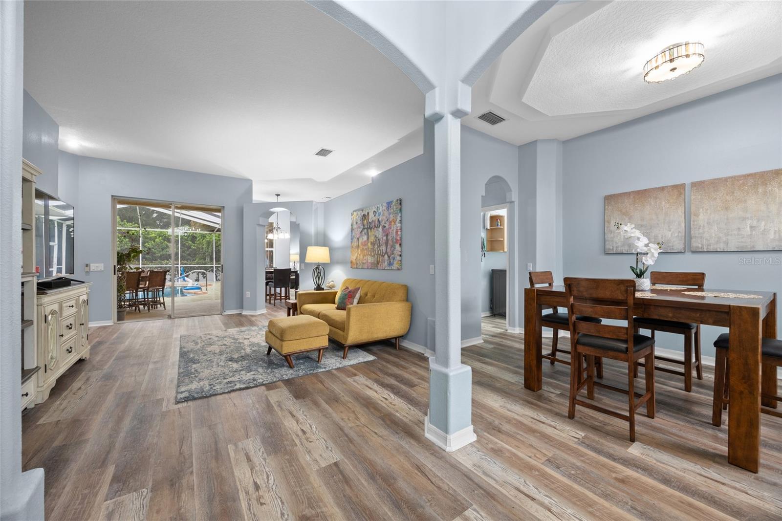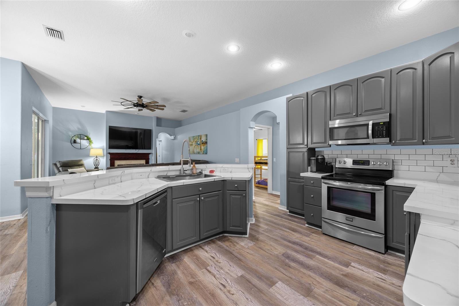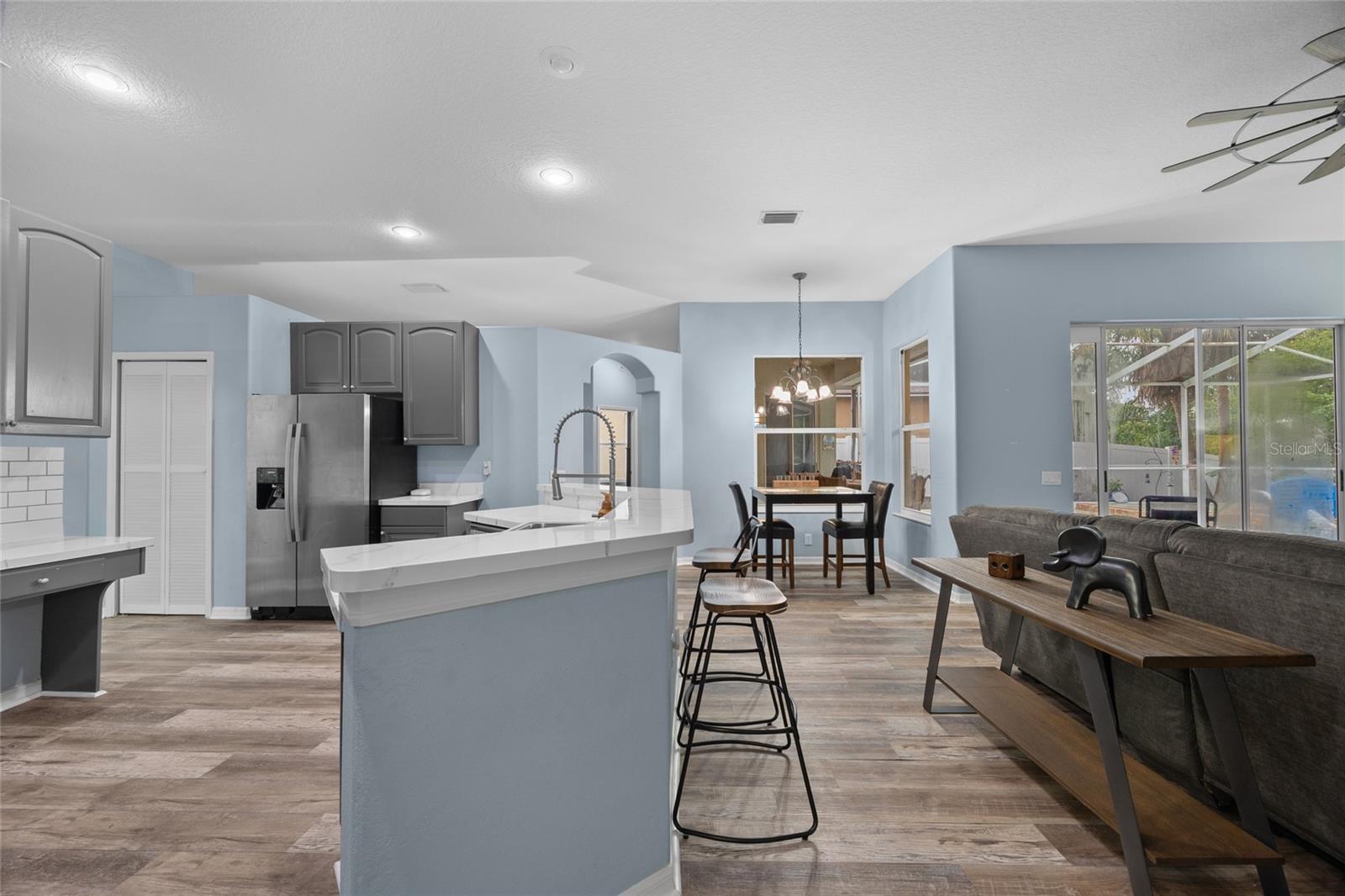 This beautifully maintained 4-bedroom, 3-bathroom pool home offers a desirable split bedroom floor plan, combining privacy and functionality. The spacious layout includes a 2-car garage and a heated pool with an attached Jacuzzi, perfect for relaxing or entertaining. Numerous recent upgrades enhance the home’s value and efficiency, including a new roof (2022), new A/C system (2023), new pool pump (2024), and a newly screened pool enclosure (2023). Inside, the home features vinyl flooring throughout, ZERO carpet, creating a clean, modern aesthetic and easy maintenance. The completely renovated kitchen is a chef’s dream, boasting a farmhouse sink, new garbage disposal, and updated cabinetry and finishes. The master suite is a true retreat, offering an adjoining office/den, dual walk-in closets, and a luxurious en-suite bath with dual vanities, a soaking tub, and a separate shower. A wood-burning fireplace adds warmth and charm to the living area, with the chimney professionally serviced in 2024. Three sliding glass doors lead out to the screened pool area, promoting seamless indoor-outdoor living. A full bathroom with pool access adds to the home’s practical layout. This move-in-ready home is a rare find, combining thoughtful upgrades, tasteful renovations, and the perfect Florida lifestyle. Come see this Stagecoach Village gem before it's too late.