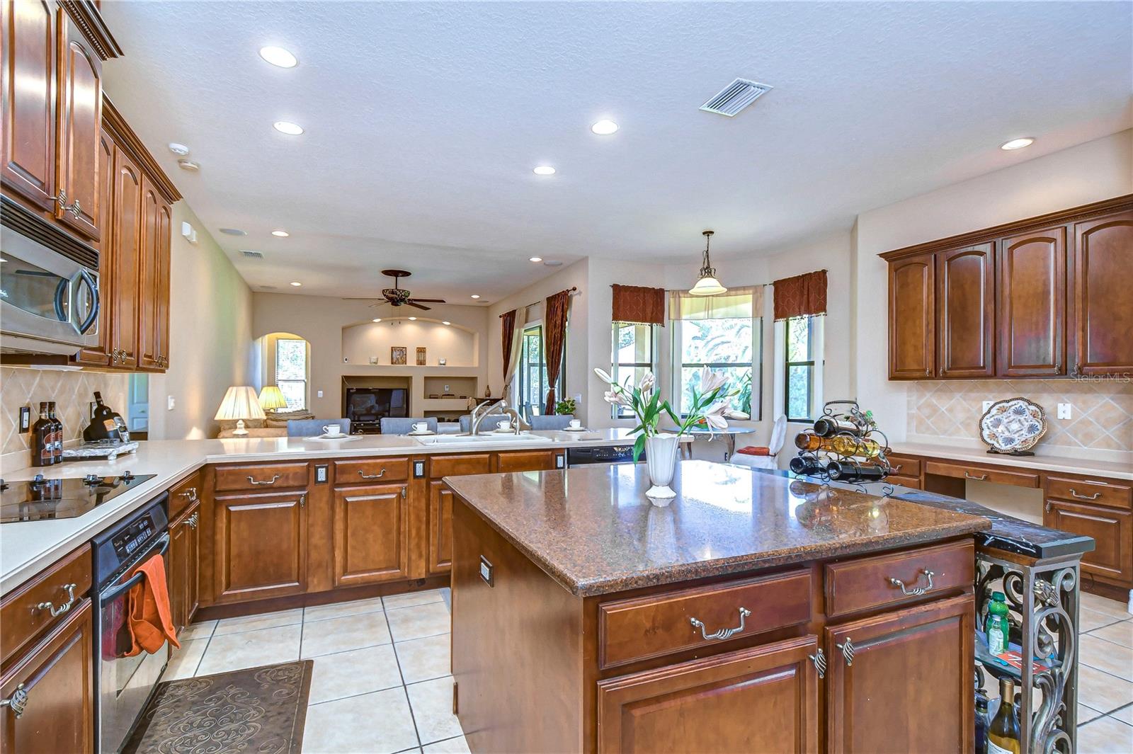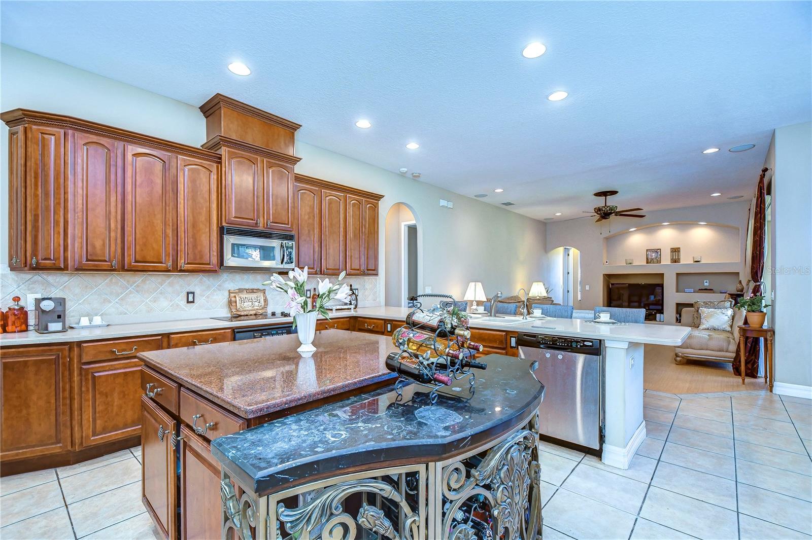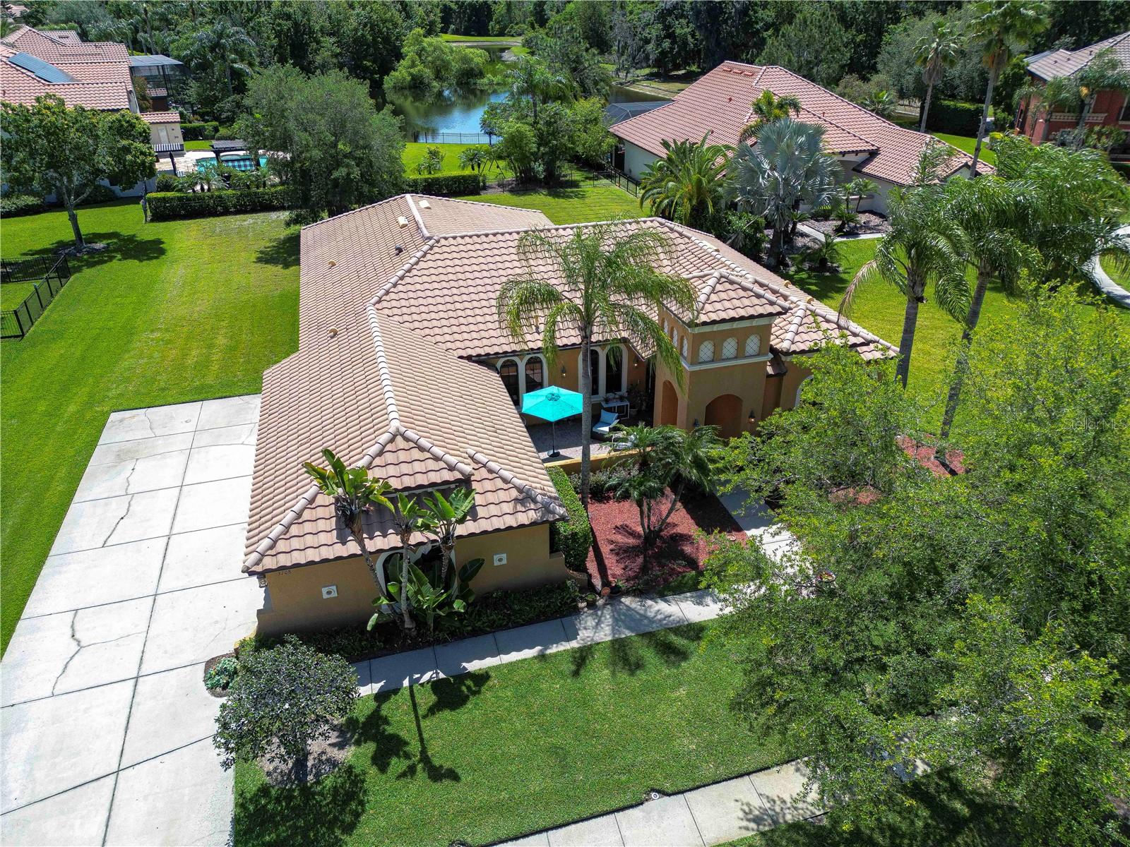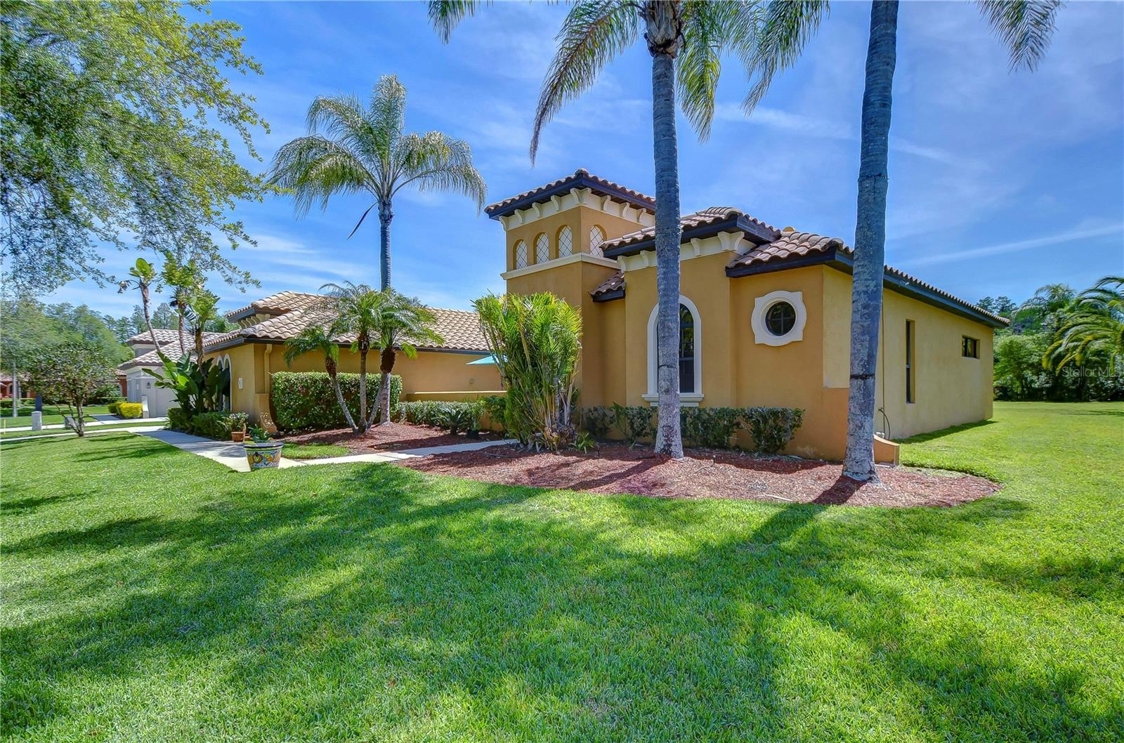 Step into this exquisite Mediterranean-style executive residence, nestled within the prestigious confines of Ballastone, an Oakstead gated community. Situated on an expansive cul-de-sac lot spanning nearly half an acre, this home presents a 3-car side entry garage complemented by an oversized driveway and parking pad. As you approach, graceful palm trees sway gently, framing a meticulously maintained emerald-green lawn. Adding to the grandeur of the exterior is an open brick-paved private patio—a serene spot to enjoy your morning coffee. Passing through archways beneath a barrel tile roof, you're greeted by an inviting entry adorned with a decorative glass front door, accompanied by a side window, and an arched transom window above. NEW A/C March 30, 2022! NEWER Water Heater January 30, 2018! NEW Dishwasher 2025! NEW Carpet in 2 Guest Bedrooms! Inside, architectural features include elegant archways, art niches, rounded corner bead walls, 8-foot doors, and an open-concept floor plan encompassing 2,573 sq ft. To the right of the tiled foyer with a floor medallion, a versatile office/study awaits. The dining room sits to the left of the foyer, while the living room lies straight ahead, boasting triple sliding doors opening onto the lanai. The heart of the home is the gourmet kitchen—a haven for culinary enthusiasts. It showcases richly appointed 42-inch wood raised panel cabinets topped with rope trim and crown molding, Corian counters, tile backsplash, and a center island Quartz topped and has ample cabinet and drawer space. Stainless steel appliances include a smooth cooktop and oven, double-door refrigerator, dishwasher, and microwave, complemented by a counter-height breakfast bar for casual dining. Adjacent to the kitchen, the café dining area features triple windows overlooking the lanai. The family room boasts a built-in media center and triple sliding glass doors leading to the wraparound screened lanai and expansive backyard. The owner's retreat beckons with an inviting alcove entrance, sliding glass doors opening onto the lanai, and double closets leading to the ensuite bath. The bath comprises a double vanity, tiled shower with coordinating Listello pattern, a deep soaking jetted tub, a walk-in closet, and a private water closet. Additional generously sized bedrooms are arranged in a 3-way split, offering ample closet space. Oakstead provides outstanding amenities, events, and activities for family entertainment, including a Clubhouse, fitness center, event spaces suitable for special occasions, a 165,000-gallon saltwater pool complete with a waterslide, sundeck, shaded areas, 3 tennis courts, volleyball and basketball courts, ball field, and covered playground. With easy access to major highways including the Suncoast Expressway, dining, sports, and entertainment options, The Shops at Wiregrass, and Tampa Premium Outlets, this home offers an unparalleled lifestyle. Don’t miss out—schedule your appointment today! Bedroom Closet Type: Built In Closet (Primary Bedroom).