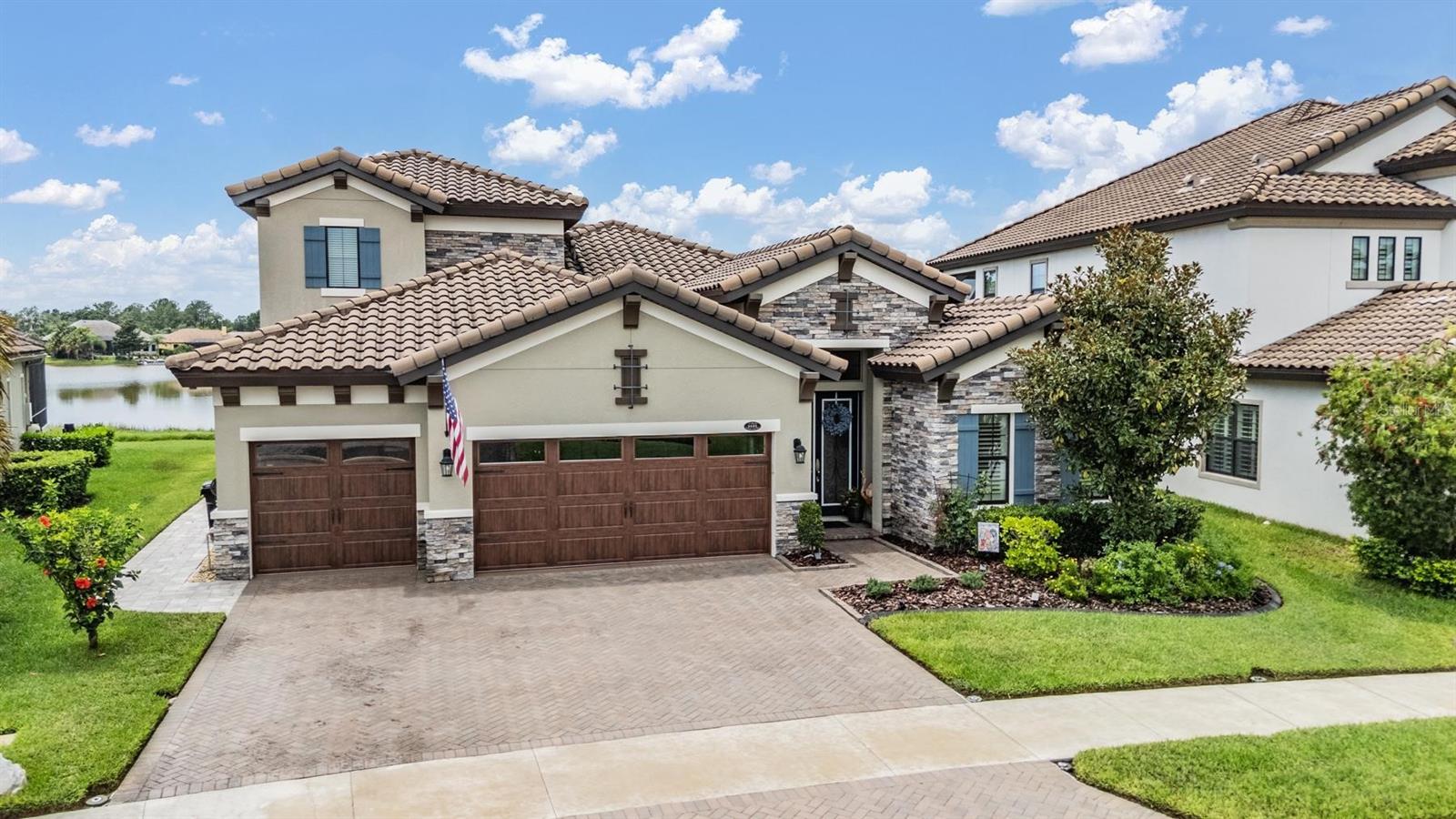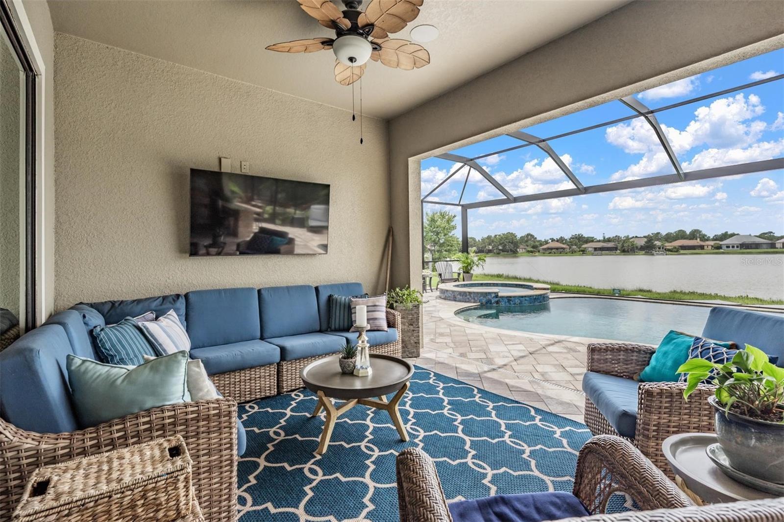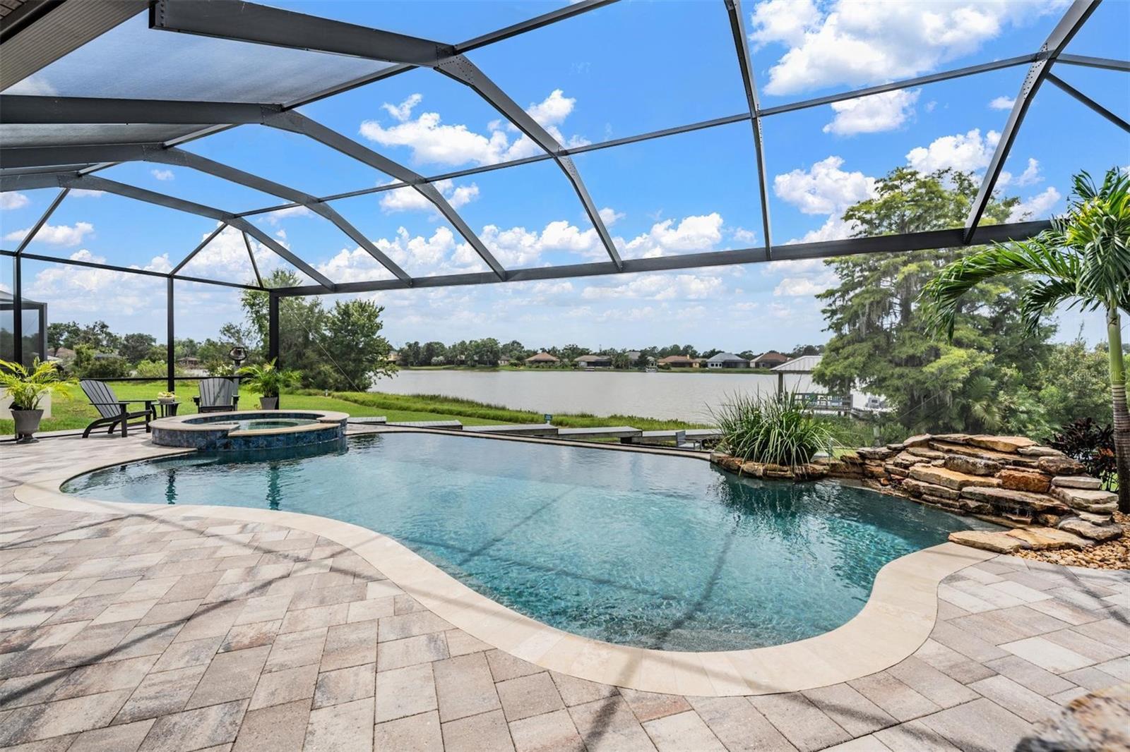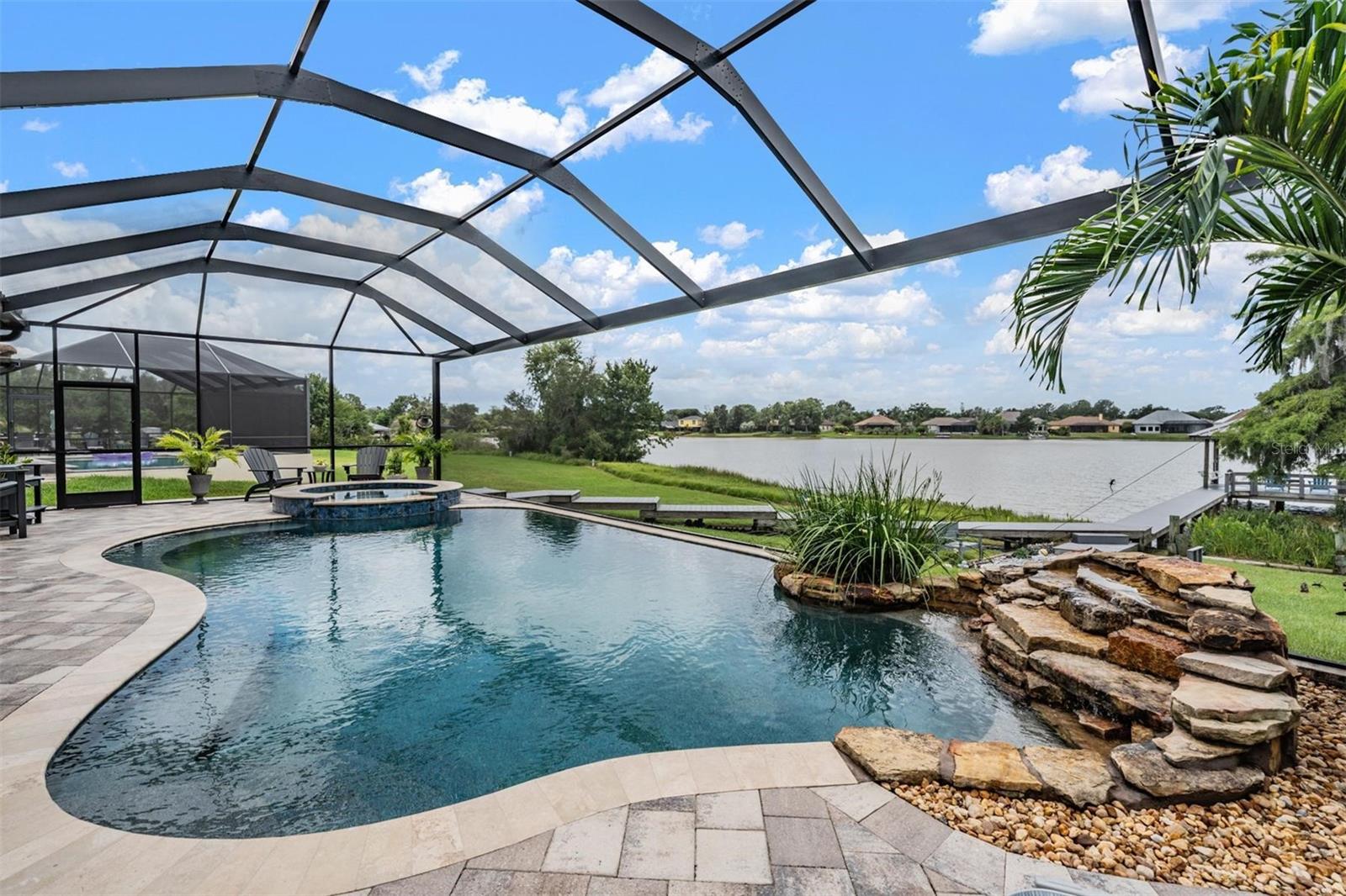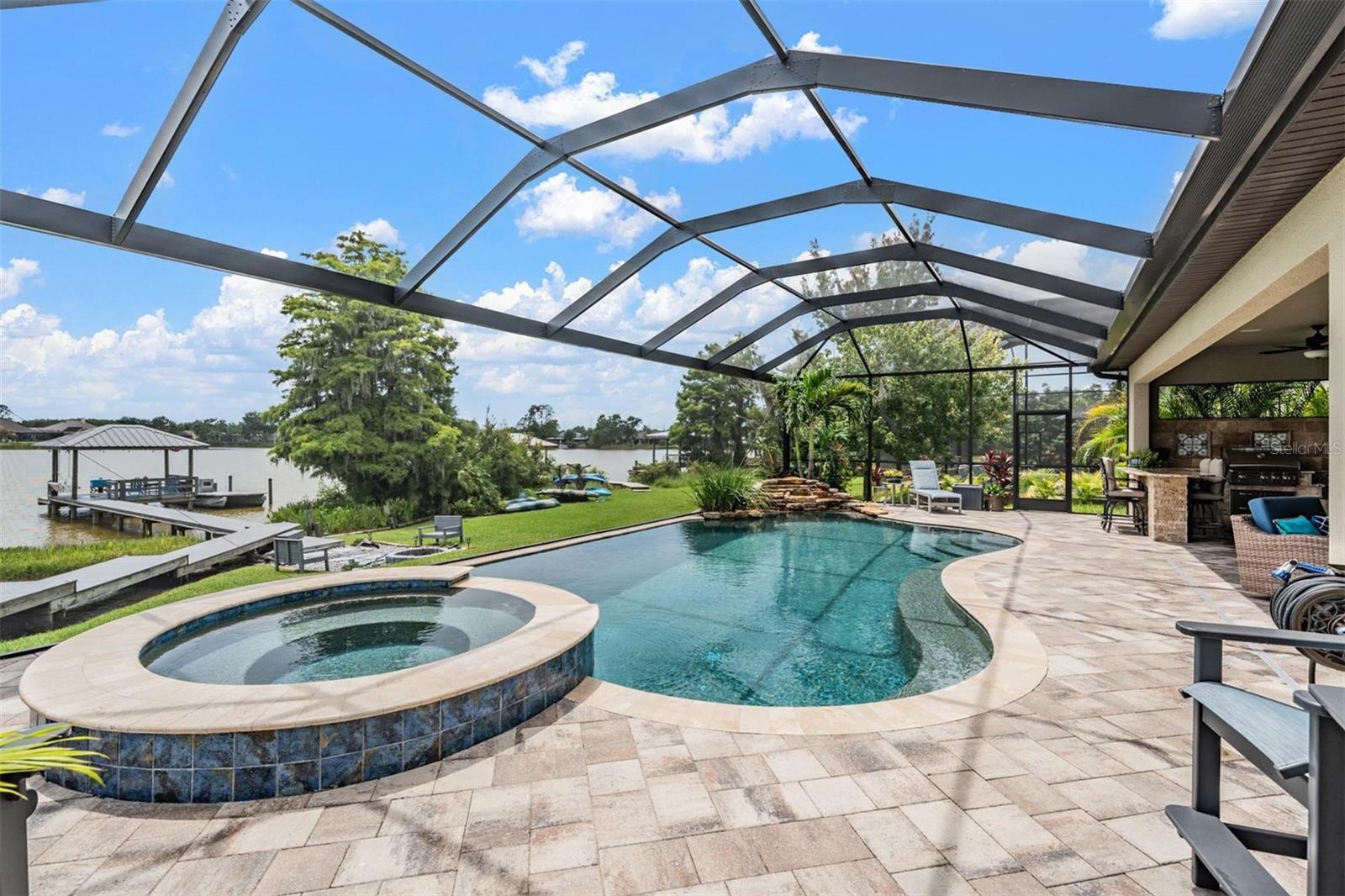 Experience Unmatched Lakefront Luxury in Pristine Lake Preserve! Welcome to this exceptional LAKE FRONT 4-bedroom, 4-bathroom POOL home with a private office and bonus room, located in the exclusive gated community of Pristine Lake Preserve in Land O’ Lakes. Built by WestBay Homes, this over 3,000 sq ft residence is thoughtfully designed to elevate your lifestyle—combining elegant interior spaces, luxurious outdoor living, and direct access to the tranquil waters of Curve Lake. From the moment you arrive, the pavered driveway and sidewalk, mature landscaping, and serene lake views set the tone for what awaits inside. Step through the grand entry into a light-filled, open-concept living space with wood-look plank tile flooring, soaring trey ceilings, and custom finishes throughout. The chef’s kitchen is both beautiful and functional, featuring granite countertops, tile backsplash, top of the line stainless steel appliances, gas range, a large center island and eating space, a built in desk to get your meal planning complete for the week and generous storage. Plantation shutters offer both privacy and style throughout the home. The primary suite is a serene retreat overlooking the pool and lake, complete with a custom walk-in closet system, separate vanities and a make up desk make getting ready for your day a breeze, a rain shower head, and a spacious walk-in shower. Off the main hallway double doors lead to the private office, ideal for working from home with quiet focus. Bedroom 2 is located at the front of the home and features a built-in closet, plantation shutters, and a full bathroom just outside the room—perfect for guests. Bedroom 3 sits in the mid-section of the home, also with a built-in closet and a full bathroom nearby. Upstairs, you'll find Bedroom 4 along with a generous bonus room and full bathroom—ideal for a media space, playroom, or private guest retreat. The 3-car garage includes custom built-in shelving, offering exceptional storage and organization. Step outside and embrace true Florida lakefront living. The backyard is an entertainer’s dream with a natural gas-heated saltwater pool and spa, a custom natural stone waterfall, and a panoramic sunbeam screen enclosure offering unobstructed views of the water. The fully equipped outdoor kitchen features granite countertops, Blaze commercial-grade grill, power burner, refrigerator, and stainless steel drawers. Enjoy evenings by the custom firepit or walk along over 150 feet of TREX decking, seamlessly connecting the lanai to your covered dock with electricity. The deep-water dock is perfect for boating, paddleboarding, fishing, or simply relaxing lakeside with a sunset view. This one-of-a-kind home offers the perfect blend of luxury, functionality, and lifestyle in one of Land O’ Lakes’ most exclusive gated lakefront communities. IT'S NOT JUST A HOME...BUT A LIFESTYLE! **BUYER TO RECEIVE $5,000 LENDER CREDIT - ASK AGENT FOR DETAILS