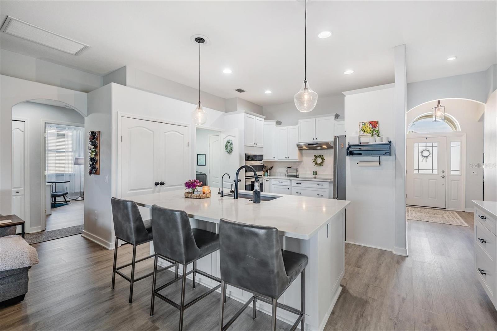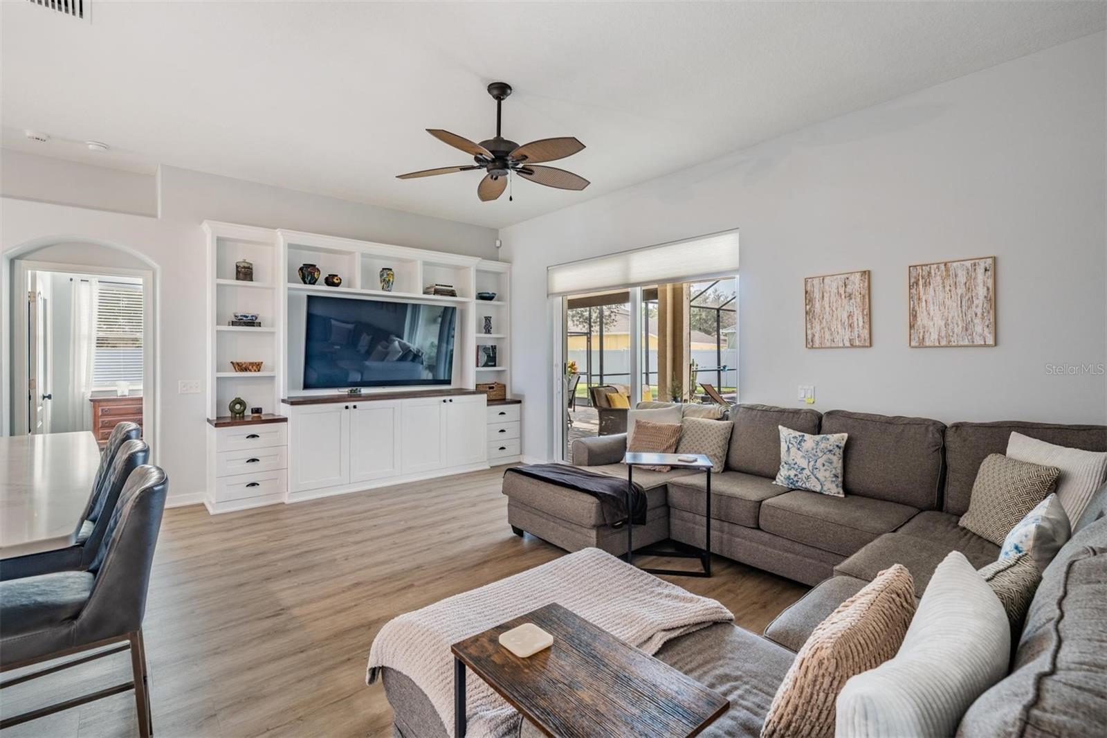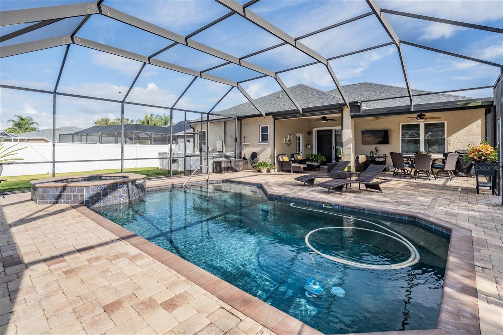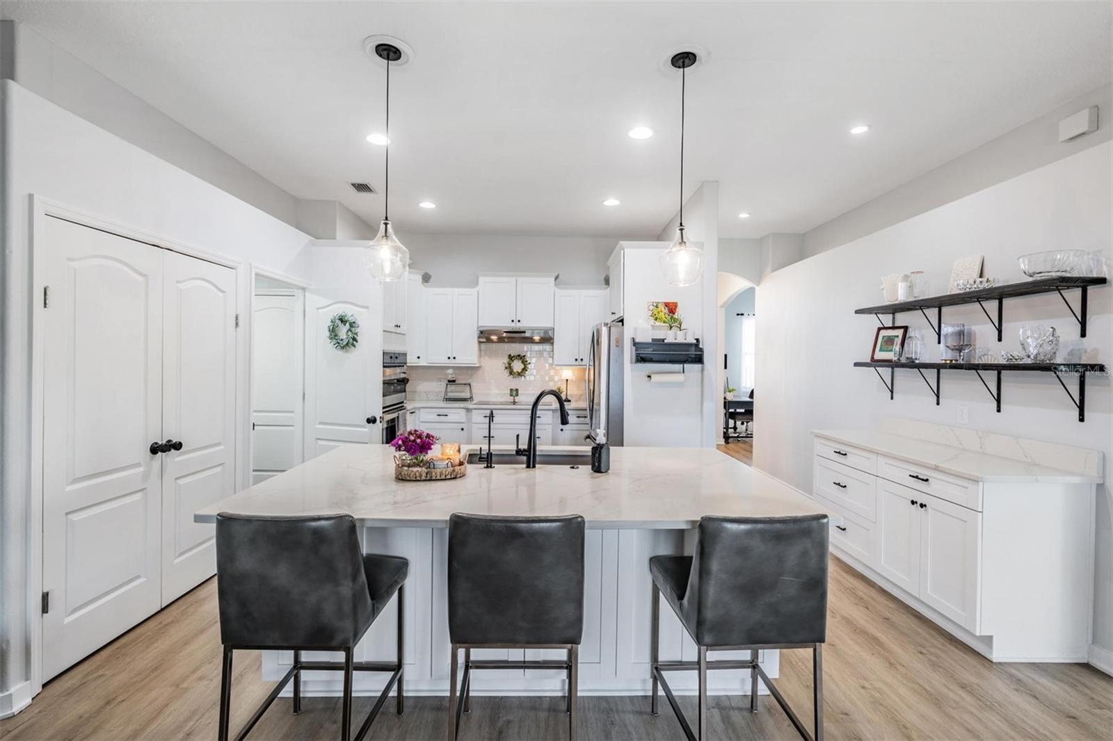 Come check out this charming, meticulously renovated home located in Stagecoach, designed to impress even the pickiest buyer. Situated at the end of a quiet neighbor friendly, cul-de-sac on nearly one-third of an acre, this stunning pool home offers privacy, space, and style. As you step through the front door, you’re welcomed by continuous LVP flooring throughout and a versatile layout featuring a formal living room on one side and a formal dining room on the other both of which could easily be converted into additional rooms if desired. The kitchen was updated in 2021 and showcases white shaker cabinets, stainless steel appliances, and quartz countertops. The upgraded pantry includes custom built-ins and drawers, making organization effortless. The family room continues the cohesive design with built-in cabinetry that perfectly matches the kitchen for a seamless, high-end aesthetic. The primary suite is a true retreat, featuring a spacious bathroom with a dedicated makeup area, a rain-head shower with massaging jets, and ample storage. The walk-in closet is outfitted with custom built-ins. With a desirable split floor plan, the opposite side of the home offers three additional bedrooms and an updated bathroom that also serves as a convenient pool bath. Step outside to your own summertime oasis. The oversized heated saltwater pool features a sun shelf and spa, ideal for both relaxing and entertaining. The lanai includes an insulated seating area to help keep you cool during warm summer days, and as the sun sets, an automated sunscreen can be deployed for added comfort. The expansive backyard offers plenty of space for pets, outdoor activities, or gardening. To top it all off, the location can’t be beat, close to major shopping, interstate access, restaurants, and more. This exceptional home truly has it all and is the perfect fit for comfortable Florida living.