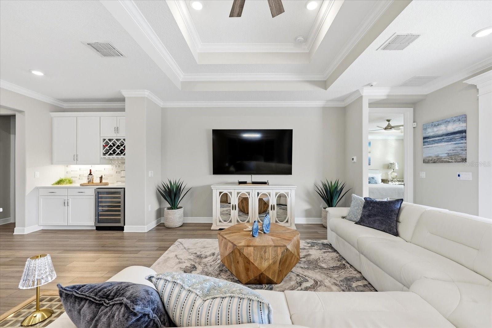 Live the Florida lifestyle in this exceptional Echelon Series home located in the highly sought-after gated Del Webb 55+ community in Land O’ Lakes. Designed for active adult living, this move-in-ready home offers luxury, connection, and resort-style amenities where neighbors become friends and every day brings the option to relax or stay socially engaged. Del Webb Land O’ Lakes features a 19,000+ sq. ft. clubhouse, resort-style pools, a state-of-the-art fitness center with classes, pickleball and tennis courts, a community garden, dog park, over 40 resident clubs and a full calendar of events coordinated by a dedicated Lifestyle Director—creating a true active adult lifestyle community. This beautifully upgraded home offers 2 bedrooms, 2.5 bathrooms, and a den with French doors, offering flexibility for a home office, third bedroom, or private retreat. The open-concept floor plan showcases coffered ceilings, 8-foot doors, custom millwork, crown molding, and designer finishes throughout. The entertainer-inspired kitchen features an oversized quartz island, upgraded appliances, soft-close cabinetry with pullouts, walk-in pantry, and a separate bar area with wine refrigerator—perfect for everyday living and effortless entertaining. The great room flows seamlessly to the outdoors through expansive pocketing sliding glass doors, creating ideal indoor-outdoor living. Step outside to the private lanai and enjoy true Florida living with a heated custom pool featuring a sun shelf, salt system, travertine pavers, cage lighting, and convenient retractable hurricane-ready screen. Overlooking an oversized conservation lot, this peaceful outdoor oasis is perfect for morning coffee, sunset cocktails, or quiet evenings. The luxurious primary suite includes plantation shutters, coffered ceilings, dual vanities, an oversized zero-entry walk-in shower, and a custom-designed walk-in closet, all complemented by serene conservation views that enhance the sense of retreat. Guests will appreciate the private ensuite bedroom featuring an expansive bathroom with walk-in shower and closet, also overlooking conservation views for added privacy and comfort. The massive laundry room is thoughtfully designed with custom built-in cabinetry on both sides, offering exceptional storage, workspace, and organization—making everyday tasks both efficient and elegant. Additional upgrades include a whole-home water softener, tankless water heater, gutters, landscape curbing, and the ease and convenience of installed roll-down hurricane shutters for peace of mind. The extended-depth three-car garage with custom epoxy flooring provides exceptional space for large vehicles, a golf cart, workshop space, or extra storage. HOA Fees include yard maintenance, plus internet and cable. Conveniently located near shopping, dining, golf, medical facilities, Tampa International Airport, and Florida’s beaches. Meticulously maintained and extensively upgraded, this move-in-ready Del Webb home reflects exceptional pride of ownership and thoughtful enhancements throughout, you only need to unpack and relax. Del Webb isn’t just a community—it’s a lifestyle. Your next chapter begins here.