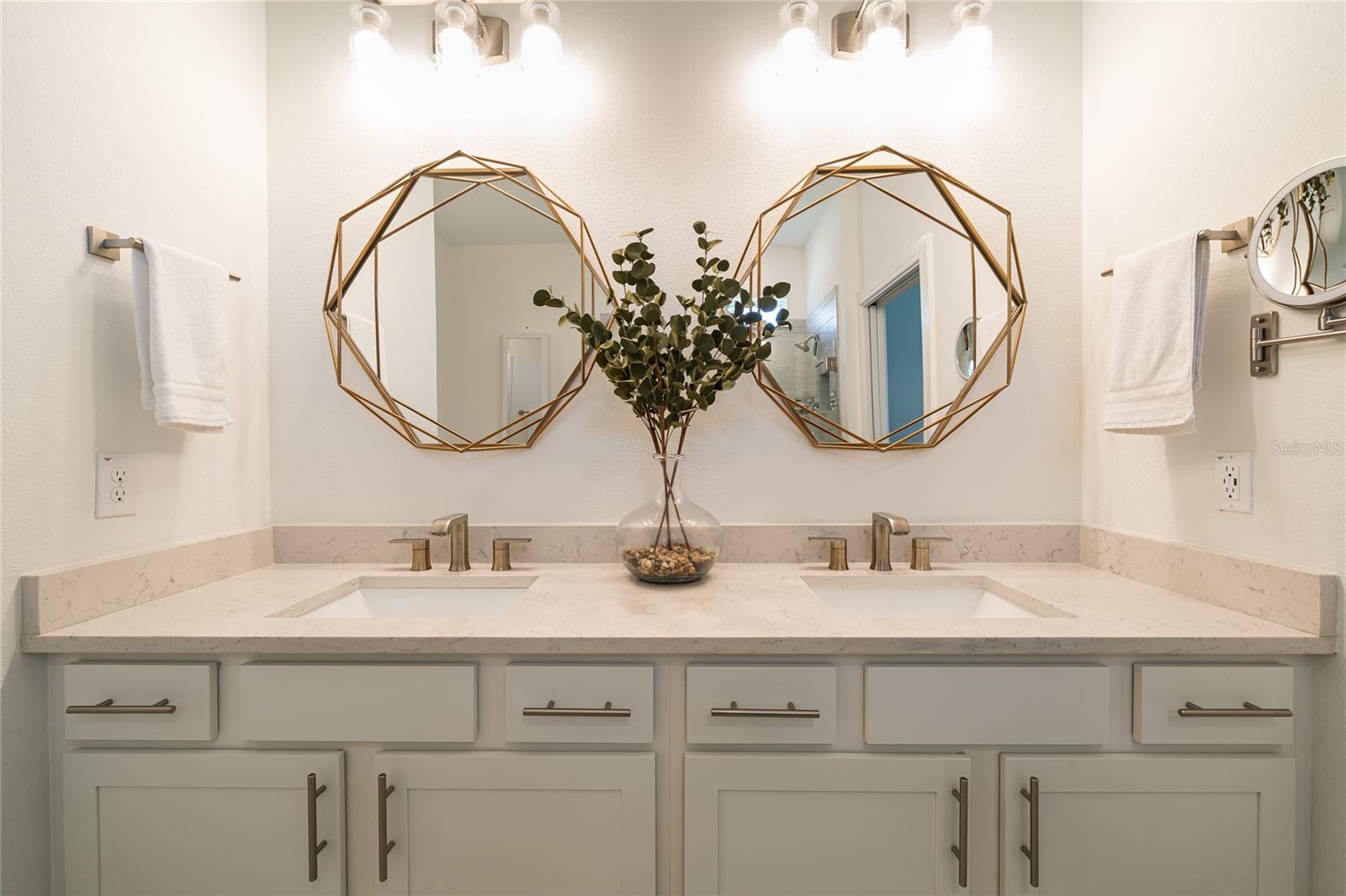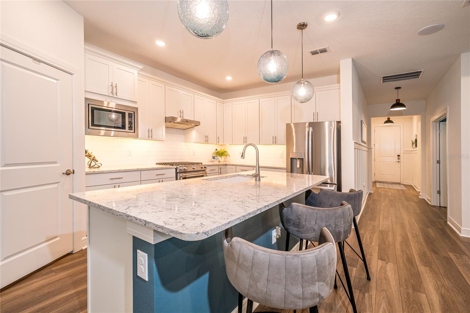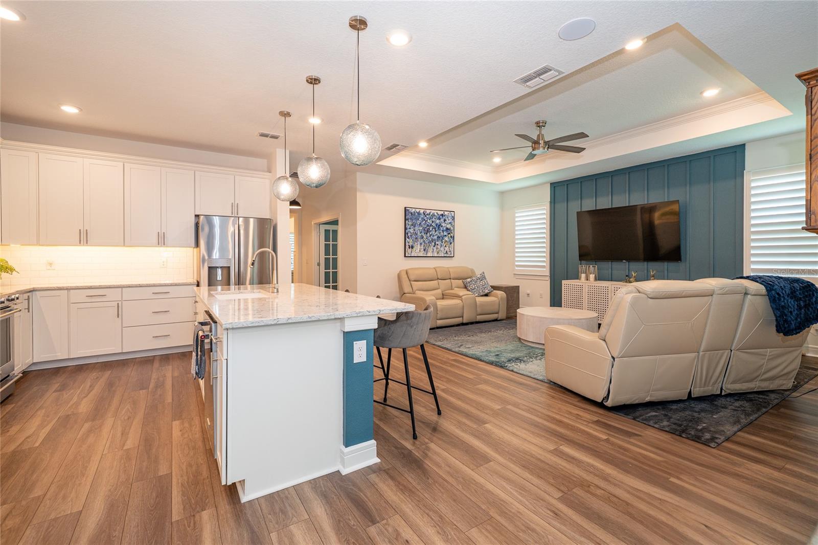While RELAXING on your EXTENDED LANAI and ENJOYING your corner POND VIEW, you will see that this EXTRAORDINARY HOME is the one that checks all the boxes that you've been waiting for! You cannot beat the Beautiful Gated Del Webb Bexley (Active over 55) Community in the Lovely Tampa Bay area where AMAZING AMENITIES and CABLE, INTERNET and LAWN CARE are INCLUDED! As you pull into the Brick Paver driveway, you'll immediately be struck by the Colorful, Expertly Designed Landscaping with a Charming Rock Border's Truly A STANDOUT in the Entire Neighborhood. The Inviting FRONT PORCH and Distinctive Glass Front Storm Door set the tone for the UNIQUE STYLE and THOUGHTFUL UPGRADES you'll find throughout this home. This ever-popular expanded Mystique floorplan offers 2,098 square feet of beautifully designed living space with 3 Full Bedrooms, 3 Full Bathrooms, and a Versatile Flex Room behind elegant FRENCH DOORS, Perfect for a Home Office, Den, or Craft space. Inside, you'll find TRAY CEILINGS, 5 inch baseboards, Stunning WOODWORKING ACCENTS and LUXURY VINYL flooring throughout all Living areas and Bedrooms, paired with Upgraded Tile in the Baths and Laundry Room. PLANTATION SHUTTERS add timeless elegance to every window, while QUARTZ COUNTERTOPS shine in the Kitchen and all Bathrooms. The kitchen is a showstopper, complete with 42 inch Wood Cabinets, SUBWAY TILE Backsplash, Pull out shelving, Under-Cabinet Lighting, Breakfast Bar, Granite Sink, UPGRADED APPLIANCES, a Walk-in Pantry with Wood Shelving and MINI FRIDGE and Cooling System, and a Water Heater under the sink for Instant Hot Water. A WHOLE-HOME WATER FILTER, Water Softener, HVAC UV light, and an Electronic Soft-Starter enhance COMFORT, EFFICIENCY, and PEACE OF MIND. Step outside to your ultra private, extended screened lanai's an entertainer's dream with both (Alexa-enabled) EXTERIOR LIGHTING and Circulating/Cooling Fans, and plenty of space for RELAXING or HOSTING FRIENDS. There's even Sprinkler Piping for Lanai and front yard plant beds to keep your landscaping looking its best year-round. Additional highlights include a Well-Equipped Laundry Room with Washer and Dryer, Upper and Lower Cabinets and a Sink, Quartz Counter, plus a Garage featuring an Insulated Door, Storage Shelving and Ceiling Racks. And yes, the entire home is protected with WHOLE-HOUSE SURGE PROTECTION. If you enjoy staying Active INCREDIBLE AMENITIES include a Resort-Style Pool with lap lanes, Resistance Pool, Hot Tub, ana Cabanas, Expansive 19,000 sq. ft. clubhouse, Multipurpose Room and Arts and Crafts Room, Beer and Wine Bar, Cafe/Bistro/, Outdoor Fireplace, Lounge, 2 Tennis Courts, 6 Pickle ball Courts, 4 Bocce Ball Courts, Fitness Center, Movement Studio, Community Garden, Dog Park, and many Resident Clubs and Interest Groups! Conveniently located just minutes away from shopping, restaurants, top-tier medical facilities and FL-54 & FL-589 Del Webb Bexley is less than 30 minutes to TAMPA INTERNATIONAL AIRPORT and DOWNTOWN TAMPA. Experience the best of Florida living where your dream home awaits at Del Webb Bexley, where each day is a delightful escape. Don't miss your chance to own this beautifully upgraded home in one of the most sought-after 55+ communities in the Tampa Bay area. Schedule your private tour today!
