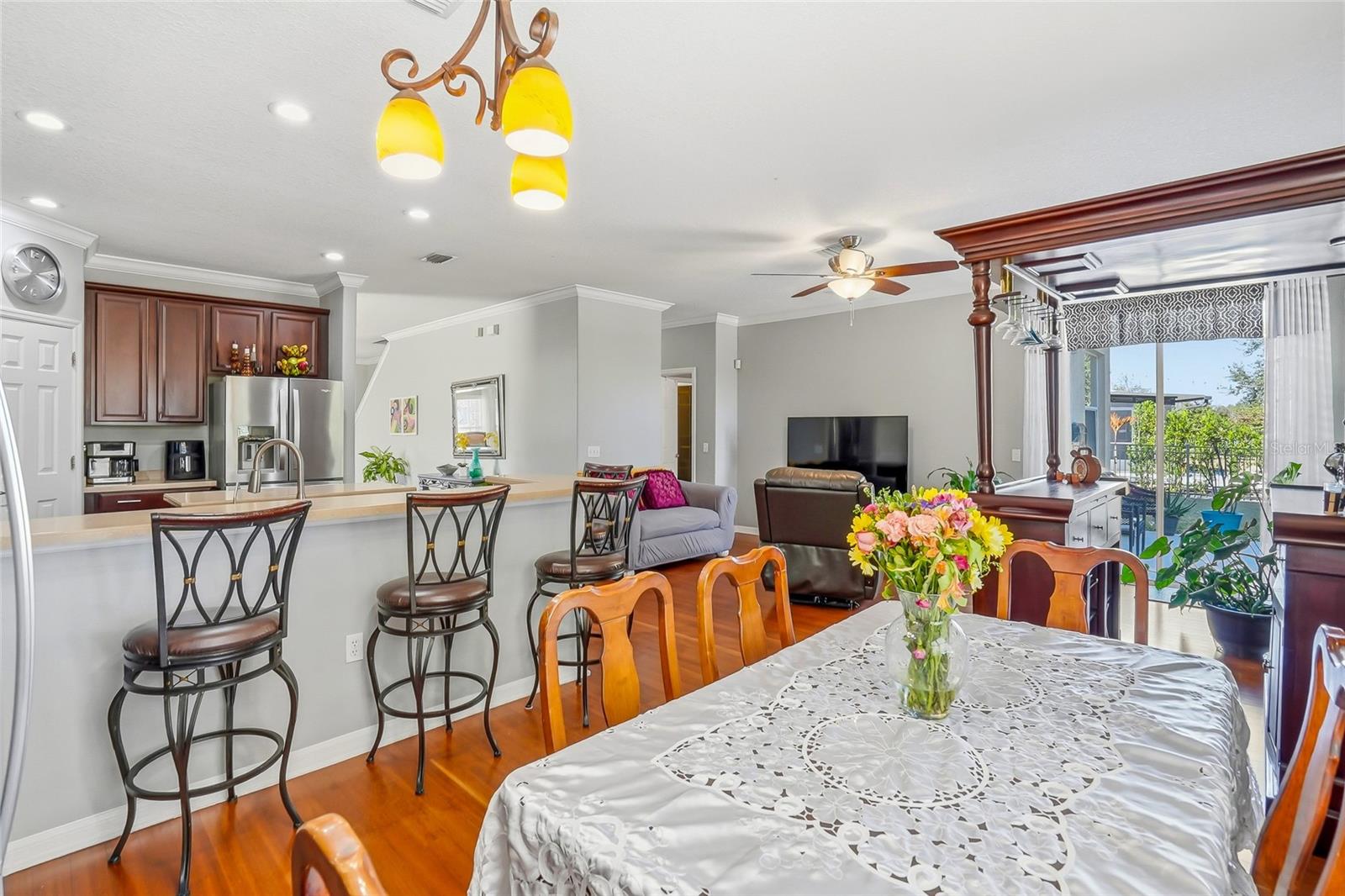 Step into this stunning and expansive residence where comfort, elegance, and functionality come together to create the perfect place to begin your next chapter. Offering 5 bedrooms, 3.5 bathrooms, a 3-car garage, and 3,208 square feet of thoughtfully designed living space, this home provides the ideal balance of sophistication and everyday comfort. A new roof was installed just two years ago. A whole-house water softener system adds an extra touch of care and convenience. Upon entering, you’re welcomed by a refined formal living and dining area that creates a warm and impressive first impression. The open-concept layout seamlessly connects the kitchen and family room, making it perfect for entertaining and daily living. High ceilings, rich wood flooring, crown molding, stainless steel appliances, 42-inch cabinetry, and an oversized pantry enhance both style and practicality. The main level features two spacious bedrooms, a full bathroom, and a convenient half bath—ideal for guests or multigenerational living. Upstairs, the luxurious primary suite offers dual vanities, a walk-in shower, and a generous walk-in closet. A versatile bonus room provides endless possibilities—home office, media room, playroom, gym, or entertainment space. The upper level also includes a Jack-and-Jill bedroom layout, offering both privacy and functionality. Additional highlights include a separate, spacious laundry room and a three-car garage equipped with an overhead storage cage for optimal organization. Step outside to your private backyard retreat, backing onto a tranquil conservation area and serene pond views. With ample space for gatherings, barbecues, and outdoor fun, this peaceful setting creates the perfect backdrop for unforgettable moments with family and friends. Located in the highly desirable Dupree Lakes community, residents enjoy exceptional resort-style amenities. The beautifully appointed clubhouse serves as the heart of the neighborhood, complemented by a sparkling swimming pool, playground, lighted tennis courts, basketball and soccer fields, scenic walking and jogging trails, and a picturesque pond. All of this comes with low annual HOA fees. Conveniently situated near The Shops at Wiregrass, Tampa Premium Outlets, major highways, and top-rated schools, this home offers both luxury living and everyday convenience. An exceptional opportunity to own a home that truly has it all.
