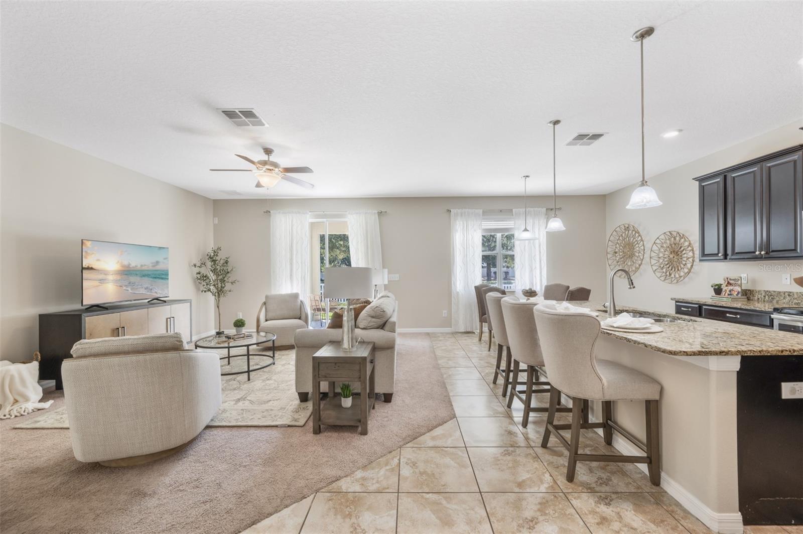 Style, space, and comfort come together in this beautifully maintained two-story home located in the sought-after Concord Station community of Land O’ Lakes. This spacious 4-bedroom, 3-bath single-family residence offers a thoughtful layout, modern updates, and energy-efficient features designed for today’s lifestyle. Step inside to a bright, open floor plan with high ceilings, a versatile loft, and a seamless kitchen-to-family-room layout ideal for everyday living and entertaining. The heart of the home is the inviting kitchen, featuring 42" solid wood cabinets, granite countertops, a center island, pantry, and stainless steel appliances. Upstairs, the primary suite serves as a relaxing retreat with a walk-in closet, dual vanities, and a separate tub and shower. A downstairs bedroom and full bath provide flexibility and convenience, perfect for guests or an accessibility-friendly setup. Additional highlights include stone countertops, ceiling fans, and an interior utility room. Outside, enjoy Florida living on the covered back porch, while hurricane shutters, impact-resistant windows, and an irrigation system add peace of mind and ease of maintenance. Set within the well-established, amenity-rich Concord Station community, residents enjoy access to a community pool, fitness center, playground, basketball and tennis courts, along with close proximity to schools, shopping, and major highways. Move-in ready and located in one of Land O’ Lakes’ most desirable neighborhoods—this home is ready to impress.