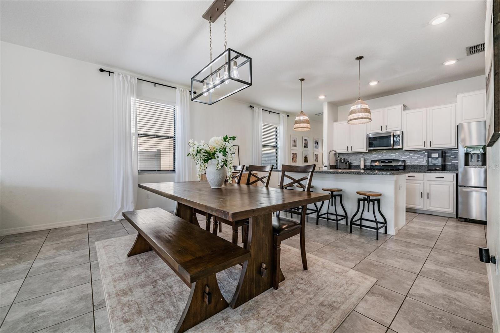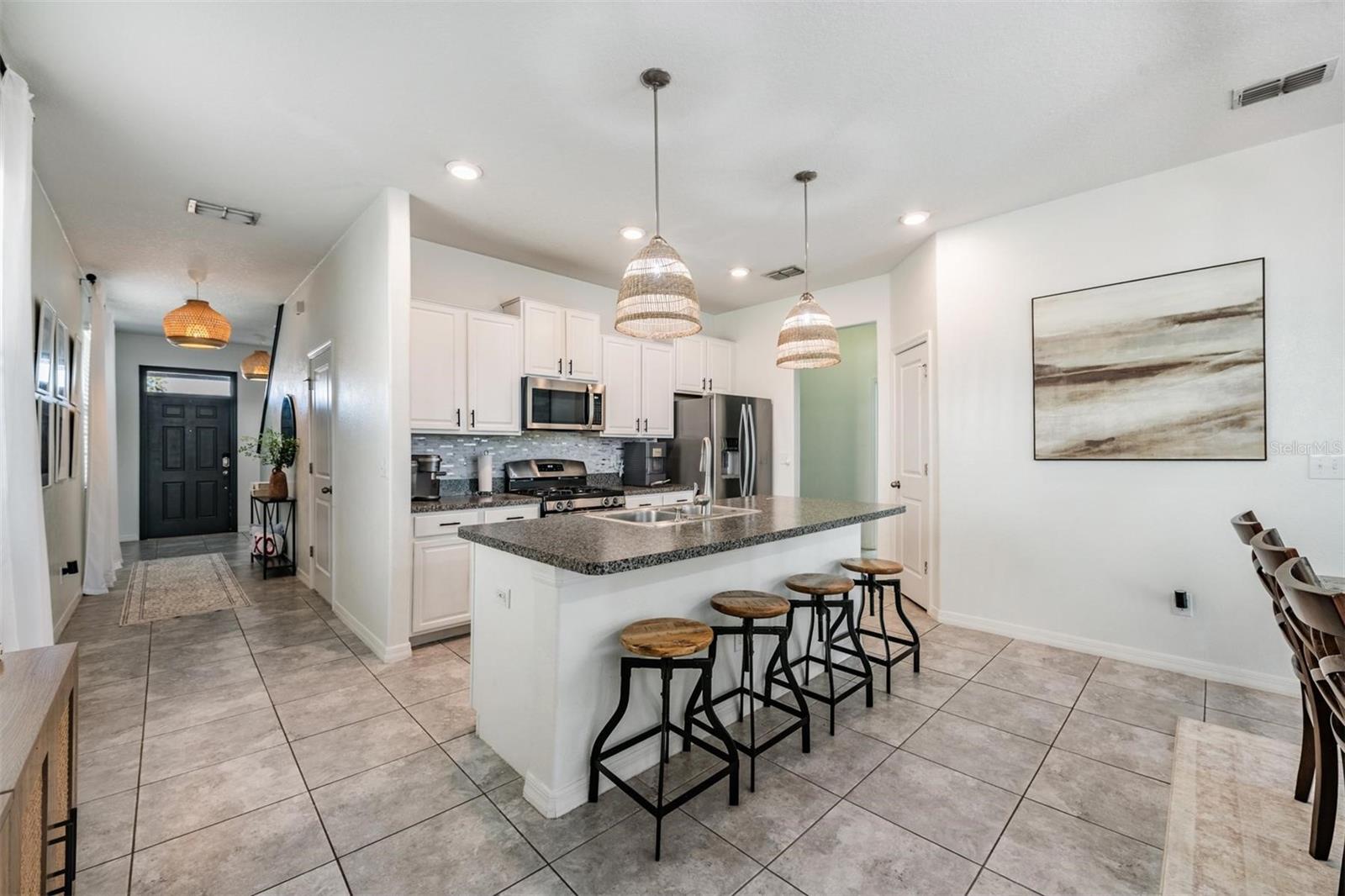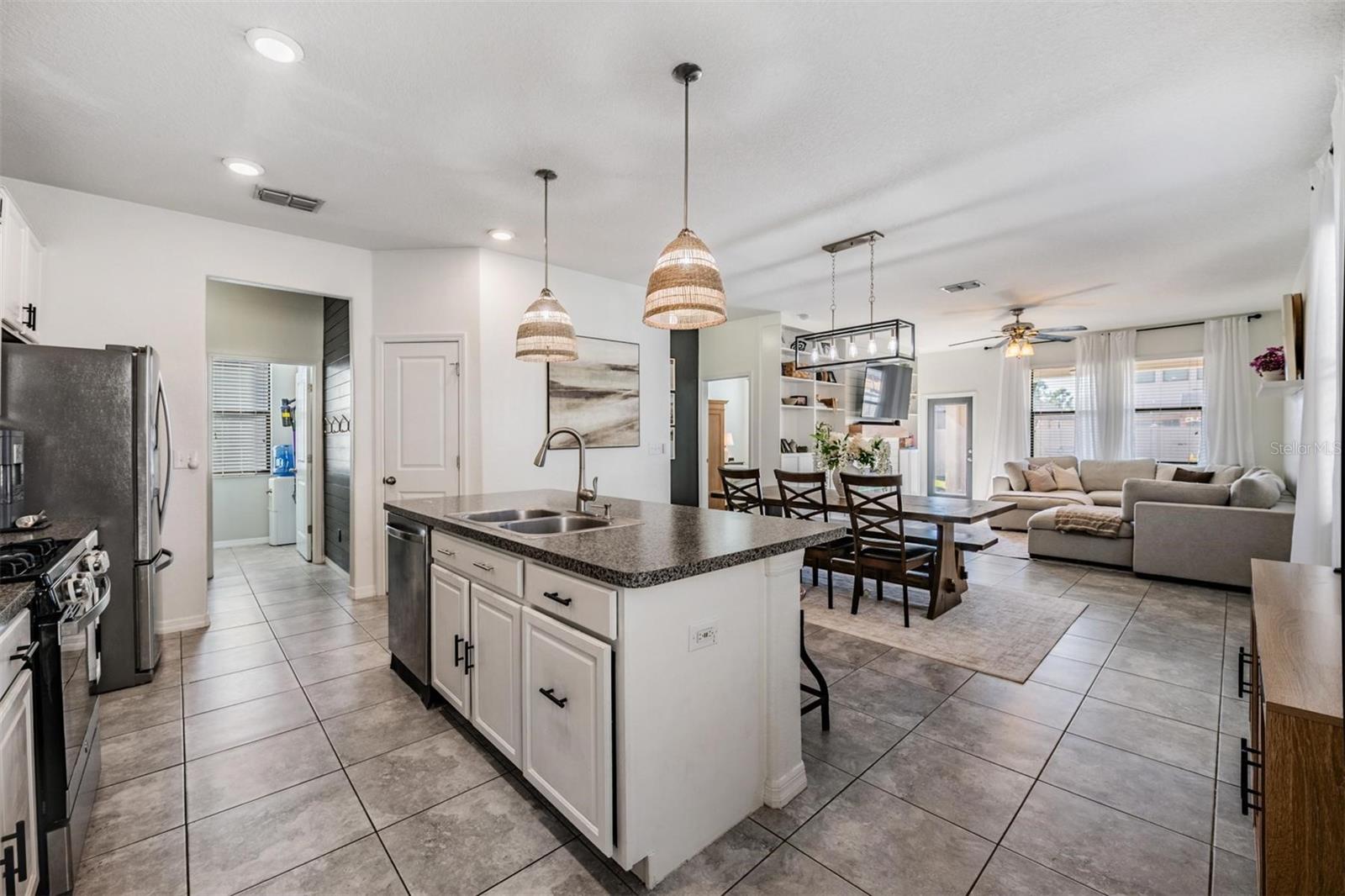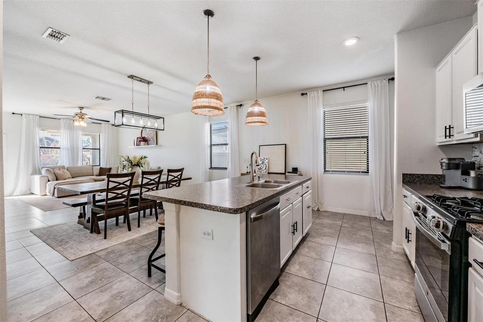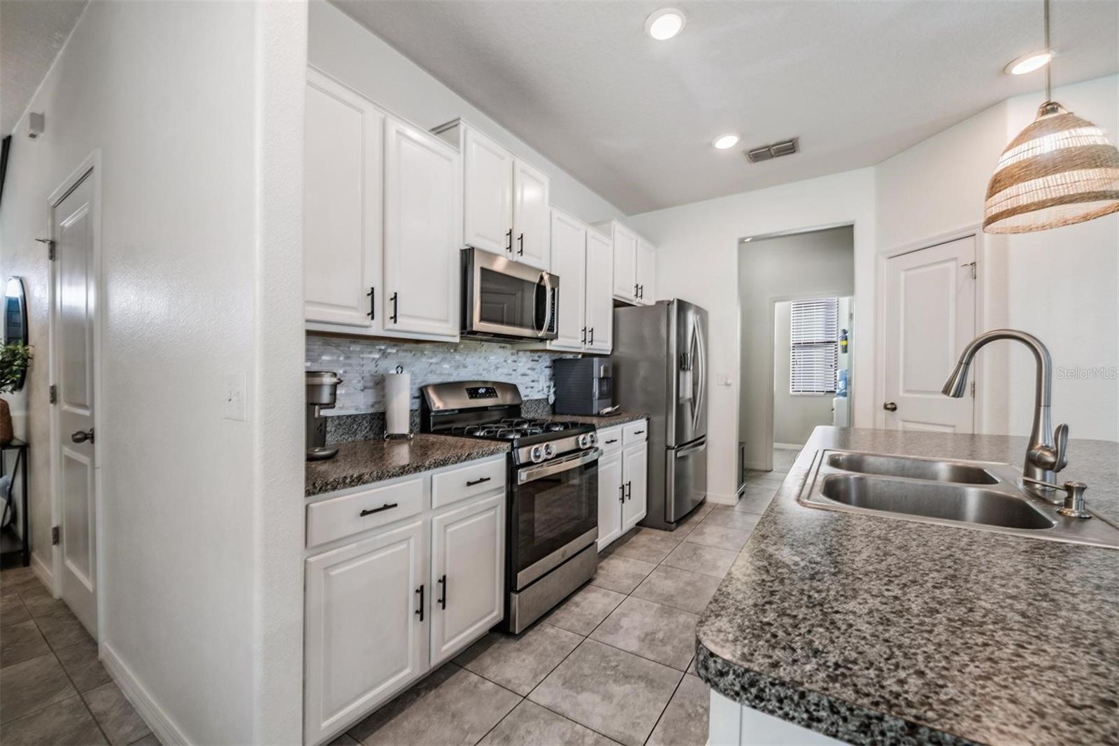 Welcome home to this light, bright, and spacious 3 bedroom, 2.5 bath home complete with a loft and a 2 car garage. Once you enter you are greeted by the generous foyer which will lead you to the open concept kitchen & living area. The kitchen features an oversized island, solid wood cabinetry, spacious pantry, and a complete stainless steel appliance package, including a natural gas range. There's a convenient and elegant half bath downstairs for guests. The kitchen is open to the casual dining area and cozy living room. The custom built in features plenty of storage and is highlighted with an electric fireplace. The primary bedroom is located on the lower level with an ensuite bath, spacious shower, dual sinks, a separate water closet, and a large walk-in closet. Upstairs there's a loft that could be used as an office, play area, or just a nice place to relax. There are two oversized bedrooms each with walk-in closets with a generously sized linen closet between them. The upstairs bathroom is shared between the bedrooms and has a shower/tub combo. In the backyard you will find an upgraded oversized paver patio to entertain and enjoy the outdoors. The yard is fully fenced which works great with children or pets alike. Conveniently located off the garage entry, you will find the laundry room with washer and dryer included. Additional upgrades include a NEW ROOF in 2026 & a tankless GAS water heater. The Community of Connerton is a master-planned community with a balance of Nature preserve and community lifestyle. The nature preserve features bike trails, lakes, and wetlands while the lifestyle community features a splash park, a resort-style pool, fitness center, Connertown Cafe, Kidz Zone, beach volleyball, basketball, pickleball, and a lifestyle coordinator that fills the monthly calendar with fun for all ages. Plus this is a golf cart friendly community! With low HOA and CDD fees this home is ready for you to call it home.