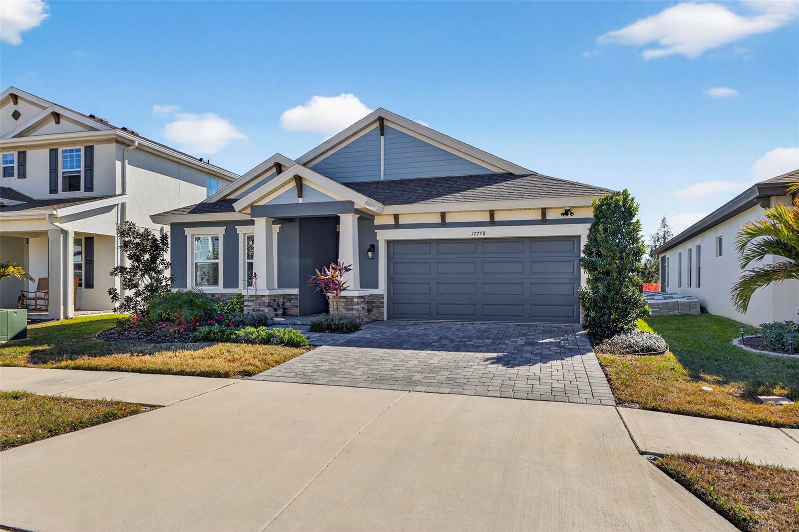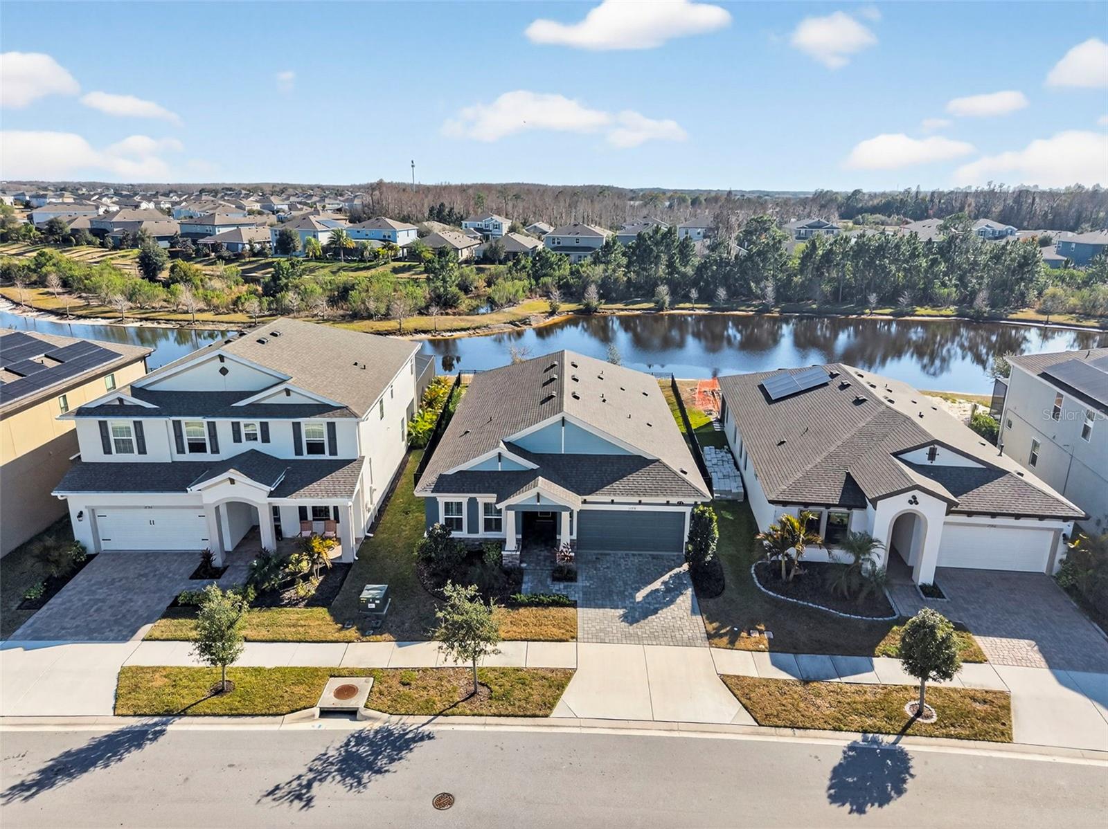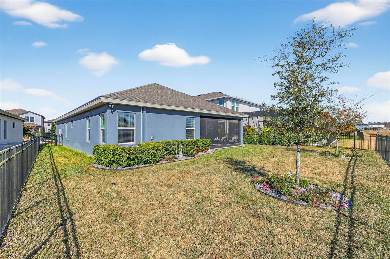 Welcome to this move-in ready 2023-built home located in the highly sought-after Bexley community, offering modern design, functional living spaces, and peaceful pond views. This thoughtfully designed 3 Bedroom, 3 Bathroom, 2-Car Garage split floor plan residence with a dedicated office/den offers stylish finishes and flexible living spaces throughout. Upon entering, you are greeted by a bright and inviting foyer that leads past a secondary bedroom and a versatile den that can easily function as a home office, guest space, or potential 4th bedroom. The home opens into a spacious, light-filled living area where the kitchen, dining, and family rooms flow seamlessly together, enhanced by four oversized sliding glass doors that create effortless indoor-outdoor living. The gourmet kitchen is designed for both everyday living and entertaining, featuring a large center island with bar seating, upgraded quartz countertops, top-of-the-line stainless steel appliances, a statement range hood, abundant cabinetry, and a walk-in pantry providing exceptional storage. Luxury vinyl flooring runs throughout the main living areas, complemented by plantation shutters in almost every room and updated light fixtures that add a polished finish. The home is equipped with smart features including a smart thermostat, Ring security cameras at the front door, garage, and rear exterior, and a reverse osmosis water system. The primary suite offers a spacious private retreat complete with dual custom closets and an en suite bath featuring double vanities, a walk-in frameless shower, linen closet, and a separate water closet. Each bedroom includes custom closet systems for added organization and functionality. The 3rd bedroom offers its own private ensuite bathroom, ideal for guest accommodations or multigenerational living. A dedicated laundry room includes cabinetry for additional storage along with the washer and dryer, and the two-car garage provides added space for storage or recreational gear. Outdoor living is just as inviting with an expansive panoramic screened lanai overlooking serene pond views, creating a comfortable setting for relaxing or entertaining, while the fully fenced and beautifully landscaped yard enhances privacy and outdoor enjoyment. Bexley offers a vibrant, master-planned lifestyle with resort-style pools, the Twisted Sprocket Café, miles of scenic walking and biking trails, neighborhood parks, dog parks, fitness centers, and year-round community events, all conveniently located near shopping, dining, and everyday conveniences.