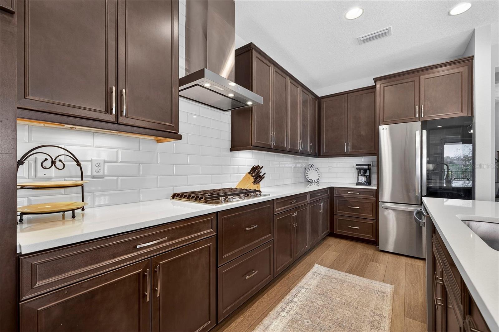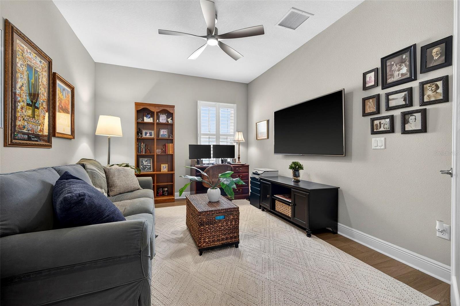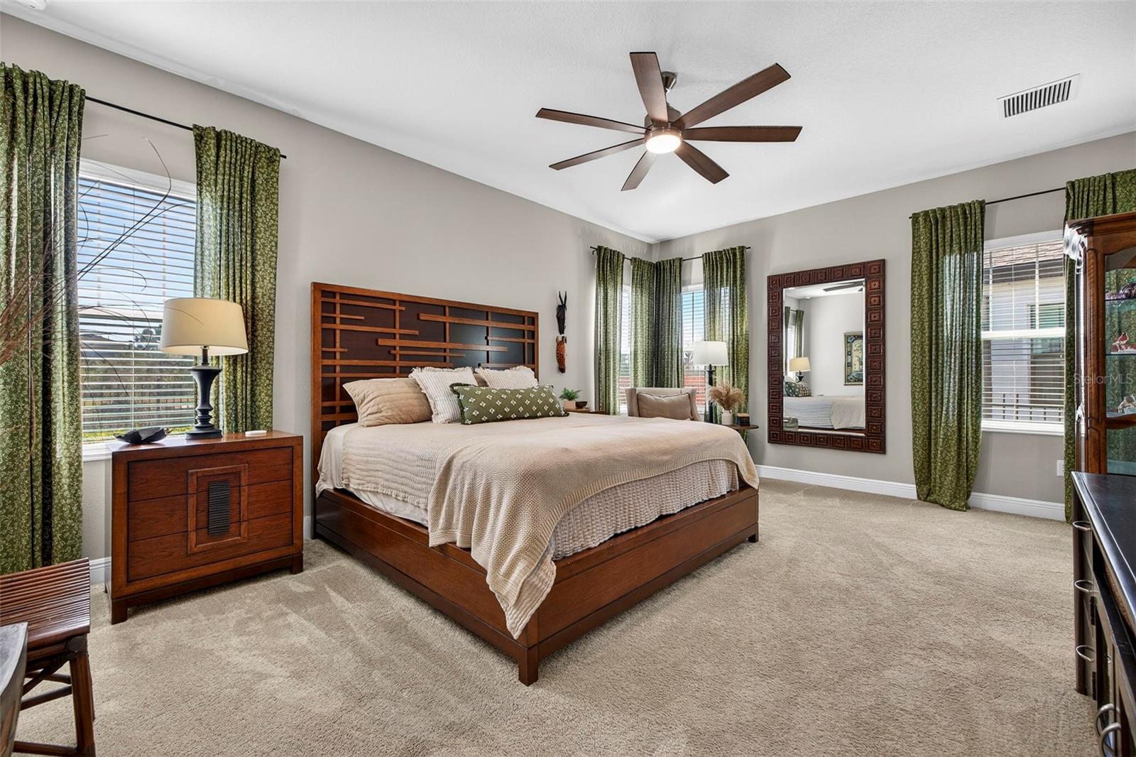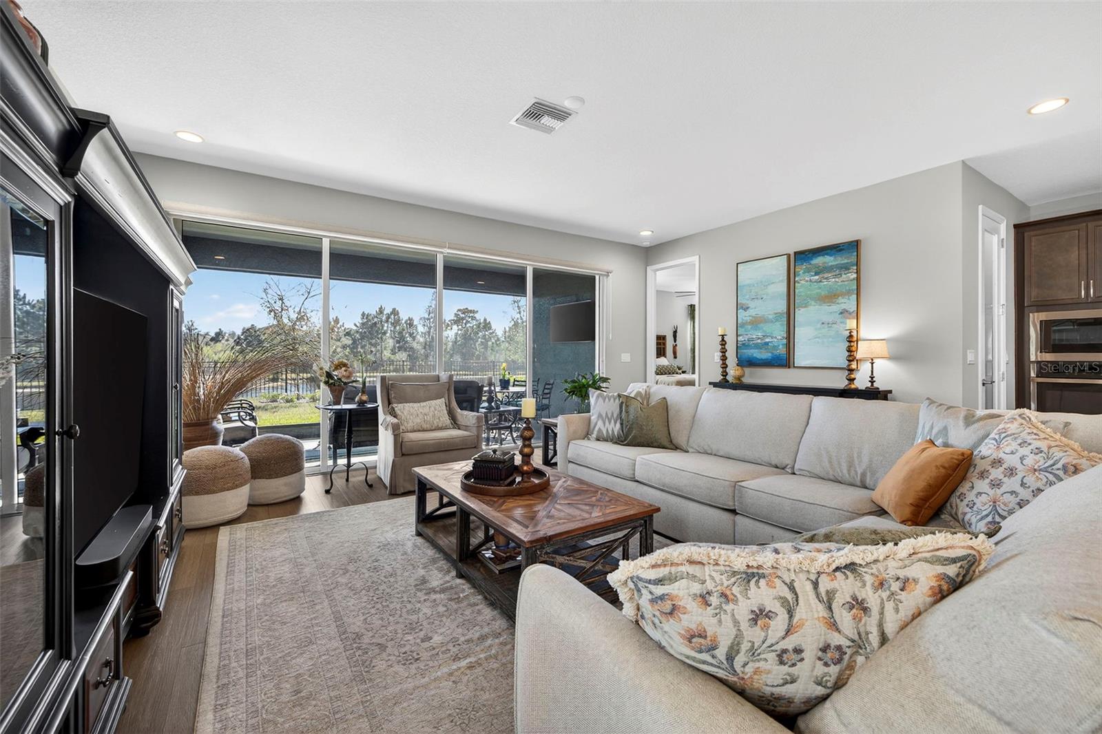 Welcome to this move-in ready 2023-built home located in the highly sought-after Bexley community, offering modern design, functional living spaces, and peaceful pond views. This thoughtfully designed 3 Bedroom, 3 Bathroom, 2-Car Garage split floor plan residence with a dedicated office/den offers stylish finishes and flexible living spaces throughout. Upon entering, you are greeted by a bright and inviting foyer that leads past a secondary bedroom and a versatile den that can easily function as a home office, guest space, or potential 4th bedroom. The home opens into a spacious, light-filled living area where the kitchen, dining, and family rooms flow seamlessly together, enhanced by four oversized sliding glass doors that create effortless indoor-outdoor living. The gourmet kitchen is designed for both everyday living and entertaining, featuring a large center island with bar seating, upgraded quartz countertops, top-of-the-line stainless steel appliances, a statement range hood, abundant cabinetry, and a walk-in pantry providing exceptional storage. Luxury vinyl flooring runs throughout the main living areas, complemented by plantation shutters in almost every room and updated light fixtures that add a polished finish. The home is equipped with smart features including a smart thermostat, Ring security cameras at the front door, garage, and rear exterior, and a reverse osmosis water system. The primary suite offers a spacious private retreat complete with dual custom closets and an en suite bath featuring double vanities, a walk-in frameless shower, linen closet, and a separate water closet. Each bedroom includes custom closet systems for added organization and functionality. The 3rd bedroom offers its own private ensuite bathroom, ideal for guest accommodations or multigenerational living. A dedicated laundry room includes cabinetry for additional storage along with the washer and dryer, and the two-car garage provides added space for storage or recreational gear. Outdoor living is just as inviting with an expansive panoramic screened lanai overlooking serene pond views, creating a comfortable setting for relaxing or entertaining, while the fully fenced and beautifully landscaped yard enhances privacy and outdoor enjoyment. Bexley offers a vibrant, master-planned lifestyle with resort-style pools, the Twisted Sprocket Café, miles of scenic walking and biking trails, neighborhood parks, dog parks, fitness centers, and year-round community events, all conveniently located near shopping, dining, and everyday conveniences.