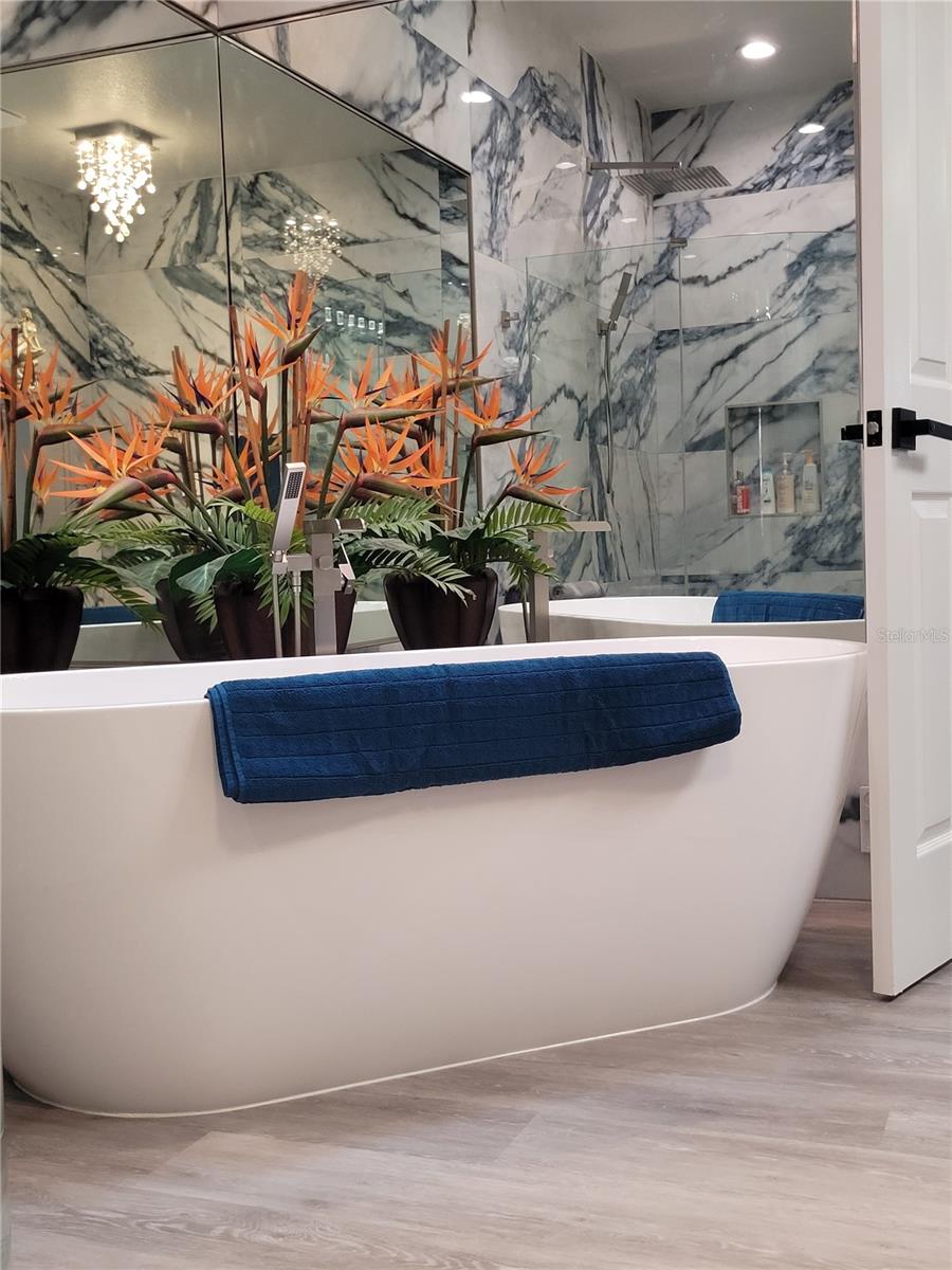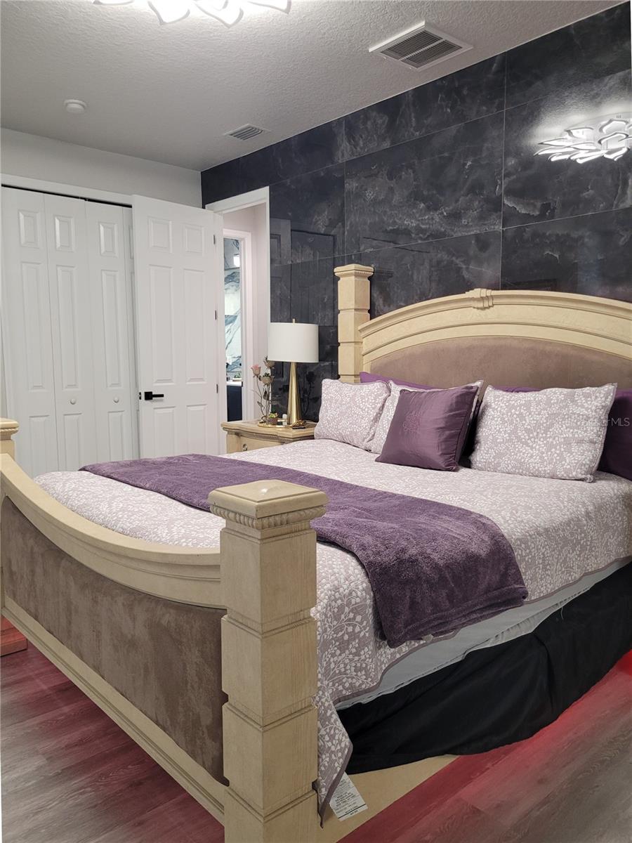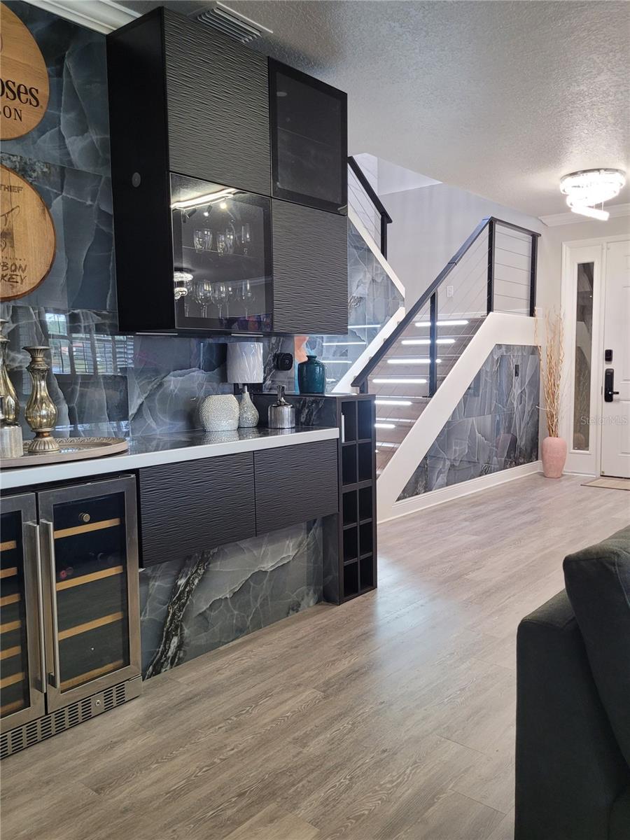 Truly turn-key ready. Experience resort-style, waterfront living in this beautifully updated two-story villa located in the exclusive Caliente Resort and Spa. Caliente Resort and Spa is a gated, clothing-optional resort community in Land O’ Lakes. Completely remodeled with striking designer finishes, this home offers a unique blend of luxury, style, and tranquil lakefront views. Step through the front door and you’re welcomed by dramatic design elements including custom marble tile accent walls and a modern industrial-style staircase highlighted with cascading motion-sensing LED lighting. The main level features a bright, open-concept layout that seamlessly connects the living room, dining area, and kitchen—perfect for both everyday living and entertaining. A custom-built bar anchors the living space, complete with marble accents, built-in storage, wine cabinetry, and a wine refrigerator, creating an ideal setting for hosting guests. The kitchen showcases sleek modern design with custom deep drawers, soft-close cabinetry, and premium appliances, including a Miele dishwasher and Samsung smart refrigerator and convection oven. Throughout the home, fresh Sherwin Williams paint, waterproof luxury vinyl plank flooring, and modern LED lighting add a clean, contemporary feel. Upstairs, the bedrooms and bathrooms have been fully transformed with marble walls, custom cabinetry, and upscale fixtures. The primary suite offers a spa-inspired retreat featuring an oversized rain shower and a freestanding soaking tub positioned beneath a skylight. Outdoor living is equally impressive. Take in peaceful lake views from the large screened lanai just off the living area, perfect for relaxing or entertaining while enjoying the water and fountain views. A private screened balcony off the primary bedroom provides another quiet space to unwind and enjoy the serene waterfront setting. Residents of Caliente Resort and Spa enjoy access to resort-style amenities including pools, tennis courts, a fitness center, spa services, restaurants, bars, live entertainment, and an active social calendar. Conveniently located near Tampa International Airport, shopping, golf courses, and Gulf Coast beaches, this exceptional villa offers a rare opportunity to enjoy luxury living in a vibrant resort setting. Furnishings may be available for purchase, making this a potential turnkey opportunity.