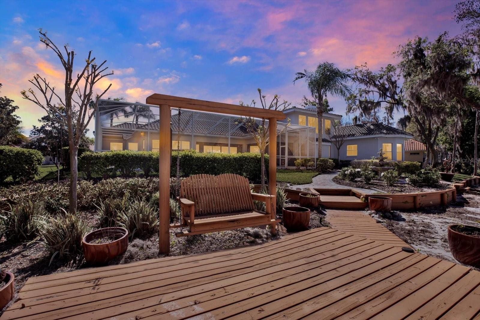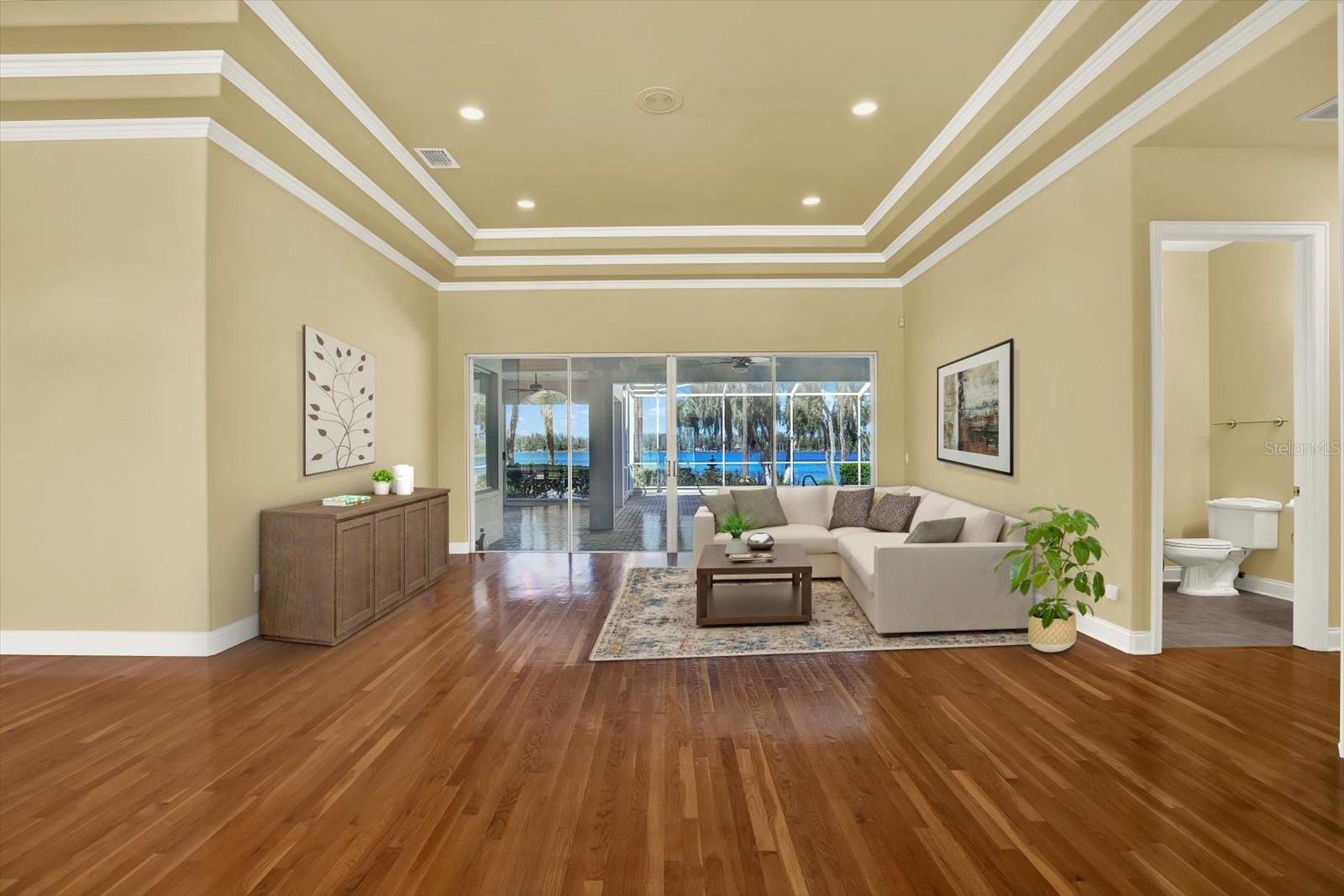 One or more photo(s) has been virtually staged. If you're looking for breathtaking sunsets and gorgeous lake scenery, look no further. Tucked into the back of a gated community, the Preserve at Lake Thomas, this remarkable home offers the perfect blend of privacy and natural beauty. With almost 180' of frontage on Lake Thomas, the panorama will not disappoint. The private dock includes two lifts, shaded seating, and even ladders to get in and out of the crystal clear spring-fed lake. Imagine spending your mornings sipping coffee on the dock, watching herons glide across the glassy water, or spending your afternoons carving across the lake on skis with friends. As the day winds down, the sandy beach and lakeside seating area become the perfect spot to soak up one of those legendary Florida sunsets. Arriving at the home, you're greeted by a grand circular driveway and a side-entry three-car garage, setting the tone for the elegance that awaits inside. The double door entryway opens into a bright, open dining and living room, where patio doors frame a stunning view of the lake beyond. To the right is a spacious office with floor-to-ceiling built-in bookshelves, a full pool bath, and the primary suite. From the primary bedroom, you'll wake up to breathtaking views of the pool and lake. The primary bathroom includes lots of natural light, expansive counter space, a jetted tub, and an oversized shower. To the left of the entryway is the open kitchen with breakfast space and snack bar, along with the family room and three bedrooms. The family room has open views of the lake, a fireplace, a built-in TV console, and sliding patio doors leading to the pool. At the back of the house is a generously sized bedroom, again framing gorgeous scenery of the lake, and a full bathroom. This area has a pocket slider and would serve wonderfully as an in-law suite. The other two bedrooms share a Jack and Jill bathroom, and both have walk-in closets and a bay window. Just off the kitchen, the spacious laundry room has a large closet, generous cabinet storage, and ample counter space. Upstairs, a spacious loft overlooks the family room, complete with a wet bar and even more waterfront scenery to take in. Outside, owners will take in the expansive screened pool area with a spillover heated spa and shaded areas for relaxing throughout the day. The grounds have been well thought out with a walking path to a seating area to soak up the sunsets and a sandy beach. This home encompasses two lots to enjoy the best scenery and privacy on this 165-acre ski lake.