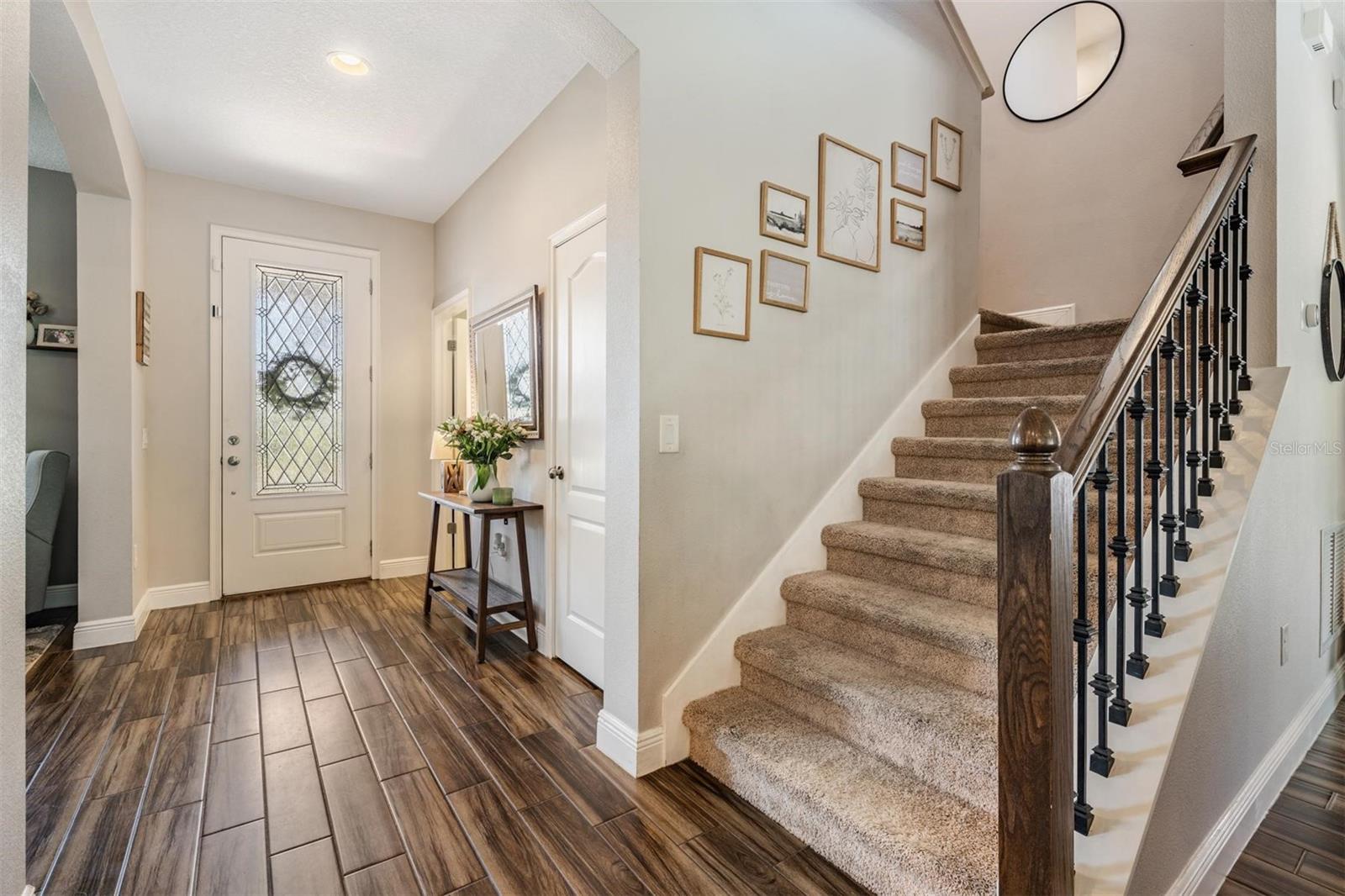 STUNNING POOL HOME ON CONSERVATION IN GUARD-GATED LAKESHORE RANCH! If you’ve been searching for privacy, space, and a true Florida lifestyle, this 5 bedroom, 3 bathroom pool home checks every box. Perfectly positioned on an oversized conservation homesite, you’ll enjoy peaceful conservation views with no rear neighbors and your own private backyard retreat. From the moment you walk through the leaded-glass front door, you’re welcomed by an open, light-filled floor plan with plank tile flooring and designer touches throughout. The kitchen is the heart of the home, featuring granite countertops, solid wood 42” cabinetry, gas range, subway tile backsplash, and a large island that flows seamlessly into the spacious family room, ideal for entertaining or everyday living. Step outside through triple sliders to your heated saltwater pool with sun shelf and pebble finish, surrounded by lush landscaping and complete privacy with additional yard space beyond the fenced area. Whether you’re hosting guests or unwinding at the end of the day, this outdoor space delivers. A first-floor bedroom with full bath and private outdoor access is perfect for guests, in-laws, or a home office. Upstairs, you’ll find generously sized bedrooms. The secondary bathroom has been updated with custom trim and a refinished dual vanity. A spacious primary suite with views of the conservation and pool features a large walk-in closet and updated bath featuring a frameless glass shower. Major updates already done for you: Interior paint (2025), AC (2023), hot water heater (2024), salt cell (2026), garage door (2023), fence (2021), custom wood trim around downstairs windows, custom shiplap accent wall, plus EV charging equipment in the garage and much more!! Located in the highly sought-after Lakeshore Ranch, enjoy resort-style amenities including a 24-hour guard gate, clubhouse, multiple pools, fitness center, playground, and more!! HOA covers cable, internet, and trash. This is the one buyers wait for, privacy, upgrades, and a move-in ready pool home in one of Land O’ Lakes’ most desirable communities.