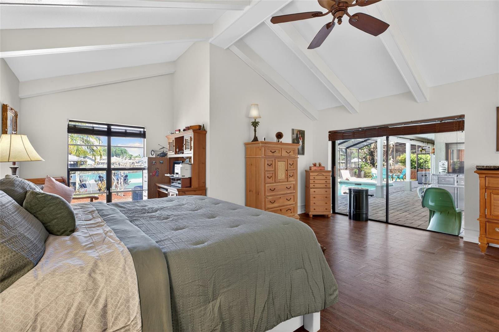Wake up to stunning sunrises and wide water views, and unwind each evening with breathtaking sunset reflections over Lake Saxon—this 4-bedroom, 4-bath lakefront pool home offers a Florida lifestyle that’s both rare and unforgettable. Tucked away on a quiet cul-de-sac with 97 feet of frontage on an 83-acre private ski lake, this 3,202-square-foot residence is designed for relaxed living and effortless entertaining. A paver driveway and walkway lead to double glass entry doors, opening into a striking foyer with decorative tile inlay, plantation shutters, and refined architectural details. Inside, vaulted ceilings with exposed beams, arched openings, and decorative columns with wood caps create a sense of timeless character throughout. The formal living room impresses with soaring ceilings, exposed beams, and a wet bar with granite countertops—an inviting space for gathering—while sliding glass doors open seamlessly to the outdoor living area. A separate formal dining room provides an elegant setting for entertaining, and the family room centers around a wood-burning fireplace with a wood mantle and custom shelving, offering warmth and comfort. The kitchen is a true showpiece—beautifully designed with tall cabinetry topped with crown molding, built-in pantries, granite countertops, and a tile backsplash accented by a decorative bridge over the sink. Recessed lighting enhances the custom feel, while the center island features a premium Viking cooktop with a vent hood and pendant lighting above. Custom wood paneling conceals the refrigerator and dishwasher for a refined, cohesive look. The U-shaped layout maximizes prep space, with windows overlooking the lanai and pool, creating a seamless connection to outdoor living. The primary suite is a private retreat with exposed beams, direct lanai access, a large walk-in closet plus an additional closet, and a spa-style bath completed in 2025. Dual vanities, a freestanding soaking tub, and a tiled walk-in shower with both rain and handheld fixtures create a space designed for relaxation. Outdoor living is where this home truly shines. The screened lanai features a fully equipped outdoor kitchen with a built-in propane grill, vent hood, and sink, all overlooking a large geometric pool and expansive paver deck. Beyond the screen enclosure, additional paver space extends the entertaining area—perfect for gathering and taking in the lakefront setting. A landscaped paver walkway leads to a private dock with electric davits, providing easy access to Lake Saxon for boating, water skiing, or simply enjoying the open water. Additional highlights include a 2022 roof, dual A/C systems (2019, serviced 2026), water heater (2025), composite deck (2025), pool pump (2023), resurfaced pool (2018), hurricane shutters, a laundry room with cabinets and sink, and an expanded driveway with a 2-car garage for extra parking. The home also features a dedicated pool bath, outdoor storage room, and attic space with standing room. Located in Lake Padgett Estates, residents enjoy exclusive access to multiple private lakes, including Lake Padgett, Lake Saxon, East Lake, and Lake Joyce, along with private parks, boat ramps, and picnic areas—all reserved for residents and their guests, with no HOA or CDD. This is more than a home—it’s a lakefront lifestyle defined by space, privacy, and the ability to enjoy every day like a getaway.