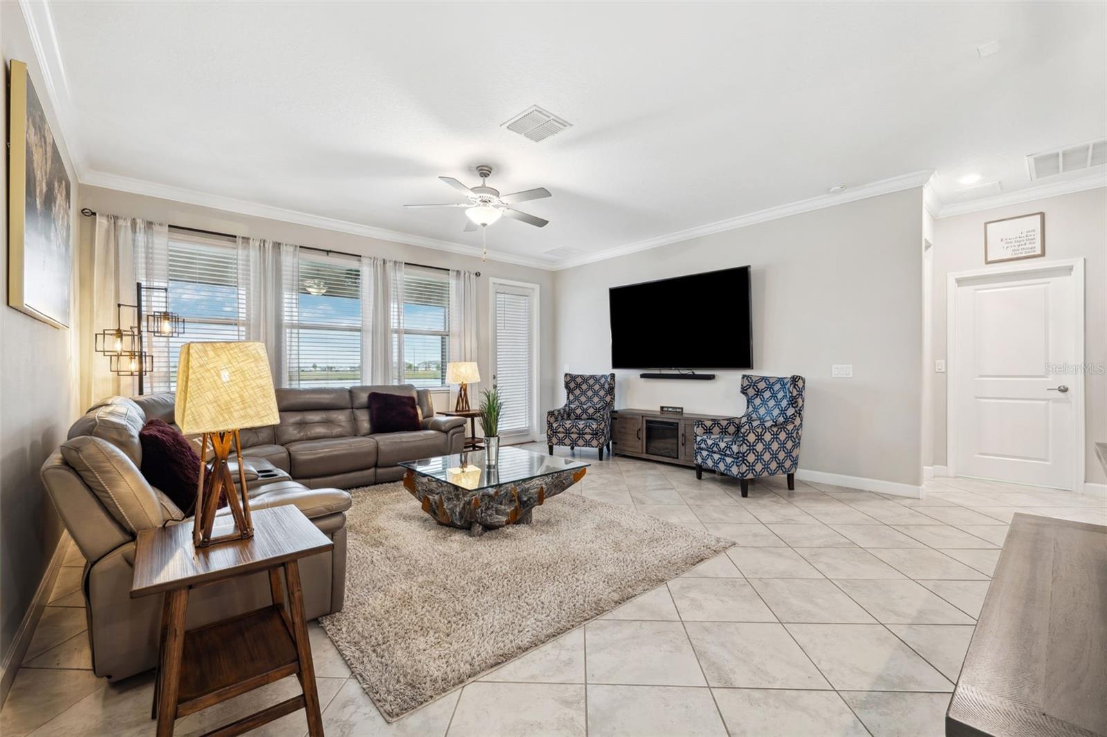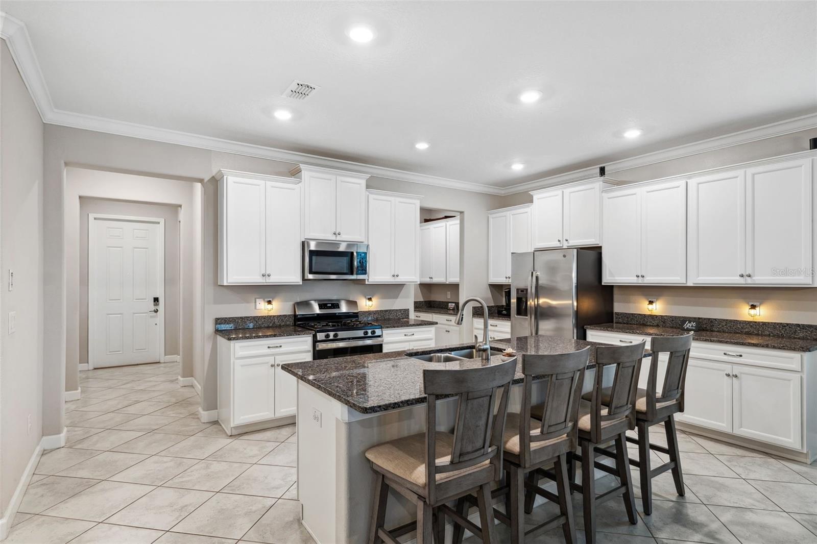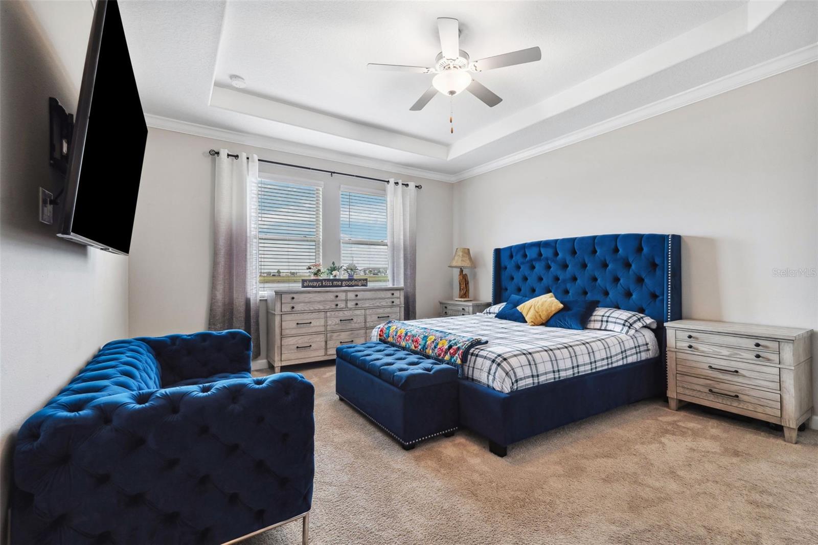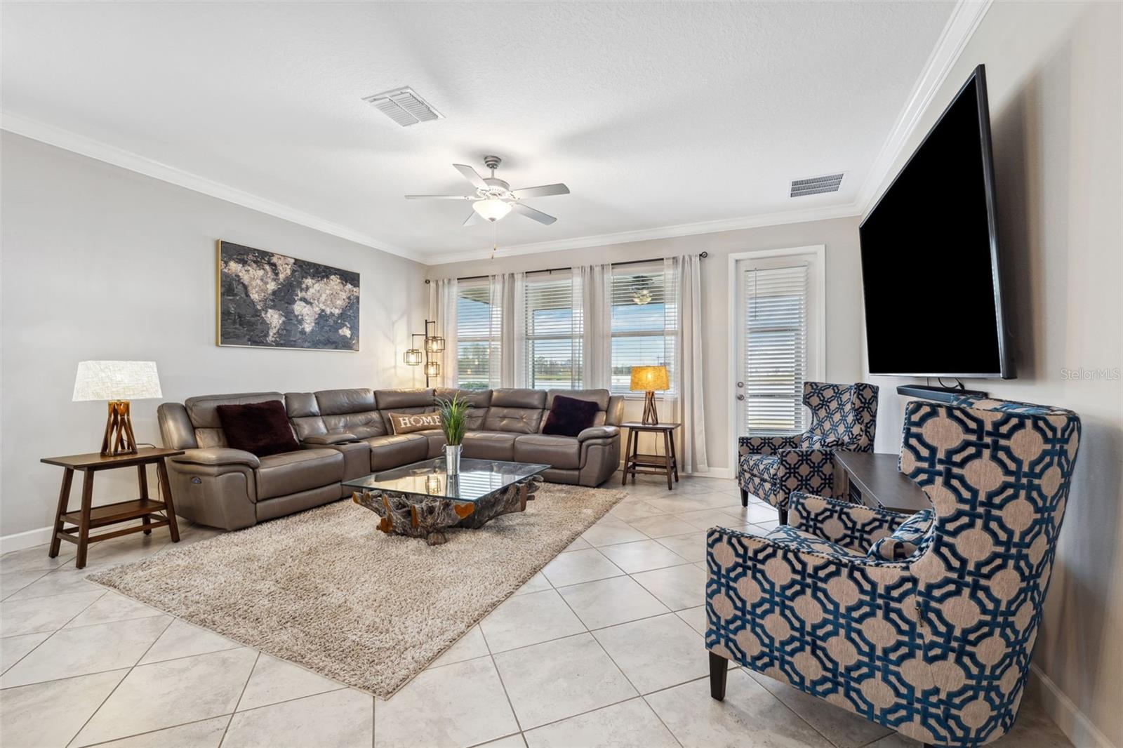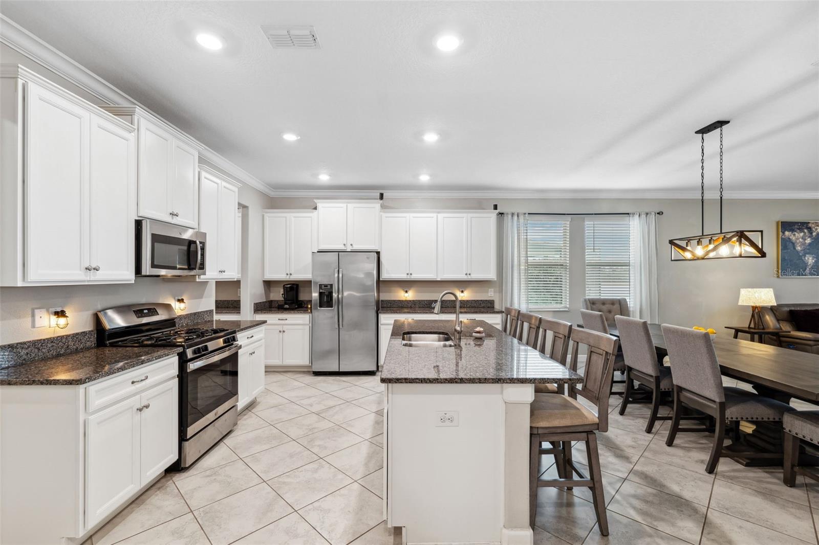 One or more photo(s) has been virtually staged. Why wait to build when you can fall in love with this dream home today? This spacious 5-bedroom residence (plus flex room and loft!) in Land O' Lakes' highly desirable Connerton community offers instant gratification and unparalleled living. Boasting 4 bathrooms and a 3-car tandem garage, this home radiates pride of ownership from its impressive curb appeal and inviting covered front porch. The versatile floorplan is perfect for any lifestyle. The first floor features a formal dining/flex space and an open-concept kitchen, a chef's delight with 42" staggered cabinets, crown molding, granite countertops, an island with bar seating, stainless steel appliances, a gas cooktop, butler's pantry, walk-in pantry, recessed lighting, and a casual dining area. The owner's retreat is a true sanctuary with a massive walk-in closet, dual sinks, a soaking tub, and a separate walk-in shower. Relax and enjoy stunning pond views from the screened lanai, complete with a built-in BBQ – ideal for Florida living! A half bath and drop-off zone provide added convenience. First-floor laundry hookups offer flexibility for a second laundry area or extra storage. Upstairs, a spacious loft is perfect for a theater room, game room, homeschool area, or library. Four generously sized bedrooms and two full baths, each with dual vanities, complete the second floor. A fully equipped laundry room with washer, dryer, and cabinets is also located upstairs. Extras include a tankless water heater, irrigation system (reclaimed water), ceiling fans, a Wi-Fi garage opener, a video doorbell, window blinds, and crown molding. Residents enjoy an unparalleled lifestyle with access to a 10,000 Sq Ft Clubhouse, complete with a café, state-of-the-art fitness center, lap-pool, and a resort-style pool featuring a thrilling waterslide. Additional amenities include nature trails, sports courts (Volleyball, Tennis, and Basketball), & more. A second Clubhouse, currently under construction, will further enhance the community with another resort pool, fitness center, and six pickleball courts. Plus, Connerton is a Golf-Cart-Friendly Community. Don't miss out – schedule your appointment today!