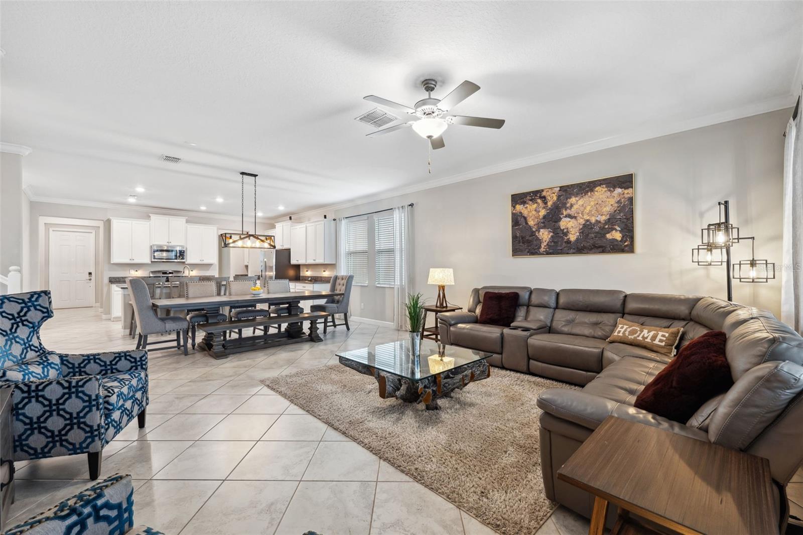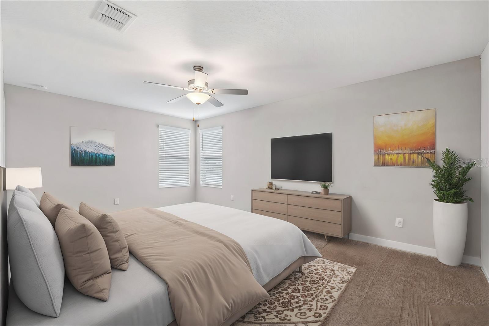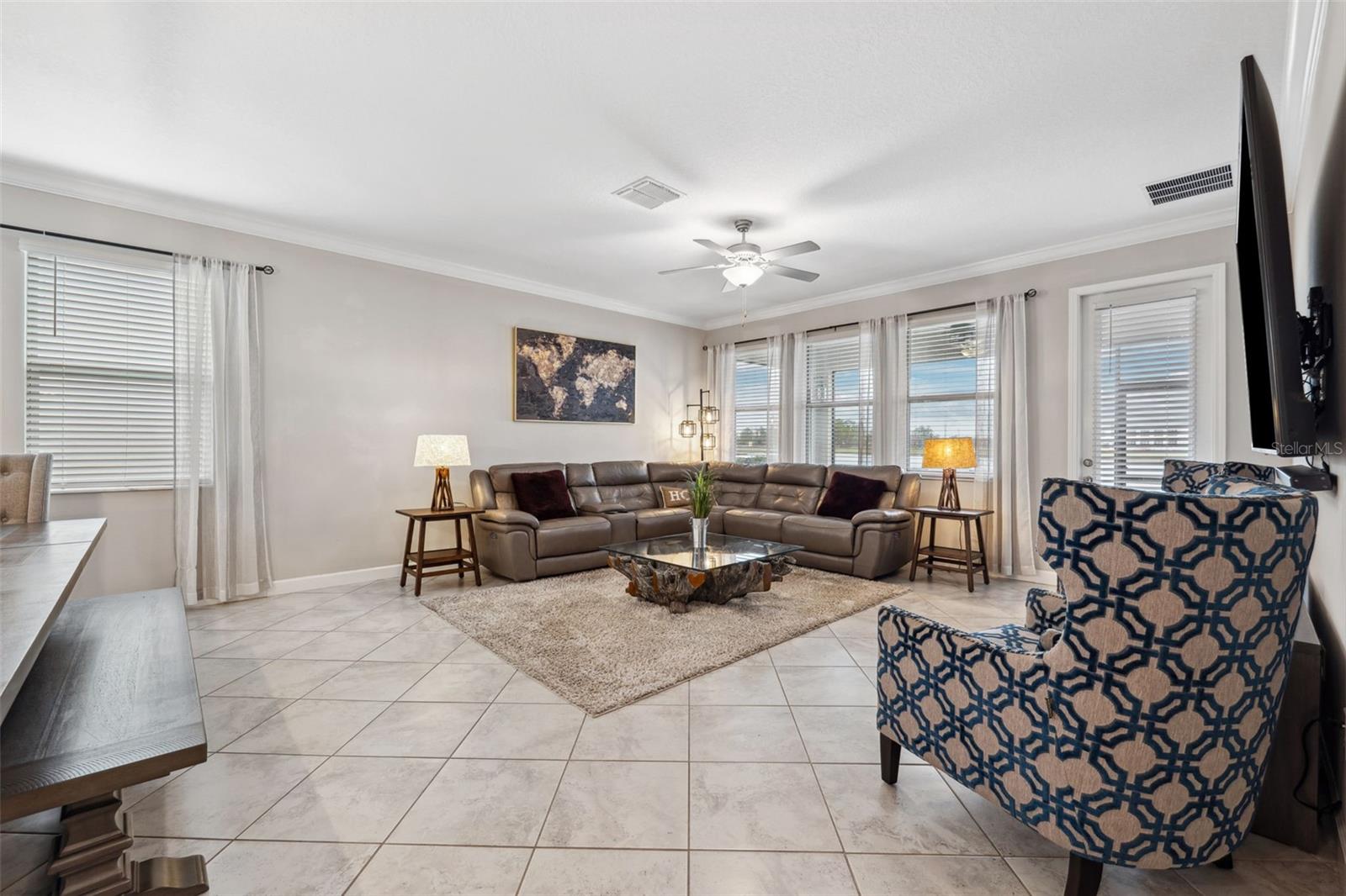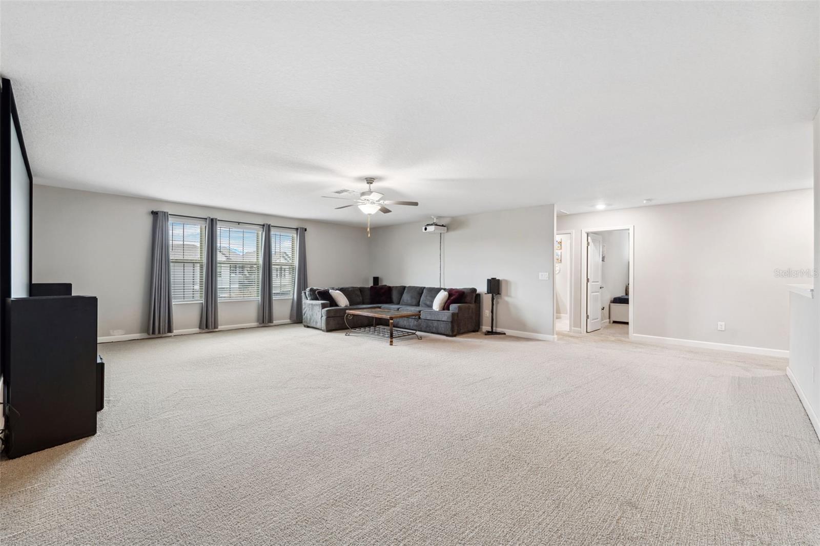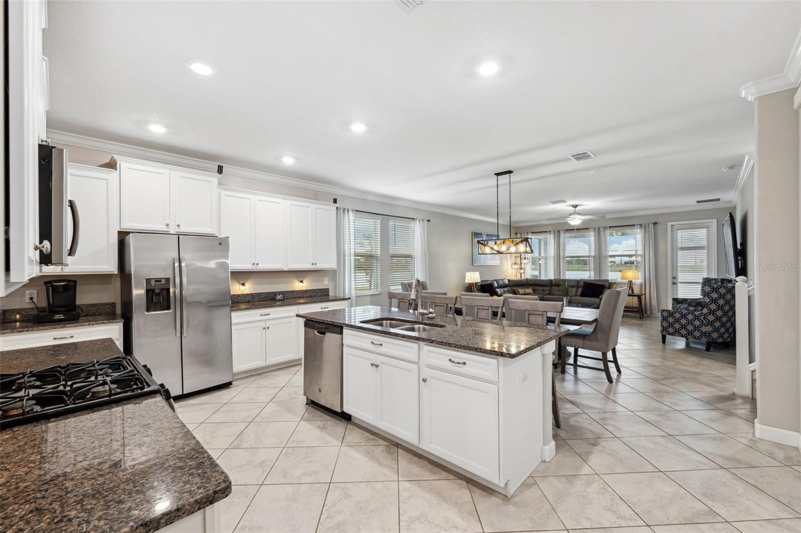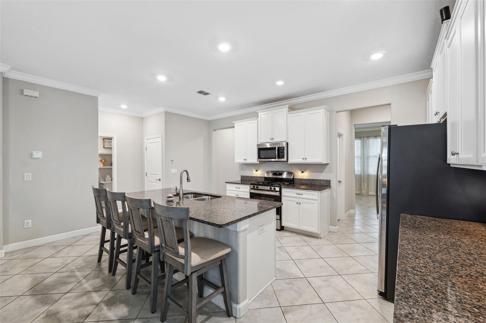One or more photo(s) has been virtually staged. Why wait to build when you can fall in love with this dream home today? This spacious 5-bedroom residence (plus flex room and loft!) in Land O' Lakes' highly desirable Connerton community offers instant gratification and unparalleled living. Boasting 4 bathrooms and a 3-car tandem garage, this home radiates pride of ownership from its impressive curb appeal and inviting covered front porch. The versatile floorplan is perfect for any lifestyle. The first floor features a formal dining/flex space and an open-concept kitchen, a chef's delight with 42" staggered cabinets, crown molding, granite countertops, an island with bar seating, stainless steel appliances, a gas cooktop, butler's pantry, walk-in pantry, recessed lighting, and a casual dining area. The owner's retreat is a true sanctuary with a massive walk-in closet, dual sinks, a soaking tub, and a separate walk-in shower. Relax and enjoy stunning pond views from the screened lanai, complete with a built-in BBQ – ideal for Florida living! A half bath and drop-off zone provide added convenience. First-floor laundry hookups offer flexibility for a second laundry area or extra storage. Upstairs, a spacious loft is perfect for a theater room, game room, homeschool area, or library. Four generously sized bedrooms and two full baths, each with dual vanities, complete the second floor. A fully equipped laundry room with washer, dryer, and cabinets is also located upstairs. Extras include a tankless water heater, irrigation system (reclaimed water), ceiling fans, a Wi-Fi garage opener, a video doorbell, window blinds, and crown molding. Residents enjoy an unparalleled lifestyle with access to a 10,000 Sq Ft Clubhouse, complete with a café, state-of-the-art fitness center, lap-pool, and a resort-style pool featuring a thrilling waterslide. Additional amenities include nature trails, sports courts (Volleyball, Tennis, and Basketball), & more. A second Clubhouse, currently under construction, will further enhance the community with another resort pool, fitness center, and six pickleball courts. Plus, Connerton is a Golf-Cart-Friendly Community. Don't miss out – schedule your appointment today!
