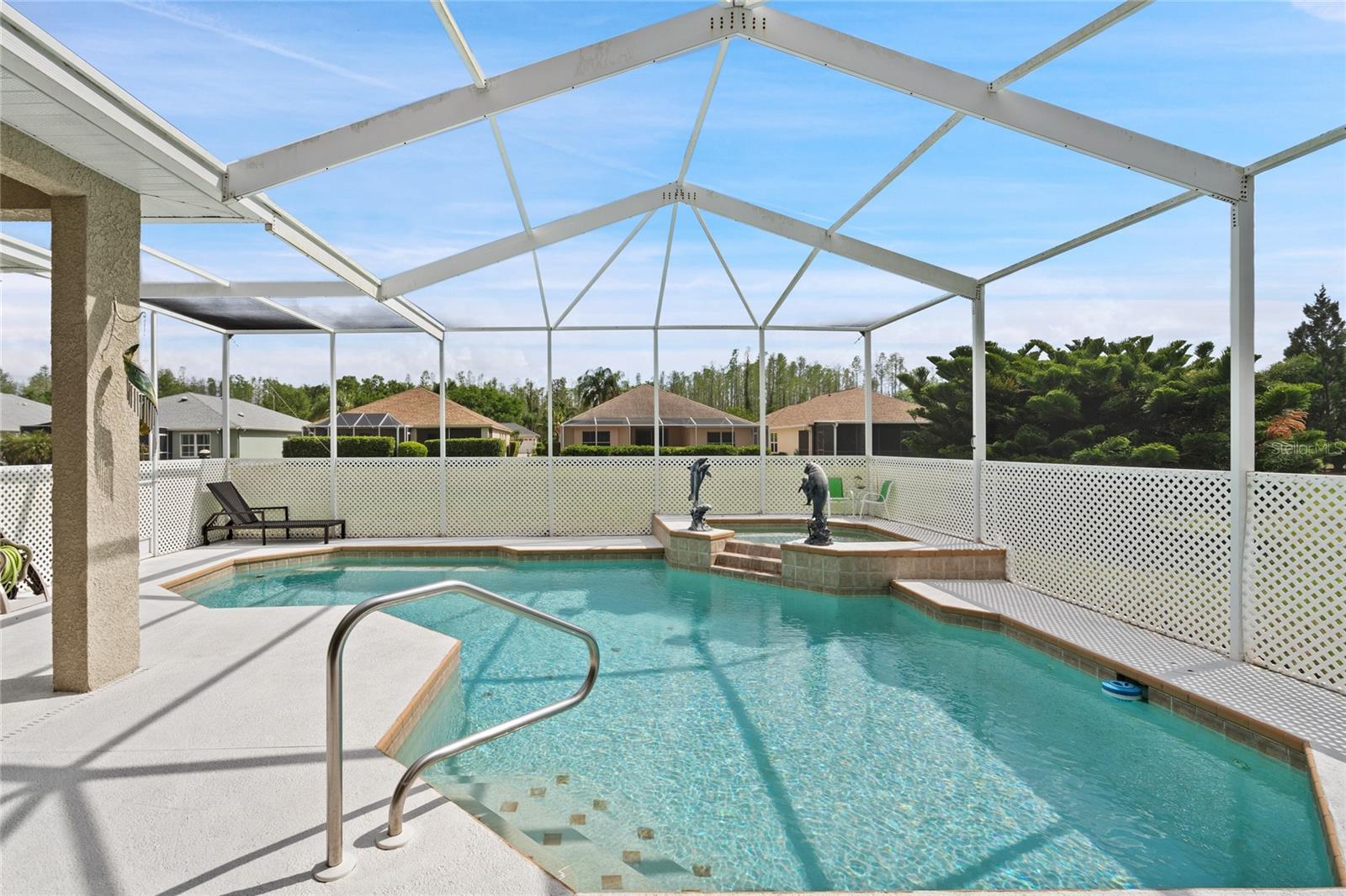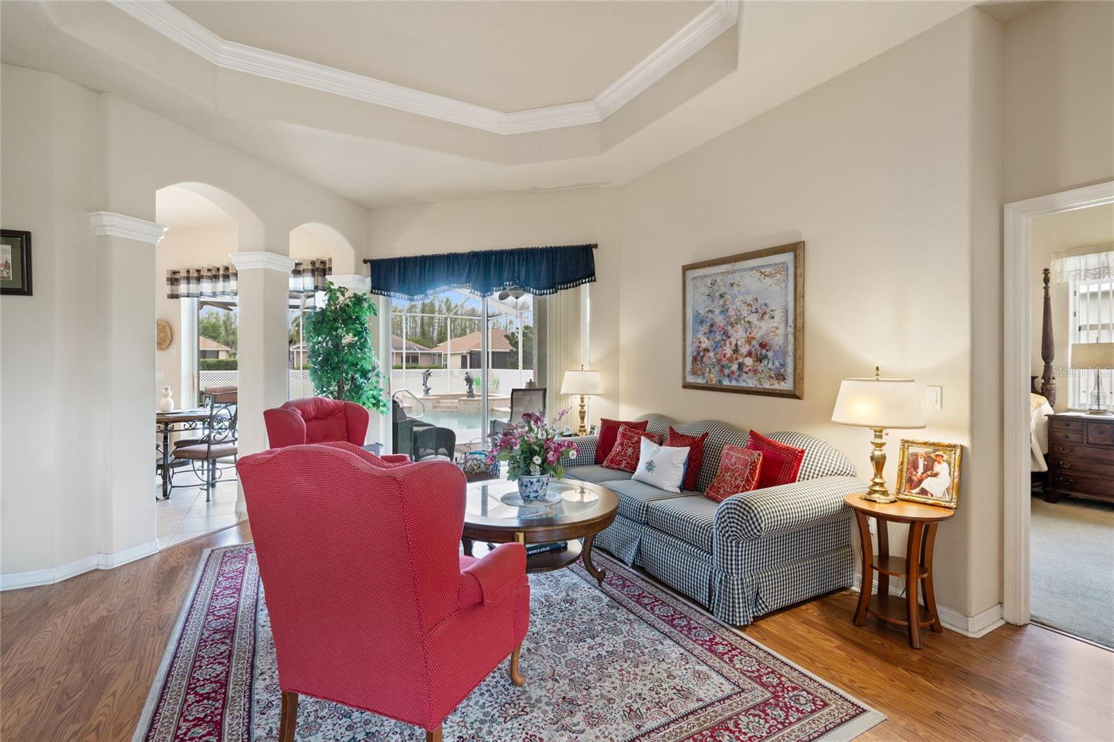 PRICE REDUCTION OPPORTUNITY. NEW ROOF IN JANUAUY 2025 BEAUTIFUL CUSTOM BUILT ESTATE POOL HOME WITH 4 bedrooms, 3 baths, office-den and a 3 Car garage, located in an active adult gated Golf Course Community "THE GROVES". This home offers a perfect blend of elegance and functionality. Relax in your heated Private Pool and Spa. Lanai area is large and screened with light and inviting painted floor. Enter the home through double front doors into formal living room with tray ceiling and crown molding. Formal dining room is off to the left. Enter into the Large Family room and Kitchen with eating area. 3 sliding doors over look the pool area. Kitchen has corian counter tops, double sink, breakfast bar, large work area and walk in pantry. Master bedroom has sliding glass doors out to pool, walk in closet huge bathroom with soaker tub and walk in shower just remodeled. Private Pool Bath and guest bedroom off the back of family room. THIS HOME IS A MUST SEE. CALL TODAY FOR A PRIVATE SHOWING. The Groves has an 18 hole Golf Course, including clubhouse, restaurant, ballroom, library, pro shop, fitness center, pool and spa, tennis courts, bocce and shuffleboard. Right outside the gates is a Publix Shopping Center.