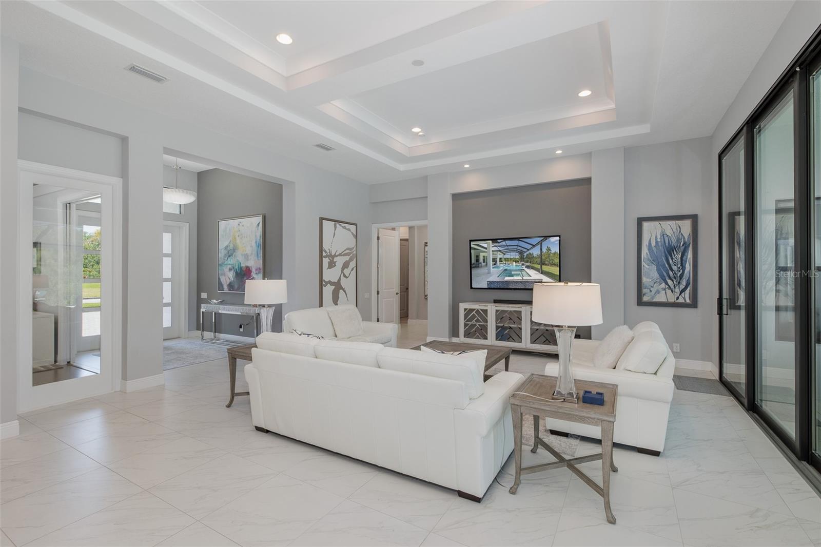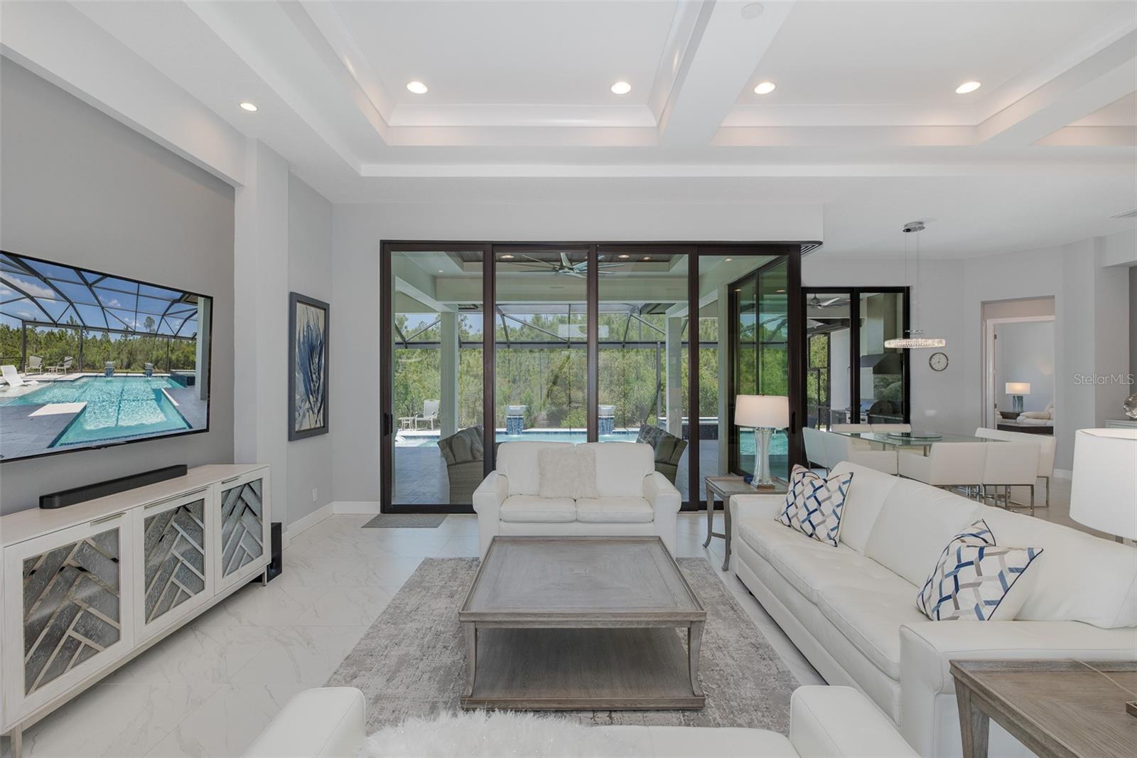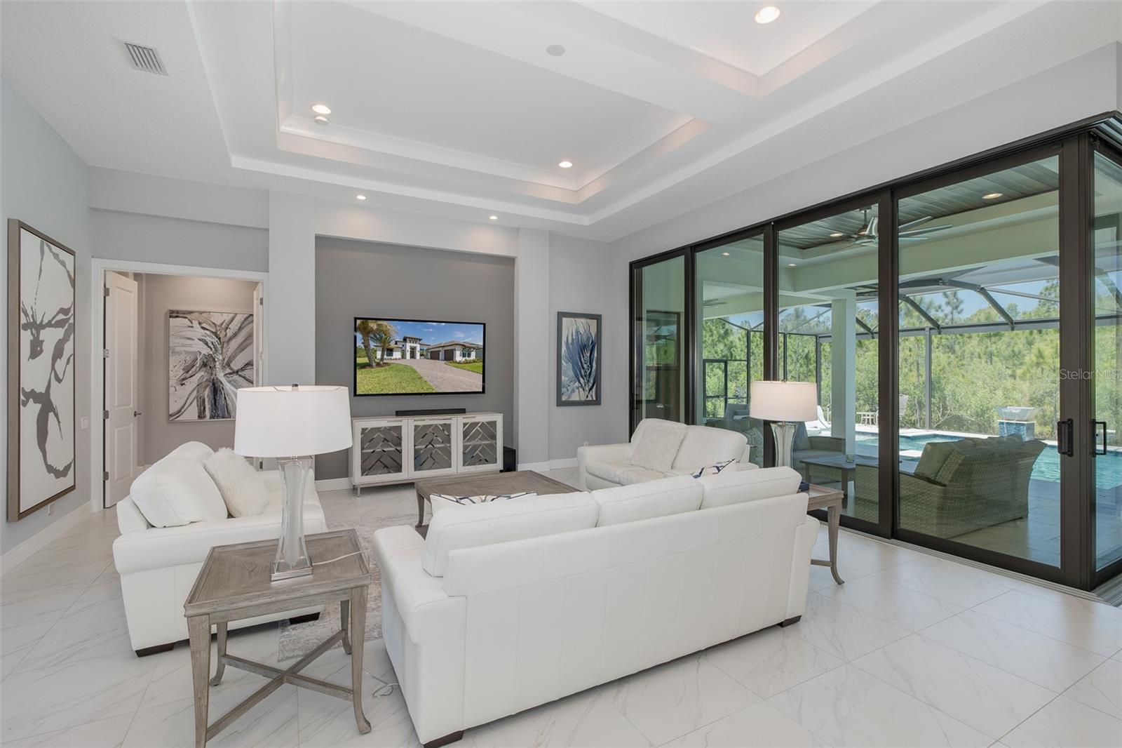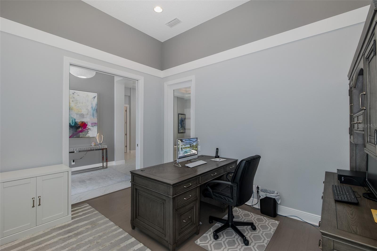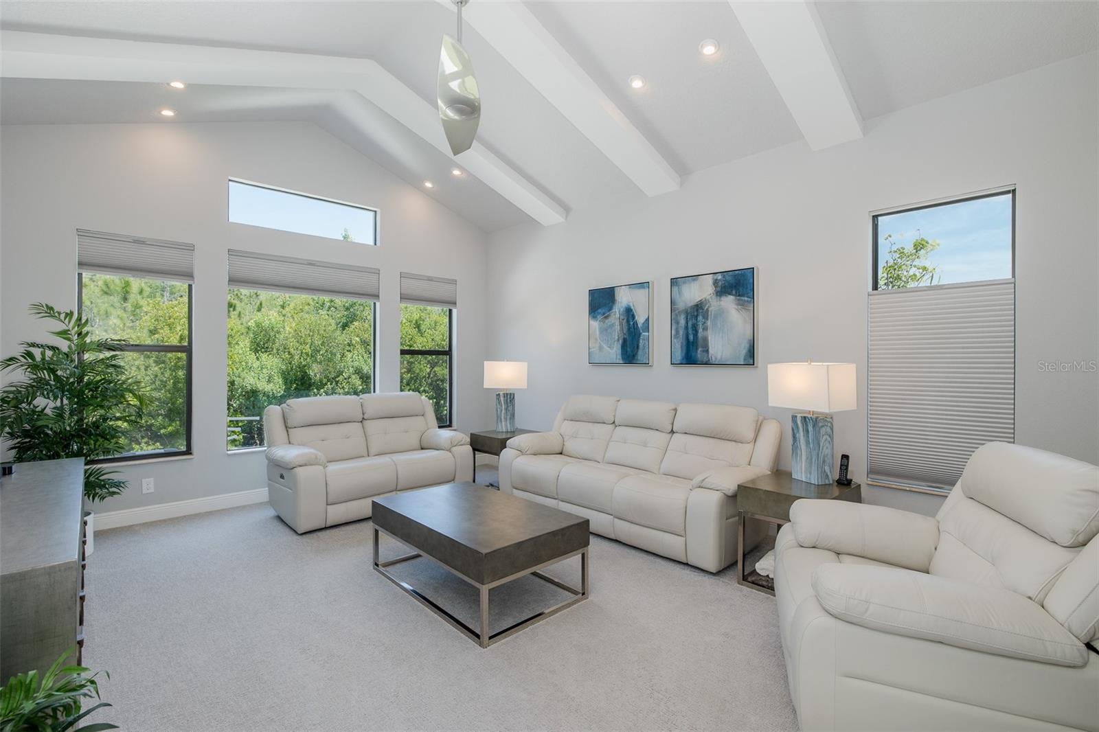 Luxurious Custom-Built AR Homes Retreat on Private Conservation Lot Tucked away on a serene cul-de-sac and backing to peaceful conservation and pond views, this stunning custom-built AR Homes residence offers the ultimate in privacy, luxury, and thoughtful design. Boasting 3 spacious bedrooms, 3 full bathrooms, a versatile bonus room, and a dedicated office/den, this home seamlessly blends elegance and comfort. Step inside to soaring custom ceilings with rich wood accents, beautifully designed tile flooring, and striking custom lighting that enhances every detail. The heart of the home features a gourmet kitchen with sleek quartz countertops, top-tier cabinetry, and designer finishes throughout. The pampering owner’s suite is a true retreat with dual custom walk-in closets, a spa-like bath including an oversized walk-in shower, a relaxing soaking tub, and custom vanities that elevate everyday living to include a Seura Hydra waterproof in wall T.V. A guest bedroom enjoys its own en suite bath, perfect for visitors or multigenerational living. Function meets style in the expansive laundry room with a huge walk-in closet and built-in mudroom space just off the generous 3-car garage. Step outside to your private oasis—a sprawling screened lanai with elegant travertine floors, lush landscaping, and a sparkling custom pool with sun shelf and spill-over bowls, all perfectly framed by serene pond and conservation views. Enjoy the custom summer kitchen complete with custom hood & gleaming granite or enjoy relaxing by the custom gas fire-pit. This exceptional property offers peace, privacy, and a truly elevated lifestyle. Don’t miss your opportunity to own a custom-crafted masterpiece in one of the most desirable settings available. This fabulous home boasts many recents upgrades: new sod, upgraded landscaping, fresh mulch, all new lights/fans throughout, reclaimed water for irrigation, wood ceiling on lanai, custom closet organizers, gas pool heater & so much more! Enjoy all that BEXLEY has to offer its residents: resort-style amenities just a short walk or golf cart ride away. Enjoy the clubhouse with an on-site café, 3 swimming pools, fitness center, game room, walking trails, dog park, bike park, & sports fields. Top-rated Bexley Elementary is within the neighborhood, along with the Bexley Hub, featuring restaurants, a bar, nail salon, and services surrounding a green space for outdoor gatherings. Located on SR 54, just off the Parkway with easy access to Tampa International Airport & downtown Tampa and a short drive to beautiful local beaches! Perfection!