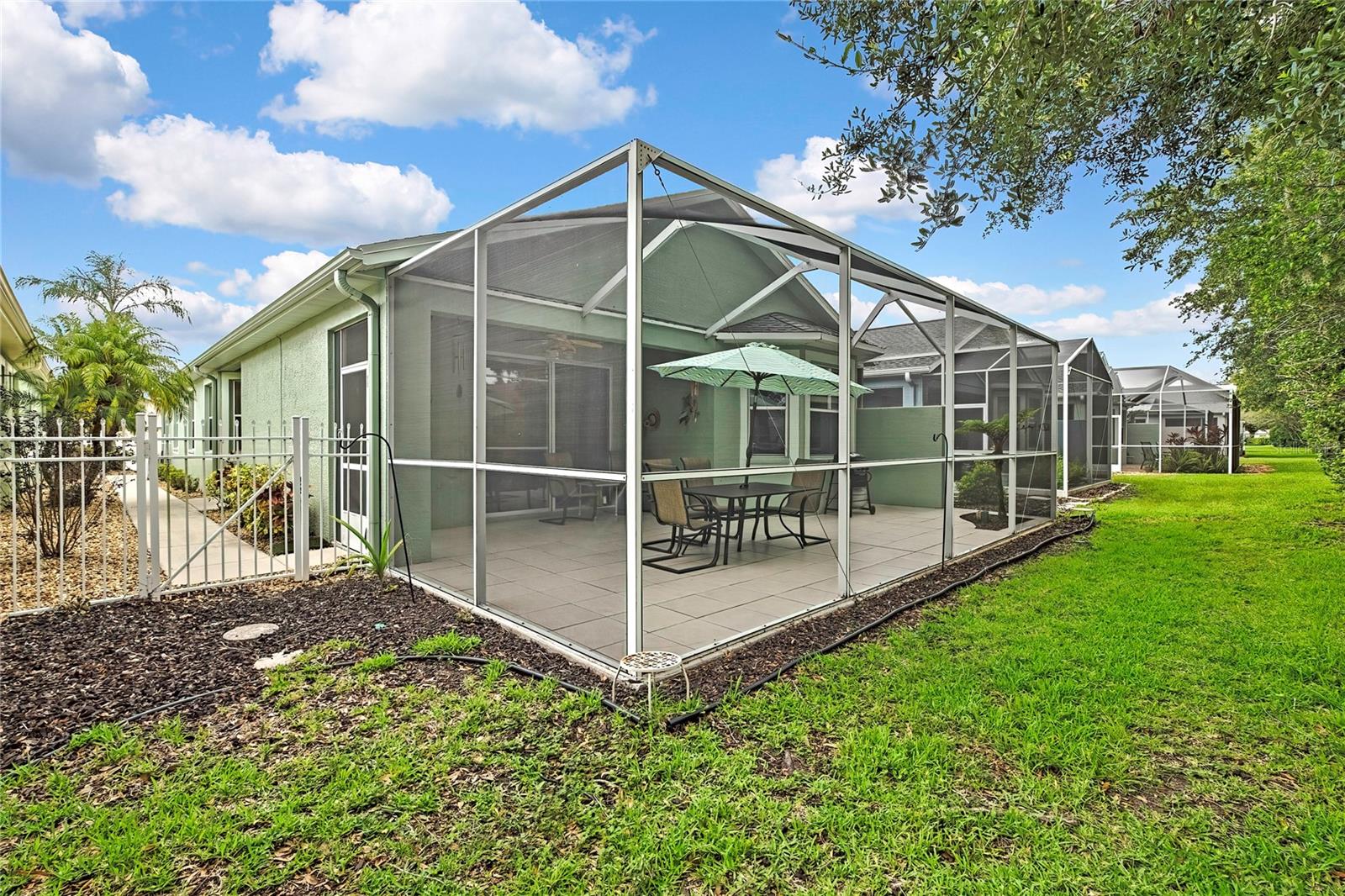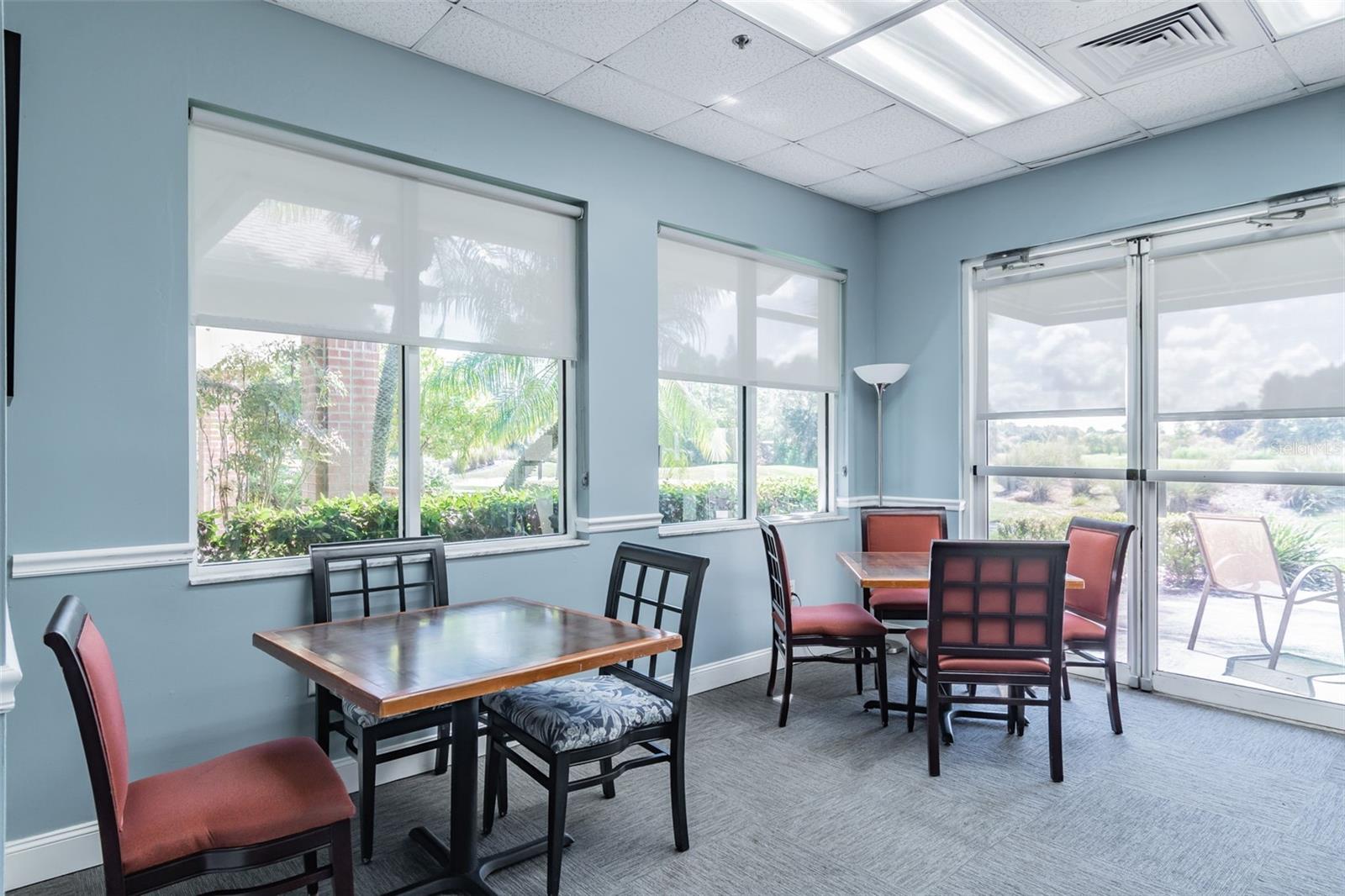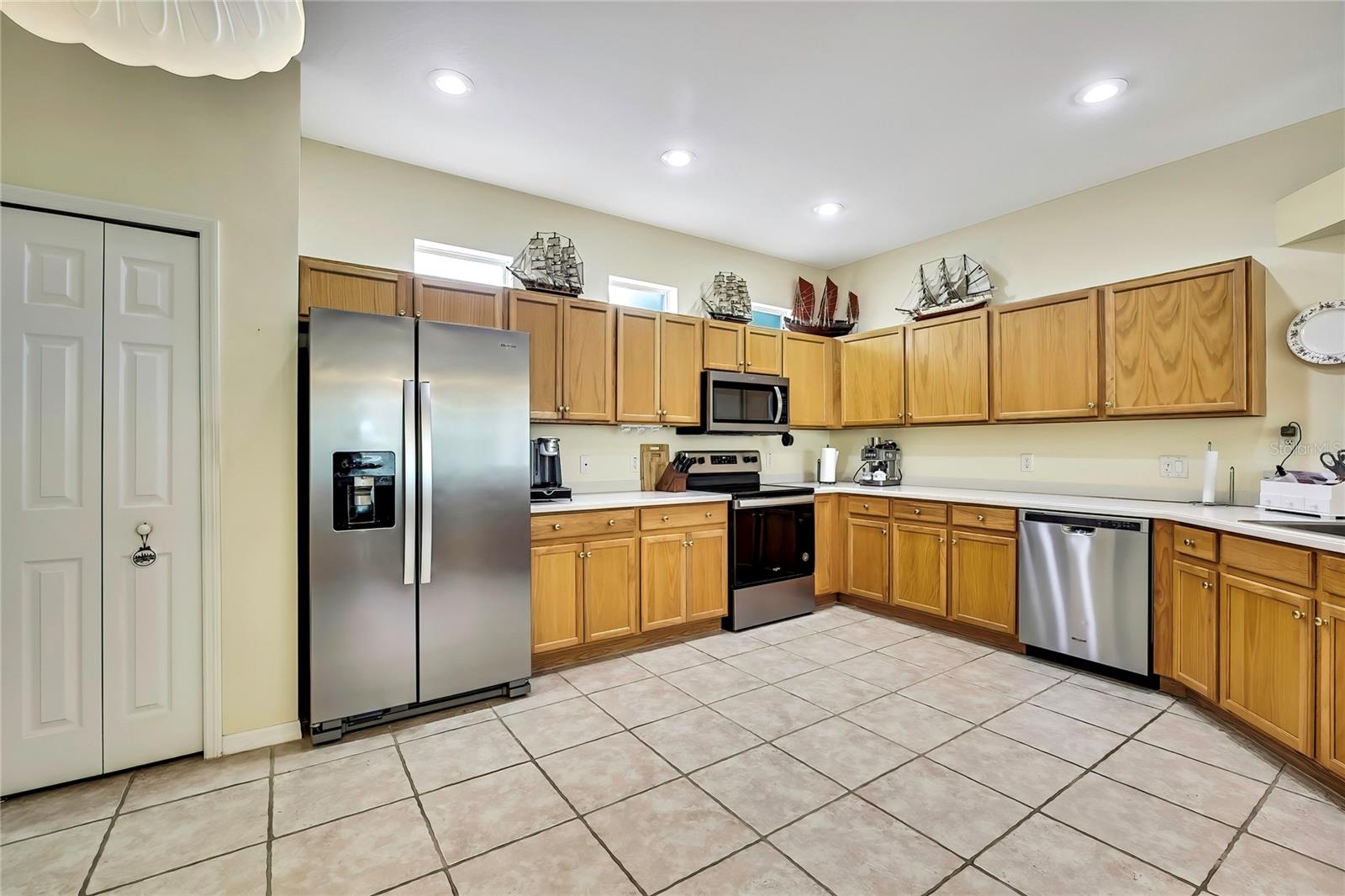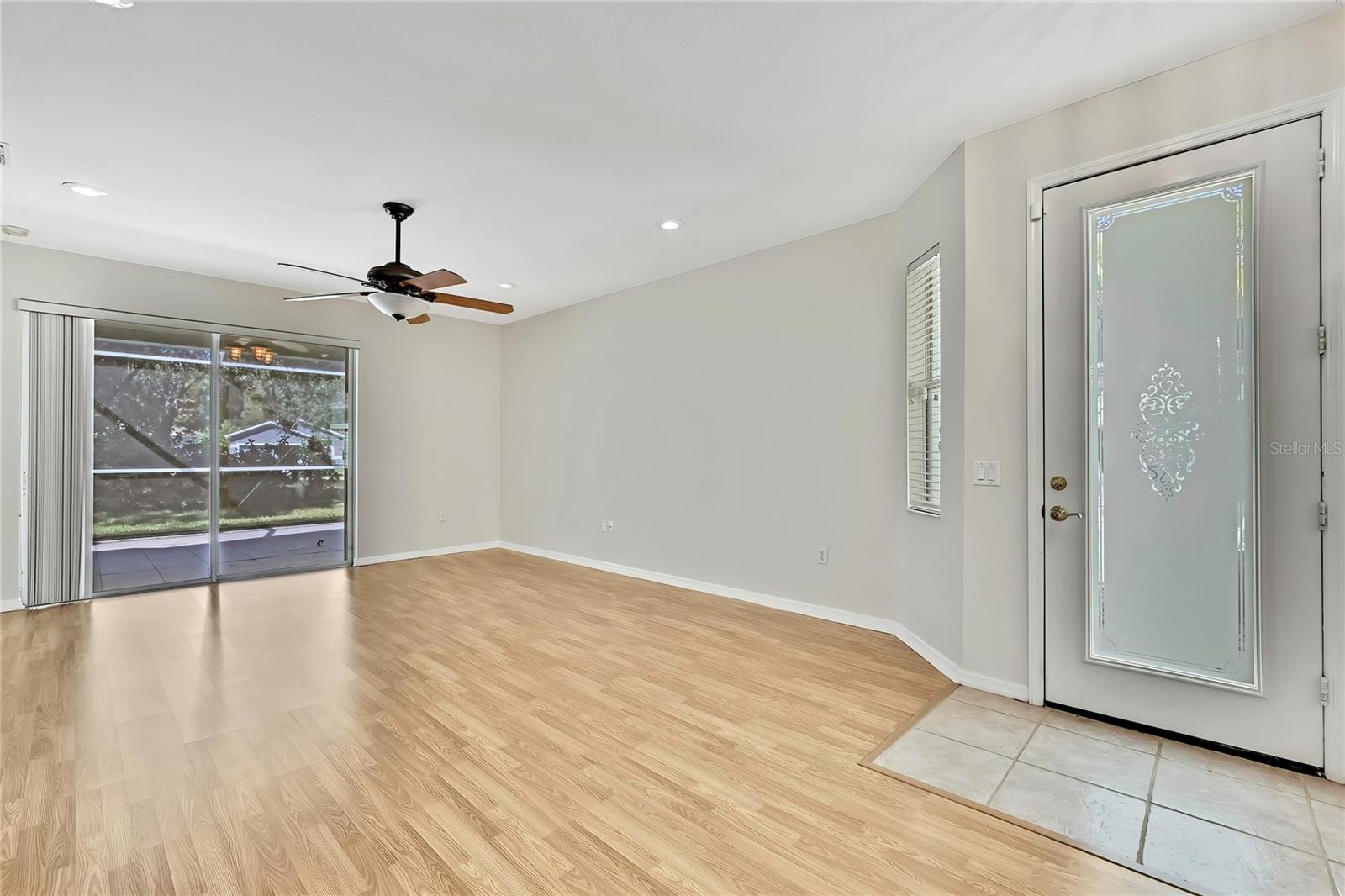 NEW IMPROVED PRICE! Welcome to this warm and lovely home situated on a Cul de Sac with no through traffic. The Groves Golf & Country Club is an active 55+, Gated, Retirement Community. With almost 1700 sq ft, 3 bedrooms, 2 baths, 2 car garage and a GOLF CART GARAGE and a large, screened lanai. Living Room/Dining Room, Master Bedroom Suite have been freshly painted! Warm Laminate flooring through-out the home and Ceramic tile in Kitchen and Bathrooms. Kitchen has Stainless Steel appliances (2022), Corian Countertops and solid wood Cabinets. Trey ceiling in the Dining Room with a beautiful chandelier, sliding glass doors in the living room leading to a large Lanai. Master Bedroom has laminate flooring, Bay window and Ensuite bath with ceramic tile, double vanity, walk-in shower, and oversized walk-in closet. Guest bedrooms are roomy, light and bright with double closets. Inside laundry room with washer and dryer. HOA fee includes NEW ROOF every 15-17 years (Replaced 2021), EXTERIOR PAINT every 7-10 years (2024), Spectrum Internet and TV and Lawn Mowing. Air Conditioner 2018, Stainless Steel Appliances 2022. The Groves is a small and friendly community with 755 homes, with many amenities. 18-hole golf course (rated #1 short course in Tampa Bay), well stocked pro shop, aqua range, clubhouse with a fitness room, library and craft room. Dog park for your furry friends. Many activities in the clubhouse include Karaoke, Trivia, Bingo, Cards, Games. On site Restaurant/Bar. Many clubs to join: Vibrant social club and travel club, community pool, tennis/pickle ball courts, bocce, shuffleboard. Short golf cart ride through the gate and you are at Publix Plaza with restaurants, nail/hair salons, ice cream parlor, dentist, bank. Short 30 min drive to TPA and the Gulf Beaches and an hour away from Orlando!