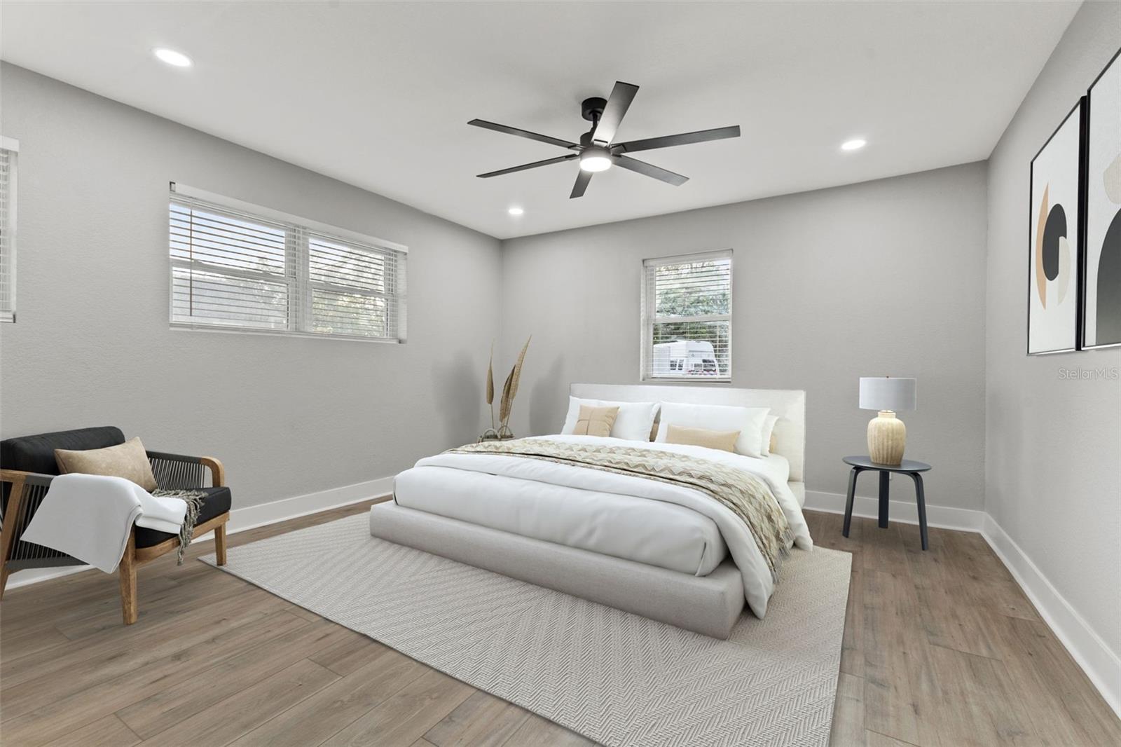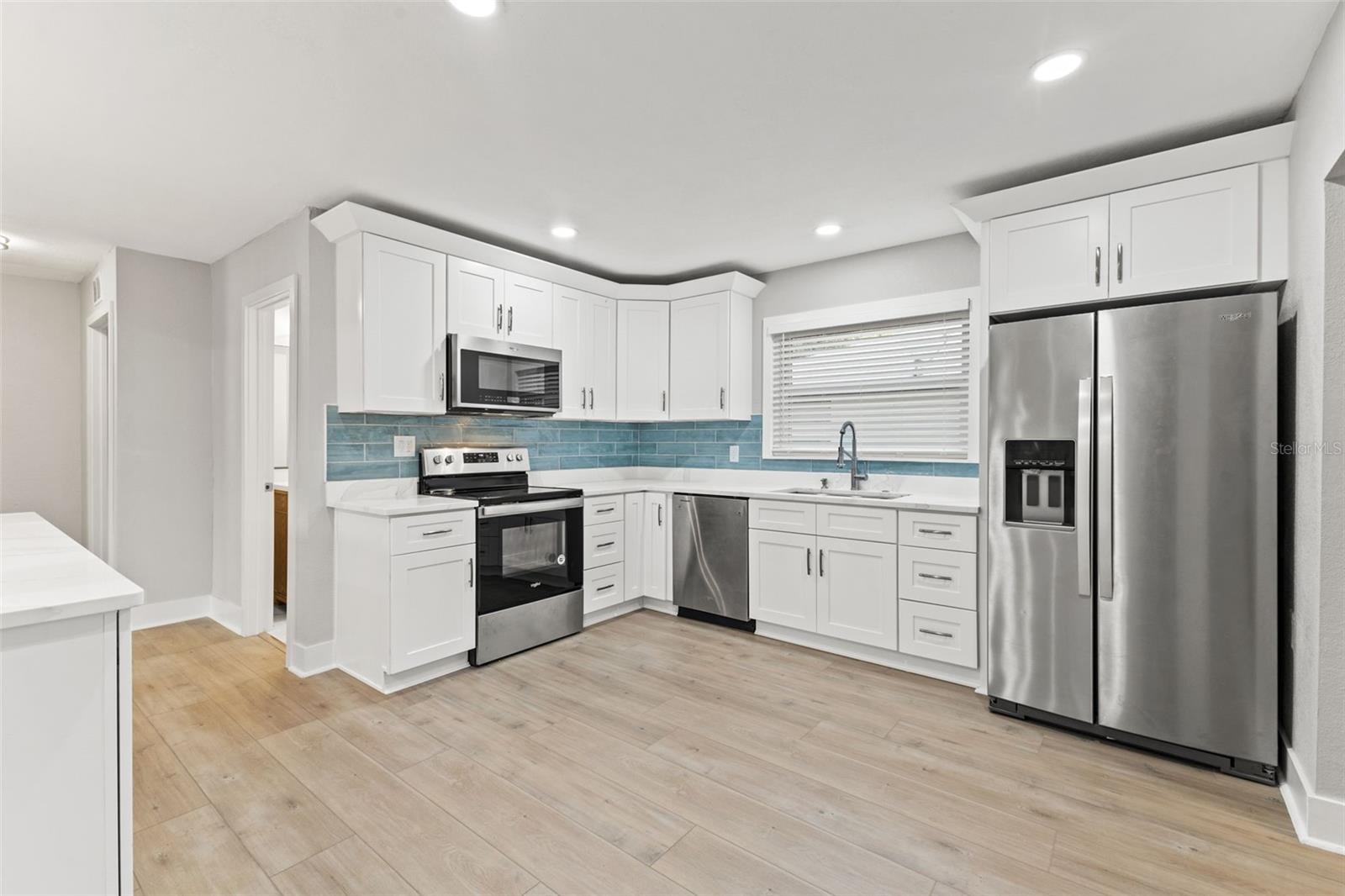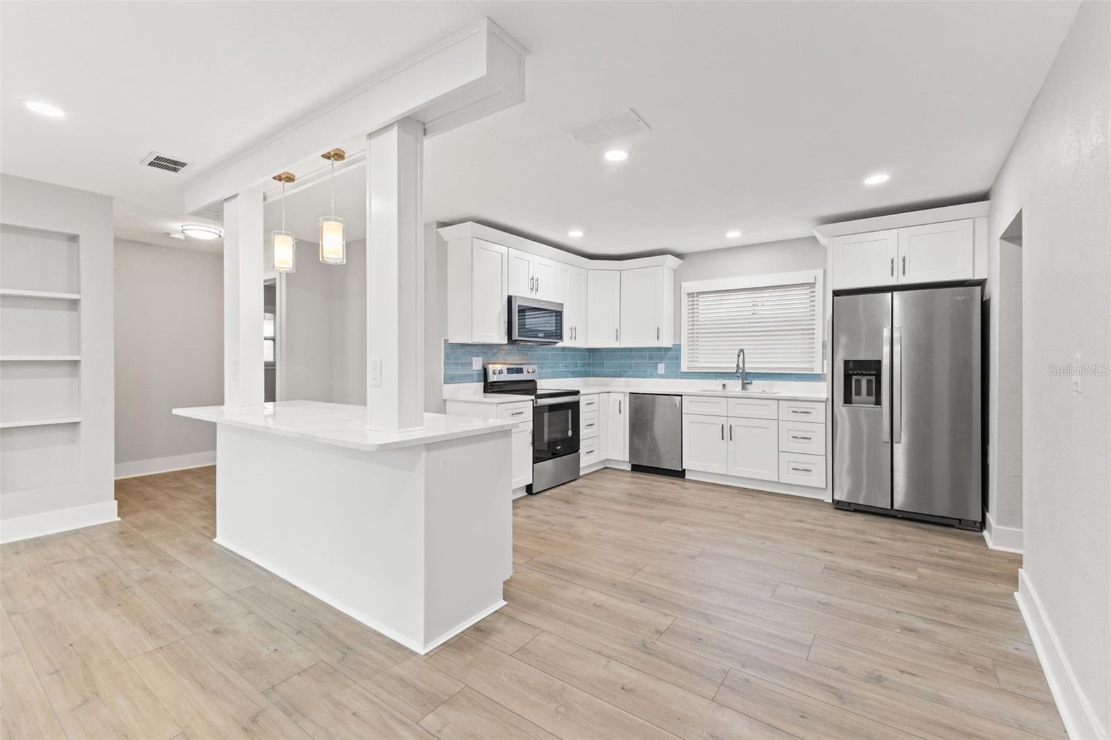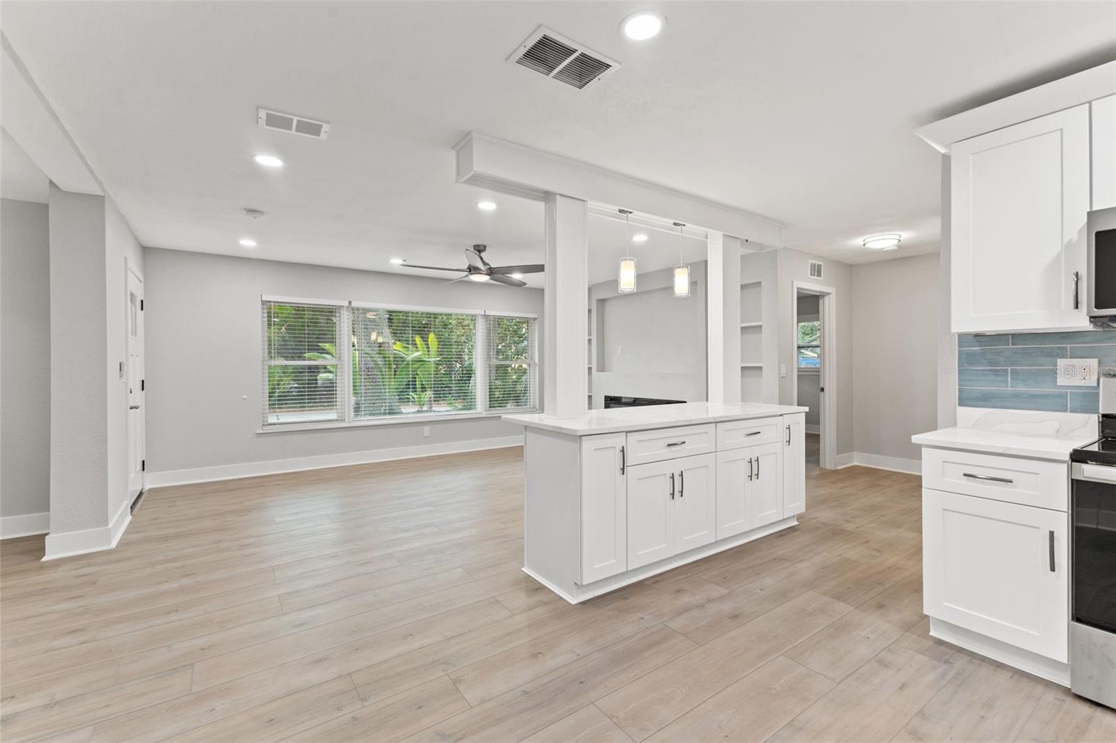 One or more photo(s) has been virtually staged. Welcome to this exquisite, completely remodeled home, perfectly situated on a coveted corner lot. This residence is a harmonious blend of modern design and functional elegance, showcasing an open concept layout that invites natural light and enhances the flow of space. As you step inside, you're greeted by beautiful fixtures that adorn every room, highlighting the meticulous attention to detail that defines this home. The spacious living area seamlessly connects to the dining and kitchen spaces, making it ideal for both entertaining and everyday living. Premium waterproof luxury vinyl plank (LVP) flooring flows throughout the entire home, providing durability and style without a hint of carpet. The chef’s kitchen is a true masterpiece, featuring stunning crown molding on the cabinets that adds an element of sophistication. Equipped with top-of-the-line appliances and generous counter space, this kitchen is as functional as it is beautiful. Retreat to the oversized primary suite, a private haven complete with its own entrance, ensuring a sense of tranquility and seclusion. The ensuite bathroom boasts luxurious finishes and ample space, creating a spa-like atmosphere that you will love returning to at the end of the day. Additional highlights include modern ceiling fans in key living areas, enhancing comfort and style throughout the home. The fully fenced backyard offers a safe and serene outdoor space, perfect for gatherings, gardening, or simply enjoying the fresh air. With an RV cable hookup available, this property is perfect for adventurers and outdoor enthusiasts. This remarkable corner lot home is a rare find, combining contemporary upgrades with thoughtful design elements, all in a prime location. Non flood zone, block construction, no hurricane damage, and only 4 miles to Clearwater Beach. Don’t miss your chance to own a piece of luxury living – schedule your private tour today!