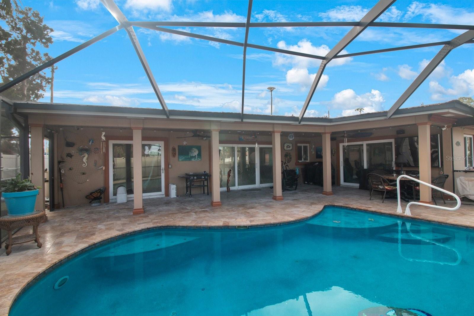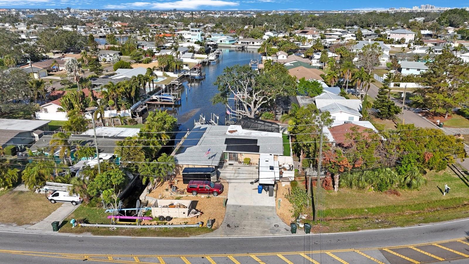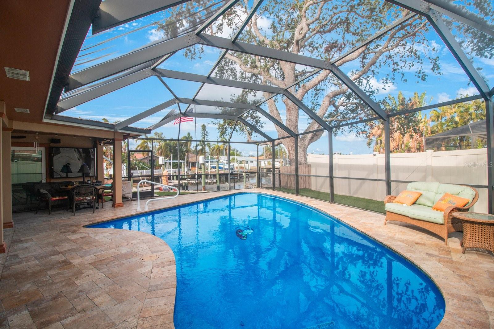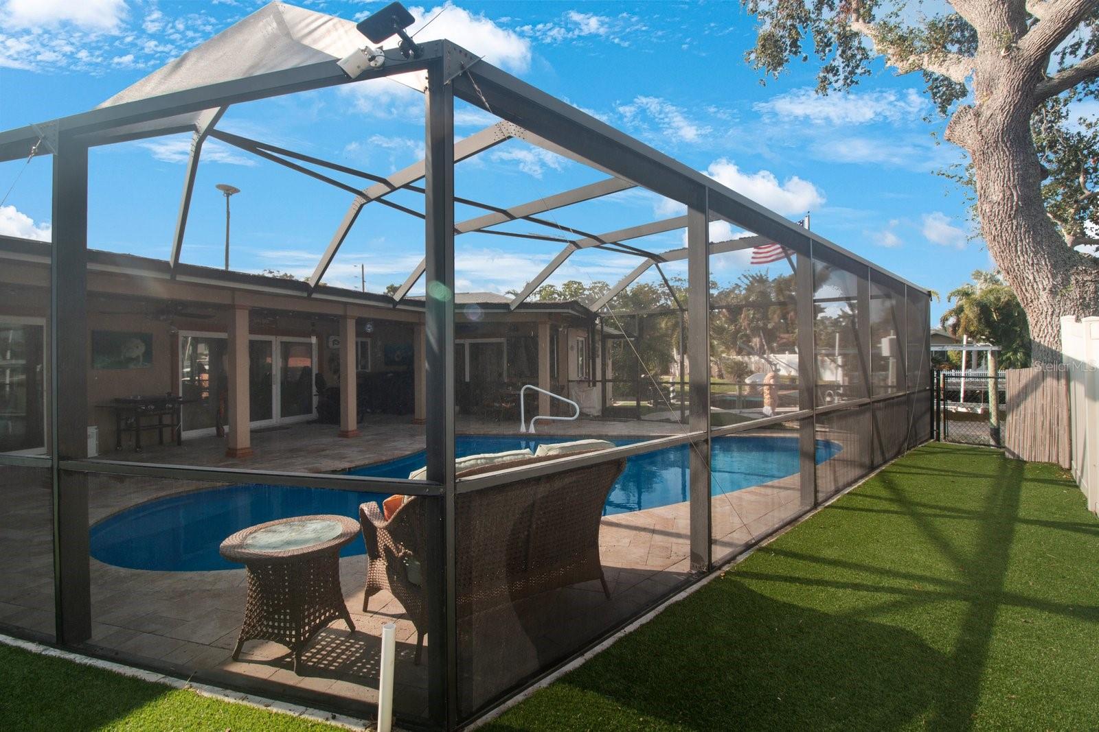 Beautiful Waterfront home has just hit the market! 3 Bedrooms, 2 Bathrooms, 2-Car Garage, 1,911 SQFT. This home features a Luxury Pool with sunshelf, and a screened birdcage. Backyard is Turfed allowing for a low maintenance clean manicured look at all times. Located at the end of a canal, newer composite dock & 10,000 lb boat lift, & New 2024 pool pump that connects via bluetooth. The home is split floorplan with hurricane windows and doors, main bedroom features an ensuite as well as a walk-in closet. Large Indoor Laundry/storage area, two grand glass sliders leading onto the paved lanai area, dining room located just off the kitchen features a large custom glass panel with decorative etching allowing added natural lighting as well as a built-in liquor cabinet. Kitchen window overlooks the pool and lanai area with a built-in pantry. Second living room space overlooks the canal. 2-Car garage is side-facing and has access to the side yard along the canal. New 2024 Roof and New Solar Panels that power the whole home and will be paid off at closing. Yes, this home was affected by storm waters during hurricane Helene however was immediately professionally remediated and demoed, as well as Killz mold and mildew paint applied to the studs. Permits are open and approved with the City of Largo and would just need to be transferred to the new contractor's name (easy process). Electrical is complete, drywall material is on site,floor is prepped and ready to apply epoxy, tile, or vinyl flooring, & luxury white shaker cabinets are ordered. Owner plans to continue to renovate the home until it sells, so you have the option to buy now and take over renovation or wait until it’s complete and purchase for 800k