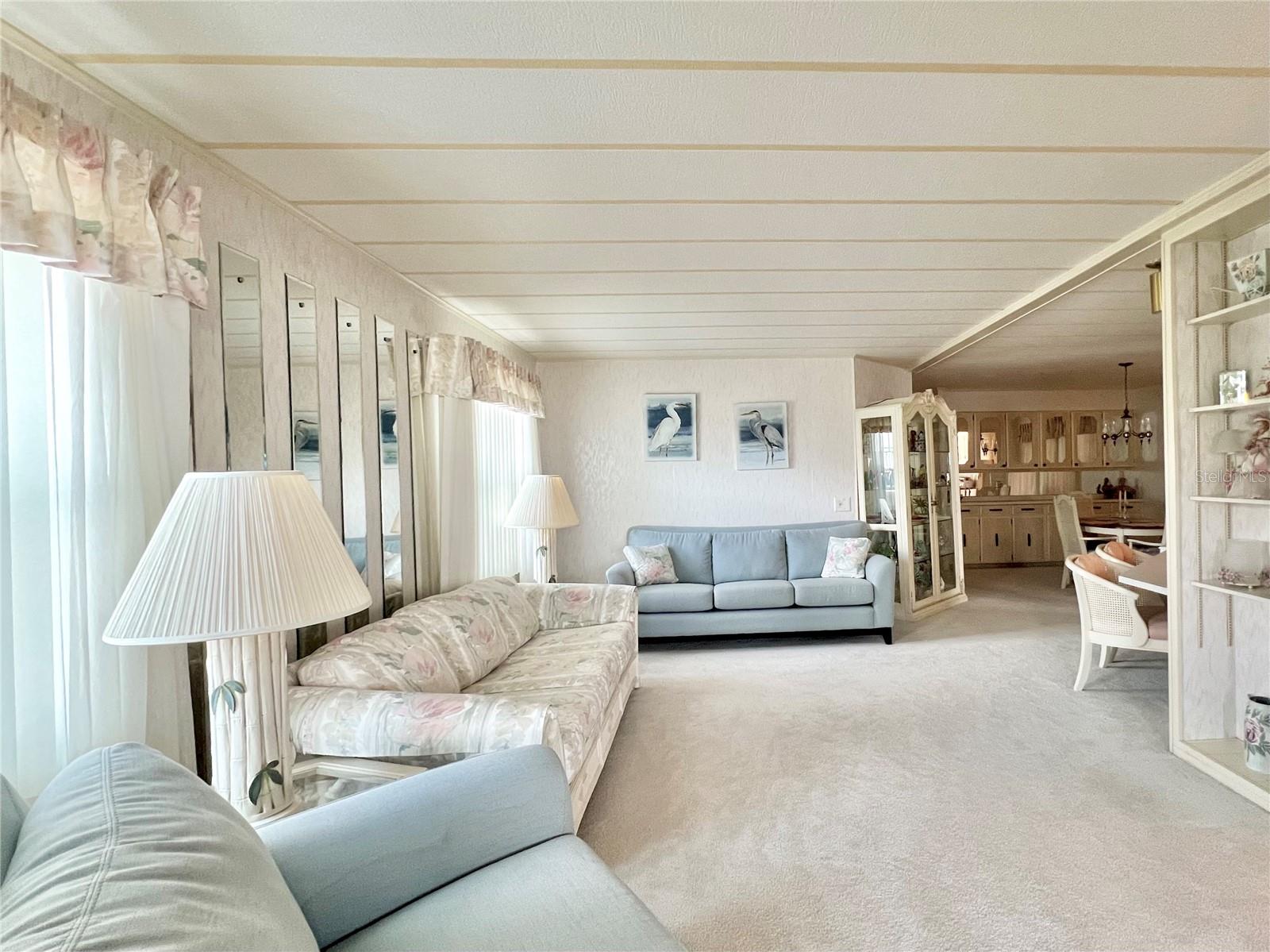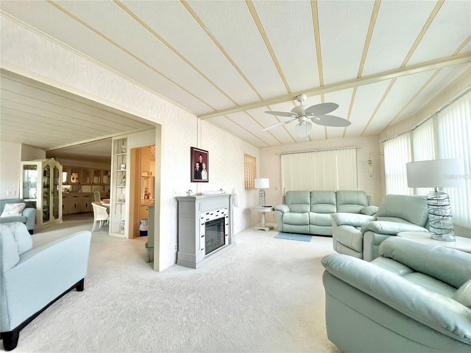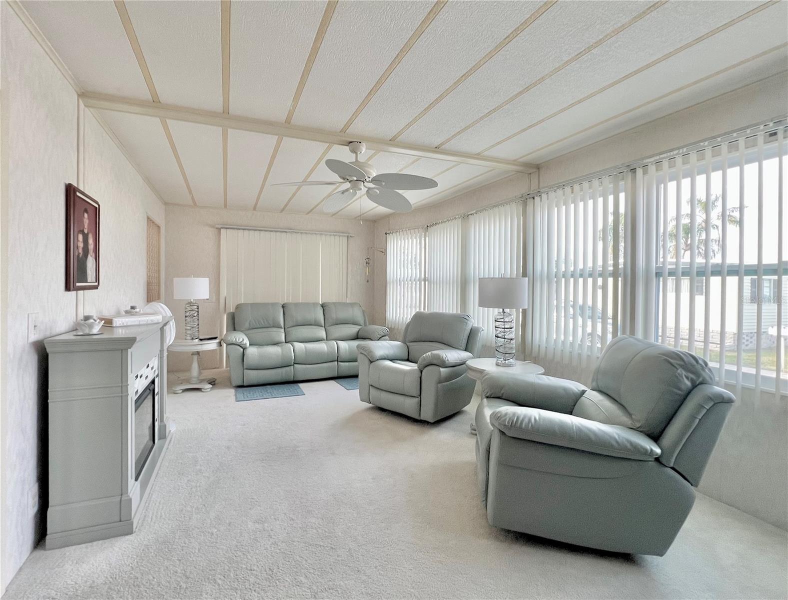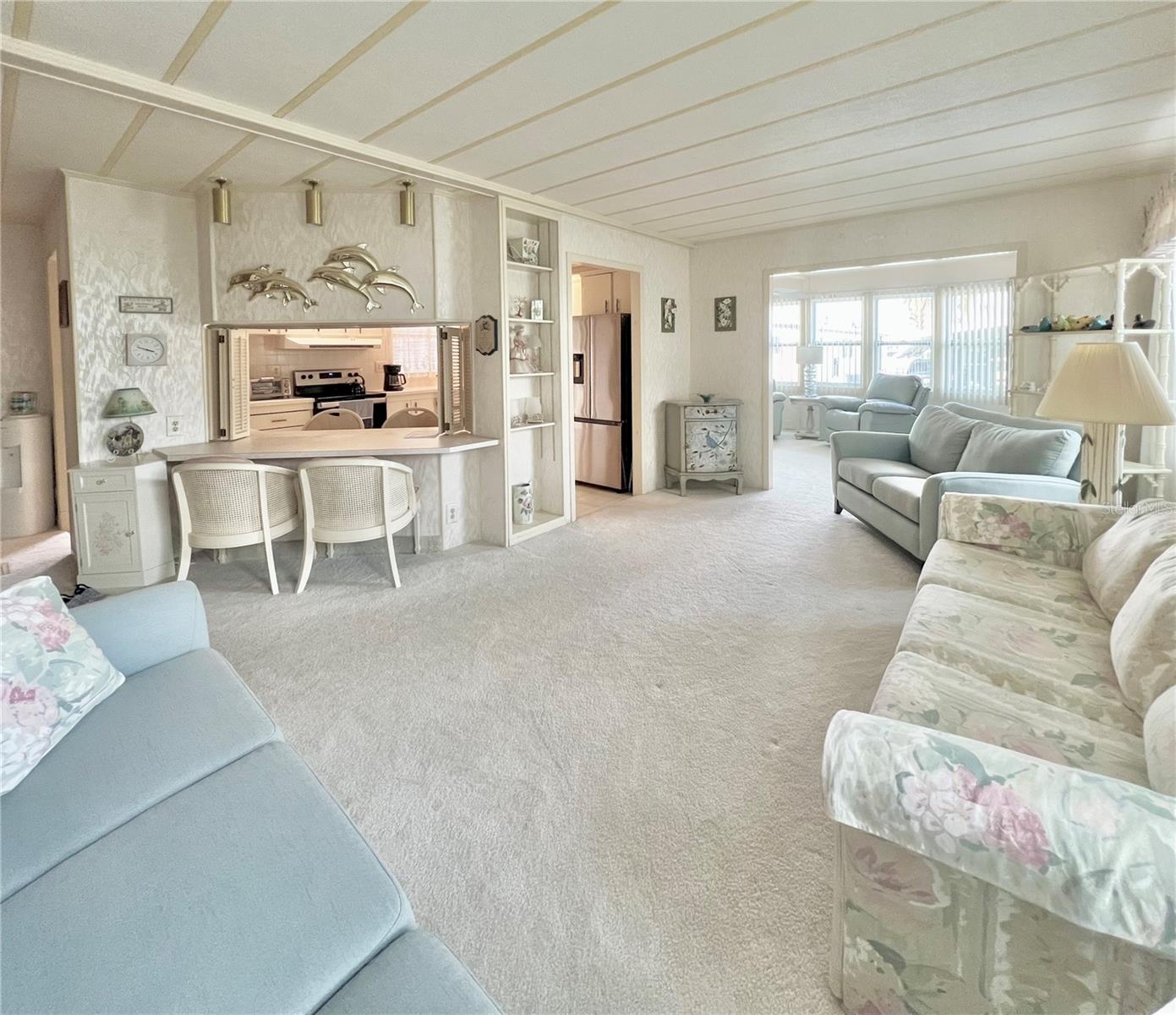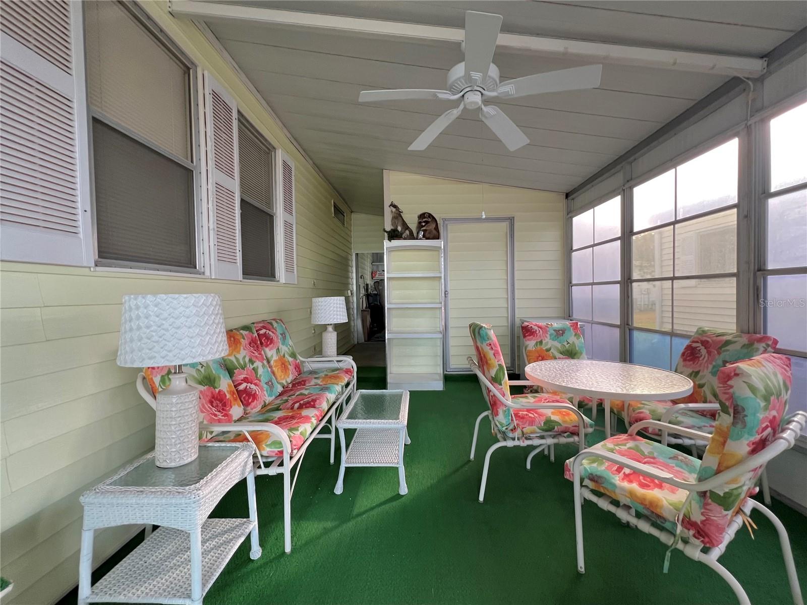 VERY MOTIVATED SELLERS...NEEDS TO SELL DO TO MEDICAL ISSUES! Check this one out NOW!!! Welcome to this charming 2-bedroom, 2-bath home located in the vibrant 55+ Co-Op share community of Fairway Village. This peaceful and inviting neighborhood offers residents the unique opportunity to enjoy year-round golfing for a nominal yearly fee or on a pay-as-you-play basis. Each home in Fairway Village is co-op owned by the residents, ensuring a true sense of community and pride in ownership. The affordable maintenance fee of $401 per month covers water, sewer, garbage, lawn care, and Spectrum's basic fiber-optic cable and internet for every home. Nestled just eight doors down from the South Pool, which is heated during the winter months and maintained year-round, this lovely home provides the perfect setting for both relaxation and recreation. You’ll appreciate the added convenience of a one-car carport, an enclosed lanai at the back of the carport, and two spacious sheds—one featuring a newer washer and dryer and the other offering ample space with double rear doors to store your golf cart. Boasting fresh updates, including new double-pane windows installed within the last year and a brand-new roof over in 2024, this home is both energy-efficient and move-in ready. Partially furnished and ready for immediate occupancy, this home offers a warm, welcoming atmosphere throughout, with an abundance of natural light. The large kitchen features a convenient sit-down island, ideal for enjoying your morning coffee or breakfast with loved ones. A set of bifold doors provides the option to close off this space, enhancing privacy. The dining room is equipped with a functional, extendable table and a built-in china hutch, offering both style and practicality. With 1,445 square feet of heated and cooled space, high ceilings throughout, and an open floor plan, the home feels both spacious and airy. The generously sized primary bedroom offers a walk-in closet and an en-suite bathroom with a walk-in shower and a separate vanity area for added comfort and privacy. The second bedroom is also a comfortable size, perfect for guests or family. Additionally, the front Florida room, previously enclosed, is now seamlessly integrated into the living space, adding to the home’s overall square footage. This is truly a well-maintained, move-in-ready home with an open and inviting layout. This home is the perfect choice for anyone seeking a well-maintained, spacious retreat in a peaceful community. Don't miss out on this opportunity—schedule a viewing today and experience all this beautiful home has to offer. The list price includes the share, making this an even more appealing option. All information provided is deemed reliable but should be independently verified by potential buyers.