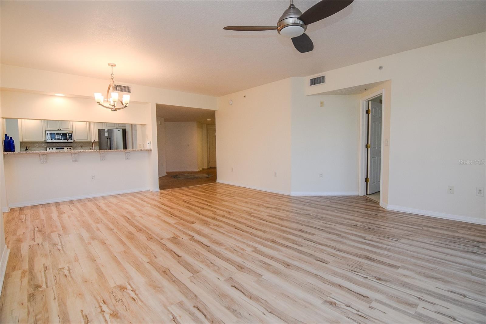 Come see this Stunning Corner Condo in Largo’s Golf Lake Condo Community. This spacious and bright corner unit offers the perfect combination of serenity, convenience, and luxury living. Boasting 1,836 square feet of living space, this updated home is drenched with natural light and features breathtaking fountain water views from both the screened lanai and expansive open patio, only available in coveted first-floor corner units. Enter to a welcoming living area that seamlessly flows into the well-equipped chef's kitchen, complete with a tile backsplash, all-new stainless-steel appliances, high-end granite countertops, and an island for added prep space. The kitchen also offers an eat-in nook with a view of the main living area and balcony. The split- bedroom layout includes a luxurious primary suite with his-and-her walk-in closets and a spa-like bathroom, featuring a garden tub, walk-in shower, dual vanities with granite, and a linen closet. Two additional spacious bedrooms share a full bath. This condo comes with a long list of upgrades: a brand-new roof (2024, assessment fully paid), hurricane-grade windows and sliding doors, Daikin AC system (2022) with programmable thermostat, new luxury vinyl plank flooring in the main area and high-grade carpeting in the bedrooms. A spacious interior laundry room offers ample storage and includes a utility sink and newer washer/dryer. The oversized garage (G9) is conveniently located close to the secured elevator. Enjoy exclusive community amenities, including two heated pools, a hot tub, a clubhouse with a kitchen, lounge, and private meeting room. The peaceful park-like setting, abundant wildlife, and nearby East Bay Golf Club make this the ideal spot to unwind. Located minutes from shopping, dining, and the beautiful Gulf beaches, this condo offers a country club lifestyle without the hefty fees. With no damage from Hurricanes Helene or Milton and situated in a NON-FLOOD ZONE, this home provides peace of mind for years to come. Don't miss out on this rare opportunity—schedule your private showing today and experience the best of Florida living!