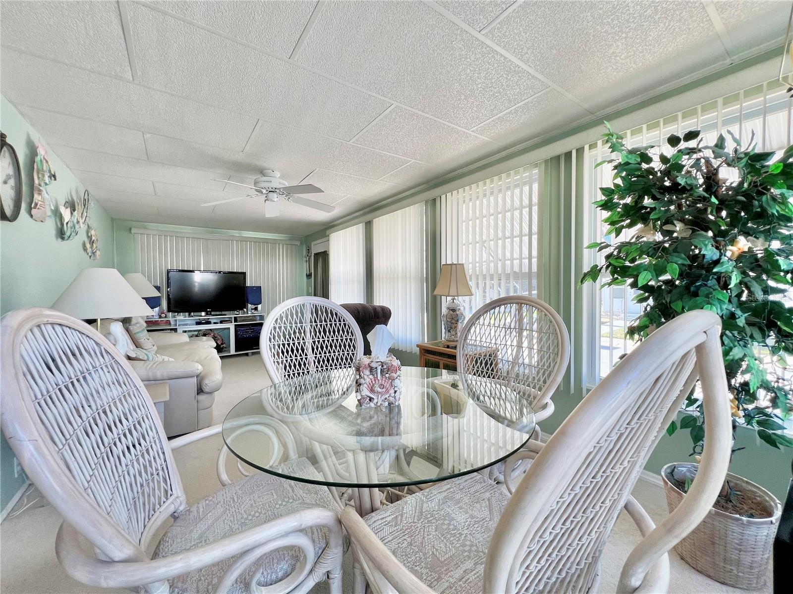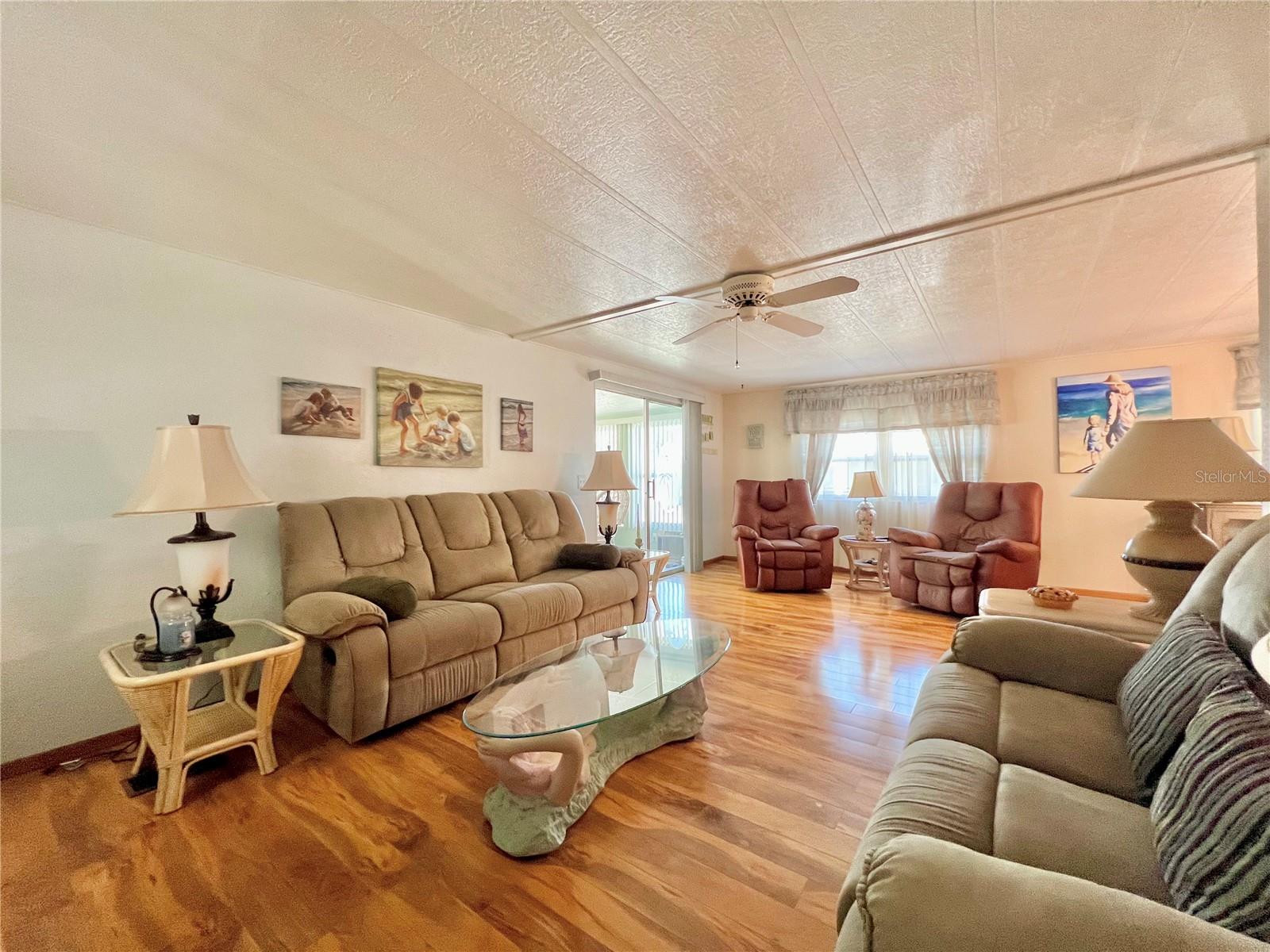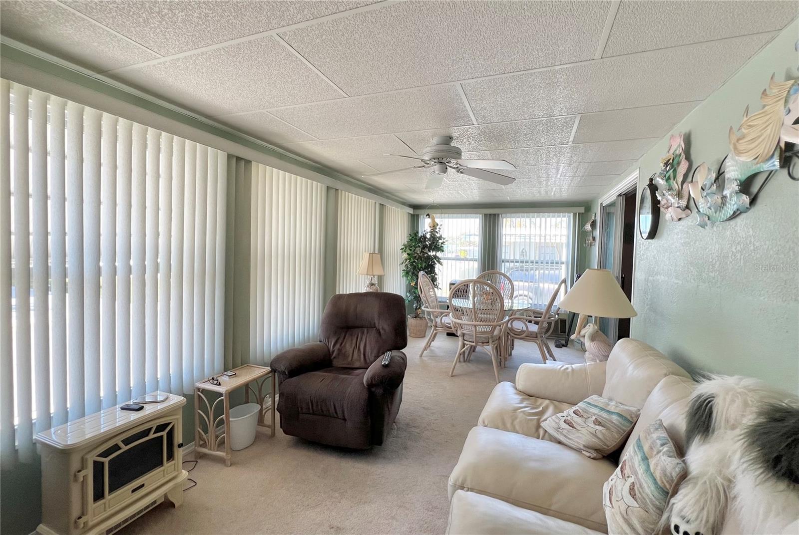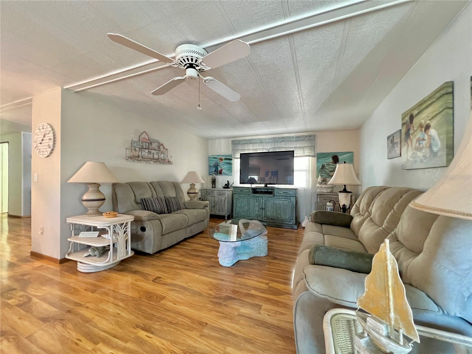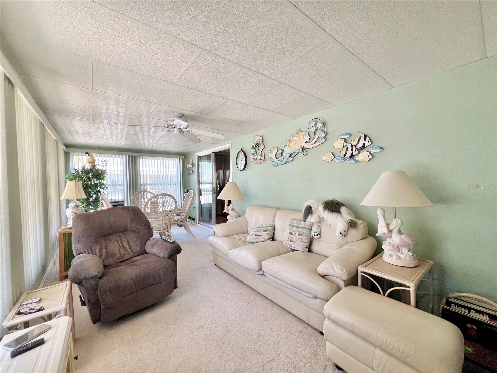 This meticulously maintained 2-bedroom, 2-bathroom home has been lovingly cared for by the same owners for 26 years, showcasing true pride of ownership. With many updates in the 1,584 square feet of usable living space (including two Florida rooms not counted in the stated heated and cooled 1,152 square footage), This home is both spacious and comfortable, as well as being sold fully furnished. Move right in!!!! The extended driveway fits two vehicles, and there's a convenient Florida room under the carport, complete with double French doors perfect for storing your golf cart when you're away for the summer or on vacation. The home features newer windows throughout and an awning over the front west-facing windows, ensuring the space remains cool and shaded. As you approach, the stunning NEW front door creates a welcoming entry. Step inside to the Florida room, thoughtfully transformed into a cozy TV/Den space with a dining table for those perfect sunset meals. The large living and dining areas are perfect for entertaining, with furniture that will impress and stay with the home. The kitchen has been updated with crisp white shaker cabinets, a cooktop stove with a vent hood, a wall oven, plus a small bar area to sit and conversate with the cook. All appliances, both large and small, along with cookware, are included. A broom closet could easily be converted into a pantry if desired. The dining area is modern with built-in storage and plenty of space. The home also boasts upgraded drywall and pristine flooring, with ceiling fans in every room. The spacious primary bedroom includes 4 closets, one of which is a walk-in, and the attached bathroom features a double vanity and fully tiled shower. The guest bedroom is conveniently located across the hall from the updated guest bathroom. This move-in ready home is perfect for anyone looking to enjoy the Florida lifestyle in a welcoming community. It’s located in Fairway Village, a premier 55+ manufactured home community, where a share is included in the list price for additional value. The community boasts an impressive 19,000 sq. ft. clubhouse with spaces for dances, bingo, card games, and more. There are two pools, jacuzzis, eight covered shuffleboard courts, and even a 9-hole par 3 golf course for a small fee. Ideally situated near major attractions, airports, and stunning beaches, Fairway Village offers the perfect balance of relaxation and convenience for both year-round living and seasonal stays. This is your chance to join a vibrant, active community and enjoy the best of your retirement years. Make your appointment today to see this wonderful home!