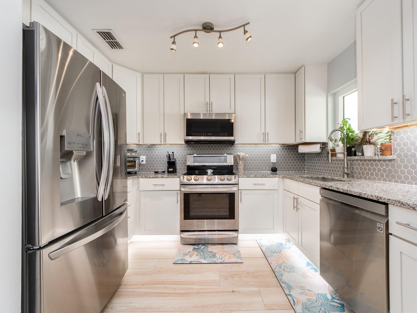 Discover this beautifully updated 3-bedroom, 2-bathroom home nestled in a peaceful, family-friendly neighborhood. Designed with a thoughtful split floor plan for privacy and entertaining, it features a master suite with an en-suite bath. In 2022, the home was upgraded with elegant porcelain tile flooring throughout and remodeled kitchen and bathrooms showcasing contemporary finishes. Hurricane-rated windows and sliding glass doors were also installed, along with a water softener system. The property is not in a flood zone and remained dry during recent hurricanes, offering peace of mind. Enjoy a spacious, fully fenced backyard perfect for pets, kids, or outdoor gatherings. The exterior was freshly sealed and painted in 2024, enhancing its curb appeal, while a large 2-car garage provides ample storage and parking. Located on a quiet dead-end street, this home combines serene living with convenient access to local amenities. Don’t miss the opportunity—schedule your tour
