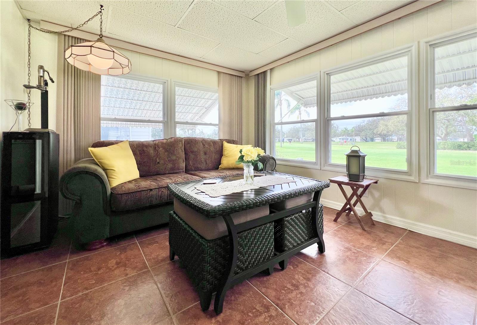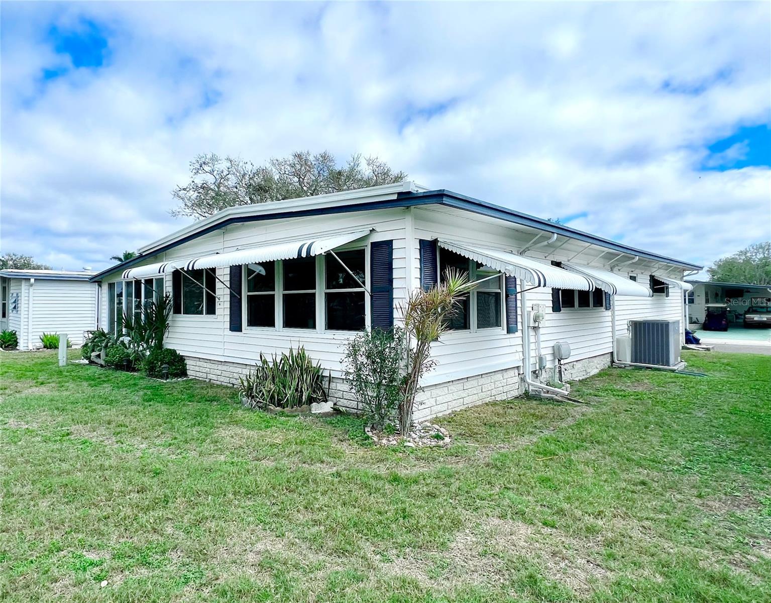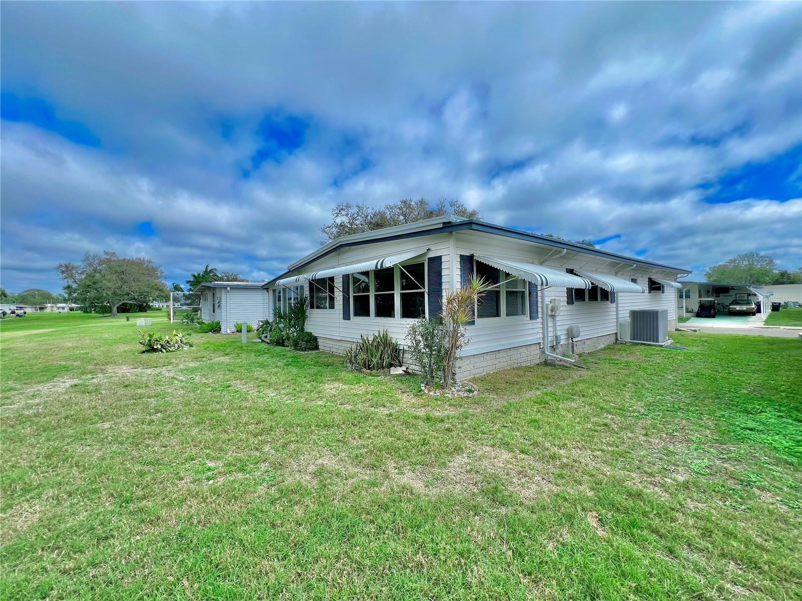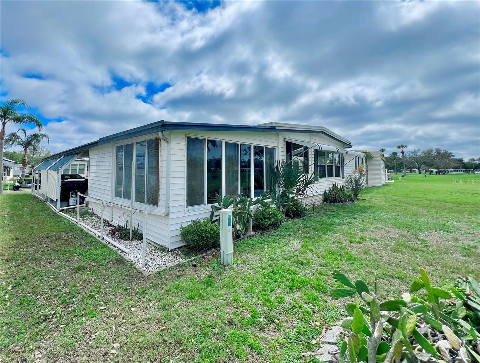 ON THE GOLF COURSE!!!!! DON'T let this one get away.... Rare for this community to see a golf course home come on the market at this price!!! This meticulously maintained 2-bedroom, 2-bathroom home, encompassing 1,372 sq. ft. plus a bonus room overlooking this fabulous view, showcases exceptional quality and thoughtful details throughout. Featuring a well-maintained metal Roof Over, Vinyl siding and newer windows throughout. This home offers peace of mind with dual outdoor water shutoff valves, a water softener and a vapor barrier in great condition, with enclosed decorative blocks for finishing touches under the home. The A/C unit, installed in April 2018, ensures year-round comfort, while the water heater and Dryer were updated in November 2024 add to the home's modern conveniences. The property boasts 1/2-inch plywood beneath the laminate floors, enhancing durability, and the appliances were all updated in 2018. The spacious Florida Room, complete with a sofa bed, serves as a versatile space, while both bedrooms feature generous walk-in closets and lovely bedroom furniture. Elegant granite countertops in both the kitchen and bathrooms elevate the overall aesthetic.This home is offered fully furnished, with all furniture staying in the property. The enclosed office/Florida Room is a standout feature, with sliding side-to-side windows that offer beautiful views of the golf course. Fairway Village, a premier 55+ manufactured home community, includes a share in the list price, providing additional value. The community offers an impressive array of amenities, including a newly opened 19,000 sq. ft. clubhouse featuring spaces for dances, bingo, card games, and more. Residents can also enjoy two pools, jacuzzis, eight covered shuffleboard courts, and a 9-hole par 3 golf course for a small fee. Ideally located near major attractions, airports, and beautiful beaches, Fairway Village provides an ideal setting for both year-round living and seasonal stays. This is a wonderful opportunity to join a vibrant and welcoming community and make the most of your retirement years. Schedule your private showing today to see these beautiful sunset views.