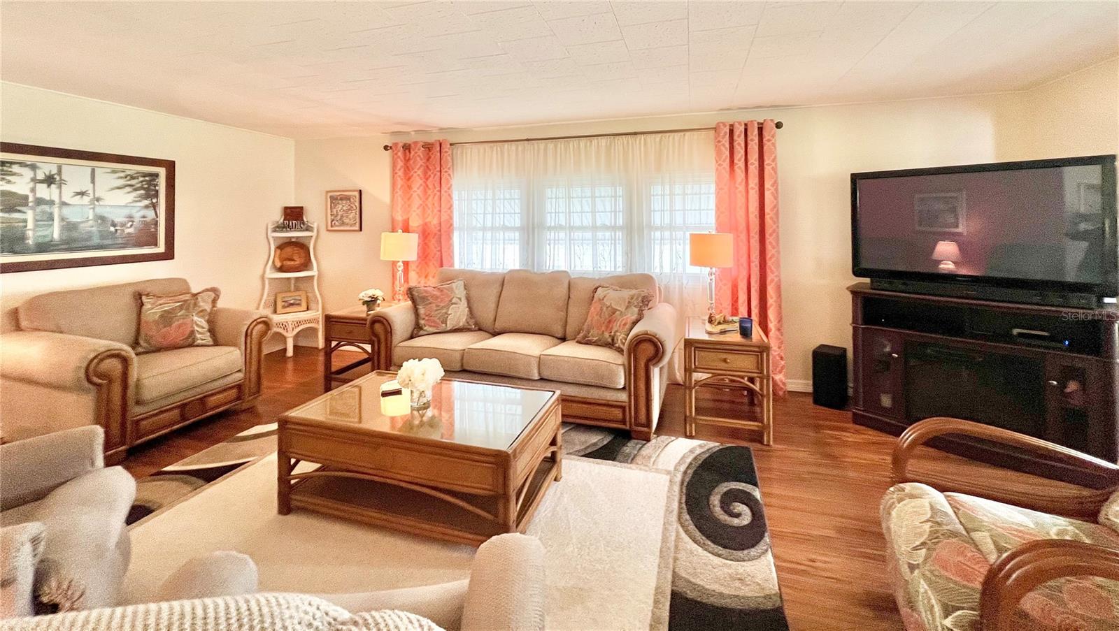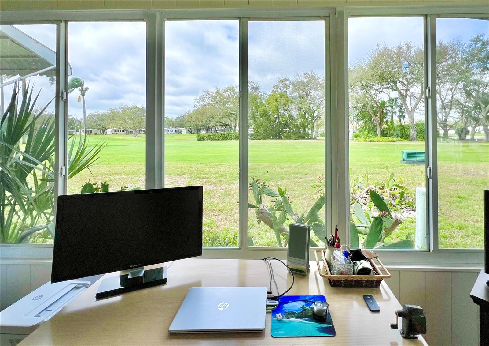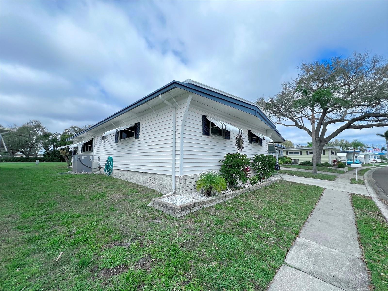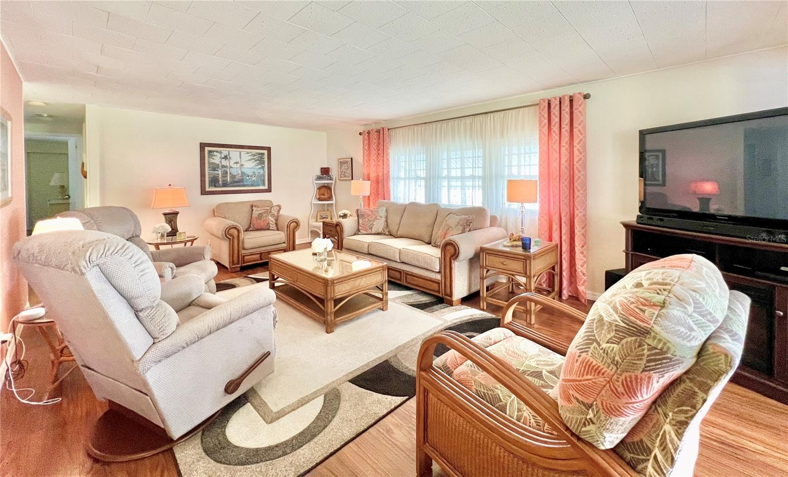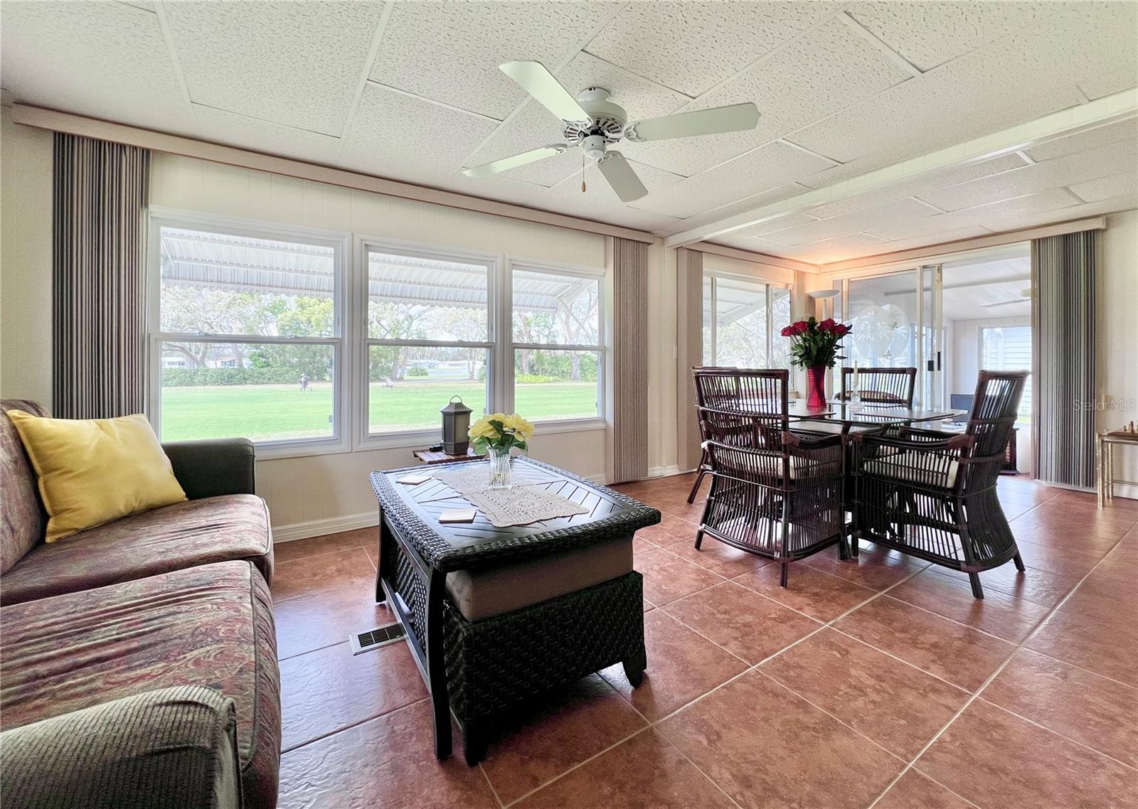ON THE GOLF COURSE!!!!! DON'T let this one get away.... Rare for this community to see a golf course home come on the market at this price!!! This meticulously maintained 2-bedroom, 2-bathroom home, encompassing 1,372 sq. ft. plus a bonus room overlooking this fabulous view, showcases exceptional quality and thoughtful details throughout. Featuring a well-maintained metal Roof Over, Vinyl siding and newer windows throughout. This home offers peace of mind with dual outdoor water shutoff valves, a water softener and a vapor barrier in great condition, with enclosed decorative blocks for finishing touches under the home. The A/C unit, installed in April 2018, ensures year-round comfort, while the water heater and Dryer were updated in November 2024 add to the home's modern conveniences. The property boasts 1/2-inch plywood beneath the laminate floors, enhancing durability, and the appliances were all updated in 2018. The spacious Florida Room, complete with a sofa bed, serves as a versatile space, while both bedrooms feature generous walk-in closets and lovely bedroom furniture. Elegant granite countertops in both the kitchen and bathrooms elevate the overall aesthetic.This home is offered fully furnished, with all furniture staying in the property. The enclosed office/Florida Room is a standout feature, with sliding side-to-side windows that offer beautiful views of the golf course. Fairway Village, a premier 55+ manufactured home community, includes a share in the list price, providing additional value. The community offers an impressive array of amenities, including a newly opened 19,000 sq. ft. clubhouse featuring spaces for dances, bingo, card games, and more. Residents can also enjoy two pools, jacuzzis, eight covered shuffleboard courts, and a 9-hole par 3 golf course for a small fee. Ideally located near major attractions, airports, and beautiful beaches, Fairway Village provides an ideal setting for both year-round living and seasonal stays. This is a wonderful opportunity to join a vibrant and welcoming community and make the most of your retirement years. Schedule your private showing today to see these beautiful sunset views.
