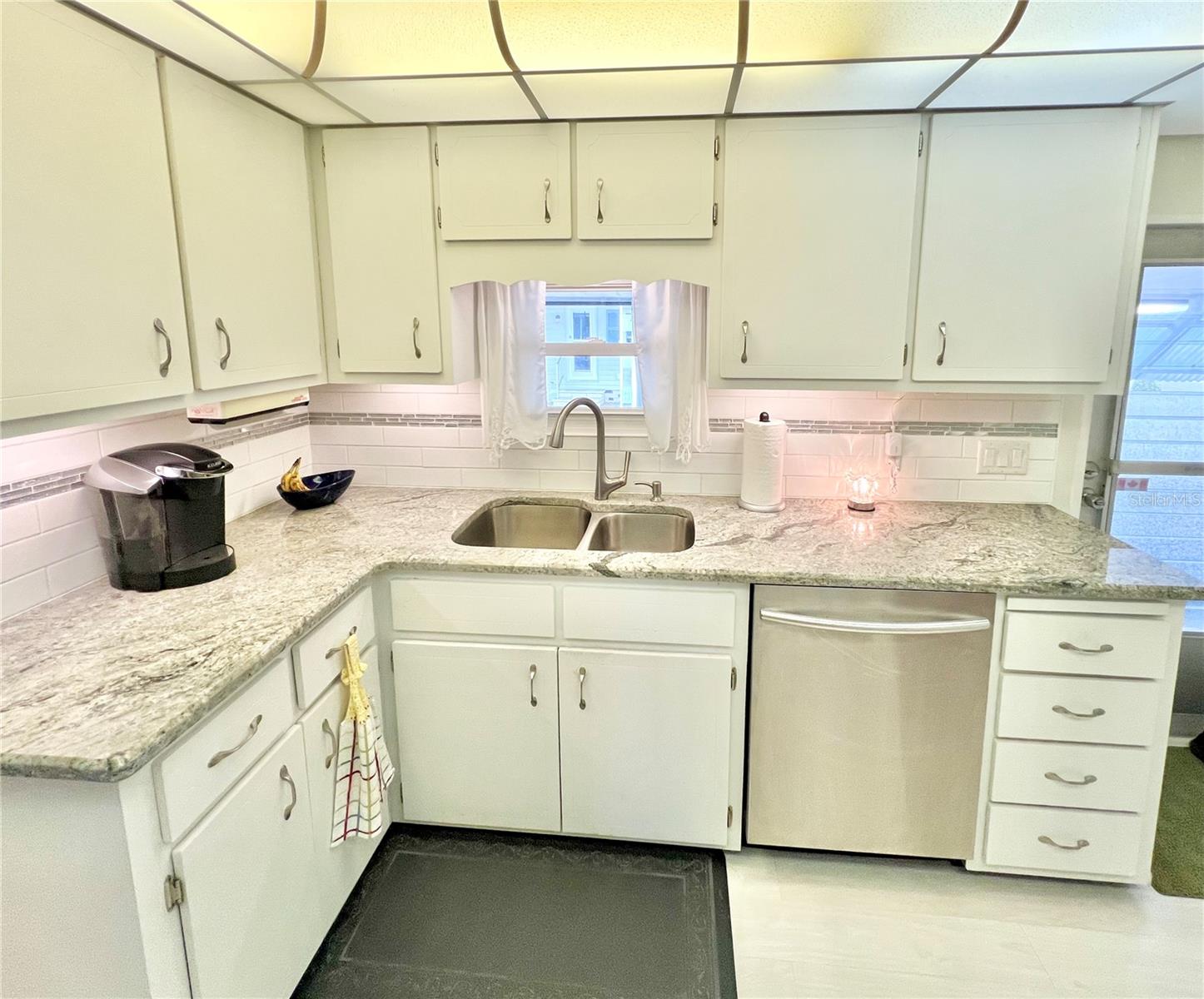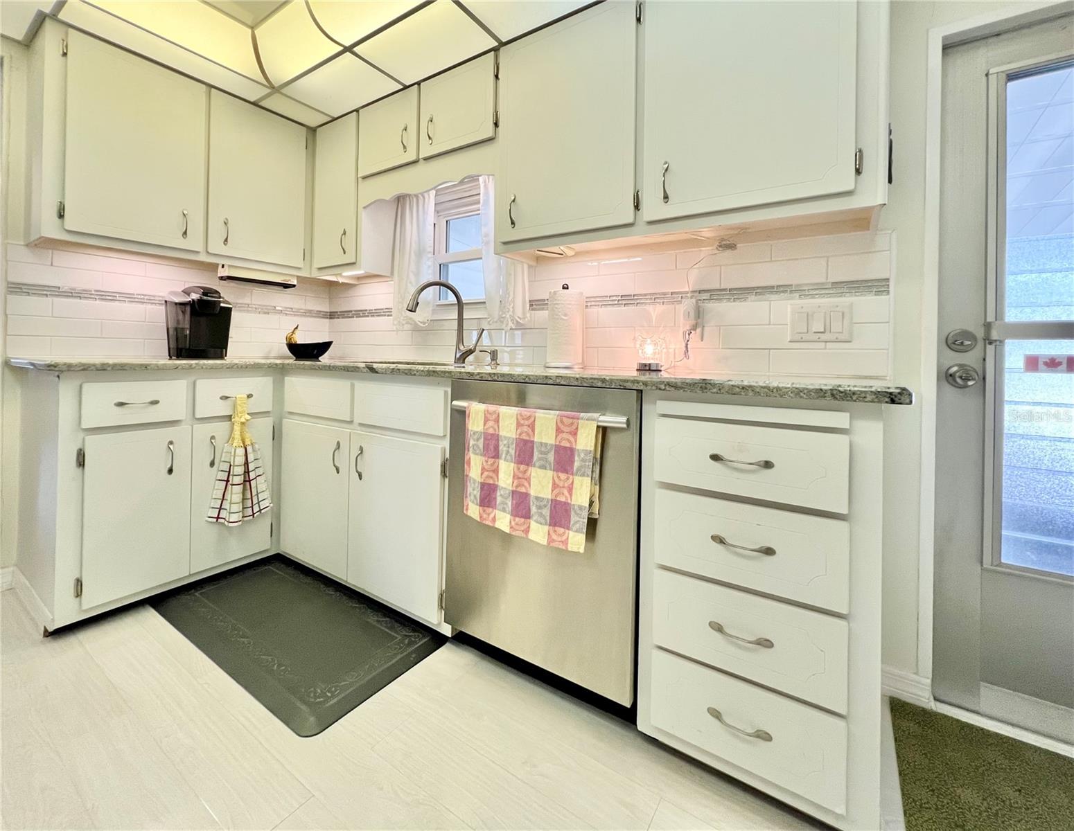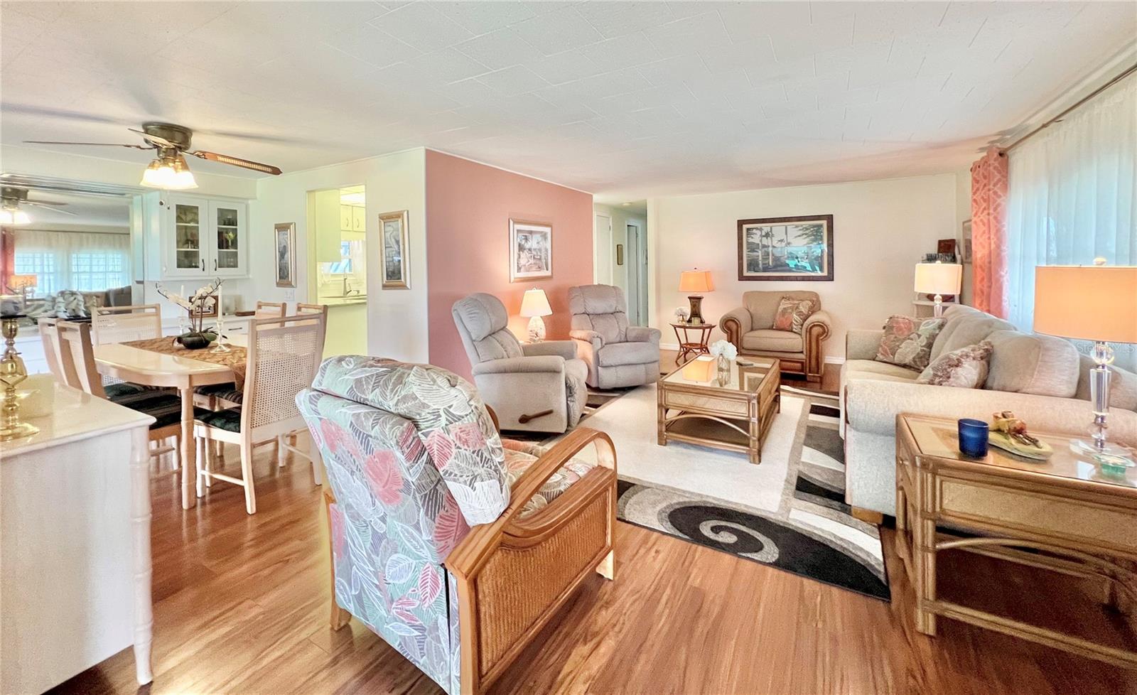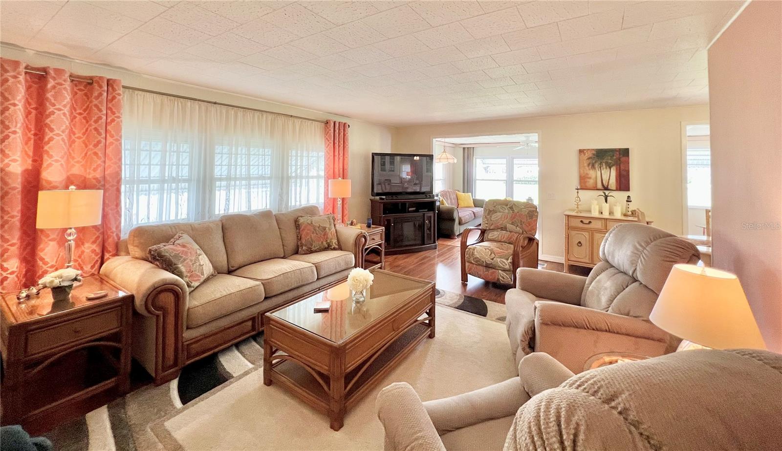 ON THE GOLF COURSE!!!!! DON'T let this one get away.... Rare for this community to see a golf course home come on the market at this price!!! This meticulously maintained 2-bedroom, 2-bathroom home, encompassing 1,372 sq. ft. plus a bonus room overlooking this fabulous view, showcases exceptional quality and thoughtful details throughout. Featuring a well-maintained metal Roof Over, Vinyl siding and newer windows throughout. This home offers peace of mind with dual outdoor water shutoff valves, a water softener and a vapor barrier in great condition, with enclosed decorative blocks for finishing touches under the home. The A/C unit, installed in April 2018, ensures year-round comfort, while the water heater and Dryer were updated in November 2024 add to the home's modern conveniences. The property boasts 1/2-inch plywood beneath the laminate floors, enhancing durability, and the appliances were all updated in 2018. The spacious Florida Room, complete with a sofa bed, serves as a versatile space, while both bedrooms feature generous walk-in closets and lovely bedroom furniture. Elegant granite countertops in both the kitchen and bathrooms elevate the overall aesthetic.This home is offered fully furnished, with all furniture staying in the property. The enclosed office/Florida Room is a standout feature, with sliding side-to-side windows that offer beautiful views of the golf course. Fairway Village, a premier 55+ manufactured home community, includes a share in the list price, providing additional value. The community offers an impressive array of amenities, including a newly opened 19,000 sq. ft. clubhouse featuring spaces for dances, bingo, card games, and more. Residents can also enjoy two pools, jacuzzis, eight covered shuffleboard courts, and a 9-hole par 3 golf course for a small fee. Ideally located near major attractions, airports, and beautiful beaches, Fairway Village provides an ideal setting for both year-round living and seasonal stays. This is a wonderful opportunity to join a vibrant and welcoming community and make the most of your retirement years. Schedule your private showing today to see these beautiful sunset views.