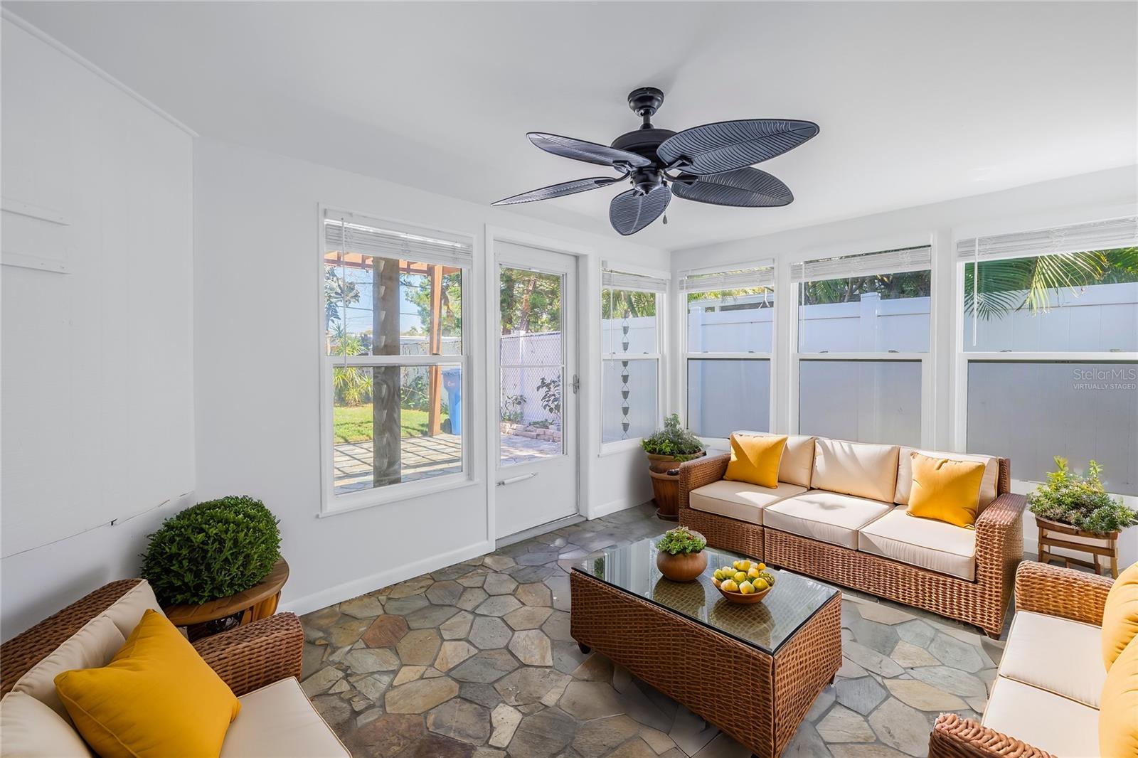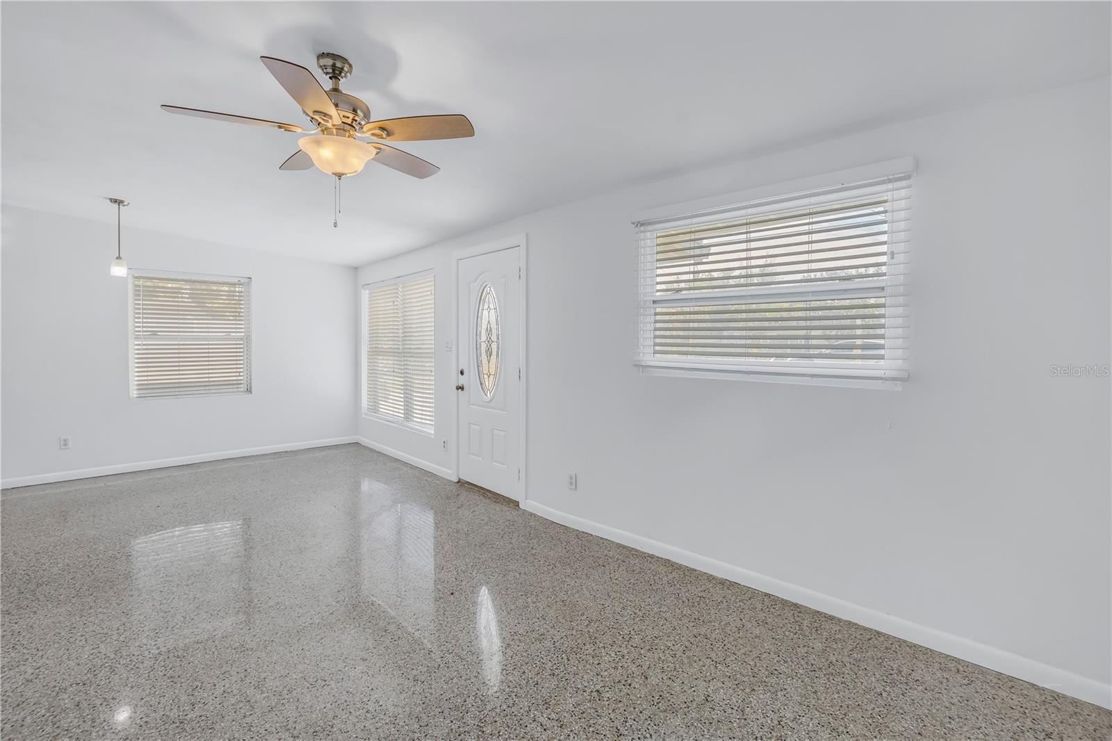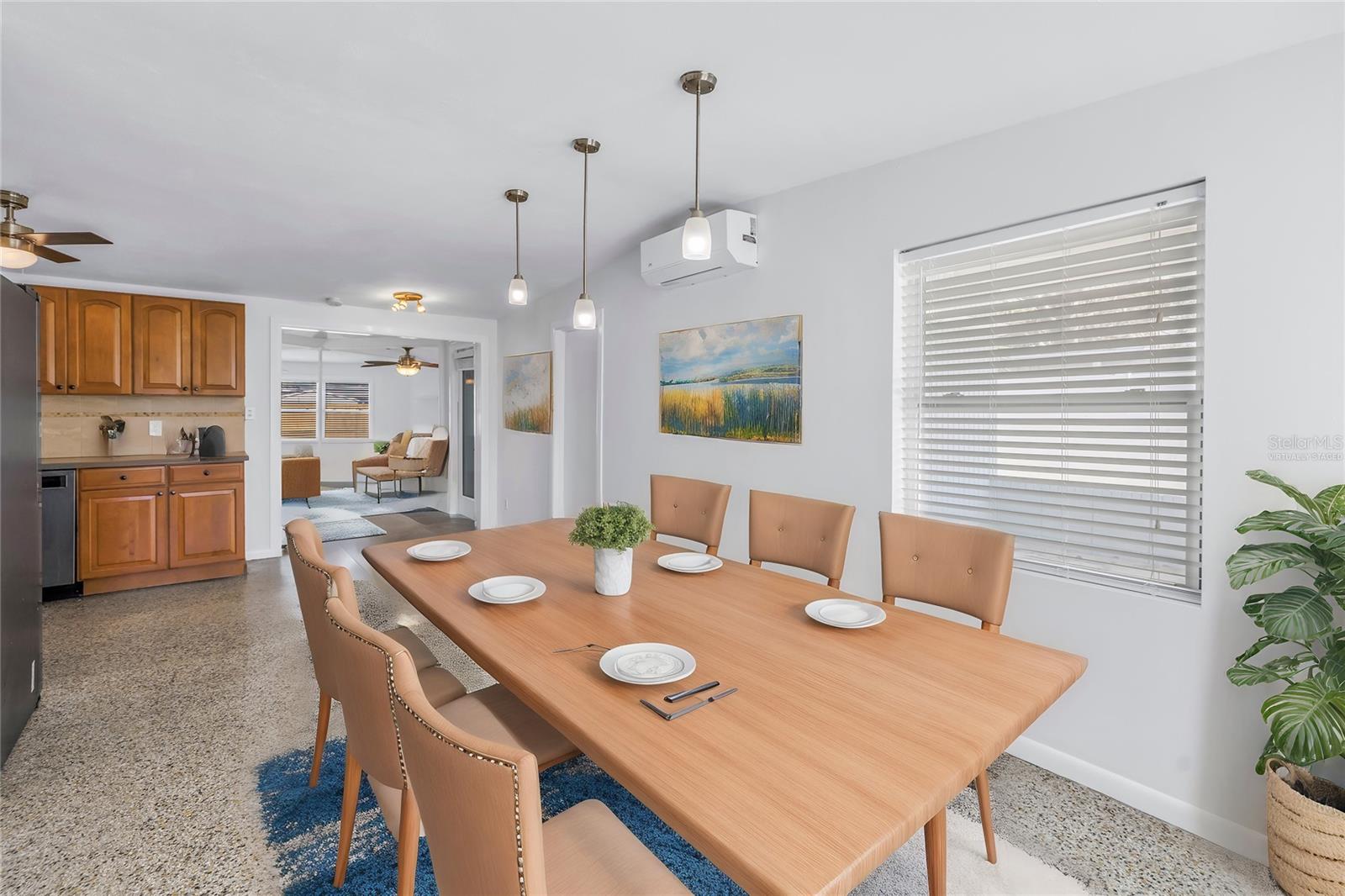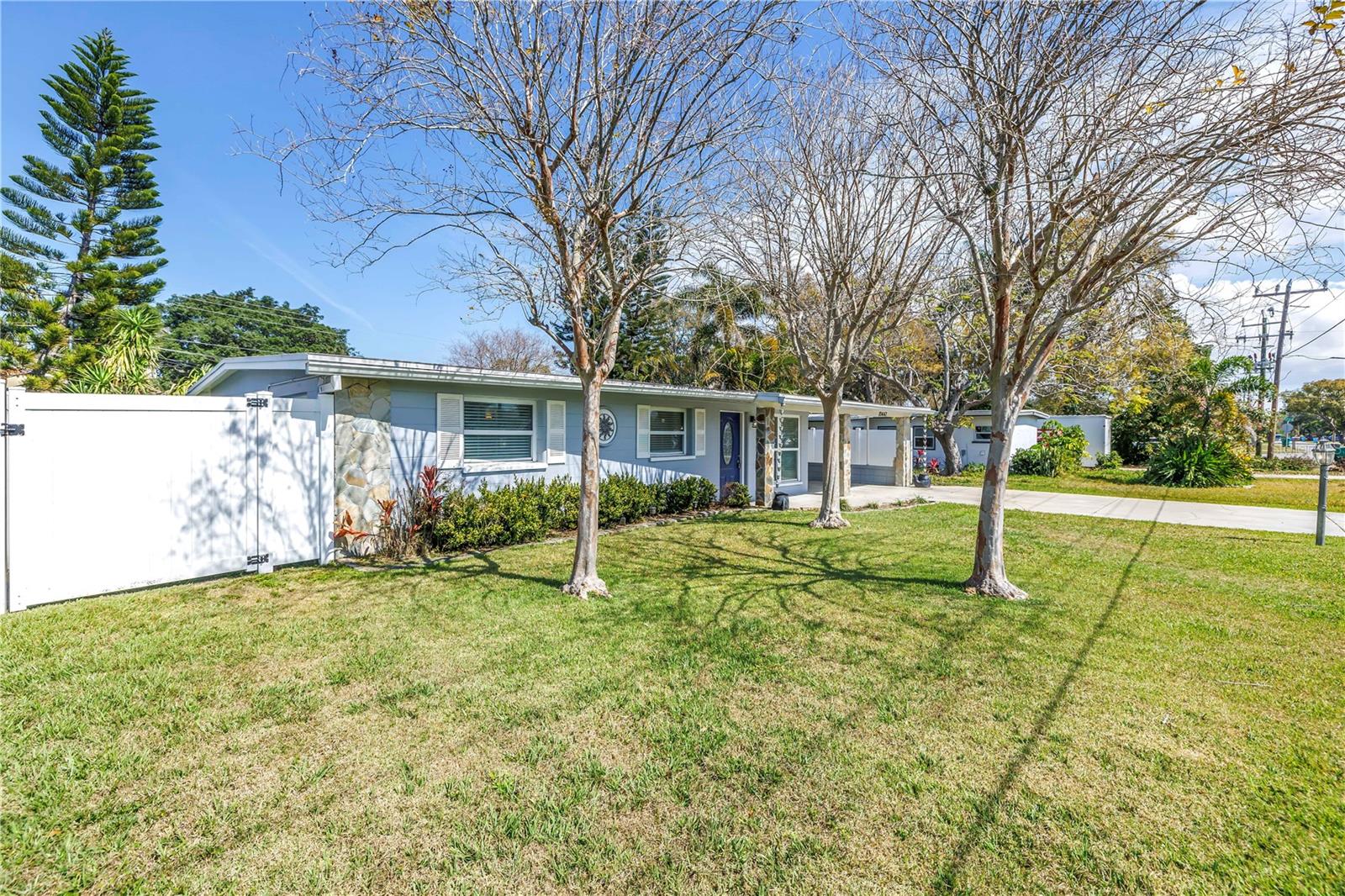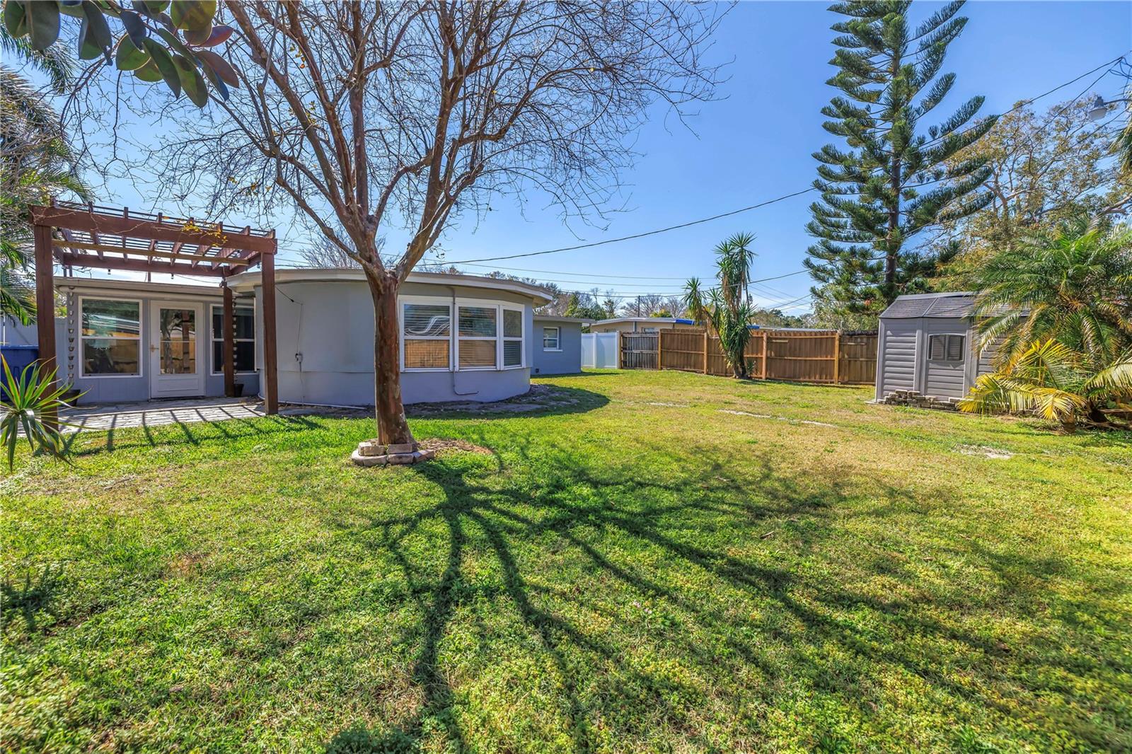 One or more photo(s) has been virtually staged. Back on the market through no fault of the property, previous buyer's financing fell through. Welcome to this very spacious, move in ready 2 bedroom, 1 bathroom home, filled with natural light! Situated on high elevation (non-flood zone) with no storm damage or flooding, this home offers peace of mind along with a variety of exterior bonus features. Enjoy a covered carport, an enclosed Florida room that can be cooled with the window AC unit (not included in the heated square footage), a pergola covered patio with charming stone pavers, and a storage shed for added convenience. Step inside and be greeted by fresh interior paint and original, refinished terrazzo floors in pristine condition. The home offers a living room, a spacious dining room, and a huge den that could easily be converted into a third bedroom. A major upgrade includes professionally installed mini-split systems throughout the entire house in 2024, costing $17,000 for energy efficient comfort. At the heart of the home, the kitchen boasts recent upgrades, including a brand-new, 5-burner, smart Wi-Fi-enabled convection range with an air fryer, a 2022 dark stainless Samsung refrigerator, and maple cabinetry. A perfectly situated window above the sink provides a lovely view of the backyard. Another standout feature is the huge laundry room, which doubles as a storage space and could easily be converted into a second full bathroom. Outside, the fully fenced in backyard offers plenty of space for relaxation, entertaining, or play. Conveniently located just a short drive from the beaches, Seminole Mall, Seminole Lake Park, endless dining options, and more—this home is a must-see! Don’t miss out on this incredible opportunity!