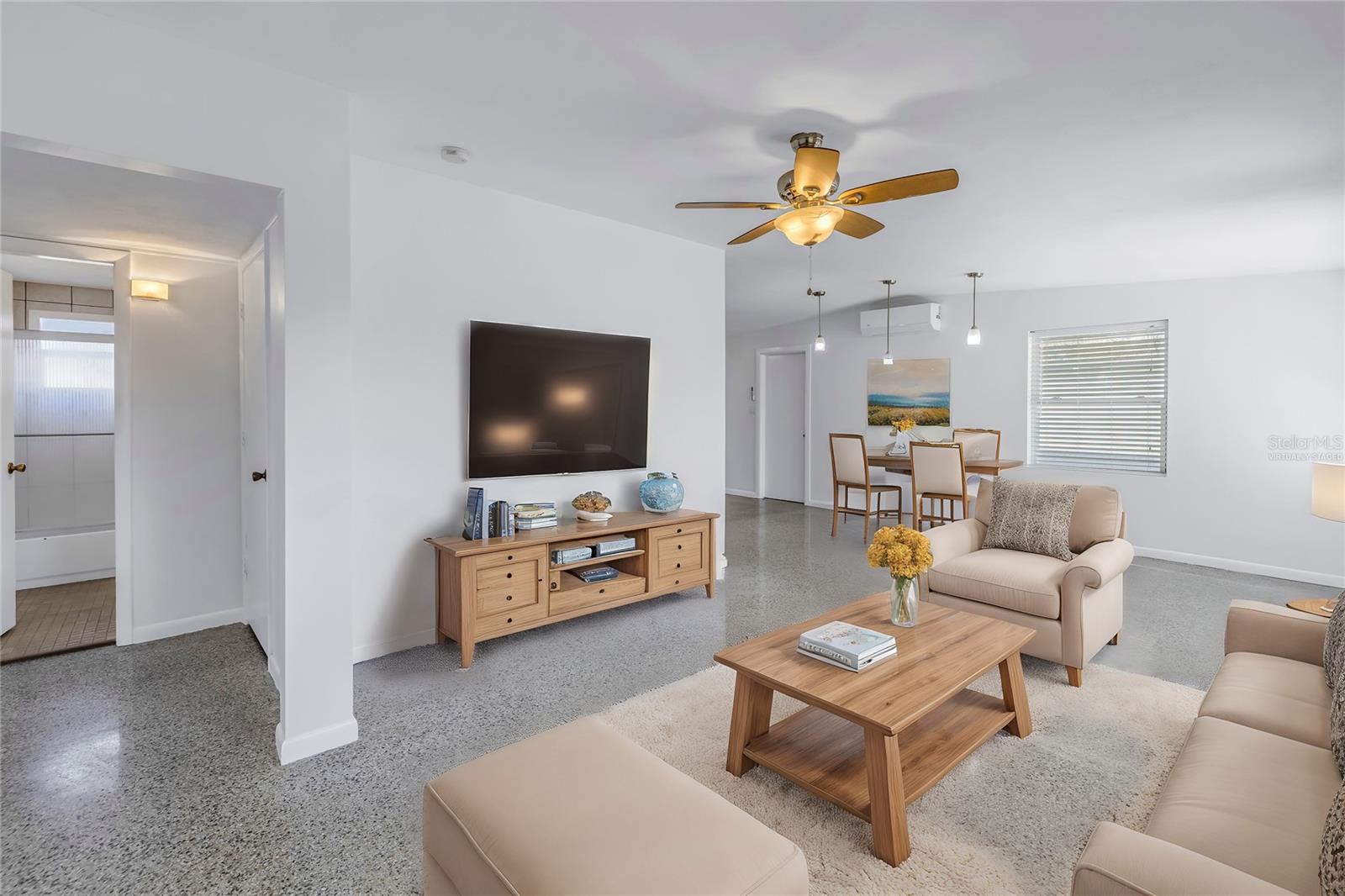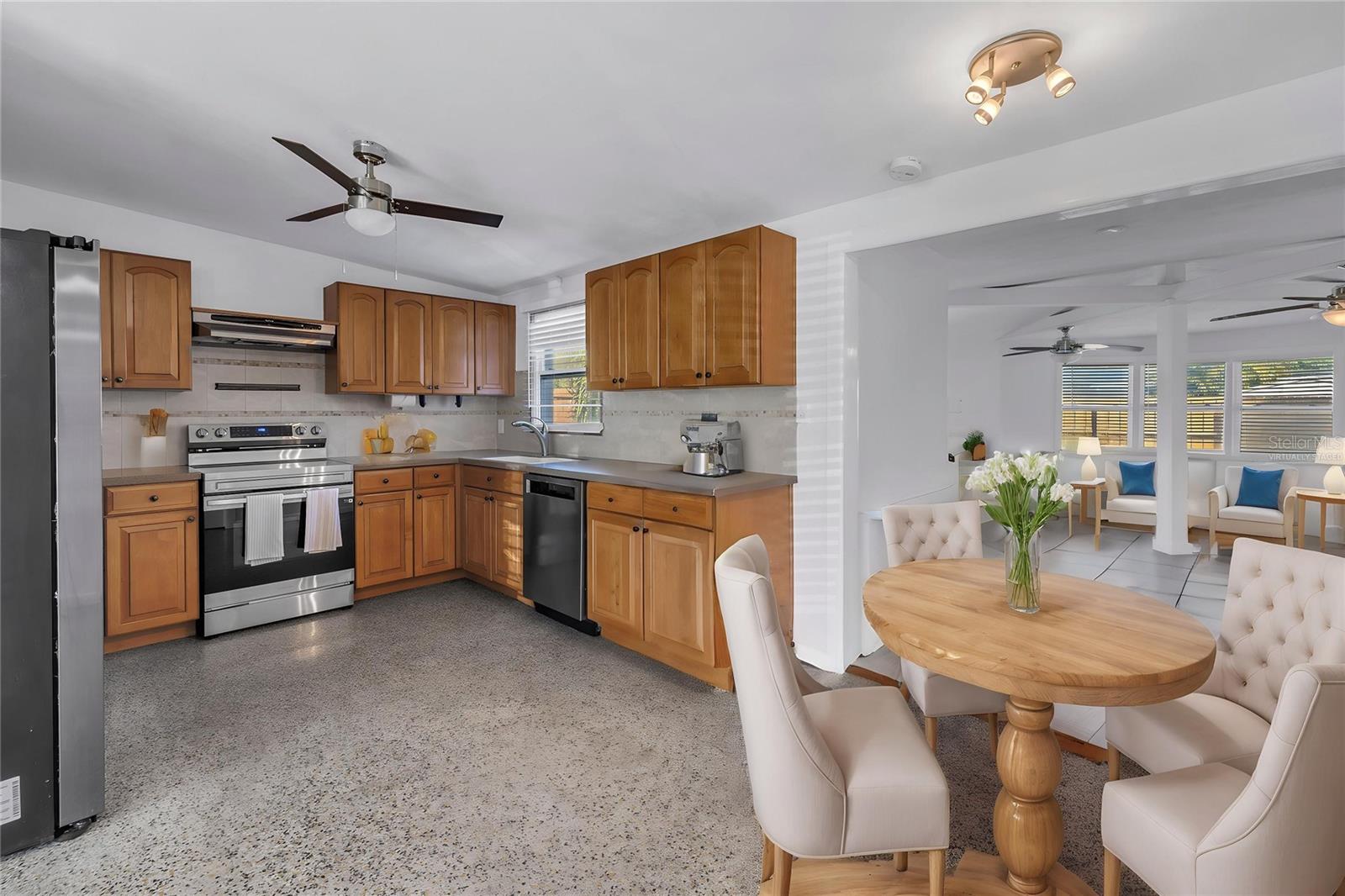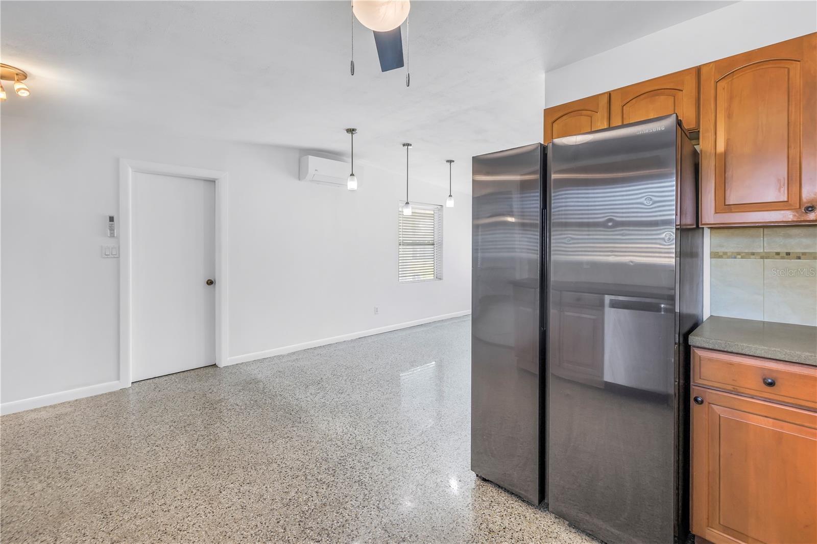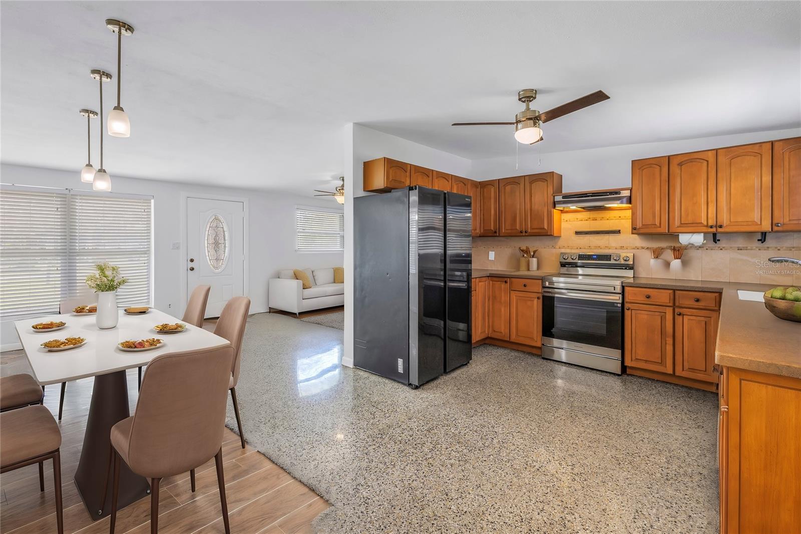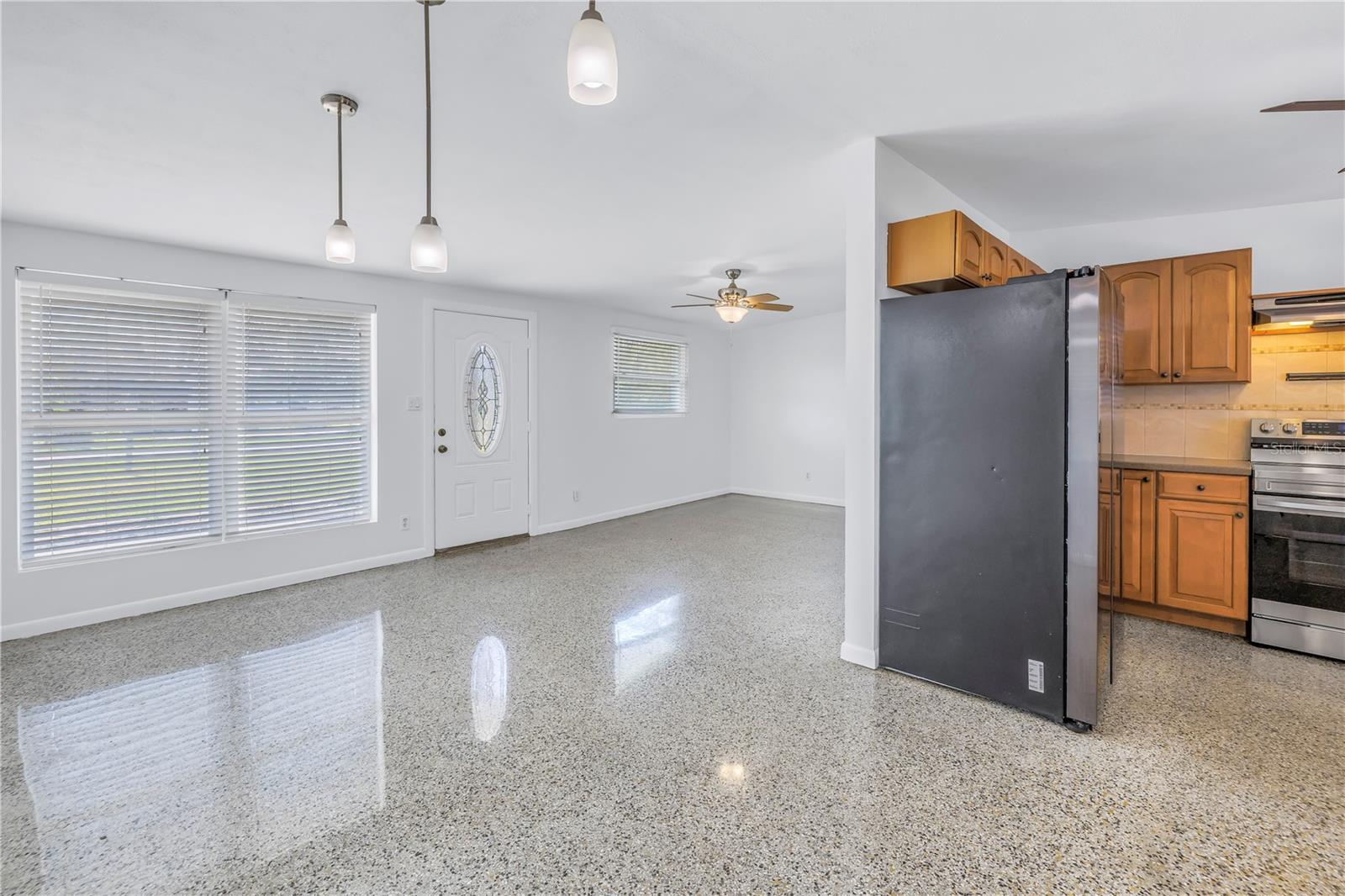 One or more photo(s) has been virtually staged. Back on the market through no fault of the property, previous buyer's financing fell through. Welcome to this very spacious, move in ready 2 bedroom, 1 bathroom home, filled with natural light! Situated on high elevation (non-flood zone) with no storm damage or flooding, this home offers peace of mind along with a variety of exterior bonus features. Enjoy a covered carport, an enclosed Florida room that can be cooled with the window AC unit (not included in the heated square footage), a pergola covered patio with charming stone pavers, and a storage shed for added convenience. Step inside and be greeted by fresh interior paint and original, refinished terrazzo floors in pristine condition. The home offers a living room, a spacious dining room, and a huge den that could easily be converted into a third bedroom. A major upgrade includes professionally installed mini-split systems throughout the entire house in 2024, costing $17,000 for energy efficient comfort. At the heart of the home, the kitchen boasts recent upgrades, including a brand-new, 5-burner, smart Wi-Fi-enabled convection range with an air fryer, a 2022 dark stainless Samsung refrigerator, and maple cabinetry. A perfectly situated window above the sink provides a lovely view of the backyard. Another standout feature is the huge laundry room, which doubles as a storage space and could easily be converted into a second full bathroom. Outside, the fully fenced in backyard offers plenty of space for relaxation, entertaining, or play. Conveniently located just a short drive from the beaches, Seminole Mall, Seminole Lake Park, endless dining options, and more—this home is a must-see! Don’t miss out on this incredible opportunity!