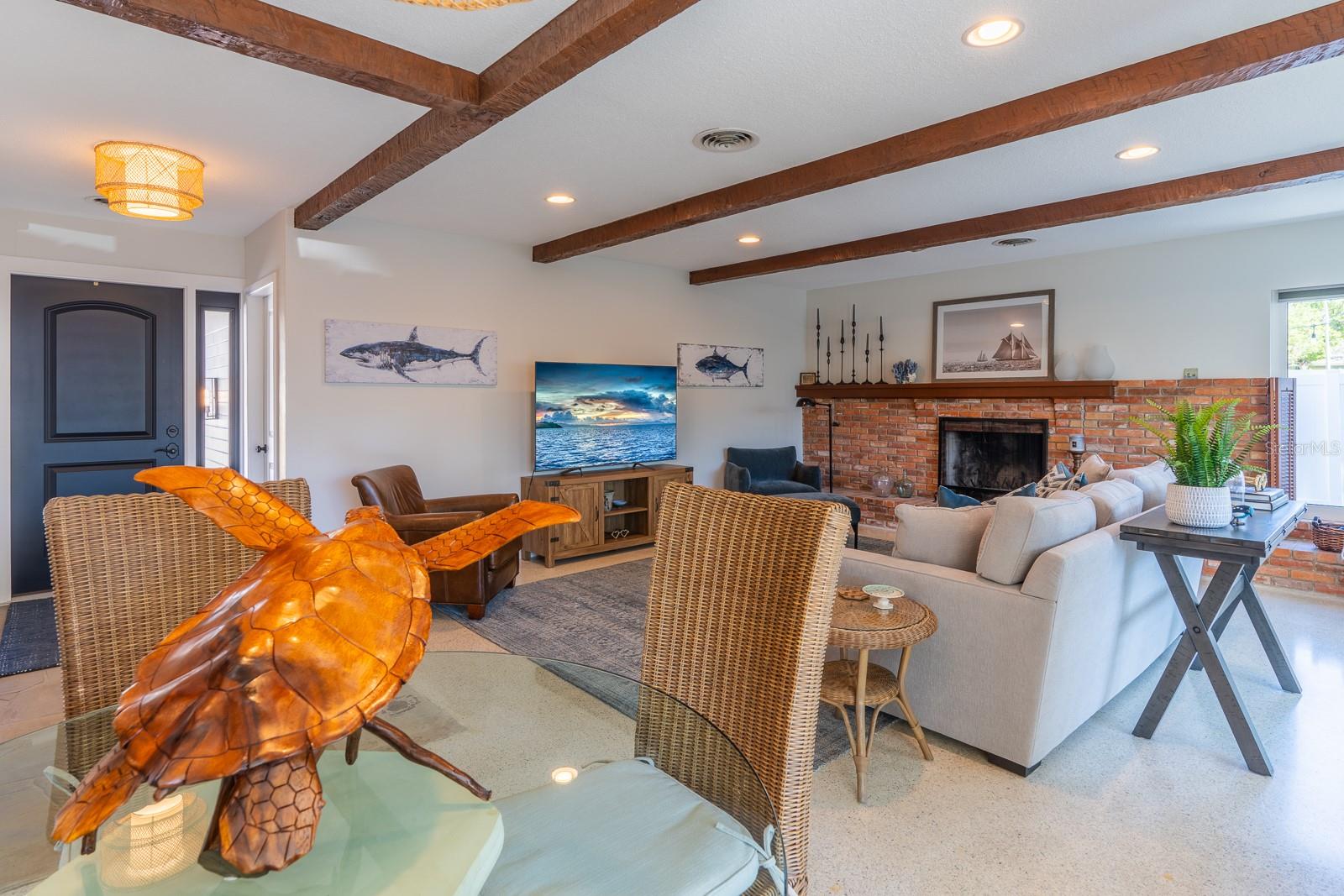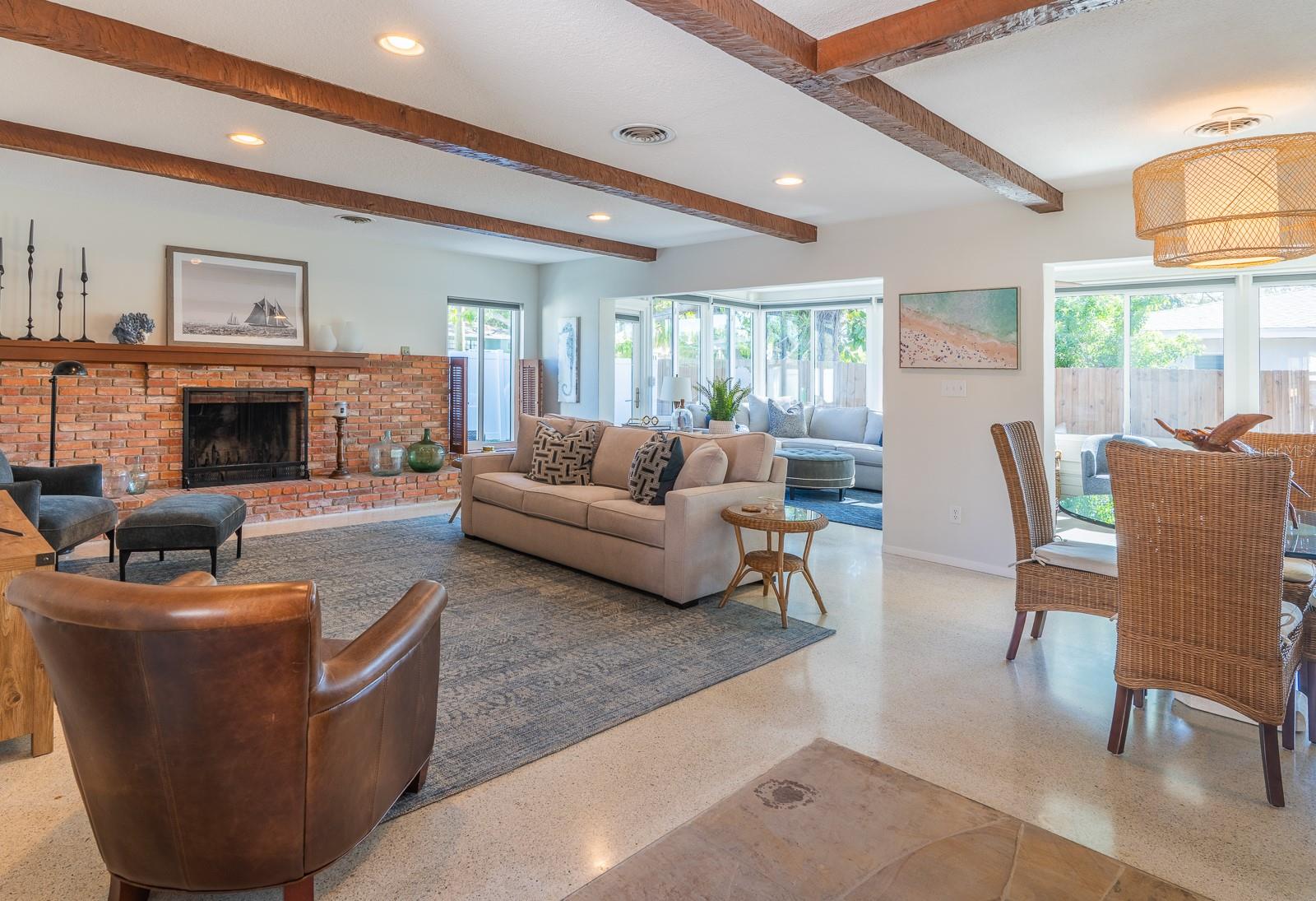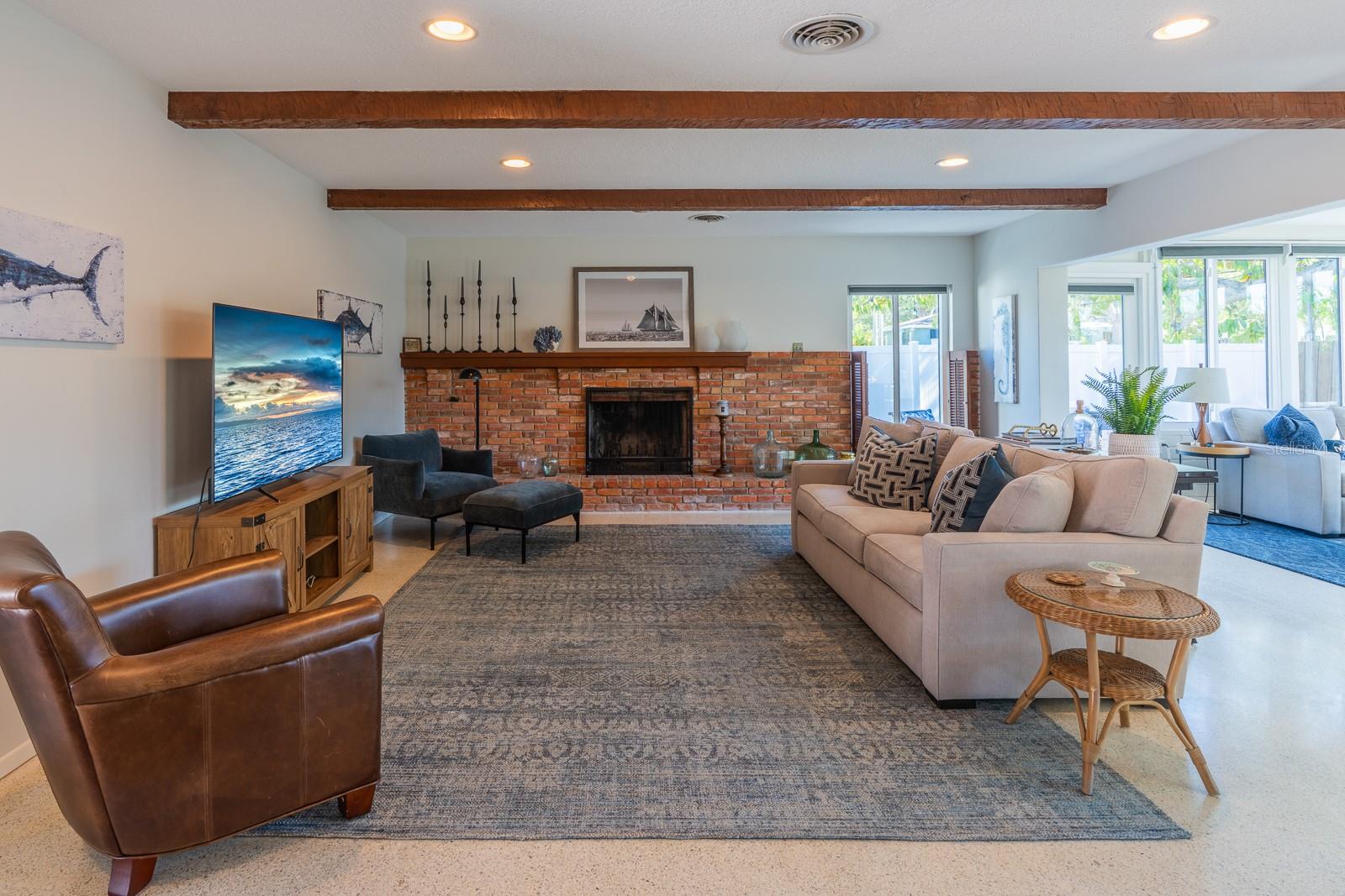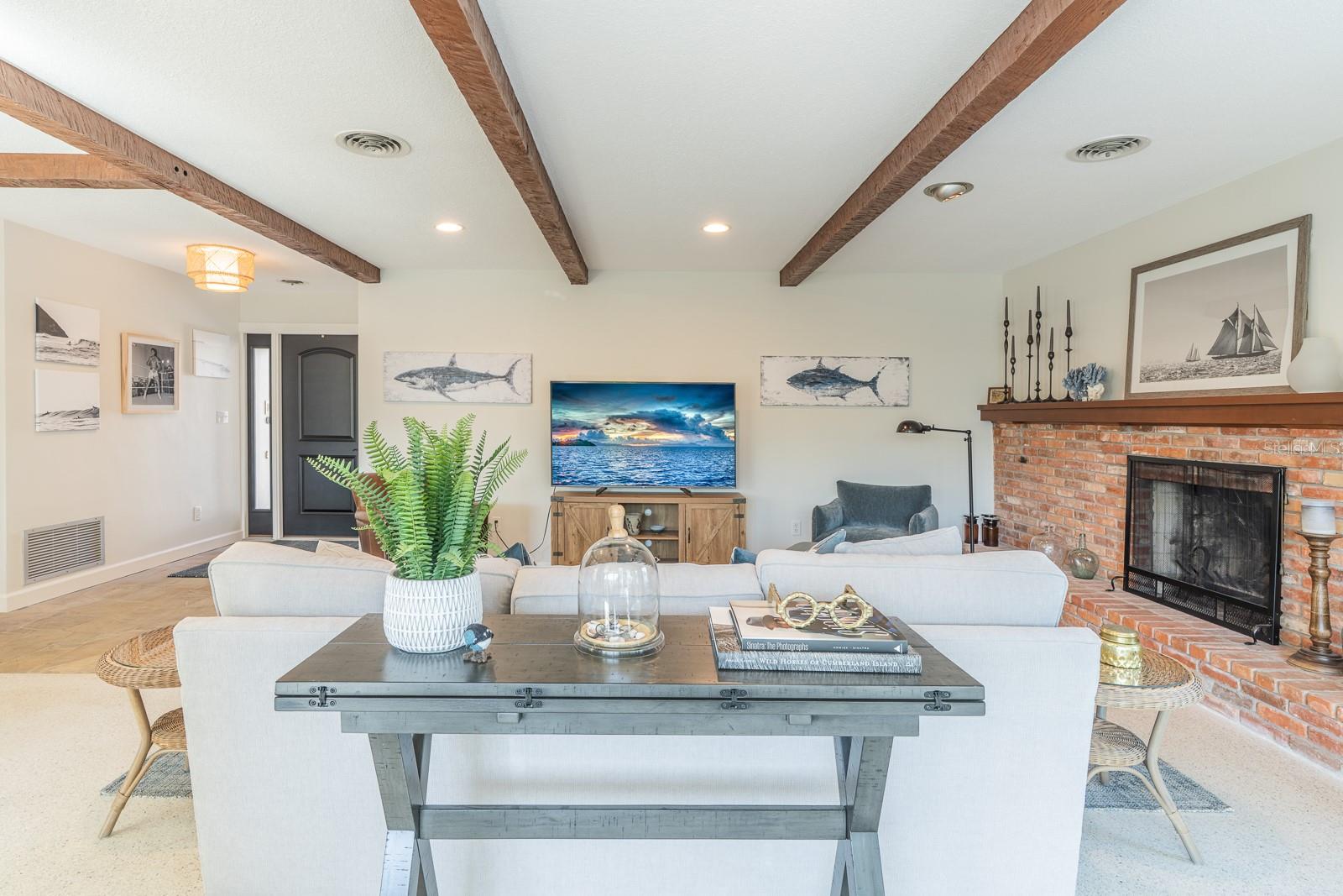 Nestled between Clearwater and Belleair, this stunning, sold FULLY FURNISHED, 3 bedroom, 2 bathroom home exudes coastal charm and effortless elegance. From the moment you step inside, you’ll be captivated by its character, warmth, and timeless style. Polished terrazzo floors flow throughout, while large windows across the entire back of the home bathe the space in abundant natural light. To the left, the inviting living room boasts original wood beams and a stunning brick wood-burning fireplace, creating a cozy yet refined ambiance. To the right, the beautifully designed kitchen features quartz countertops, high-quality wood cabinetry, and a seamless connection to the home’s airy and bright Florida room. This entertainer’s haven includes a stylish wet bar, complete with a fridge, cabinet space, and matching quartz countertops that create a cohesive and coastal elegant feel. The bedrooms are thoughtfully positioned to the right of the home, connected by a well-appointed Jack-and-Jill bathroom. Each guest room features charming alcove-style windows, enhancing the home’s inviting appeal. The owner’s suite is a private retreat, featuring a walk-in closet, an impeccable master bathroom, and sliding doors leading to the Florida room. The original wood beams further enhance the beachy charm of this coastal main suite. This home has been meticulously maintained, tastefully designed, and beautifully furnished. Every single detail has been carefully thought through, and it was remodeled with high-quality fixtures and features, built to last, ensuring timeless beauty and durability. Outside, the fully fenced backyard offers a serene escape, complete with a concrete patio perfect for unwinding, enjoying the coastal breeze, and savoring the salt air year-round. The beautiful front yard and driveway, accented by rocks and palm trees, create a stunning first impression, blending natural beauty with a coastal feel. Additional highlights include impact windows, an oversized two-car garage, a new washer and dryer, split A/C system for energy-efficient comfort. This home is more than just an address, it’s a lifestyle. Just a short bike ride to breathtaking Gulf sunsets and the vibrant Indian Rocks Beach community, known for its coastal shops, cafés, restaurants and festivals. Located minutes from Indian Rocks Beach, Belleair Beach, Sand Key Park, Pier 60, Largo Nature Preserve, Clearwater Community Sailing Center, and the Clearwater Marine Aquarium. Don’t miss this true Florida gem, your coastal dream home awaits! Home will be sold fully furnished (some exclusions apply) Main roof (2014) AC (2019/2025) Water heater (2025) Stainless Steel appliances (2021) Washer/Dryer (2025) Windows (2021)