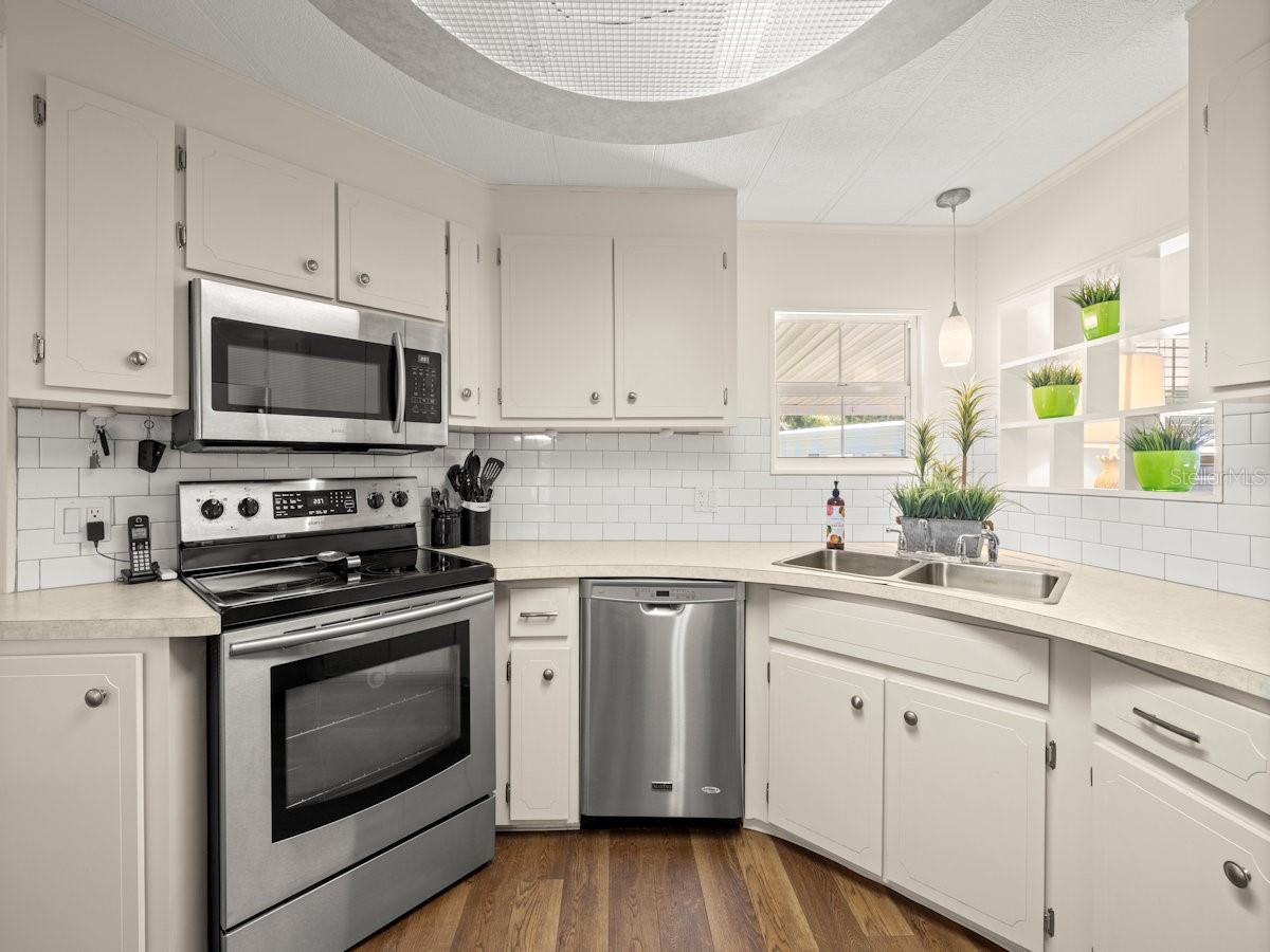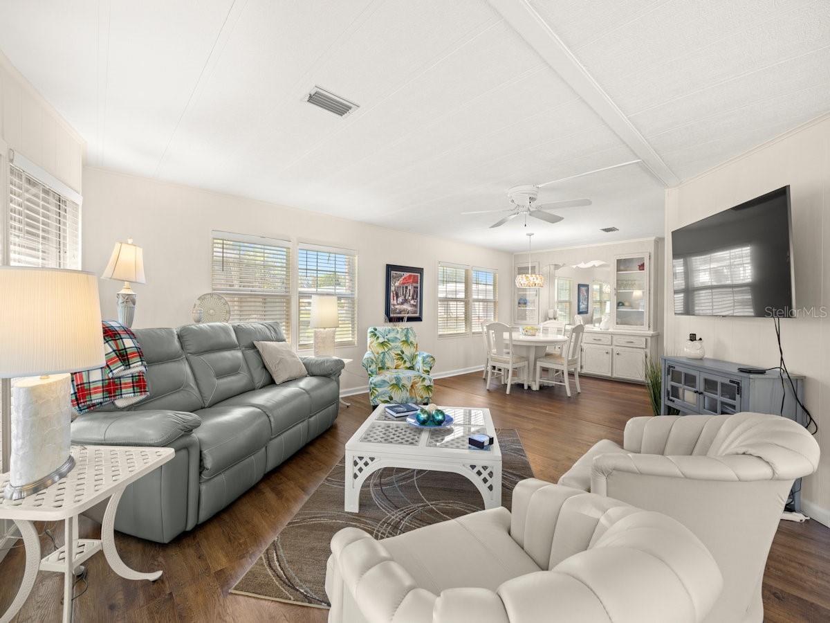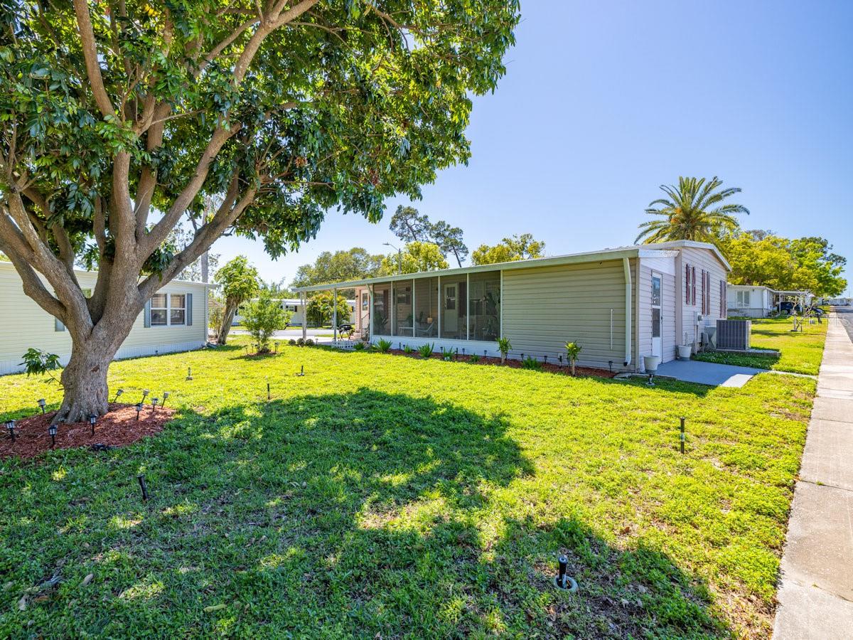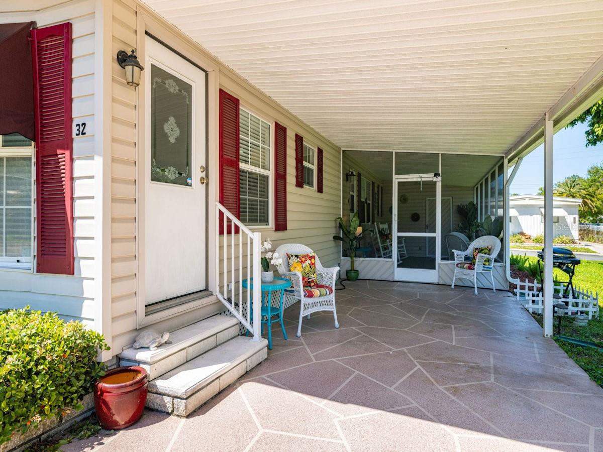 Palm Hill Country Club, a premier 55+ community, is where you will find this superb, manufactured home located in a peaceful, less traveled section called the Forest. It sits on an especially generous sized corner lot. This 1,297 sq ft two bedroom, two bath home has a side screen room-a perfect spot to enjoy morning coffee while relishing the early morning sunshine. This is also a good spot to enjoy one of Palm Hill’s nearby ponds with its glimmering fountain. Owners and renters find much to do to keep active. From pools, golf, pickleball, tennis, shuffleboard, clubs, dances, and other clubhouses activities, no one stays a stranger for long. One monthly fee covers lawn care, water, sewer, trash removal, recycling, internet and cable. Light from the generous size front bay windows and the generous placed side windows bring sunshine inside. The soft colored walls create a comfortable setting for easy Florida living. Laminate floors throughout complete the contemporary look and make for easy cleaning. Stylish furnishings throughout the home will remain for the buyers. These are observable details found throughout 32 Palm Forest Drive. The stainless appliances are all updated. Soft colored backsplash, newer hardware, and laminate floors present a pleasant kitchen. The kitchen flows naturally to the remainder of the living area. The current owners use the area directly beyond the kitchen as a family room or den. On the other side is the sit-down dining area with its convenient built in hutch for displaying trinkets and drawer space. The enormous living area covers the remainder of the living space. All the furnishings will remain with the home for new owners. The furnishings are upscale and complement the flooring and pale wall color. A door at the far end of the room leads outside. The updated primary bedroom is at the far end of the home. There is plenty of closet space with the two closets (one being walk-in.) The round ceiling light and fan stand out. Furnishings are all updated. The ensuite bath is refreshed with new vanity, Corian counter, toilet, and gorgeous shower and tile. The large guest bedroom is also nicely equipped and lies across from the guest bath with tub with shower. Doors, closets in the bedrooms, and throughout the main living area have modern six panel doors. Hallways occupy little space in the home emphasizing the roominess of the property. Ceiling fans in the living area, and both bedrooms distribute air flow for comfortable living. A new a/c was installed in February of 2022. Nothing left to do here -bring your personal items and move right in. Driving to 32 Palm Forest Drive you will want to stop your car and take note of the space between properties on this cul-de-sac. The amount of space around this home is exceptional. The home really stands out. This one has a roof over, light colored siding, and front bay windows with red shutters. The carport leads to the lowered screen room with an adequately sized storage shed featuring a two-month new washer and a dryer. No need to go outside for laundry as you can to step from the screen room into the home. What you can’t see is the vapor barrier which was redone approximately six years ago. Whether you are looking for a full-time home or an exceptional winter home this property is well worth your consideration. The list price includes one share in the community. Please call for a private viewing.