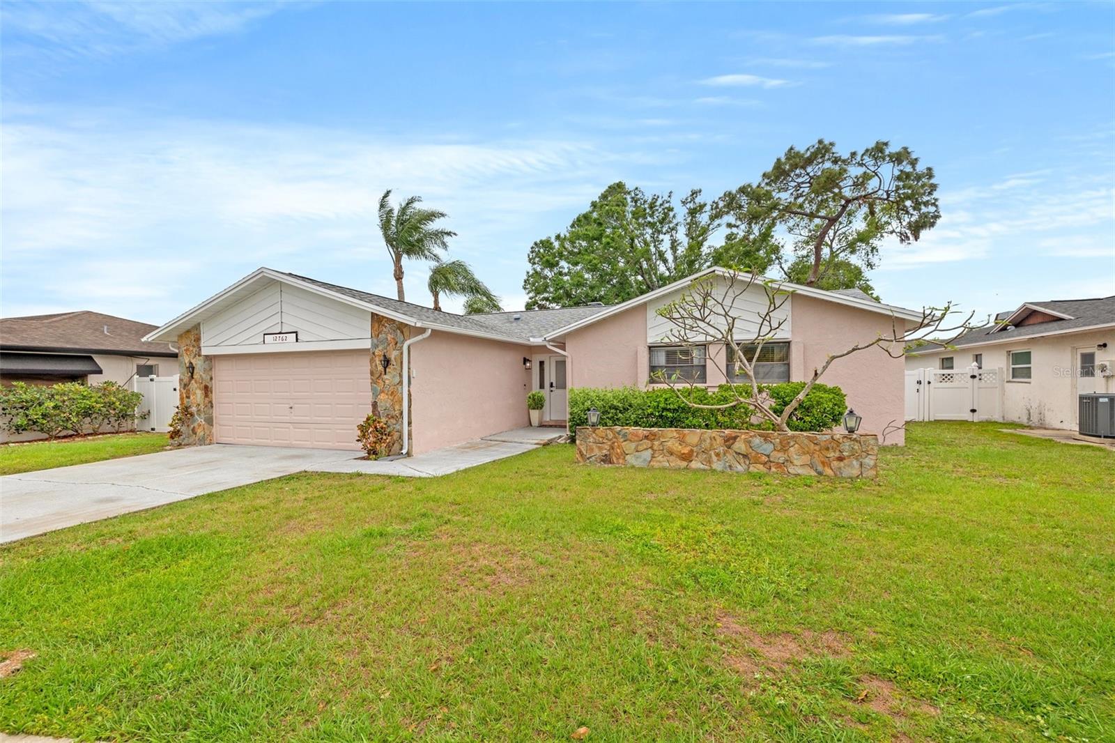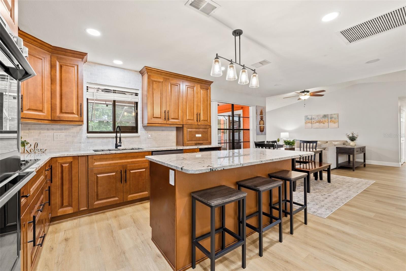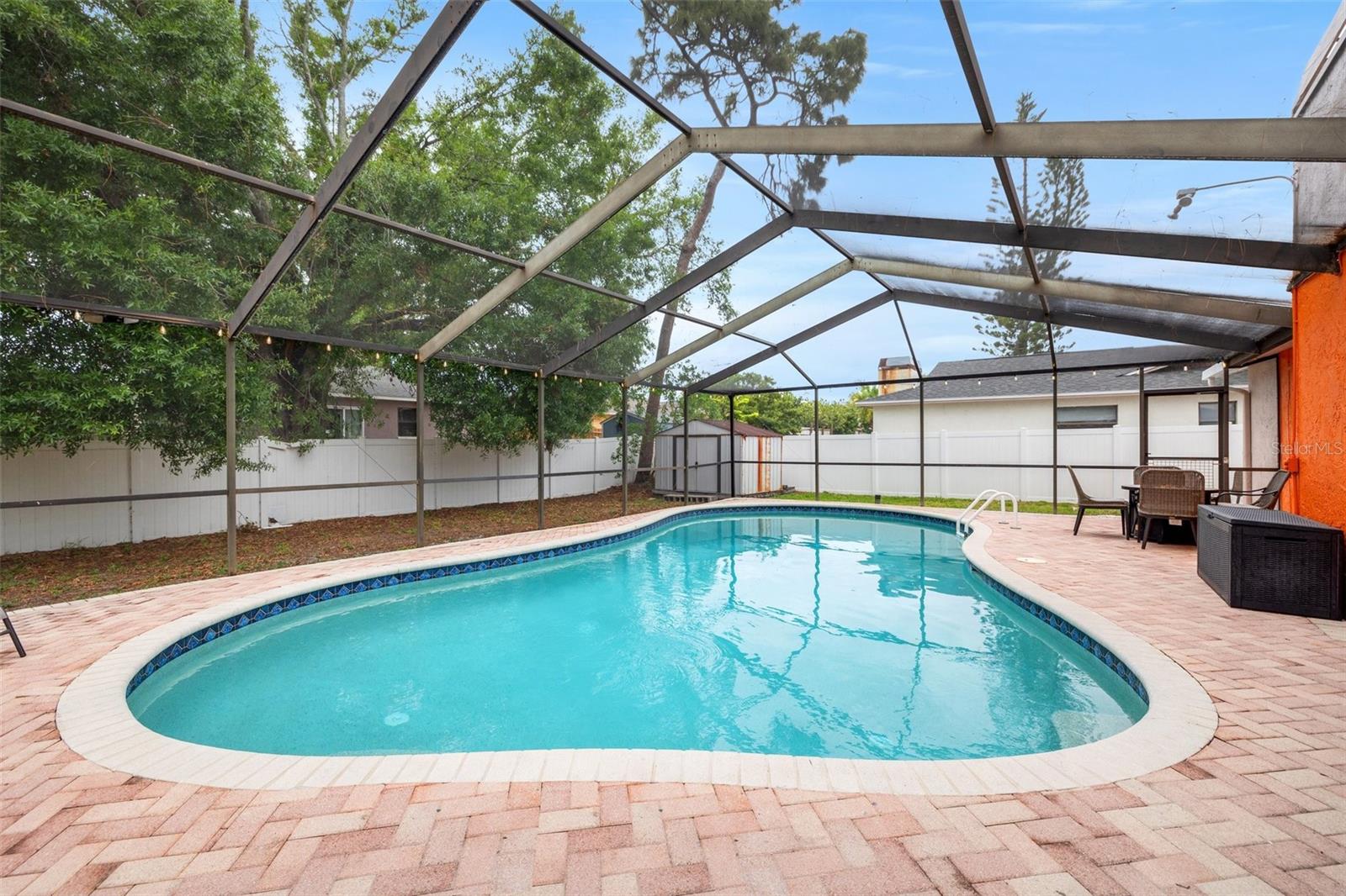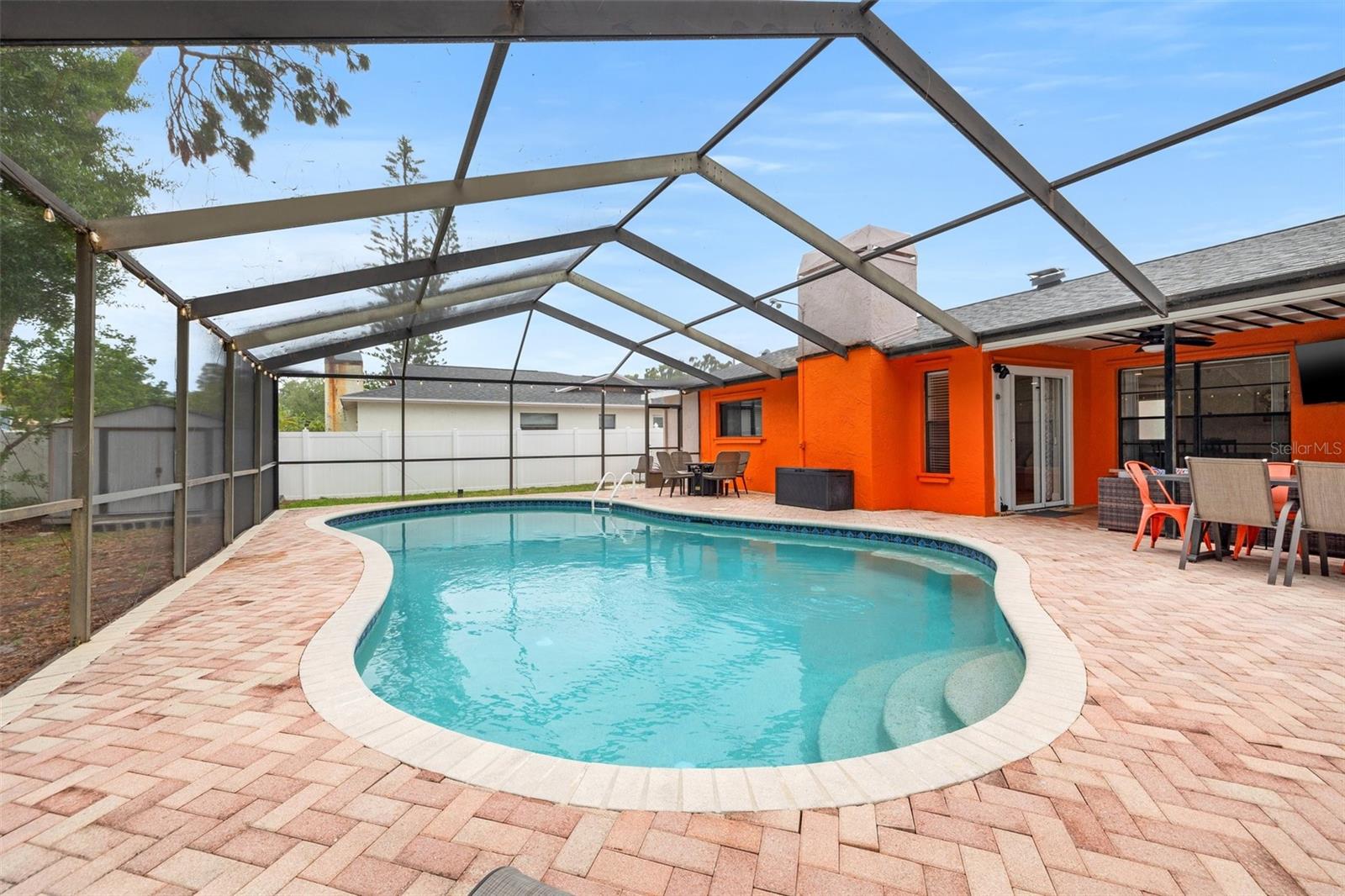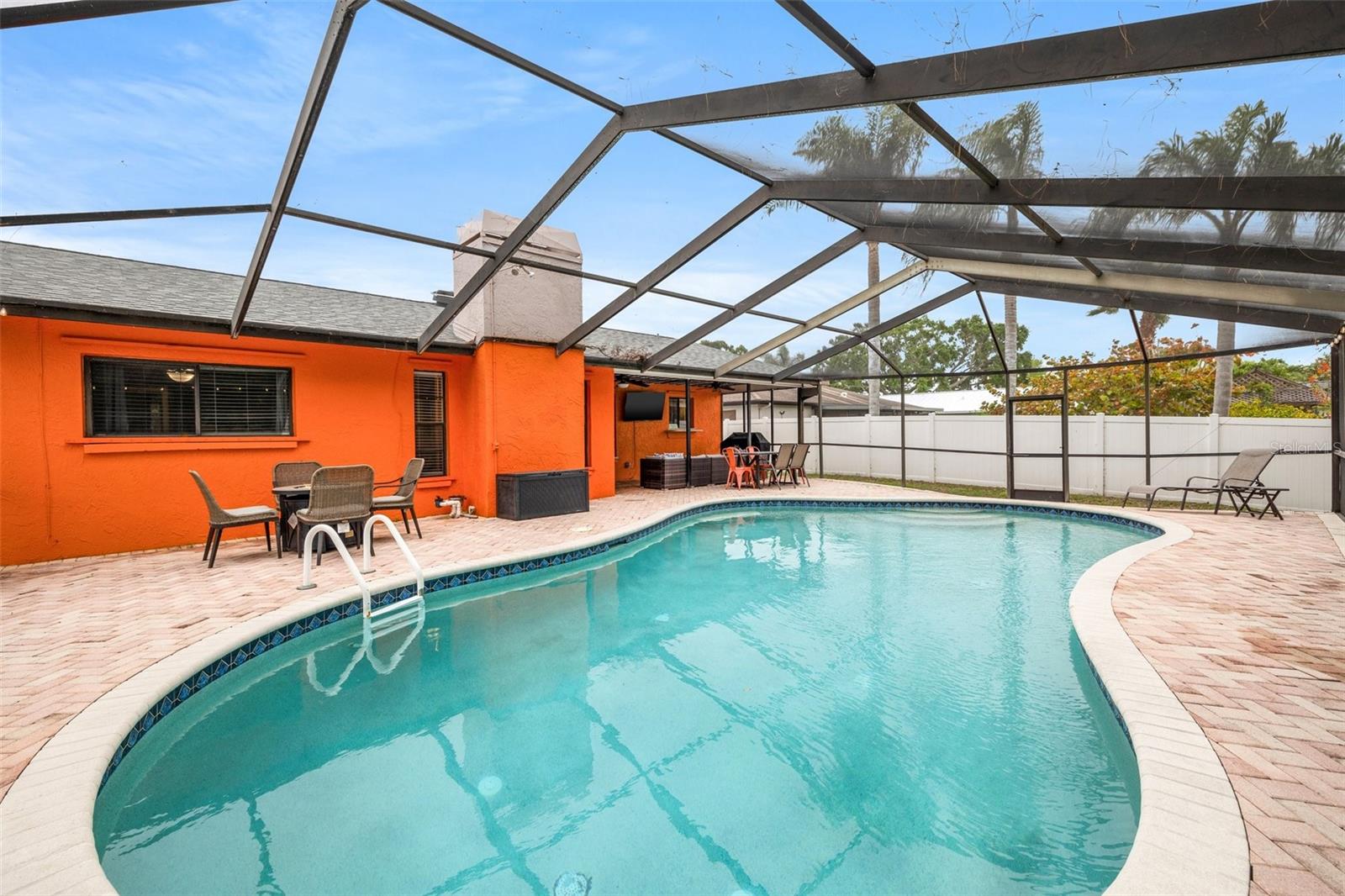 Welcome to this beautifully updated 3-bedroom, 2-bathroom pool home nestled in the peaceful, hidden gem of Blue Water Cove. This property perfectly combines comfort, convenience, and true Florida living. The spacious open-concept layout features a large living room with vaulted ceilings and a cozy wood-burning fireplace, creating a bright and airy atmosphere. The chef-inspired kitchen has custom wood cabinetry, sleek granite countertops, and top-of-the-line Samsung stainless steel appliances, including a double oven and a concealed pantry for extra storage. The generous primary bedroom includes a private en-suite bath and a walk-in closet. The two additional bedrooms are spacious and share a well-appointed hall bath. Step outside to your own private oasis—an expansive outdoor living space complete with a covered seating area, a screened lanai, and a sparkling pool. Whether you're soaking up the sun, hosting a BBQ, or winding down at the end of the day, this pool area has it all. Best of all, there’s no HOA and has no rental restrictions, offering easy access to pristine Gulf Beaches, local shops, dining, parks, and more.