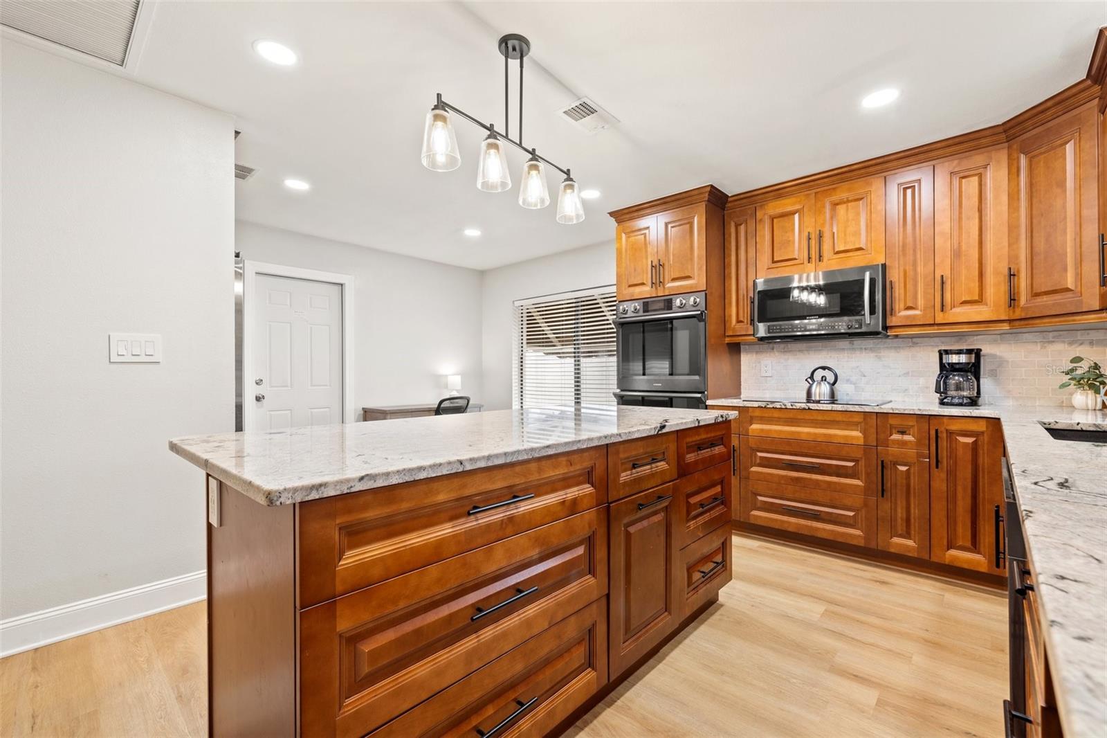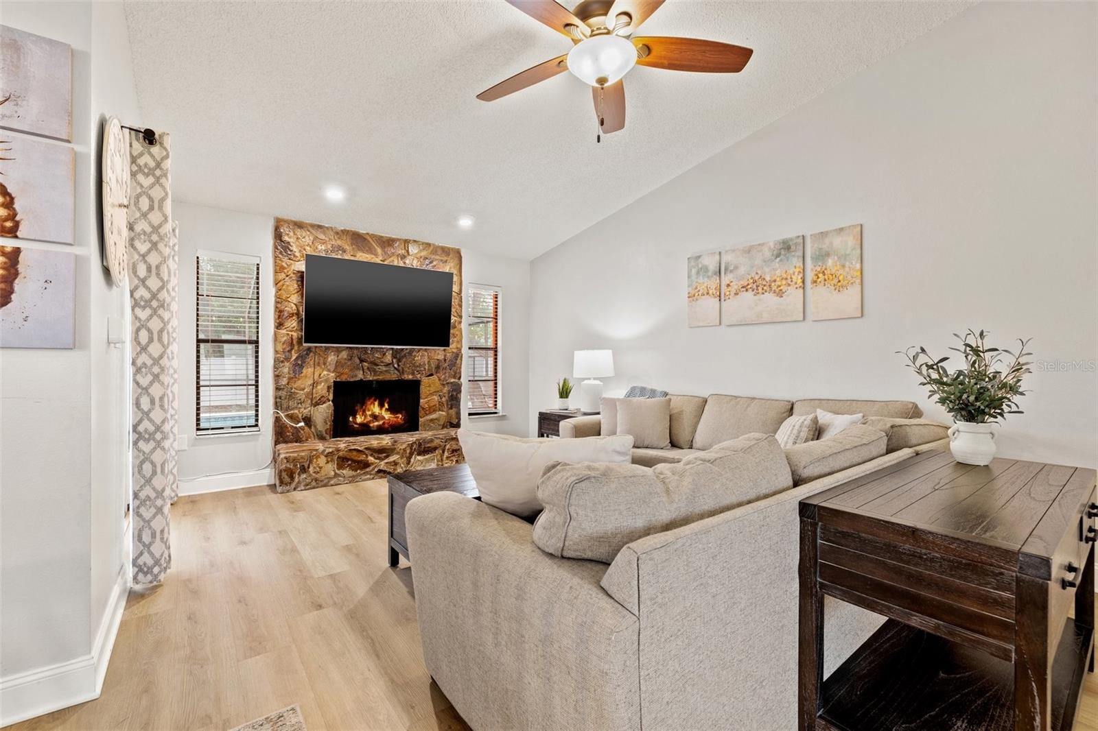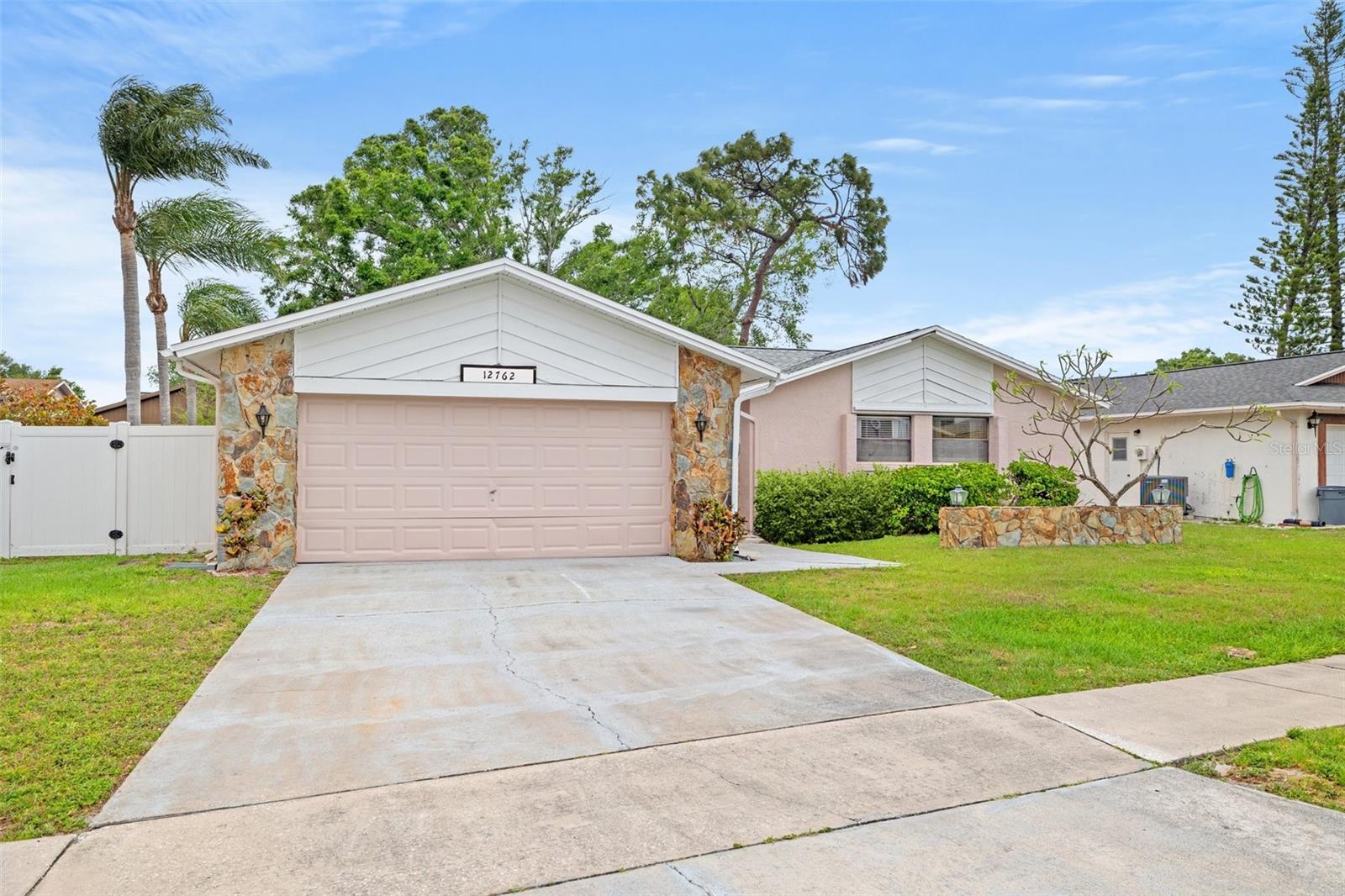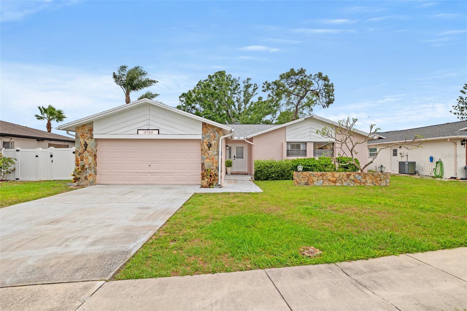 Welcome to this beautifully updated 3-bedroom, 2-bathroom pool home nestled in the peaceful, hidden gem of Blue Water Cove. This property perfectly combines comfort, convenience, and true Florida living. The spacious open-concept layout features a large living room with vaulted ceilings and a cozy wood-burning fireplace, creating a bright and airy atmosphere. The chef-inspired kitchen has custom wood cabinetry, sleek granite countertops, and top-of-the-line Samsung stainless steel appliances, including a double oven and a concealed pantry for extra storage. The generous primary bedroom includes a private en-suite bath and a walk-in closet. The two additional bedrooms are spacious and share a well-appointed hall bath. Step outside to your own private oasis—an expansive outdoor living space complete with a covered seating area, a screened lanai, and a sparkling pool. Whether you're soaking up the sun, hosting a BBQ, or winding down at the end of the day, this pool area has it all. Best of all, there’s no HOA and has no rental restrictions, offering easy access to pristine Gulf Beaches, local shops, dining, parks, and more.