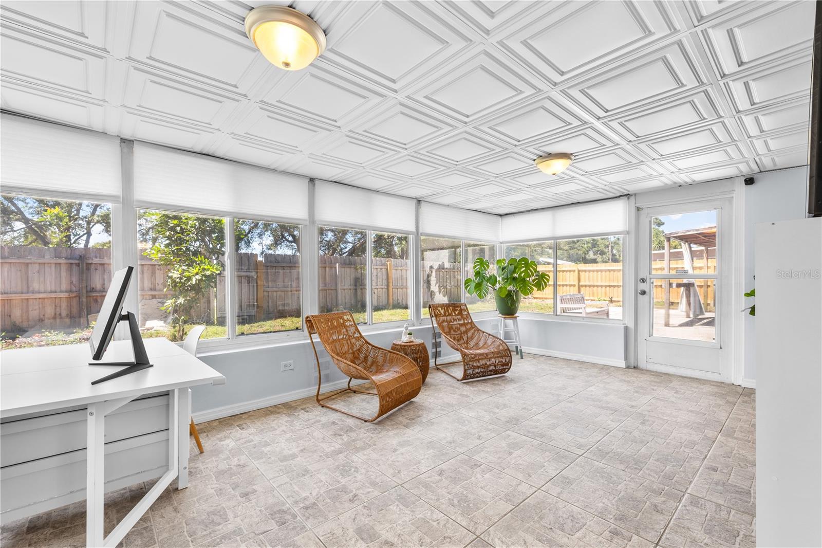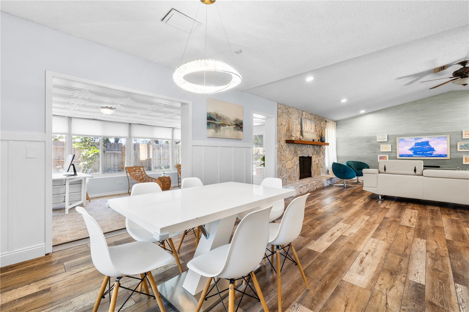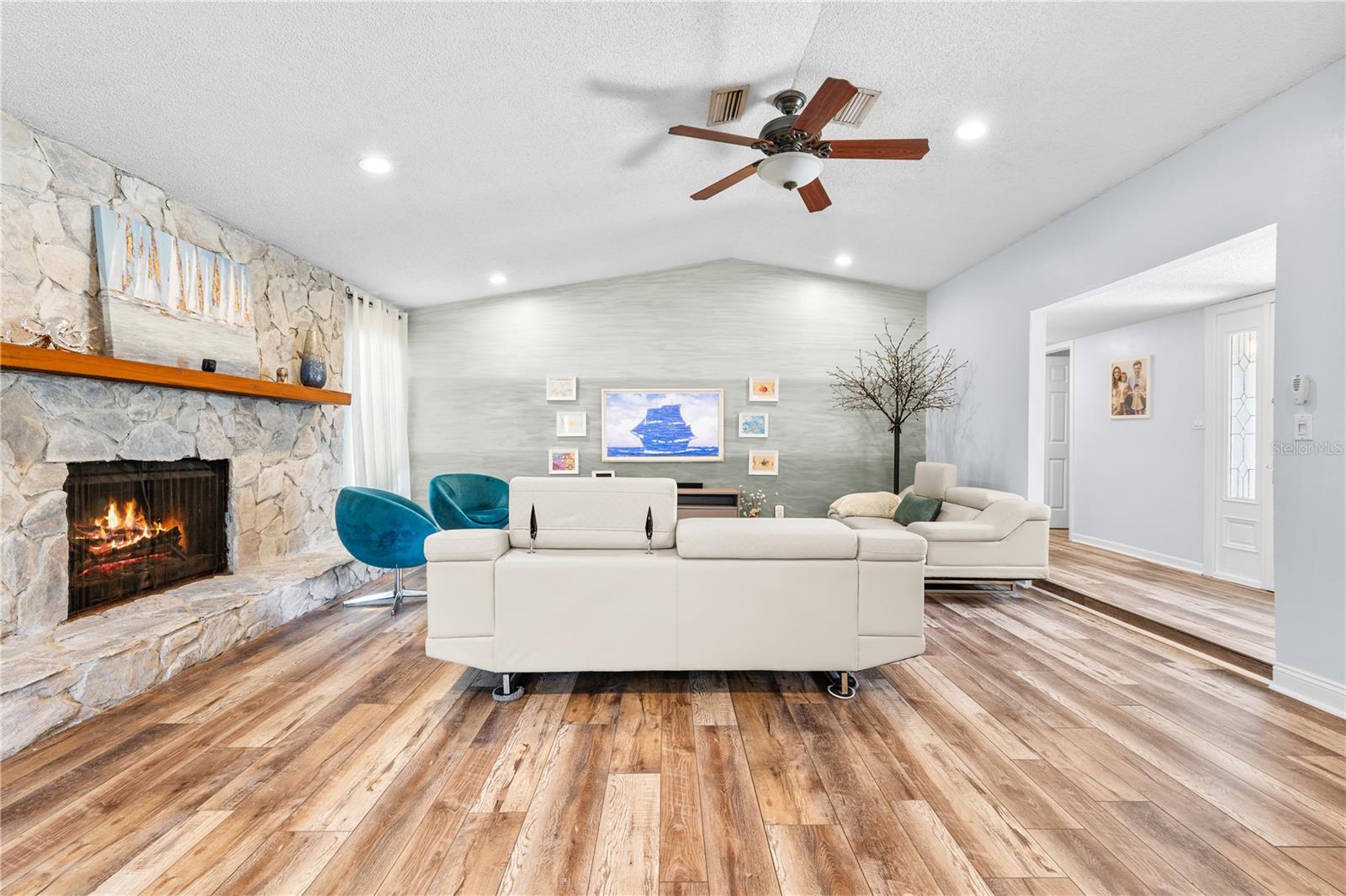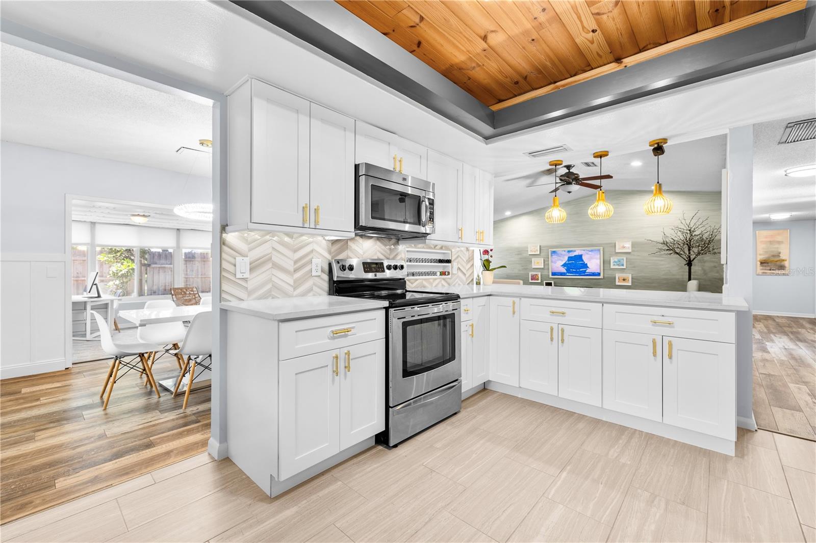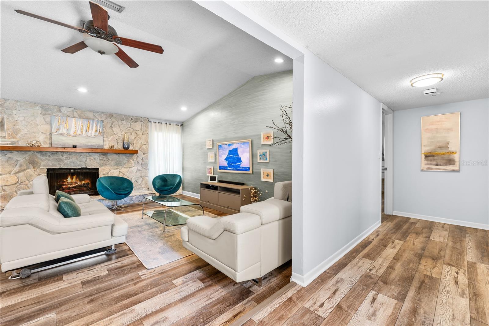 Welcome to your dream home in the heart of Largo! This stunning 2-bedroom, 2-bath gem effortlessly blends modern upgrades with tranquil Florida living — featuring an open-concept layout, designer finishes, and a versatile Florida sunroom ideal for a work-from-home setup, yoga sanctuary, or playroom. Step into the fully remodeled kitchen, showcasing sleek white shaker cabinets, luxury quartz countertops, a dramatic chevron backsplash, and Whirlpool stainless steel appliances. Gold hardware and a custom wood-inlay ceiling with statement lighting add a magazine-worthy designer touch. The expansive living and dining area is perfect for entertaining — featuring wide-plank luxury vinyl flooring, custom wall paneling, and a cozy natural stone fireplace. Just off the dining space, the bright and airy sunroom boasts panoramic windows that flood the home with natural light — ideal for your morning coffee or creative escape. Your private primary suite features dual walk-in closets, a spa-inspired walk-in shower with dual shower heads, and contemporary tile work for a luxurious retreat. The secondary bedroom is spacious and adaptable — perfect for a nursery, guest room, or home gym, complete with a generous walk-in closet. Step outside into your private backyard retreat with a covered patio, Roof 2025, 5kw solar panels worth 20k, and plenty of space to create your own outdoor oasis — whether that’s a garden, fire pit, or pool. Calling all nature lovers! This home offers easy access to the Pinellas Trail and a large walking park with a scenic pond just around the corner. You're also minutes away from Walsingham Park, Florida Botanical Gardens, Indian Rocks Beach, Heritage Village, and countless biking, walking, and kayaking spots that define the Florida lifestyle. Stylish, turnkey, and move-in ready, this home has it all — comfort, design, location, and a connection to nature. Don’t miss your chance to call this Largo beauty your next home. ?? Schedule your private showing today — homes this special go fast!