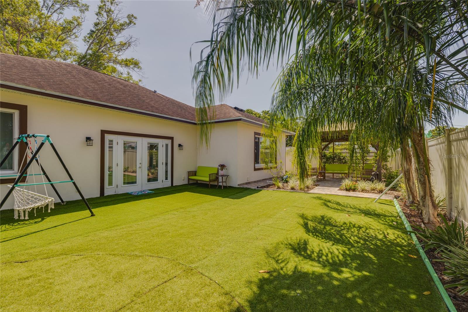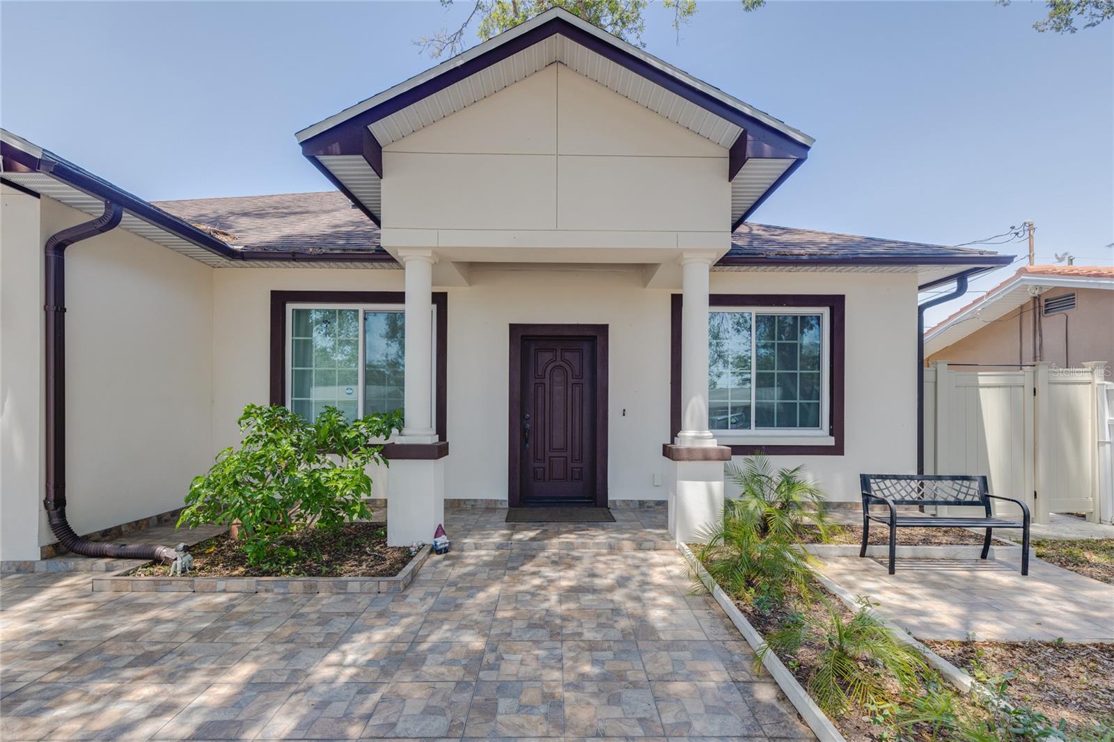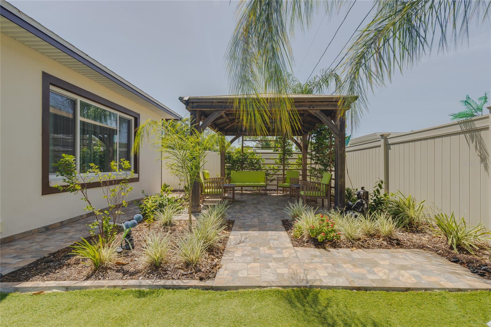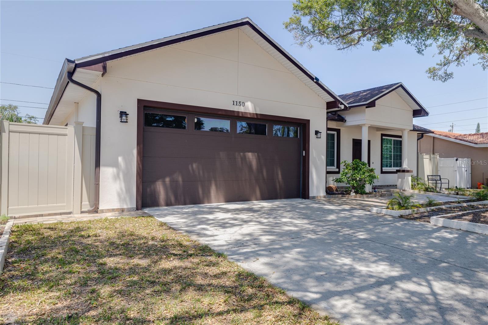 Welcome to your dream home in the heart of Largo! This beautifully maintained, newer construction residence offers the perfect blend of modern design, thoughtful layout, and a prime location just minutes from the beach. Built in 2017, this three-bedroom, two-bathroom home features soaring vaulted ceilings and an airy, open feel from the moment you walk through the door. A welcoming reception room at the entrance provides a private space to greet guests without stepping directly into the heart of the home — a rare and convenient feature that offers both privacy and comfort. The spacious kitchen is a true showstopper, boasting sleek European-style glossy cabinetry, quartz countertops, and built-in stainless steel appliances. A large center island serves as the perfect gathering spot for entertaining, cooking, or simply enjoying meals with family and friends. Elegant new tile flooring flows seamlessly through the main living areas, while the bedrooms are finished with warm wood flooring, adding a touch of natural beauty. Designed with a desirable split floor plan, the luxurious primary suite offers a peaceful retreat with a spa-like bathroom featuring a freestanding soaking tub, a glass-enclosed shower, dual vanities with quartz countertops, a private water closet for added privacy, and an oversized walk-in closet to accommodate all your wardrobe needs. Two additional bedrooms are located on the opposite side of the home and share a beautifully appointed full bathroom, offering comfort and space for family members or guests. French doors lead to a charming, low-maintenance backyard complete with lush turf and a stylish gazebo — a perfect setting for relaxing evenings under the stars. The owners have thoughtfully installed a professional drainage system, ensuring the backyard remains dry and enjoyable even after heavy rains. Hurricane-impact windows provide peace of mind and energy efficiency year-round. The fully fenced backyard offers privacy and space to play, garden, or simply unwind. Additional features include a private sauna for two located in the spacious two-car garage, and an extended driveway offering ample room for extra parking. This home is free from HOA and CDD fees and is located outside of any flood zone, providing true worry-free living. Conveniently situated just twelve minutes from the award-winning Gulf beaches, this home is within walking distance to the Highland Recreation Center, which offers amenities such as a gym, aquatic center, tennis courts, and more. Largo Central Park and the Largo Public Library are just a two-minute drive away, and Sprouts Farmers Market is around the corner. You’ll also enjoy quick access to downtown Largo, top-rated schools, city amenities, Tampa International Airport, and St. Pete-Clearwater Airport. This is more than a home — it’s a lifestyle. Modern, elegant, and perfectly located, this home offers everything you need to live your best Florida life. Don’t miss the opportunity to make it Yours!