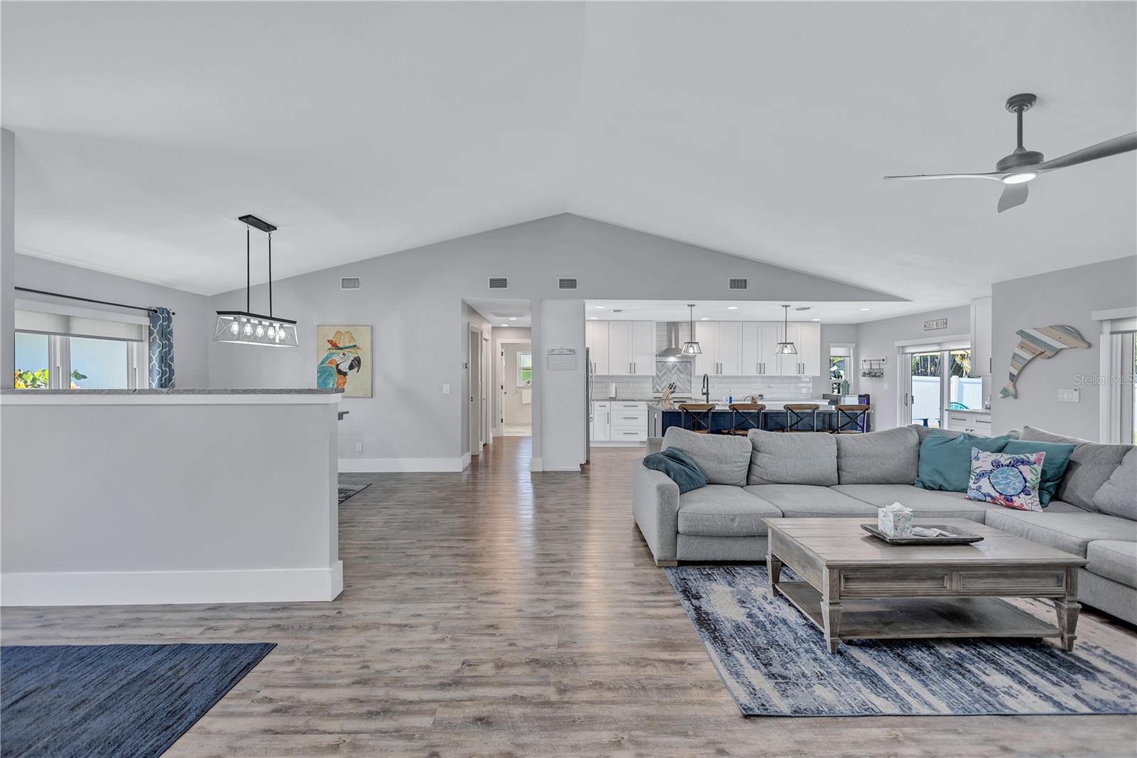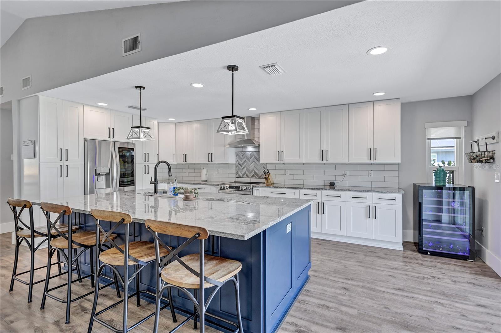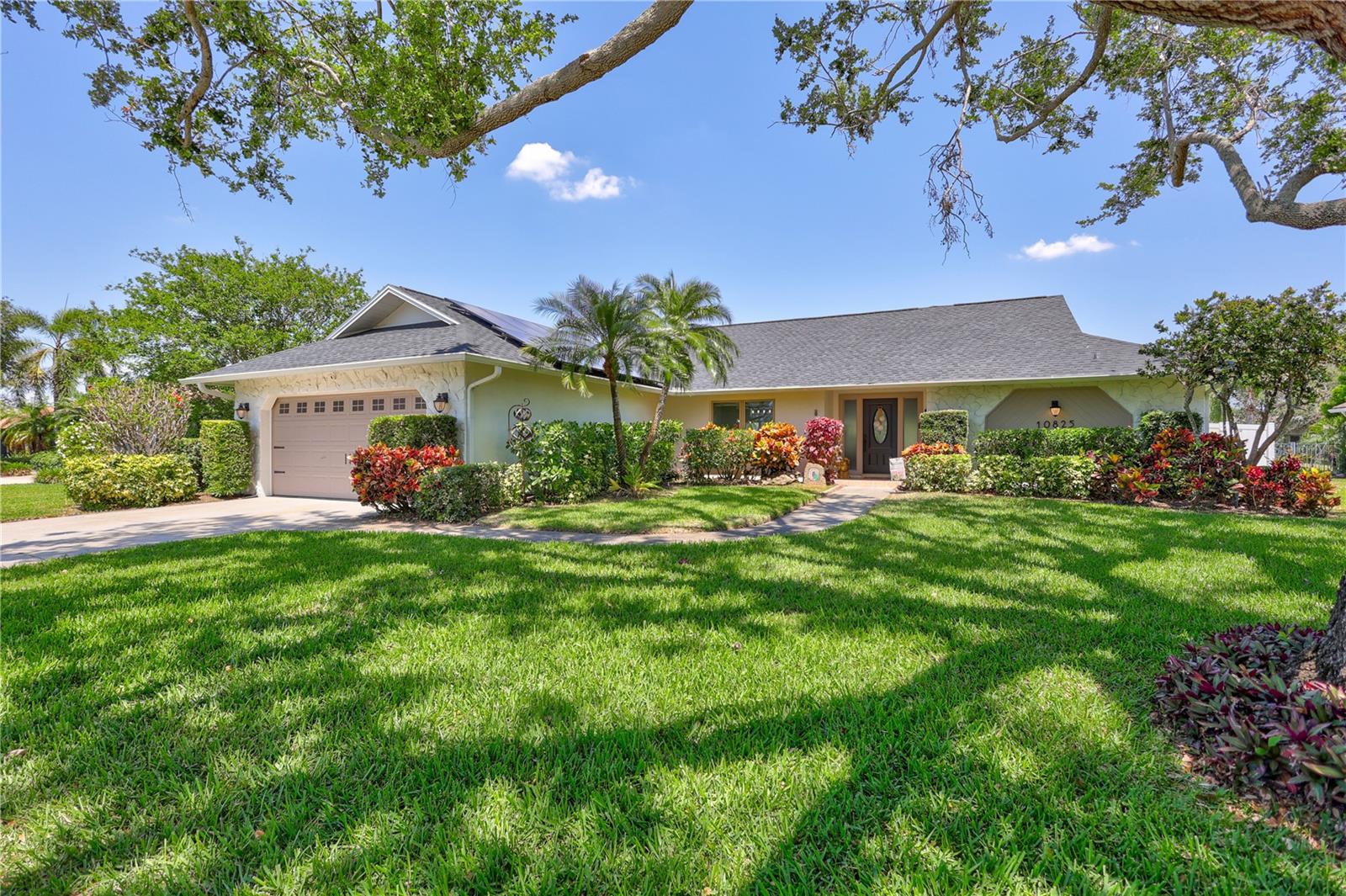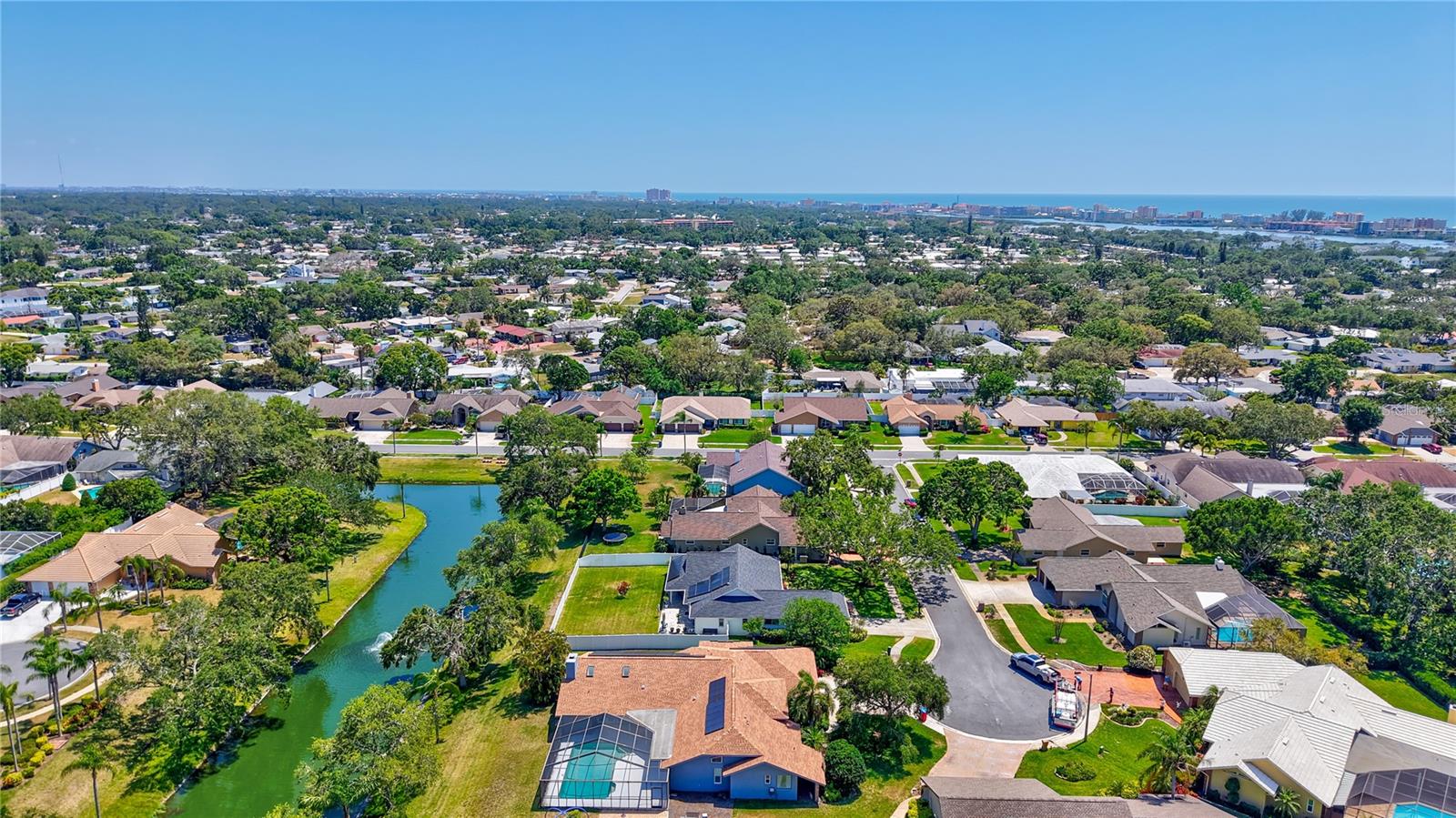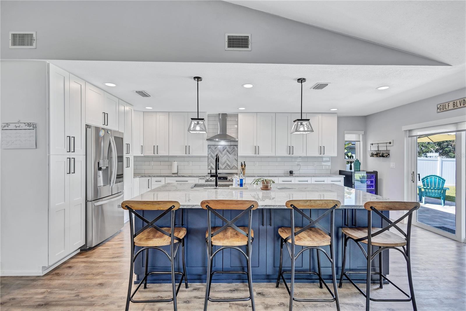 Coastal living meets modern comfort in the highly sought after neighborhood of Collins Estates. Homes in this neighborhood don't come up for sale too often and this is one you don't want to miss! Less than one mile from the sugar-sand beaches of Indian Rocks and NO FLOOD INSURANCE REQUIRED, this beautifully updated 3-bedroom, 2-bath home combines laid-back coastal vibes with thoughtful, modern upgrades. The completely renovated kitchen is a true standout—featuring an 8-foot island, miles of counter space, and the cabinet storage is extensive. Whether you're hosting friends or whipping up a quiet dinner, this space delivers. The open, split floor plan is ideal for entertaining, flowing seamlessly to the spacious back paver patio that overlooks a tranquil pond with a gorgeous fountain. Step outside and discover a massive backyard (87X131) with plenty of room to add a pool if you choose—create your dream outdoor oasis! Practical updates include a roof, A/C, solar, and appliances are less than 4 years old, plus the windows and doors were replaced in 2007 adding additional insulation and peace of mind. Whether you're searching for a forever home or the perfect beach retreat, this one truly has it all!