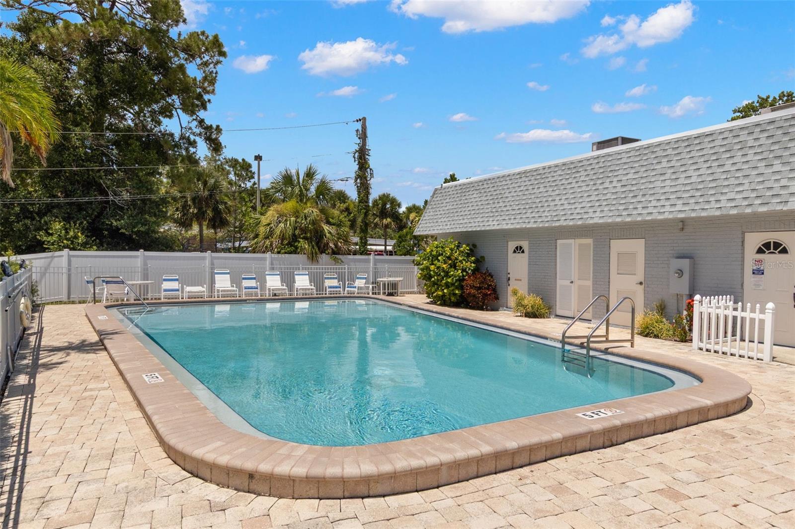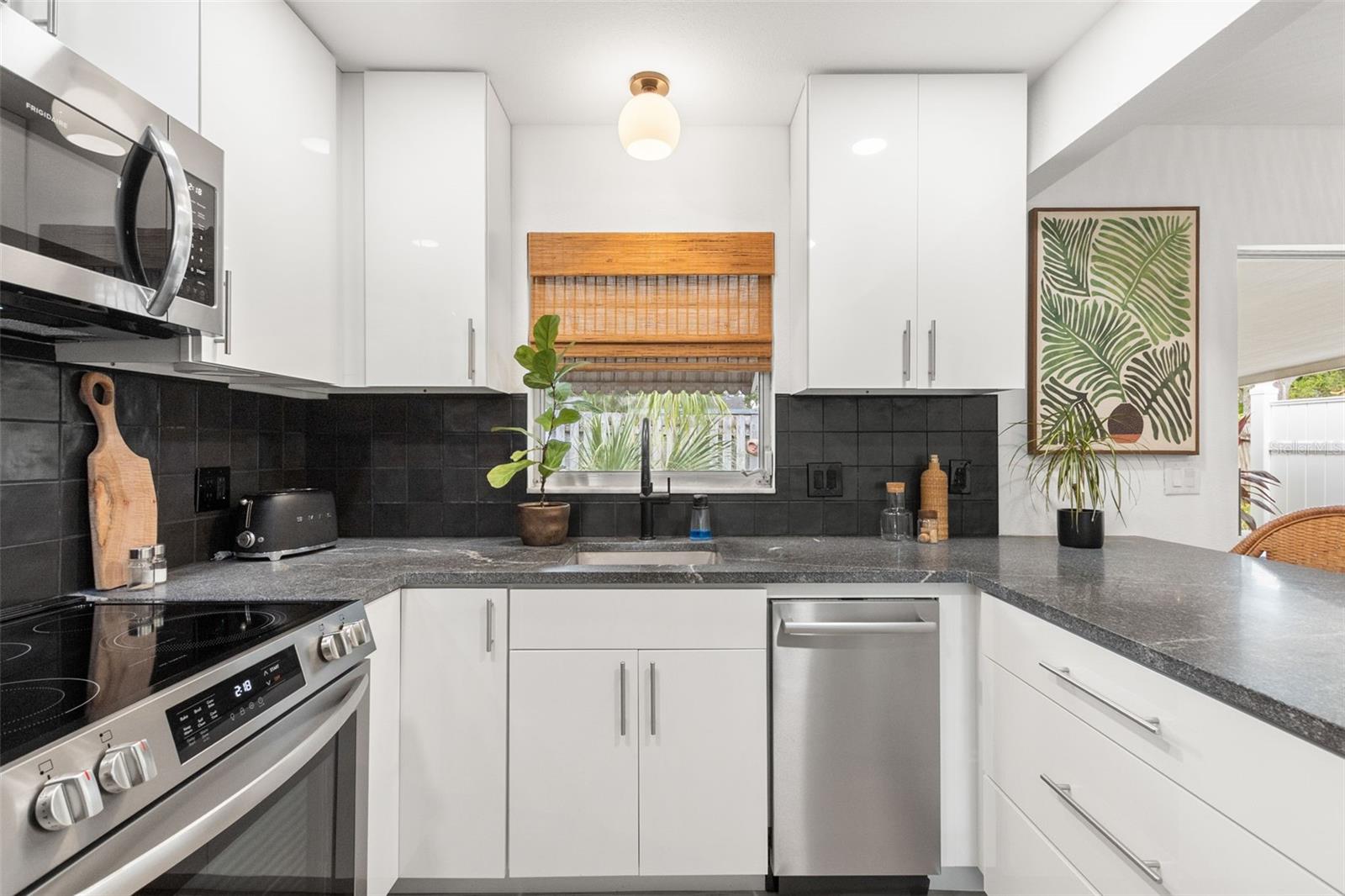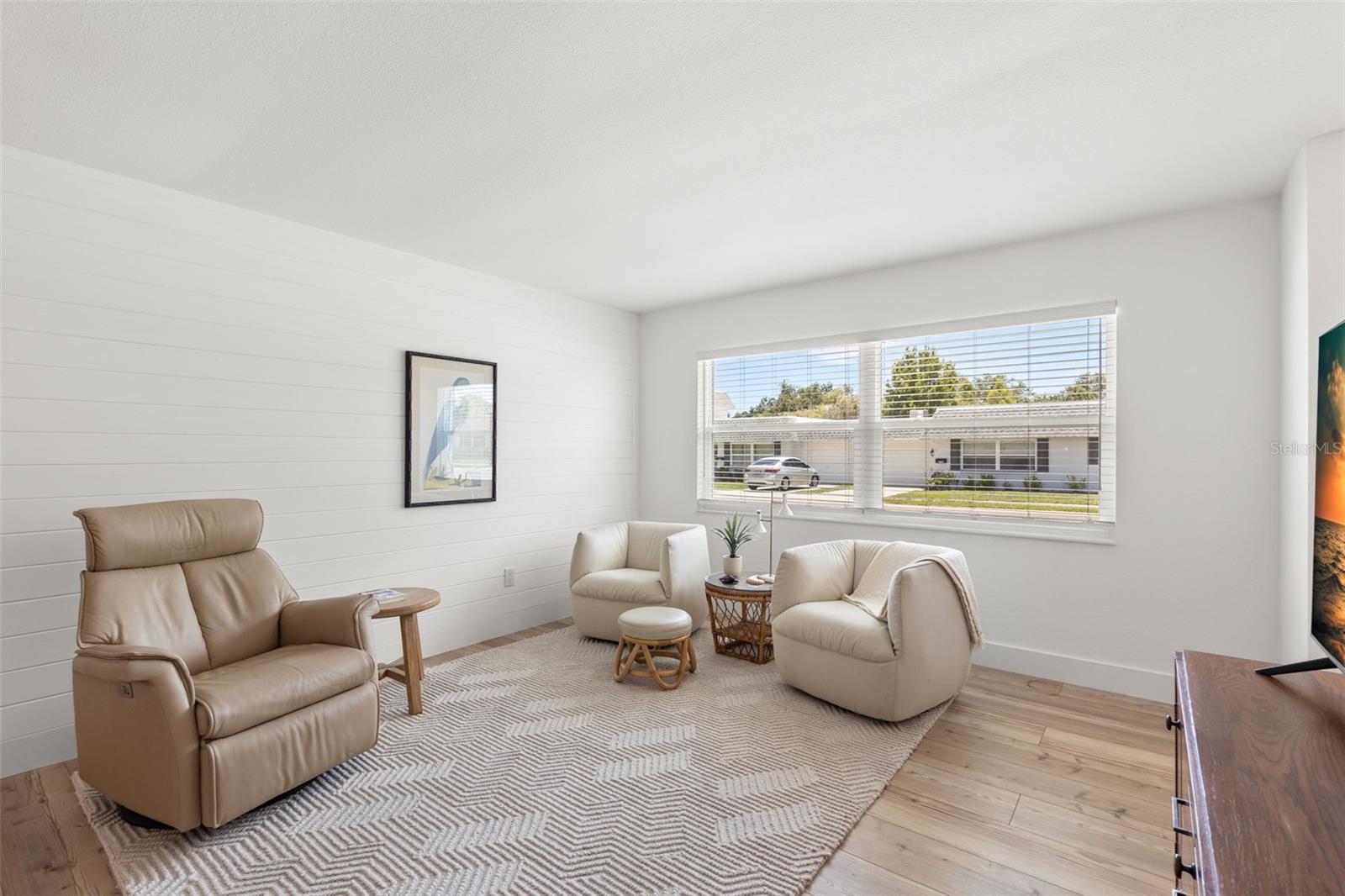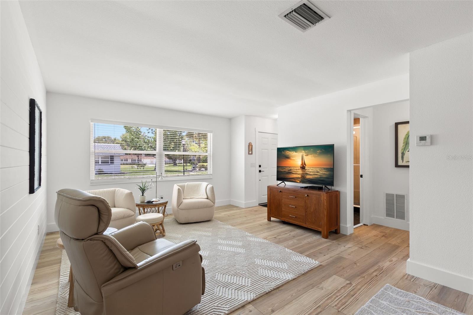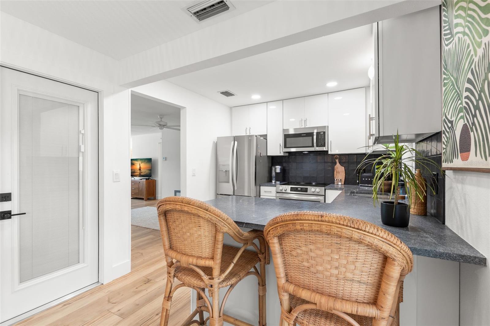 Your opportunity to be in the 55+ community of Rothmoor Estates!! A true gem, this 1BR/2BA/1CG villa style condominium has been almost completely renovated. Starting with impact rated front two windows and storm door, enter into the bright, freshly painted living room with a shiplap accent wall. You will immediately notice new luxury vinyl plank floors, 6" baseboards, retextured ceiling, ceiling fans, and hardware through out. A full bathroom off the living room has a new vanity and gorgeous tile shower with a clear glass barn style door. Nicely sized primary bedroom has plenty of closet space and attached bath with new vanity and refinished shower. Stunning kitchen has all new Kraft Maid cabinets, granite countertops, recessed lighting, stainless steel appliances, with an eat in dining area. Enjoy quiet mornings in your private back yard patio area. New electrical panel 2023, water heater 2023. Community amenities include pool, clubhouse, exterior maintenance, cable, internet, water, sewer, trash. Great central county location close to the beaches, shopping, and great restaurants. Tampa airport only 30 minutes away. Don't let this opportunity get away!!