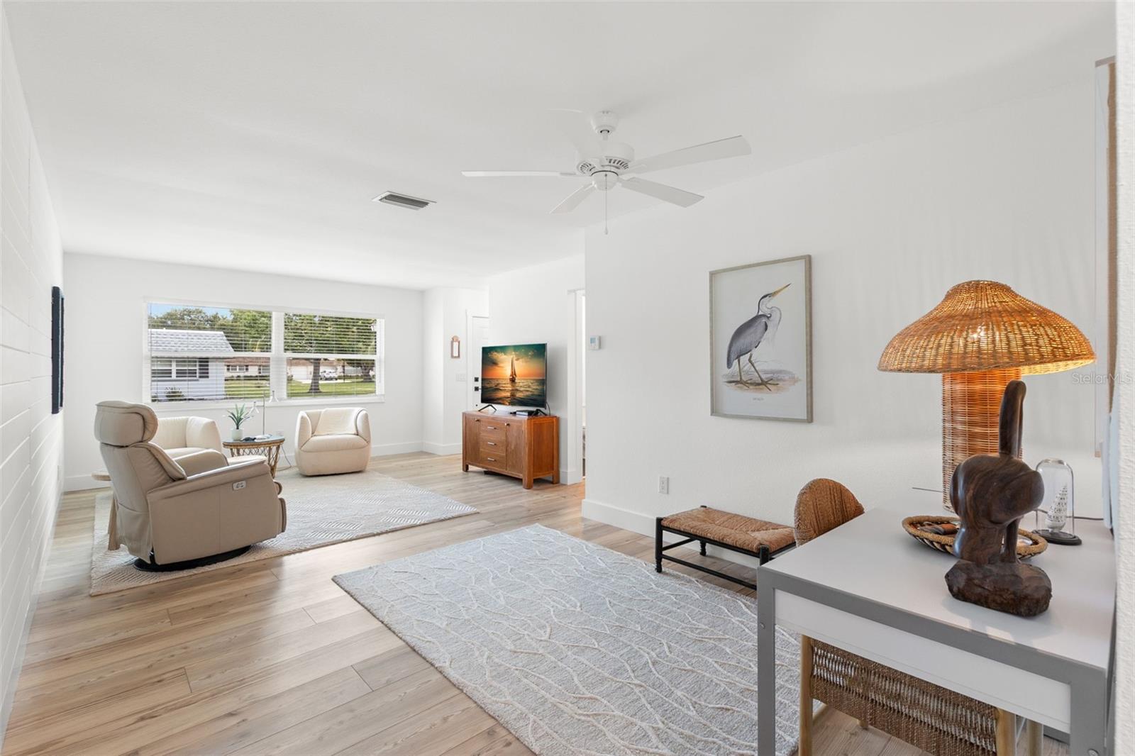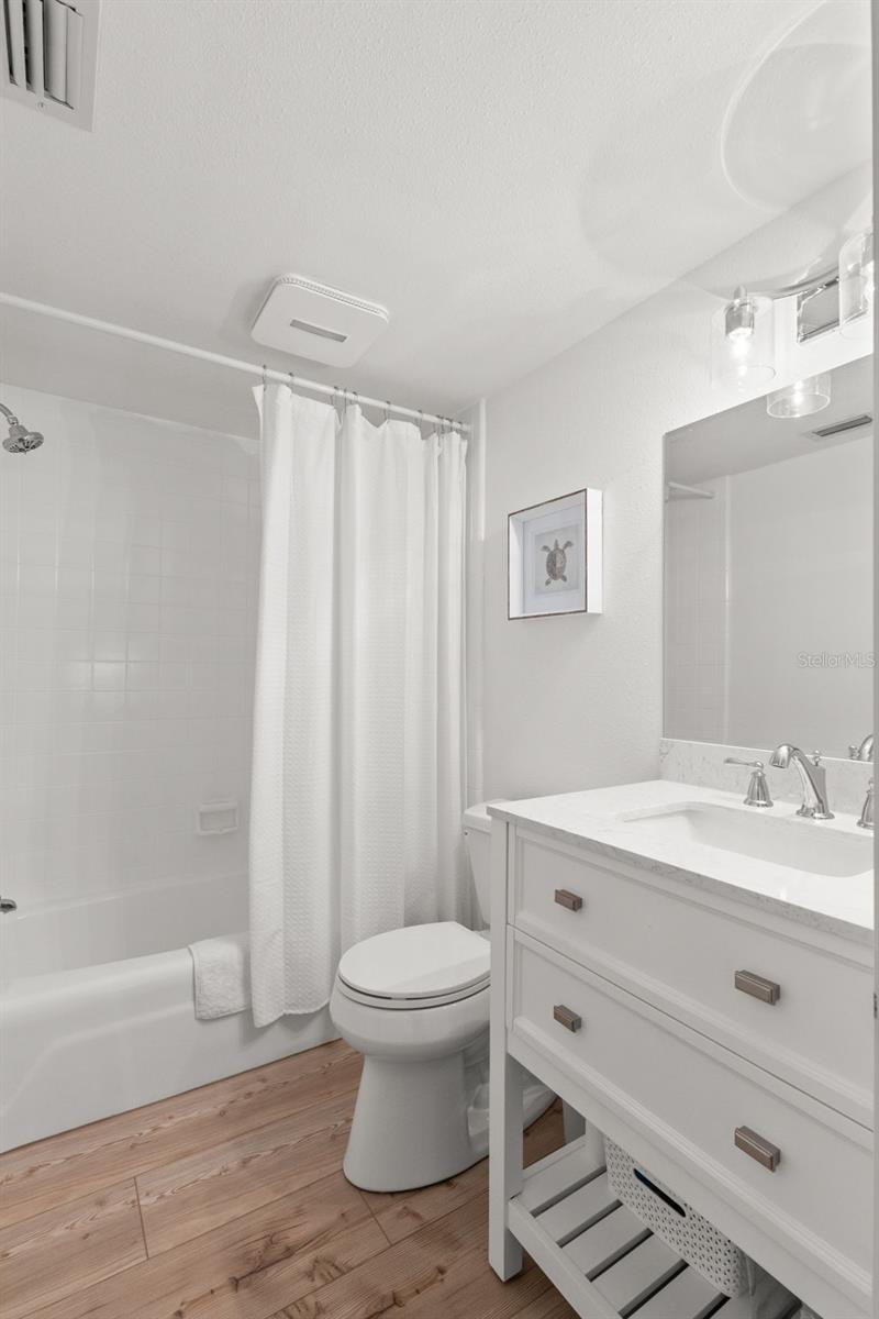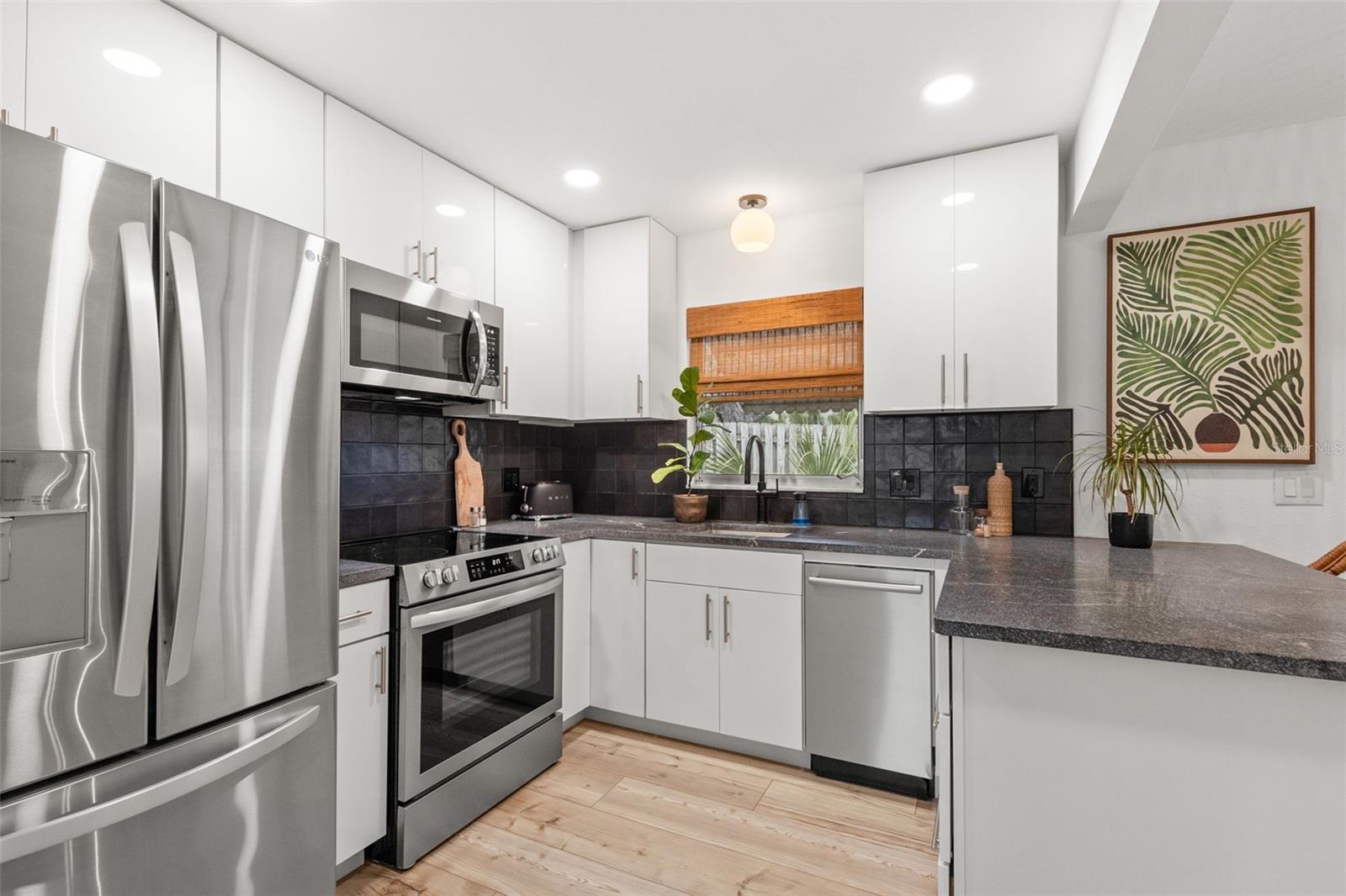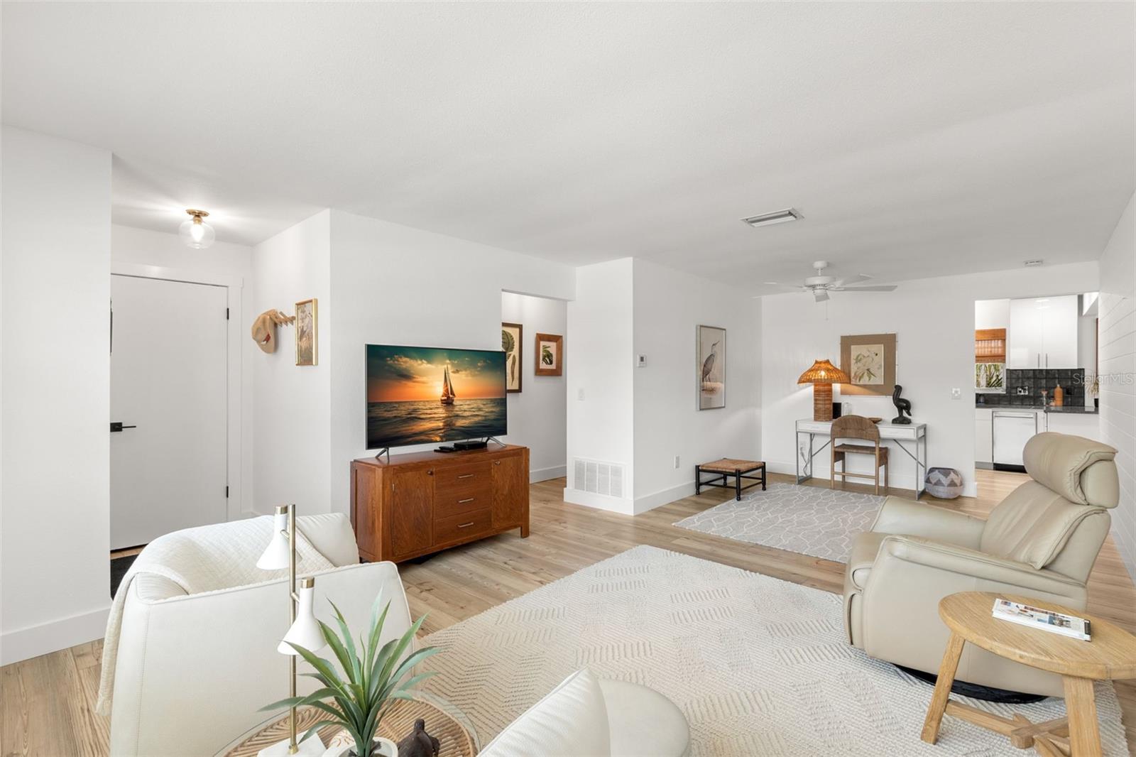 Your opportunity to be in the 55+ community of Rothmoor Estates!! A true gem, this 1BR/2BA/1CG villa style condominium has been almost completely renovated. Starting with impact rated front two windows and storm door, enter into the bright, freshly painted living room with a shiplap accent wall. You will immediately notice new luxury vinyl plank floors, 6" baseboards, retextured ceiling, ceiling fans, and hardware through out. A full bathroom off the living room has a new vanity and gorgeous tile shower with a clear glass barn style door. Nicely sized primary bedroom has plenty of closet space and attached bath with new vanity and refinished shower. Stunning kitchen has all new Kraft Maid cabinets, granite countertops, recessed lighting, stainless steel appliances, with an eat in dining area. Enjoy quiet mornings in your private back yard patio area. New electrical panel 2023, water heater 2023. Community amenities include pool, clubhouse, exterior maintenance, cable, internet, water, sewer, trash. Great central county location close to the beaches, shopping, and great restaurants. Tampa airport only 30 minutes away. Don't let this opportunity get away!!