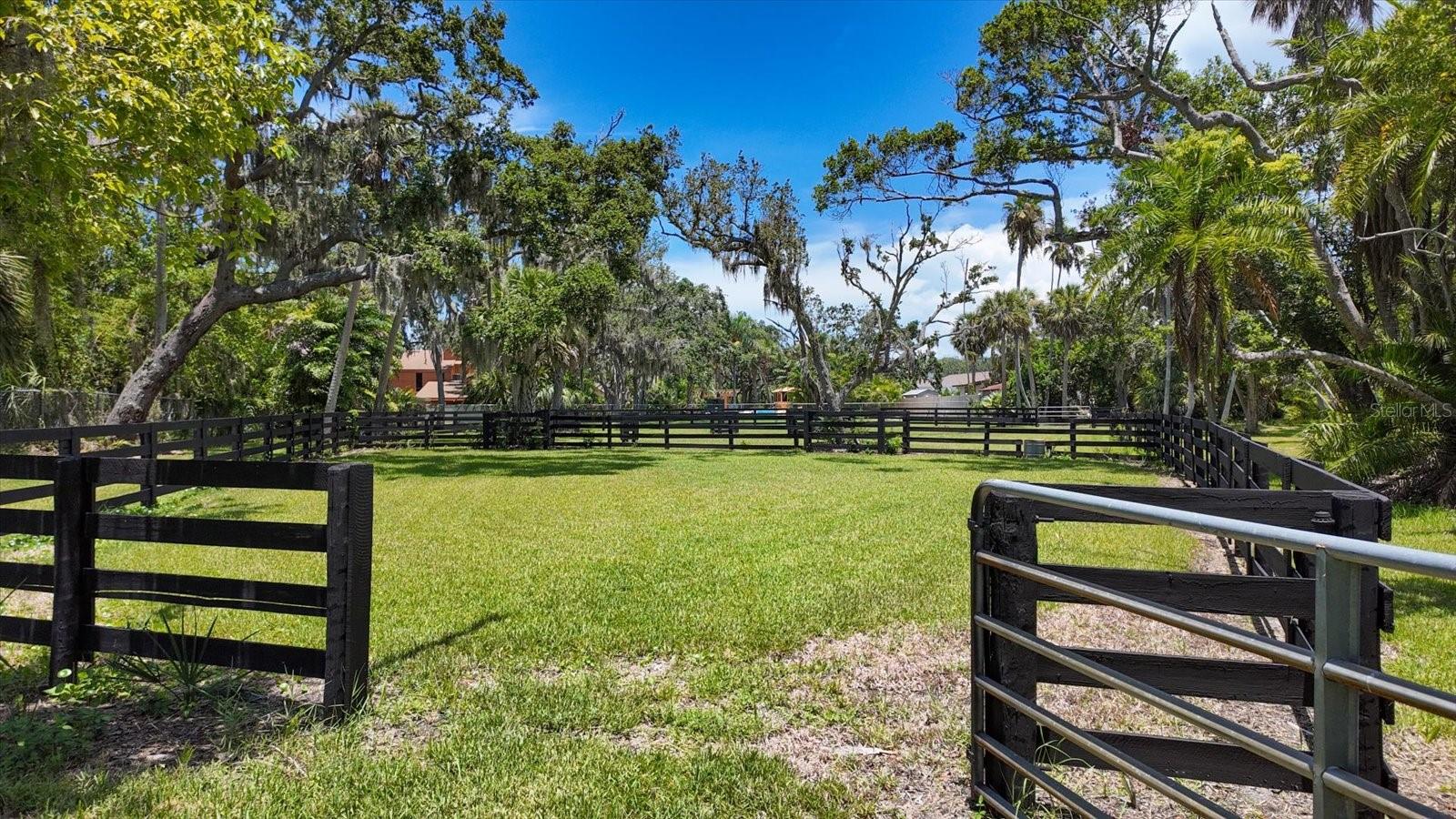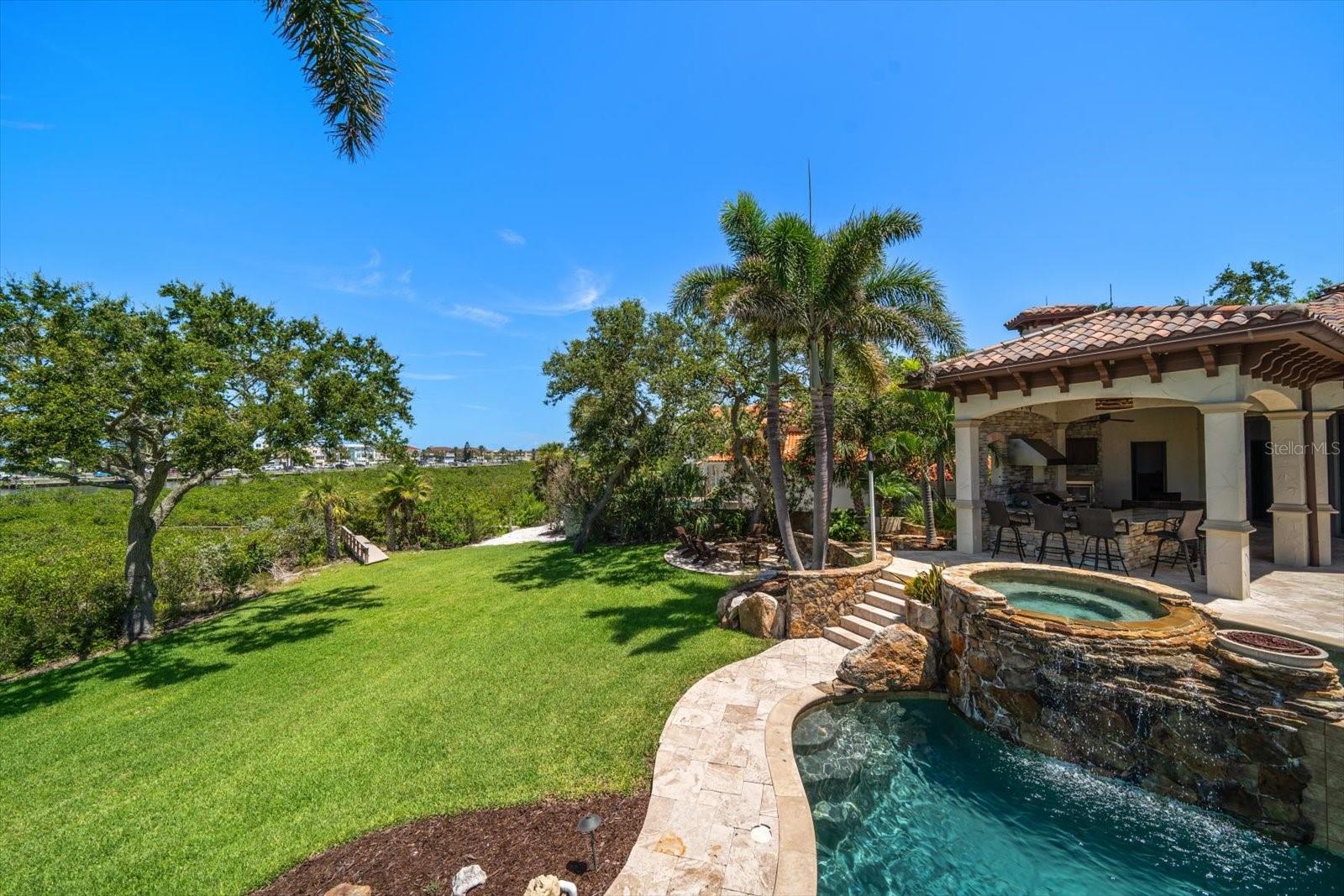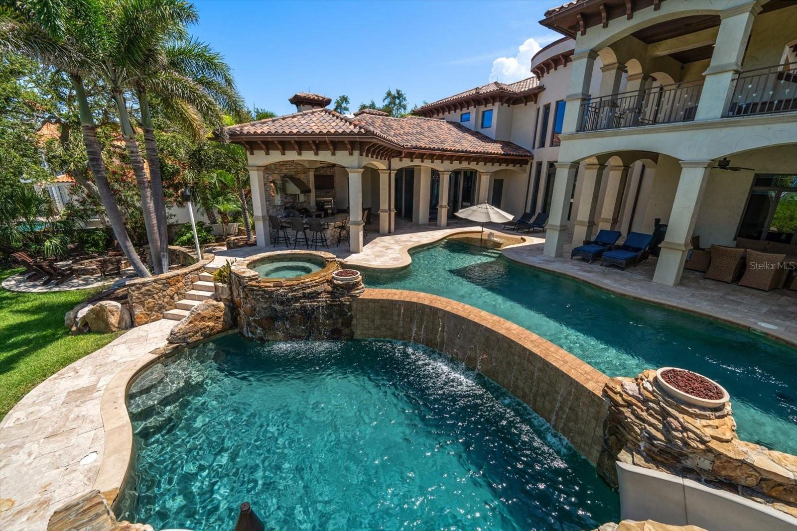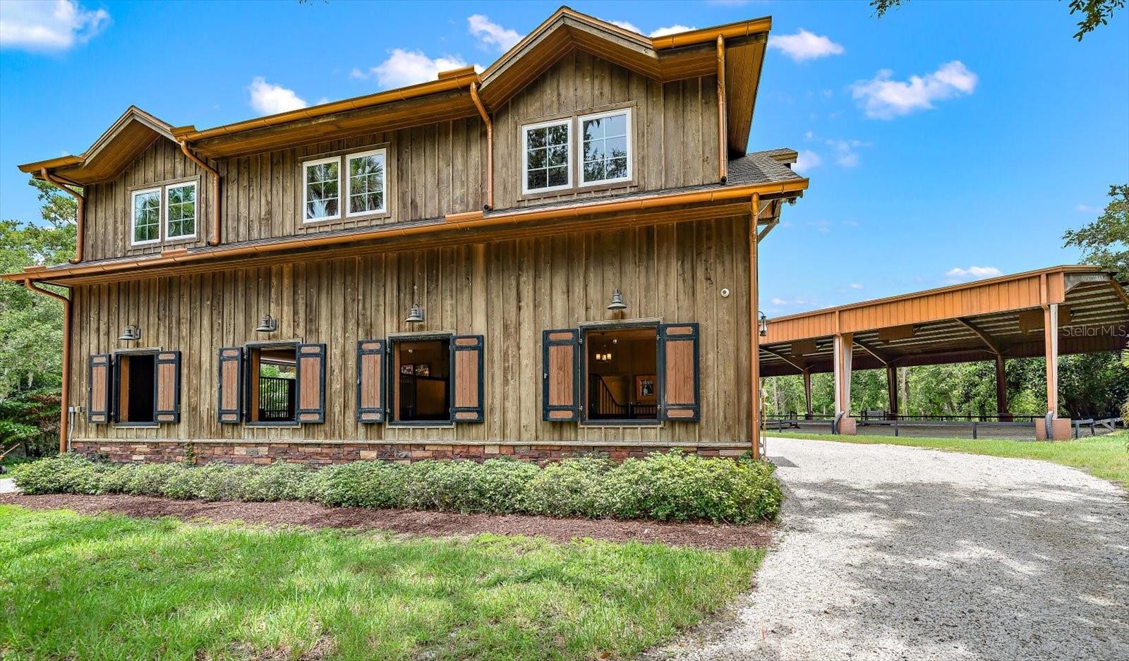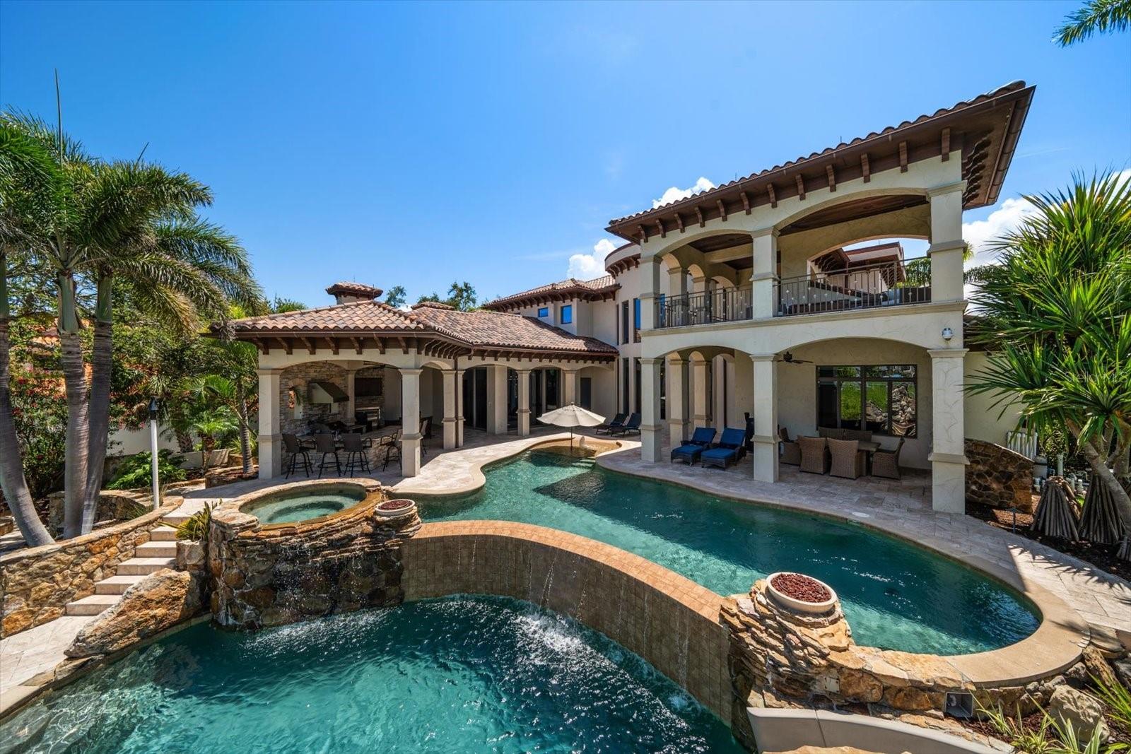 An estate where two elite worlds unite- WATERFRONT luxury & EQUESTRIAN prestige. Tucked away behind a canopy of majestic oaks, a winding Tennessee fieldstone driveway leads you to a Mediterranean-inspired masterpiece that redefines elegance and luxury. Crafted by renowned Brandon Construction, this private estate is a true tropical paradise, created for those with the most discerning taste. Custom double entry doors open to an awe-inspiring interior—where sophistication and thoughtful design meet. The private office offers quiet productivity, while the breathtaking living and dining room commands attention with soaring floor-to-ceiling windows that perfectly frame the resort-style pool and lush outdoor living areas. The chef’s kitchen is the heart of the home, featuring granite countertops, a center island with prep sink, breakfast bar, pot filler, custom built-in Miele fridge & freezer, gas cooktop, and a walk-in pantry—all open to a warm and spacious family room with beamed coffered ceilings, a cozy fireplace, and sliders to the outdoor oasis. Every detail has been considered, from the pool bath, mudroom, and laundry room to the theater room with stage and stadium seating—ideal for movie nights or performances. The primary suite is a serene retreat, flooded with natural light and accented by rich wood beams, a jaw-dropping custom walk-in closet with center island, and a spa-like bath with jetted tub, double walk-in shower with triple heads, dual vanities, a dressing table, and a hidden passage to the home office. Additional bedrooms and bathrooms are designed to pamper family and guests alike. Step outside and you’re transported to your own luxury resort—complete with a two-level heated pool and spa, outdoor kitchen, fireplace, and multiple entertaining areas. For boating enthusiasts, a TREX dock with a 10,000 lb lift offers direct access to the Intracoastal, while west-facing views provide spectacular sunsets that melt into the Gulf. But the crown jewel of this estate may be its custom-built barn—featuring rubber paver flooring, stalls with custom cushion mats, a tack room with custom saddle racks, feed room, covered and lit riding arena for nighttime rides, and a loft with full kitchen and bath, perfect for an on-site trainer or in-law suite. Spring-fed streams weave through the grounds, adding a touch of magic to this must-see property. Overlooking the Narrows and nestled in nature yet minutes from shopping, dining, and the beach—this is more than a home; it’s a once-in-a-lifetime opportunity to live your dream. Advertised square footage is based on builder plans and includes 7,059 sq ft for the main residence and 1,509 sq ft for the barn loft.