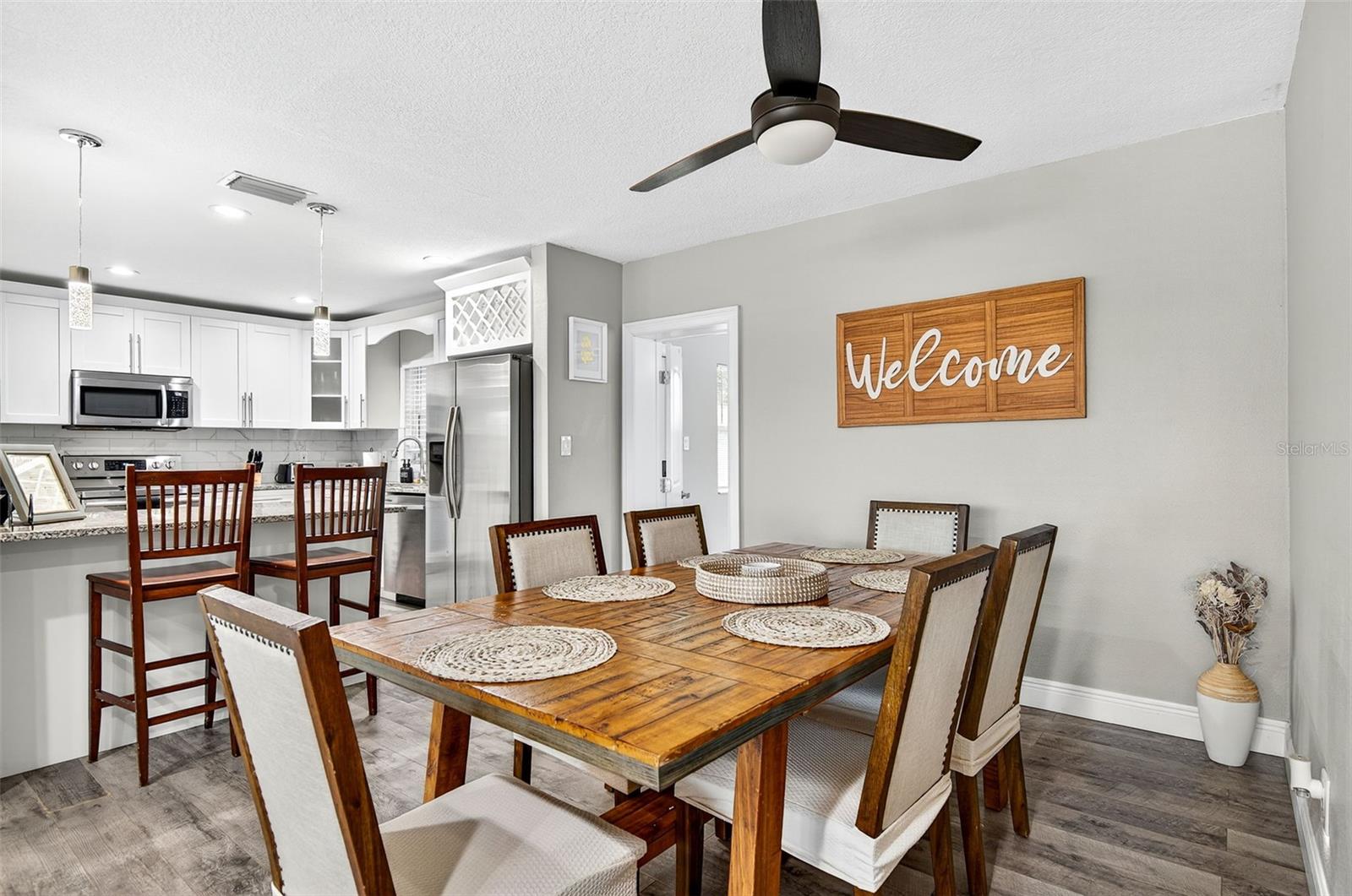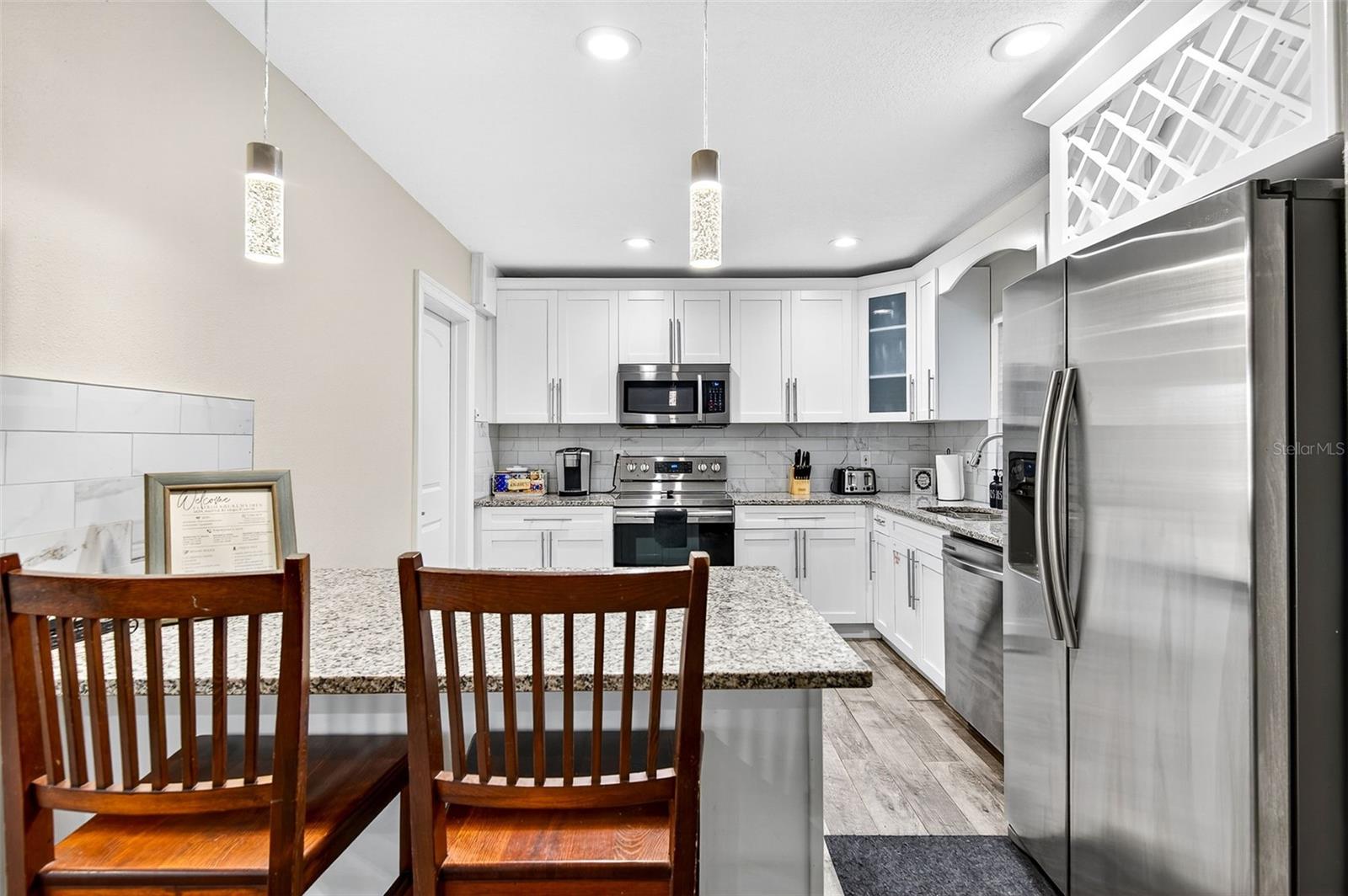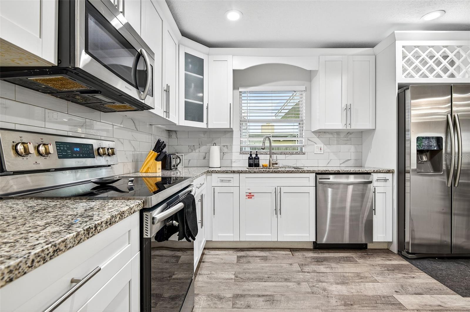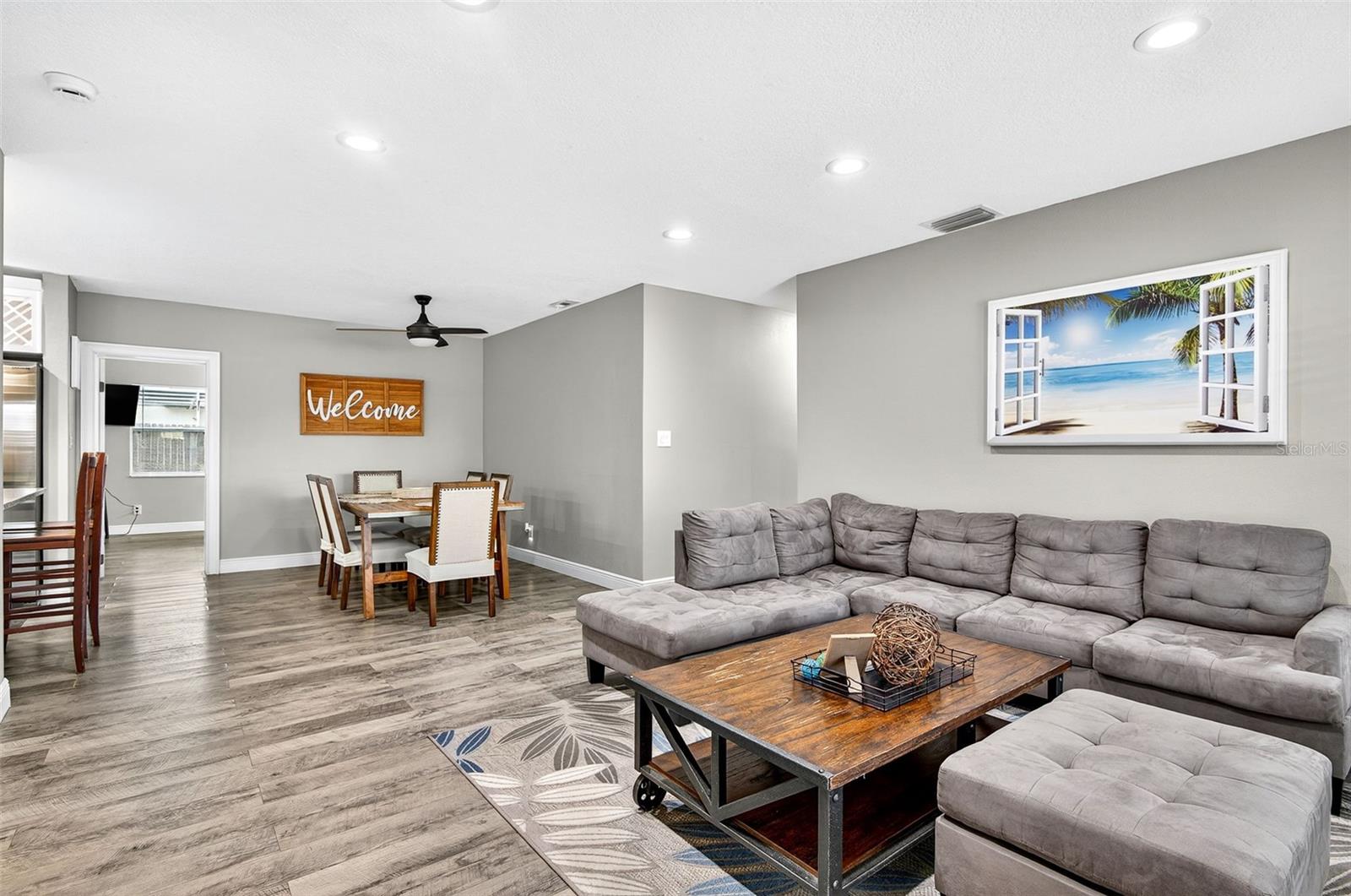 Charming 4-Bedroom 2-Bathroom Home in Central Largo – Updated Interior & Serene Setting. Welcome to this beautifully updated 4-bedroom, 2-bath home offering 1,432 sq ft of comfortable living space in a quiet, centrally located Largo neighborhood. Situated on a peaceful street with mature landscaping, this move-in ready home combines modern upgrades with classic charm. Step inside to discover an inviting open-concept layout featuring engineered hardwood flooring throughout and abundant natural light. The spacious living and dining areas flow effortlessly into the stunning kitchen, complete with granite countertops, white shaker cabinets, stainless steel appliances, and a stylish subway tile backsplash. The generously sized primary suite features walls of windows and a ceiling fan, while both bathrooms are tastefully renovated with modern tile work, updated vanities, and sleek fixtures. Additional highlights include a dedicated laundry room, fresh neutral paint, and a 1-car garage for added convenience. Enjoy the large, fully fenced backyard with a private patio area—perfect for entertaining or relaxing in the Florida sunshine. Located just minutes from beaches, parks, shopping, and dining, this home offers easy access to everything Largo has to offer. Don’t miss your chance to own this move-in ready gem in a desirable location!