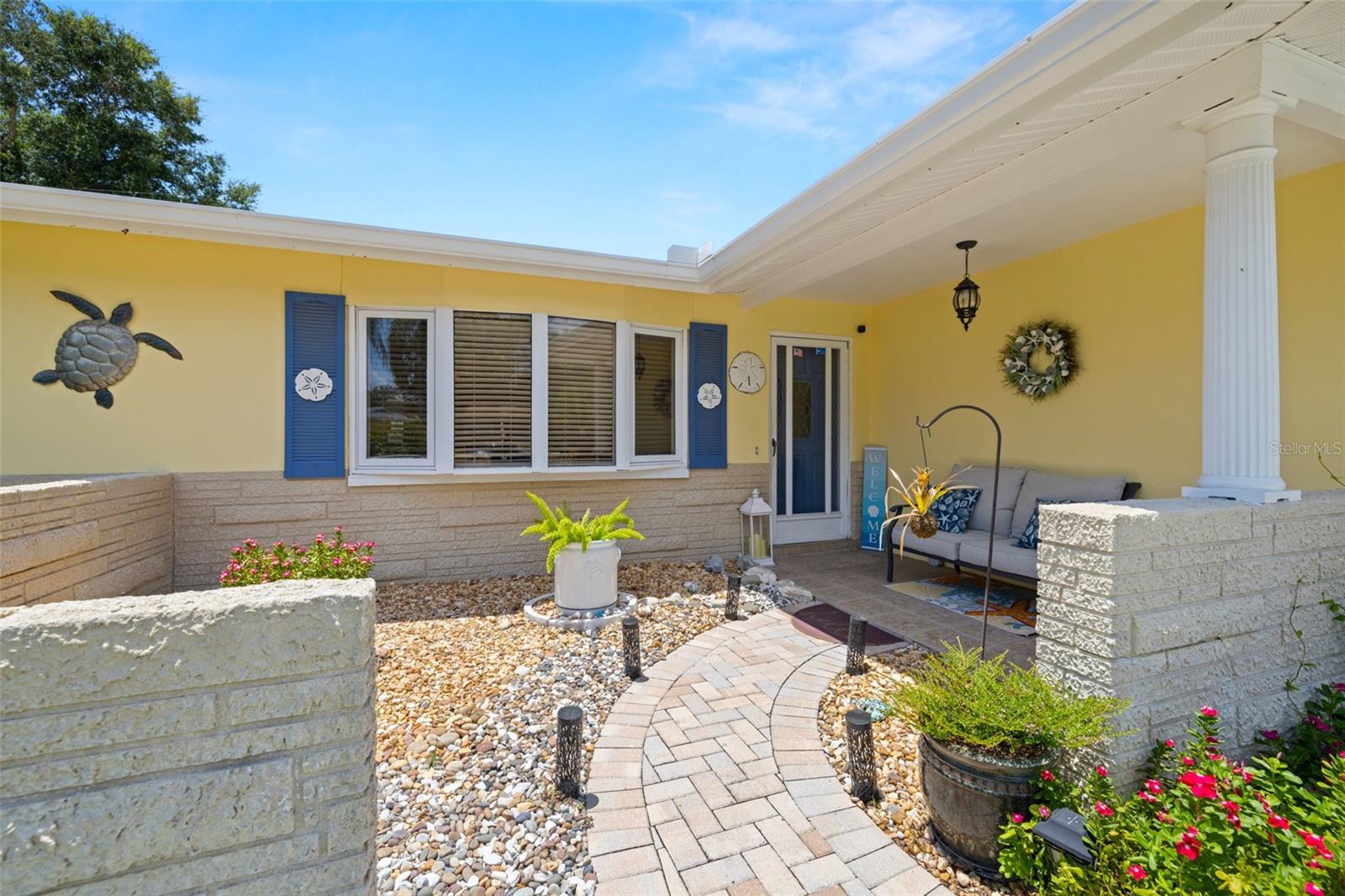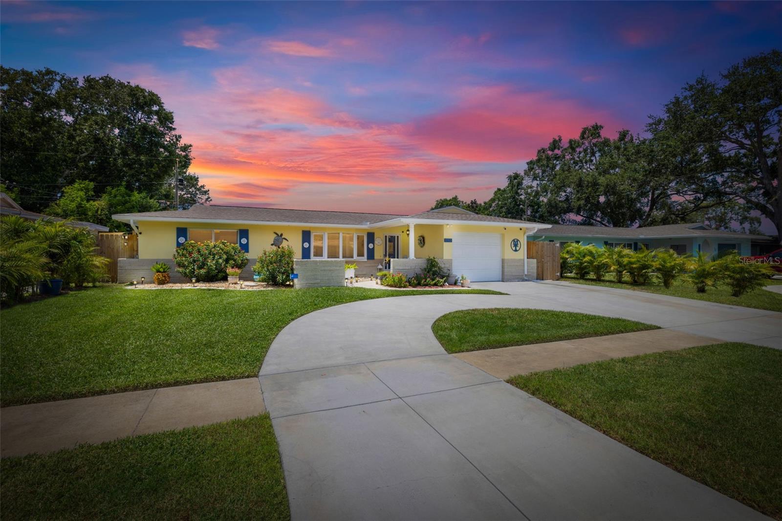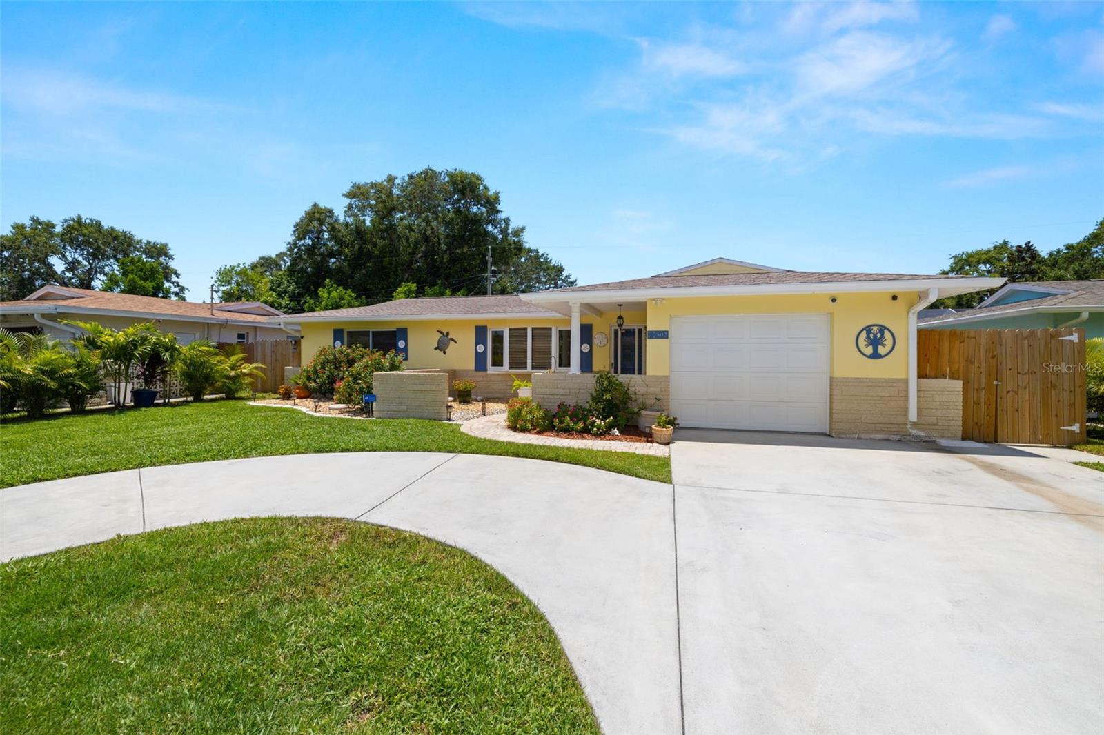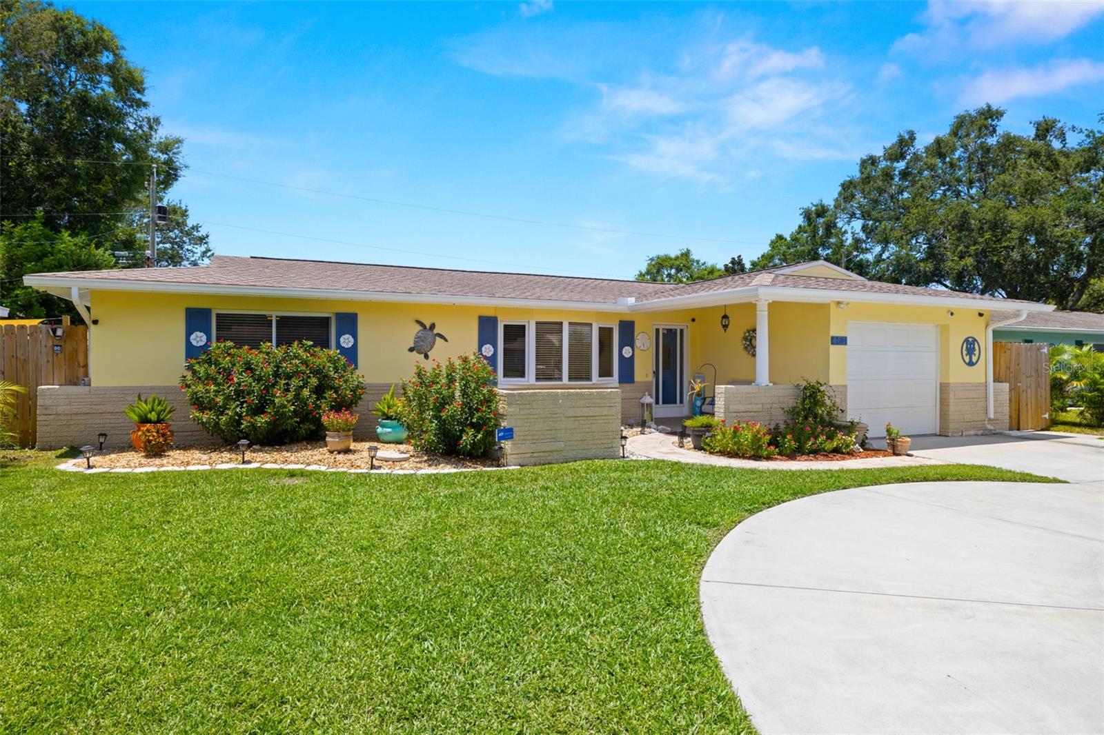 Welcome Home to your Sunny Slice of Paradise! This beautifully updated 2-bedroom, 2-bathroom home radiates warmth and charm from the moment you arrive. Pride of ownership is abundant in every detail. Freshly painted inside and out in 2024, this home features incredible curb appeal with vibrant landscaping, coastal charm, and a circular driveway that welcomes you home. A single car garage is perfect for parking your car or storing your toys. Step inside to find spacious living areas filled with natural light. Wood and tile floors throughout the main living space provide easy upkeep. The Florida room is warm and cozy with a fireplace and a view of the lanai. Both oversized bedrooms have brand new carpet, offering comfort and flexibility for use of space. The main bathroom has been thoughtfully renovated with stylish finishes, creating a relaxing spa like feel. The heart of this home is the backyard oasis. Enjoy year-round relaxation in the screened-in lanai, complete with a sparkling pool, new chlorinator (2024), and plenty of room to entertain. The paver patio pool deck is a nice upgrade. The entire backyard is designed with low-maintenance Zeroscape landscaping and astroturf, perfect for those who want beauty without the upkeep. Additional updates include a NEW AC system (2024) and NEW ROOF (2018), offering both comfort and peace of mind. No flood zone here, this home stayed high and dry and unaffected by the storms. The flexible floorplan allows for a 3rd bedroom to easily be added and for an ensuite bathroom added to the primary suite. Buy a 2/2 and make it a 3/3 with very little effort, the options are endless! Largo allows for short term rentals, think vacation rental or Air BnB. Located in a friendly neighborhood close to shopping, dining, and only 15 minutes to the Gulf beaches, this home is move-in ready and waiting for its next chapter!