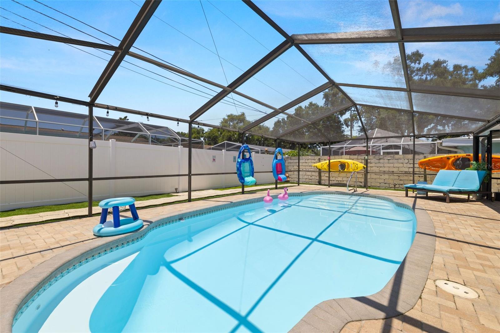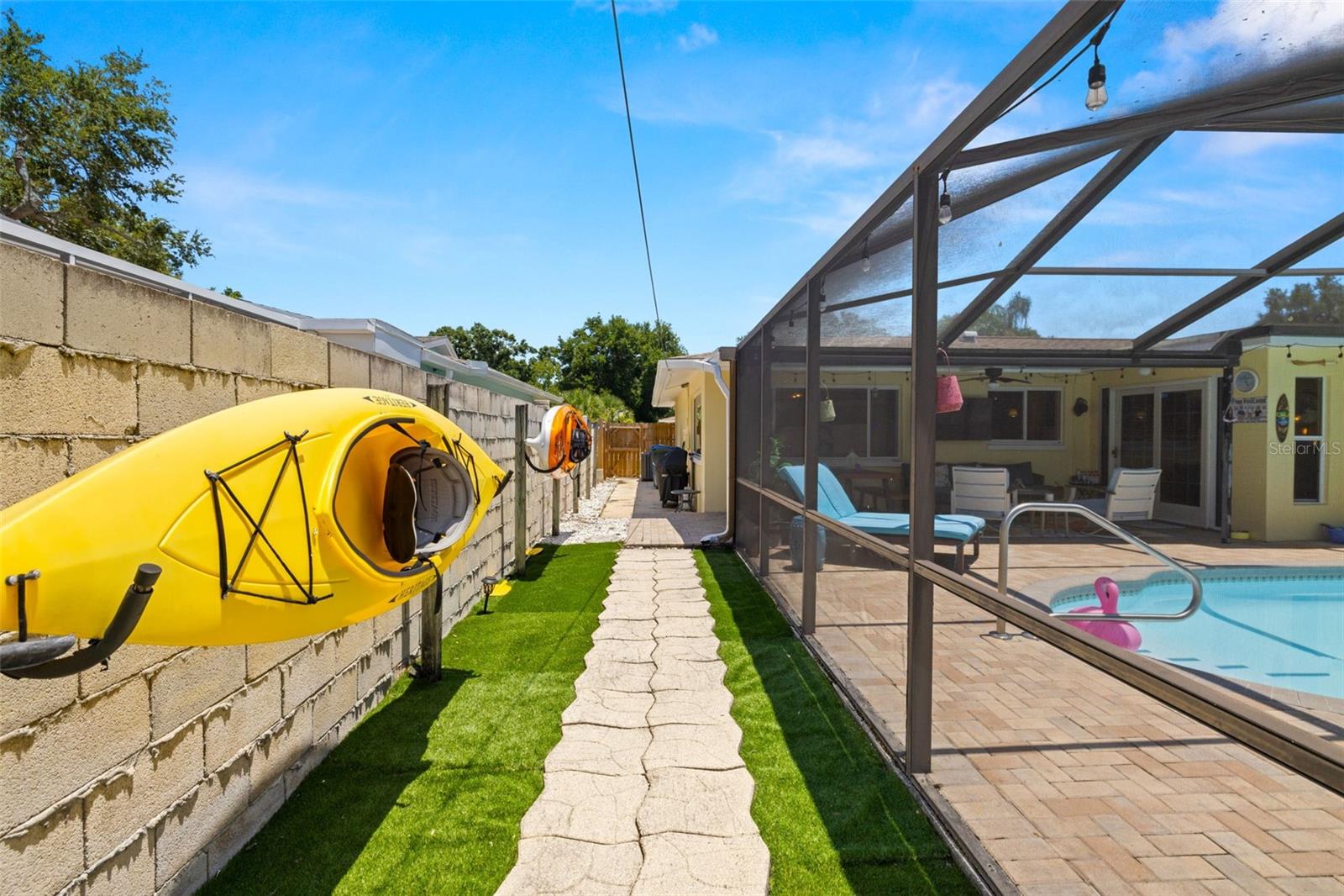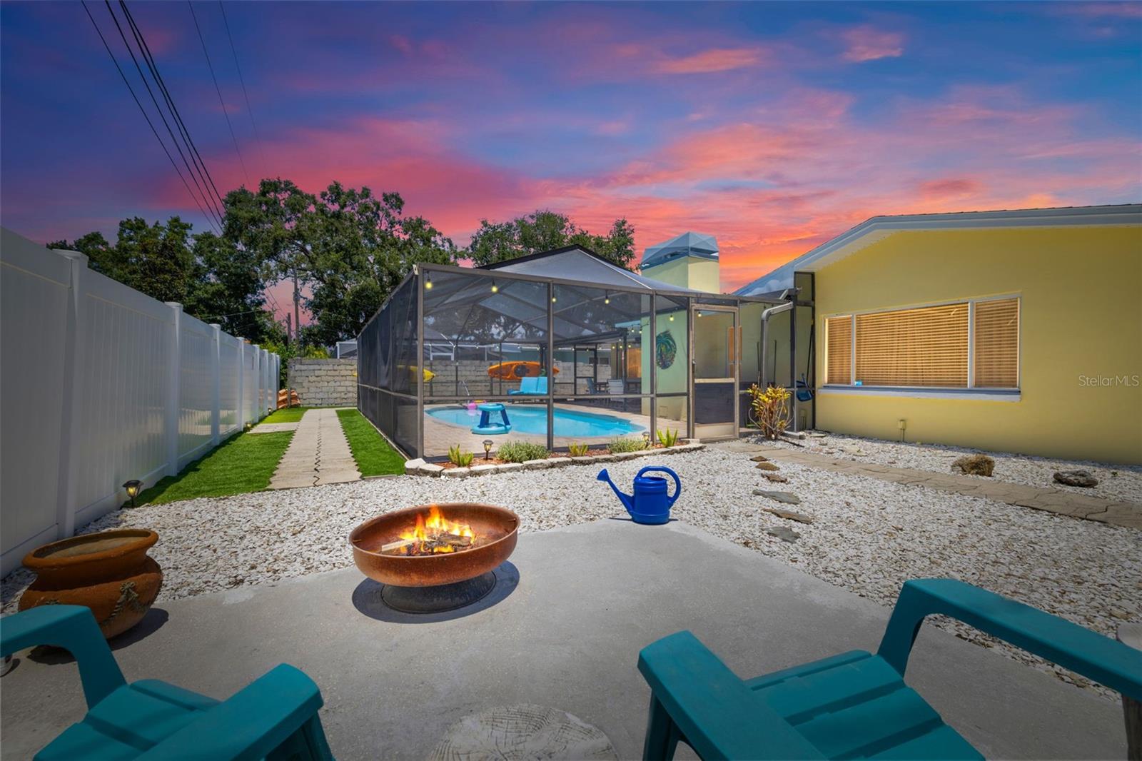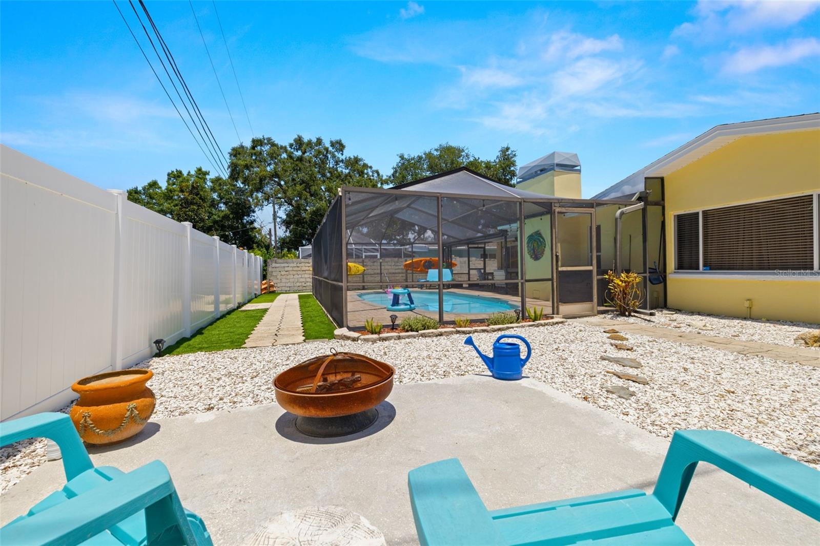 Welcome Home to your Sunny Slice of Paradise! This beautifully updated 2-bedroom, 2-bathroom home radiates warmth and charm from the moment you arrive. Pride of ownership is abundant in every detail. Freshly painted inside and out in 2024, this home features incredible curb appeal with vibrant landscaping, coastal charm, and a circular driveway that welcomes you home. A single car garage is perfect for parking your car or storing your toys. Step inside to find spacious living areas filled with natural light. Wood and tile floors throughout the main living space provide easy upkeep. The Florida room is warm and cozy with a fireplace and a view of the lanai. Both oversized bedrooms have brand new carpet, offering comfort and flexibility for use of space. The main bathroom has been thoughtfully renovated with stylish finishes, creating a relaxing spa like feel. The heart of this home is the backyard oasis. Enjoy year-round relaxation in the screened-in lanai, complete with a sparkling pool, new chlorinator (2024), and plenty of room to entertain. The paver patio pool deck is a nice upgrade. The entire backyard is designed with low-maintenance Zeroscape landscaping and astroturf, perfect for those who want beauty without the upkeep. Additional updates include a NEW AC system (2024) and NEW ROOF (2018), offering both comfort and peace of mind. No flood zone here, this home stayed high and dry and unaffected by the storms. The flexible floorplan allows for a 3rd bedroom to easily be added and for an ensuite bathroom added to the primary suite. Buy a 2/2 and make it a 3/3 with very little effort, the options are endless! Largo allows for short term rentals, think vacation rental or Air BnB. Located in a friendly neighborhood close to shopping, dining, and only 15 minutes to the Gulf beaches, this home is move-in ready and waiting for its next chapter!